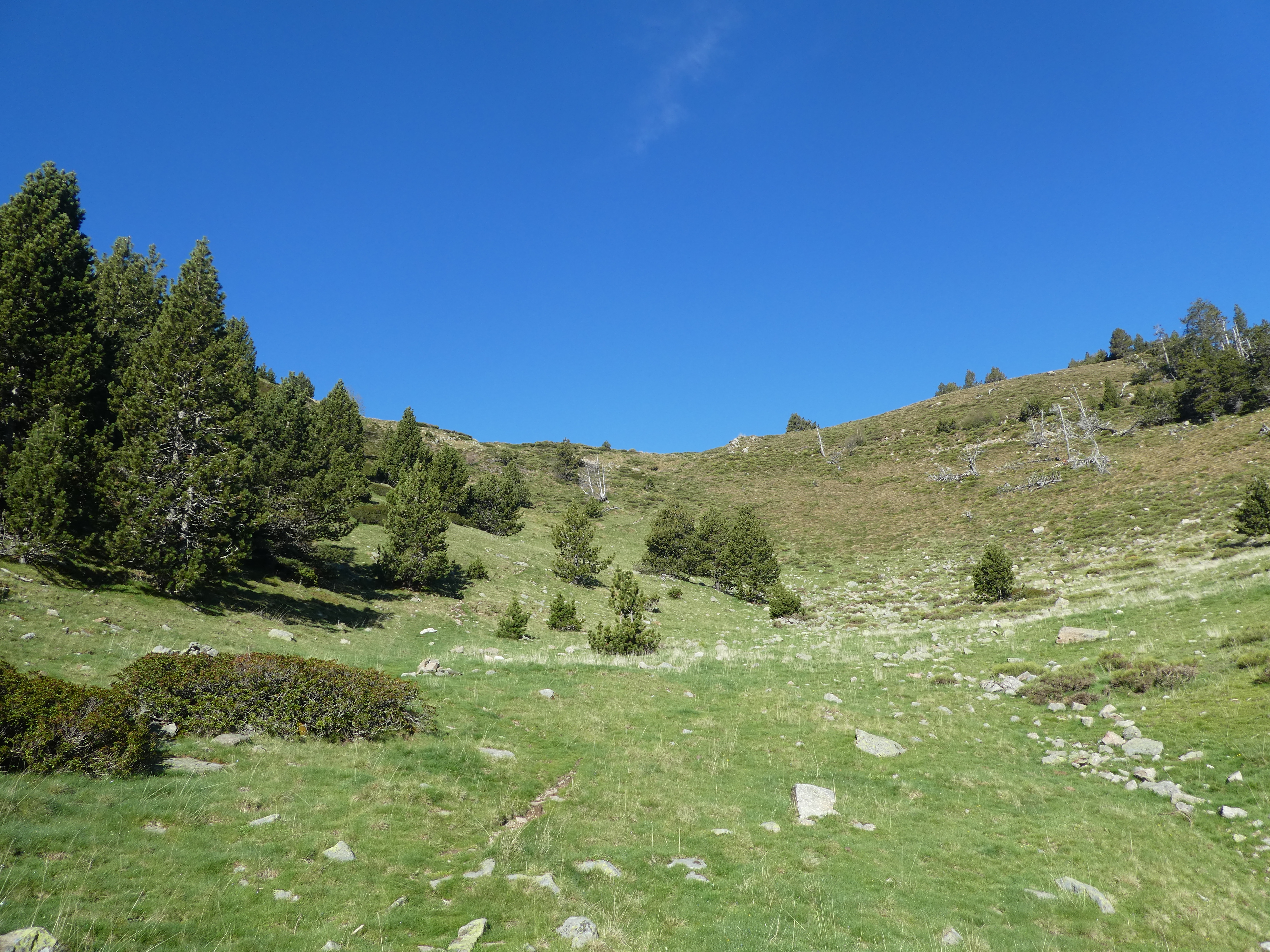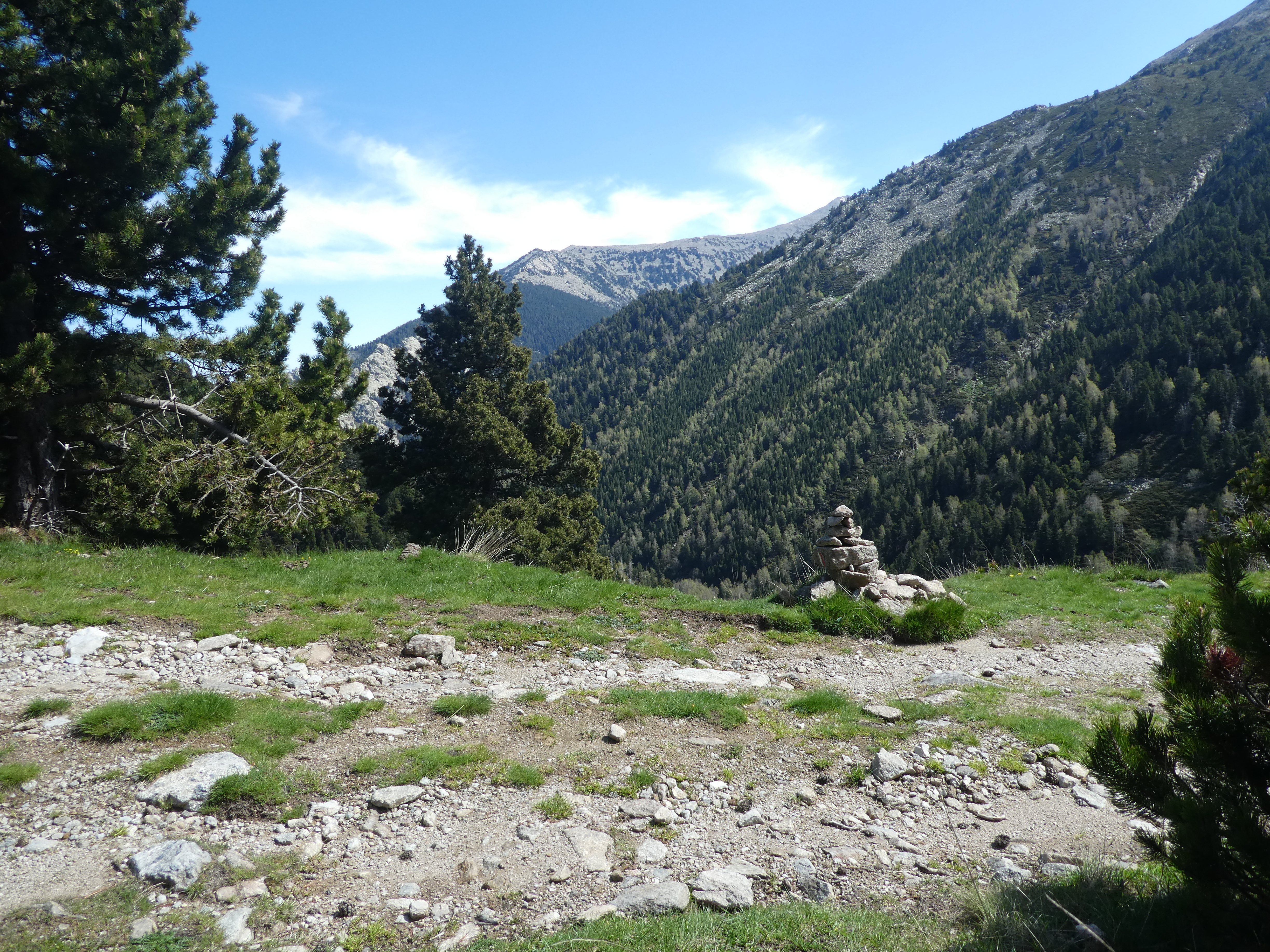 Collada de la Roqueta (2081 m) : suivre le chemin descendant raidement sur la droite dans le Vallon de la Llipodera direction Refuge de Mariailles, balisé en rouge et blanc (sortie de la Réserve Naturelle de Py)