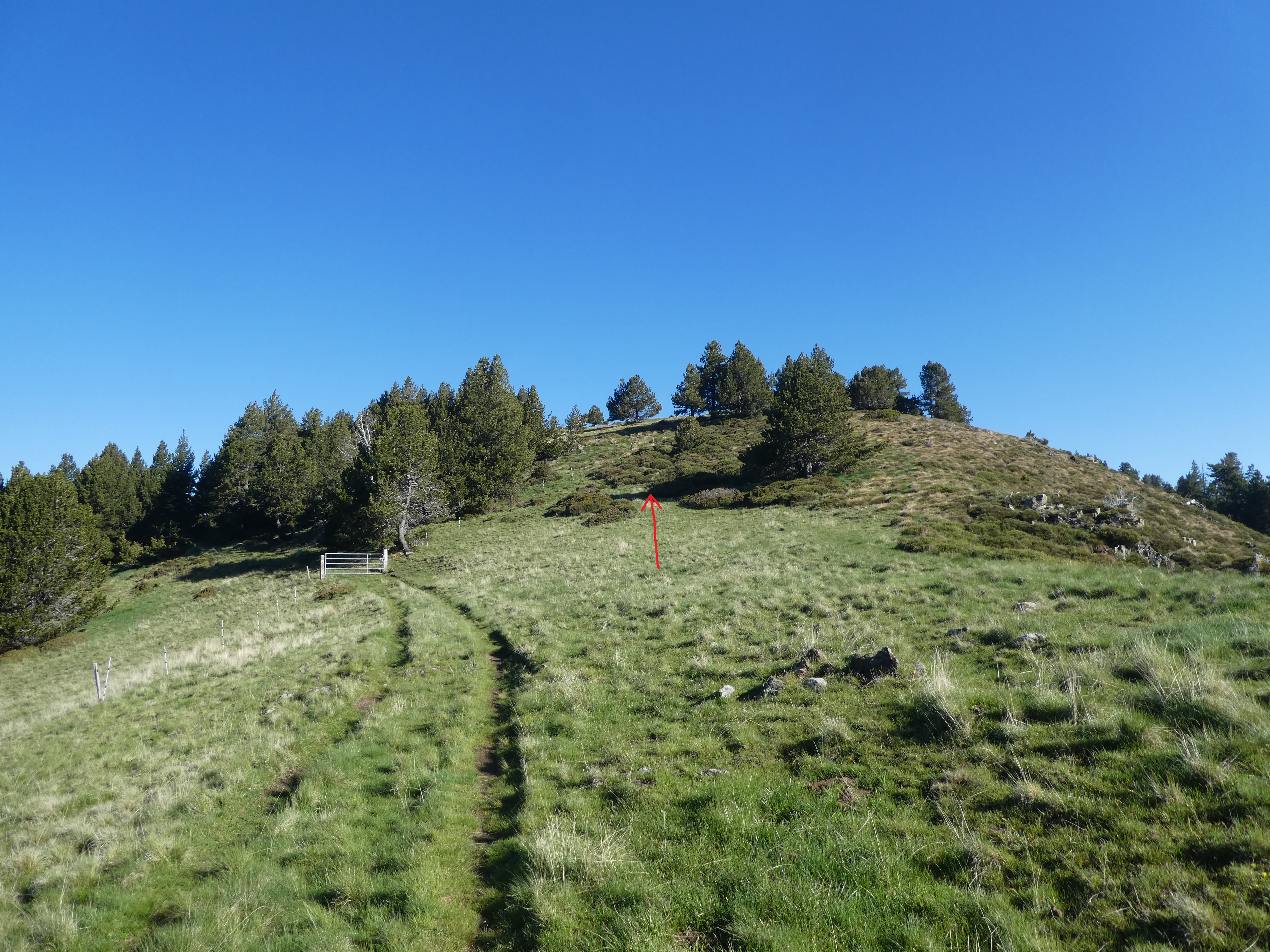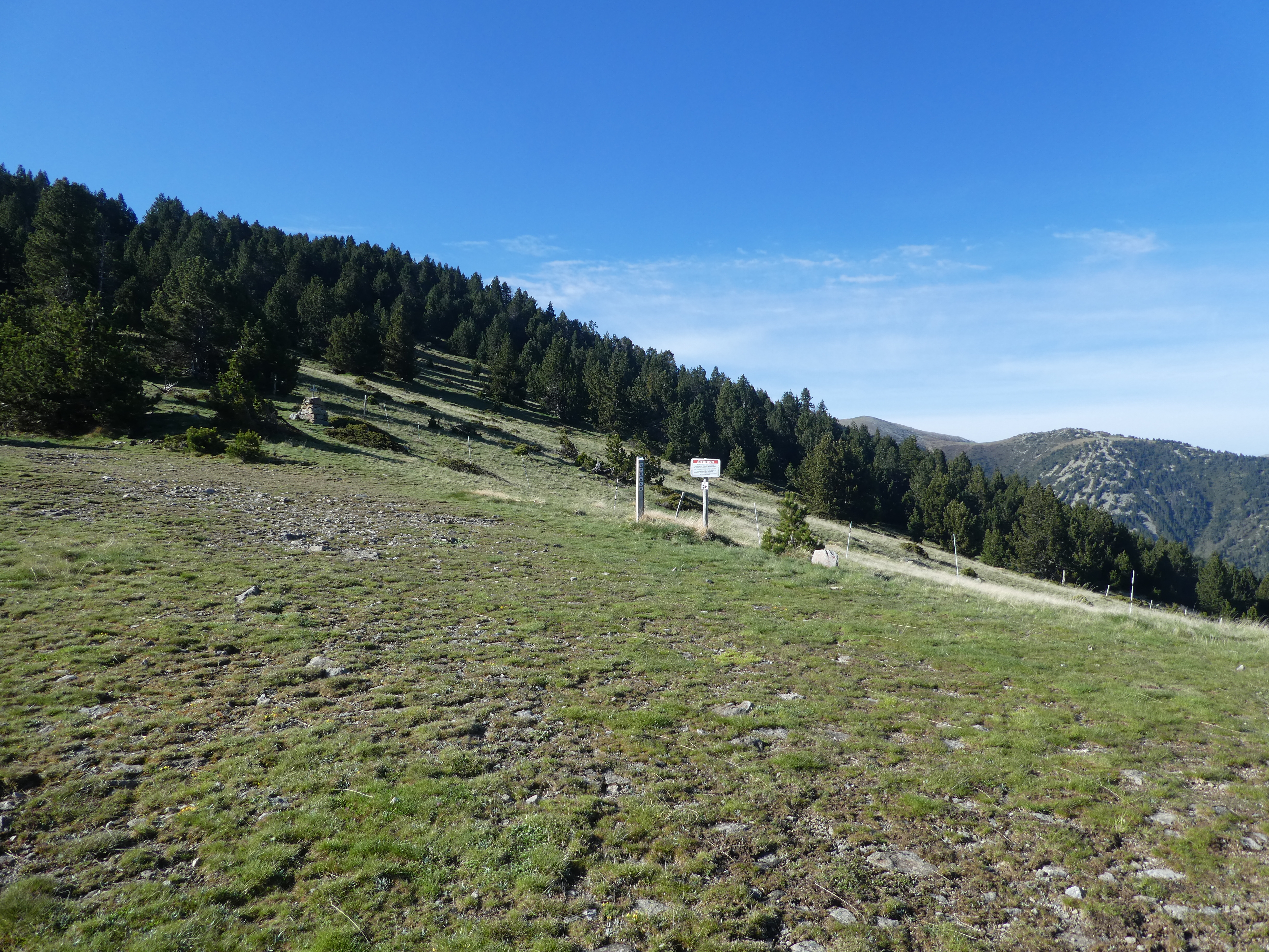 A ce croisement (1888 m), quitter la piste pour suivre le chemin montant raidement sur la droite direction Pla Guillem, balisé en rouge et blanc, et en jaune et rouge