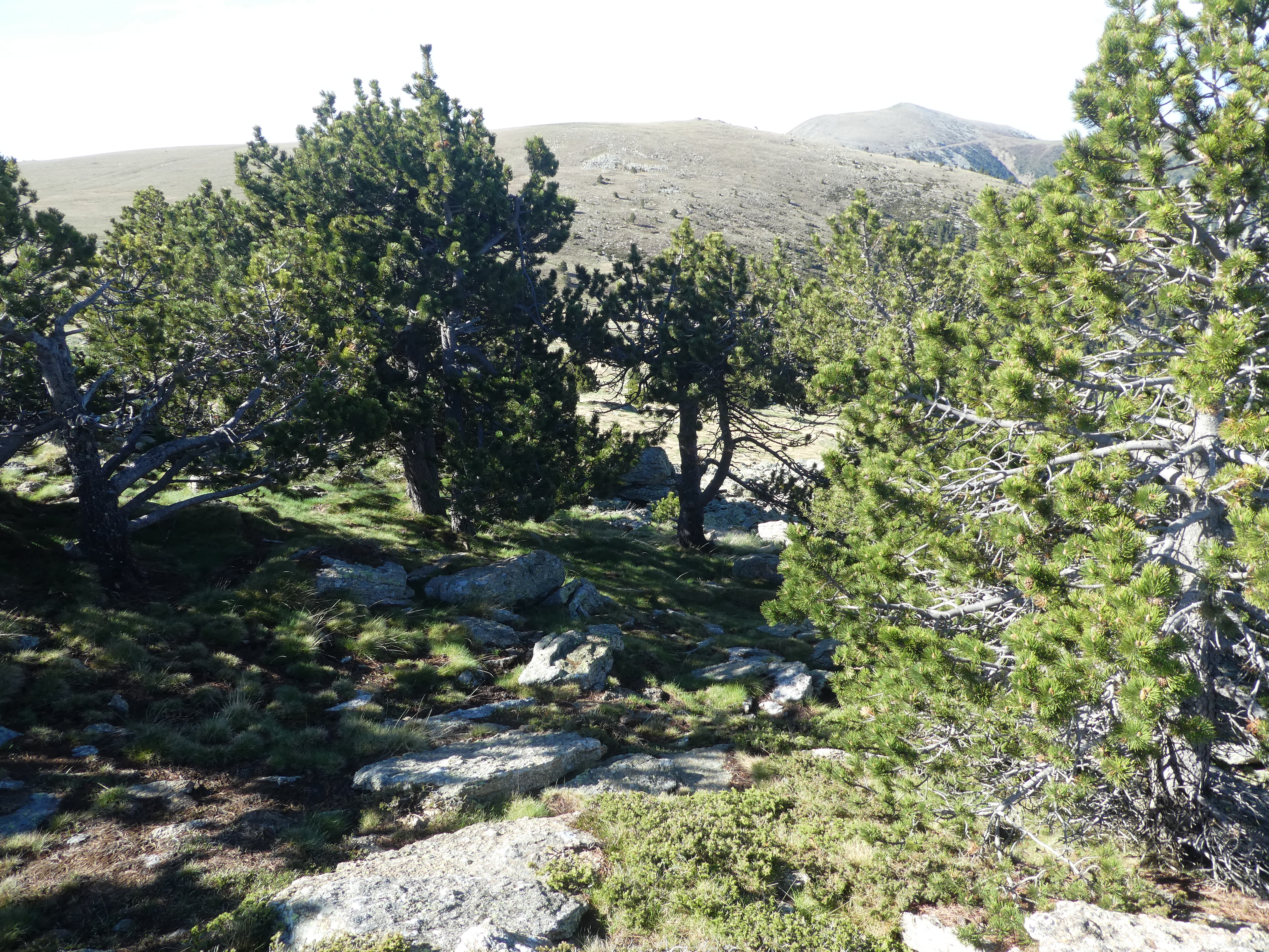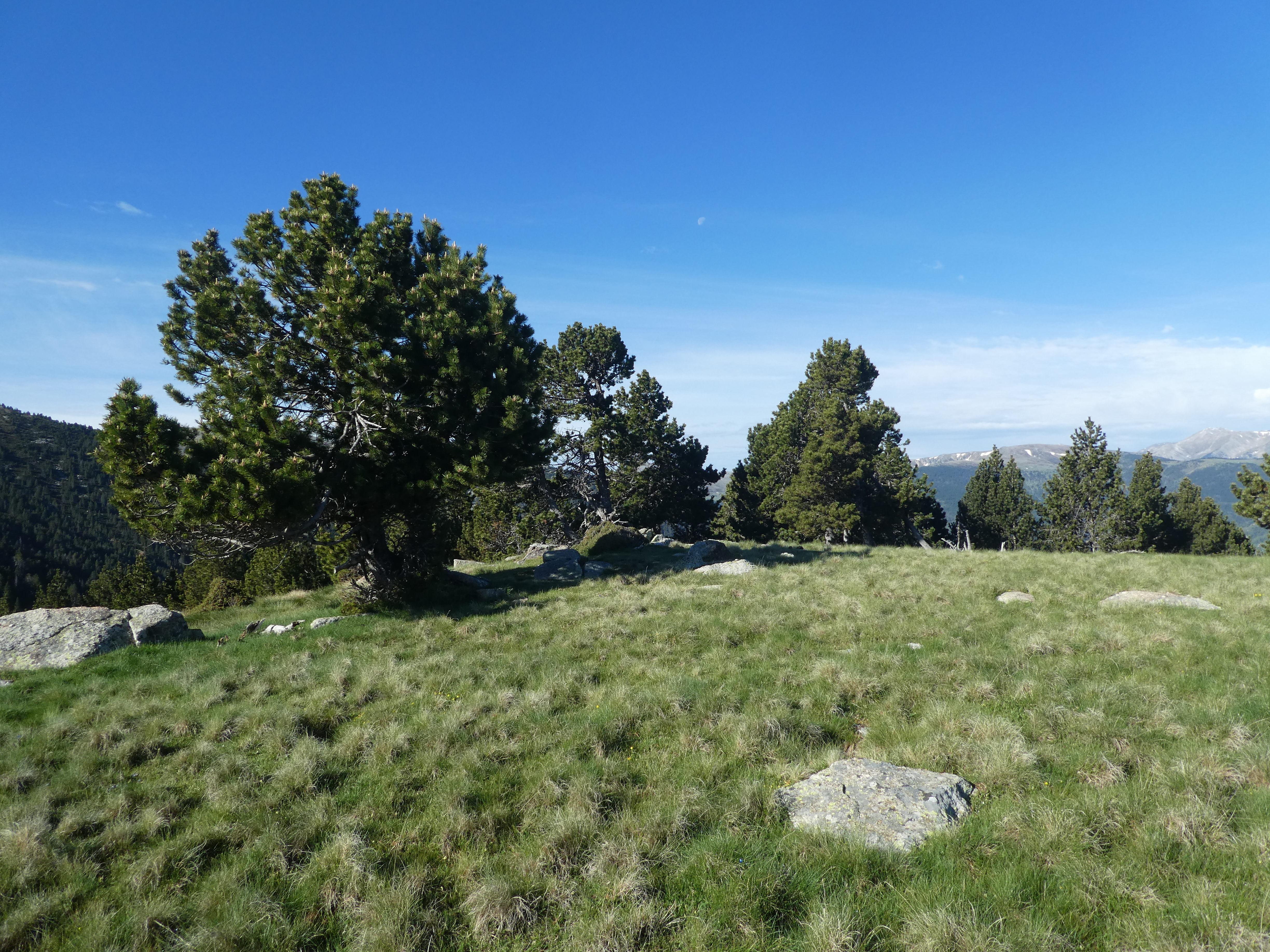 Arrivée au sommet du Pic de Dona Pa (2113 m) : belle vue malgré la présence d'arbres au sommet sur le Canigou, la crête du Pic dels Set Homes, le Pic de la Roqueta, le Pla Guillem, le Puig de la Collada Verda, le massif du Pic del Gegant, les sommets du Capcir, le Pic de Tres Estelles, el Madres et el Dormidor