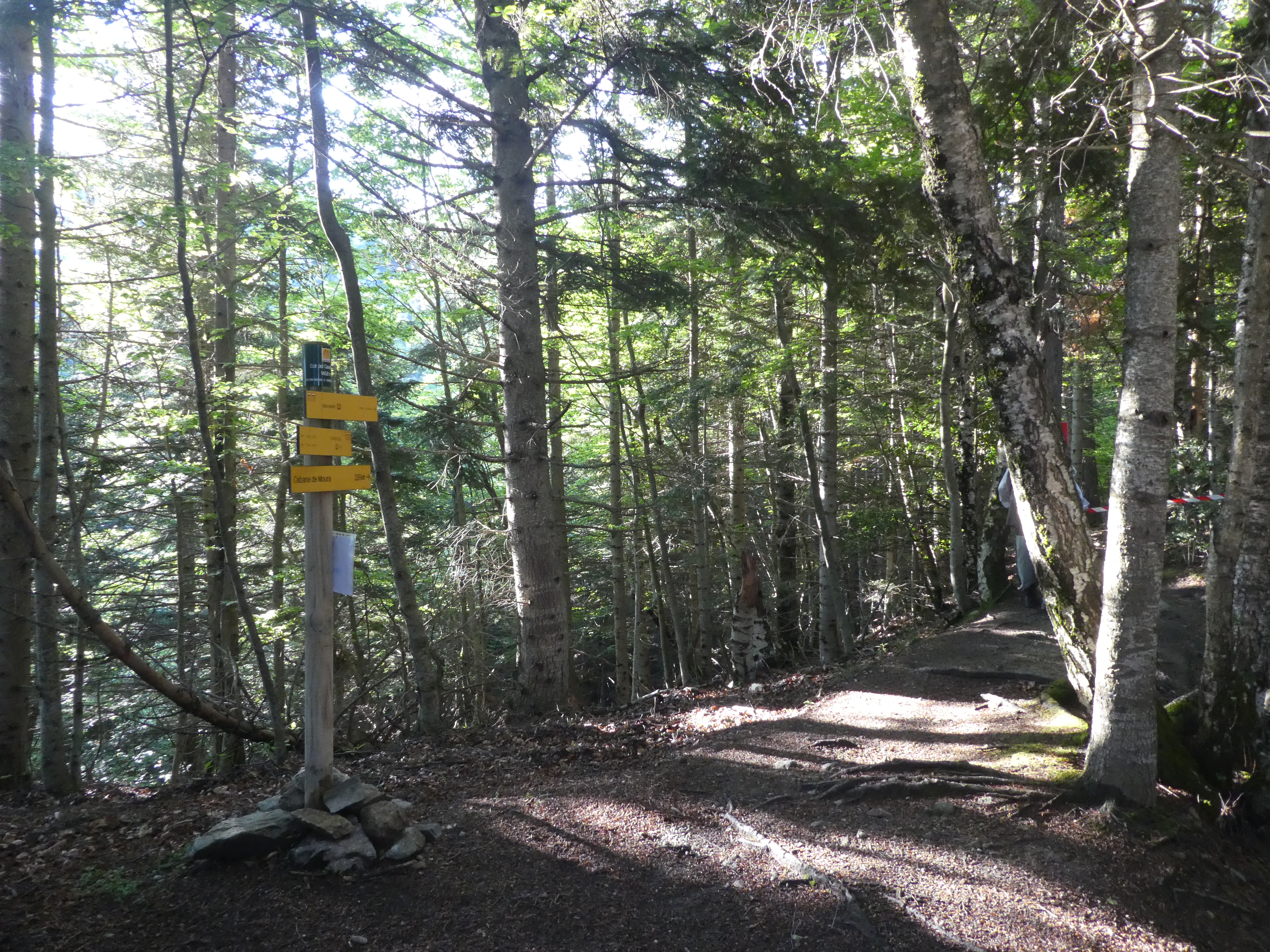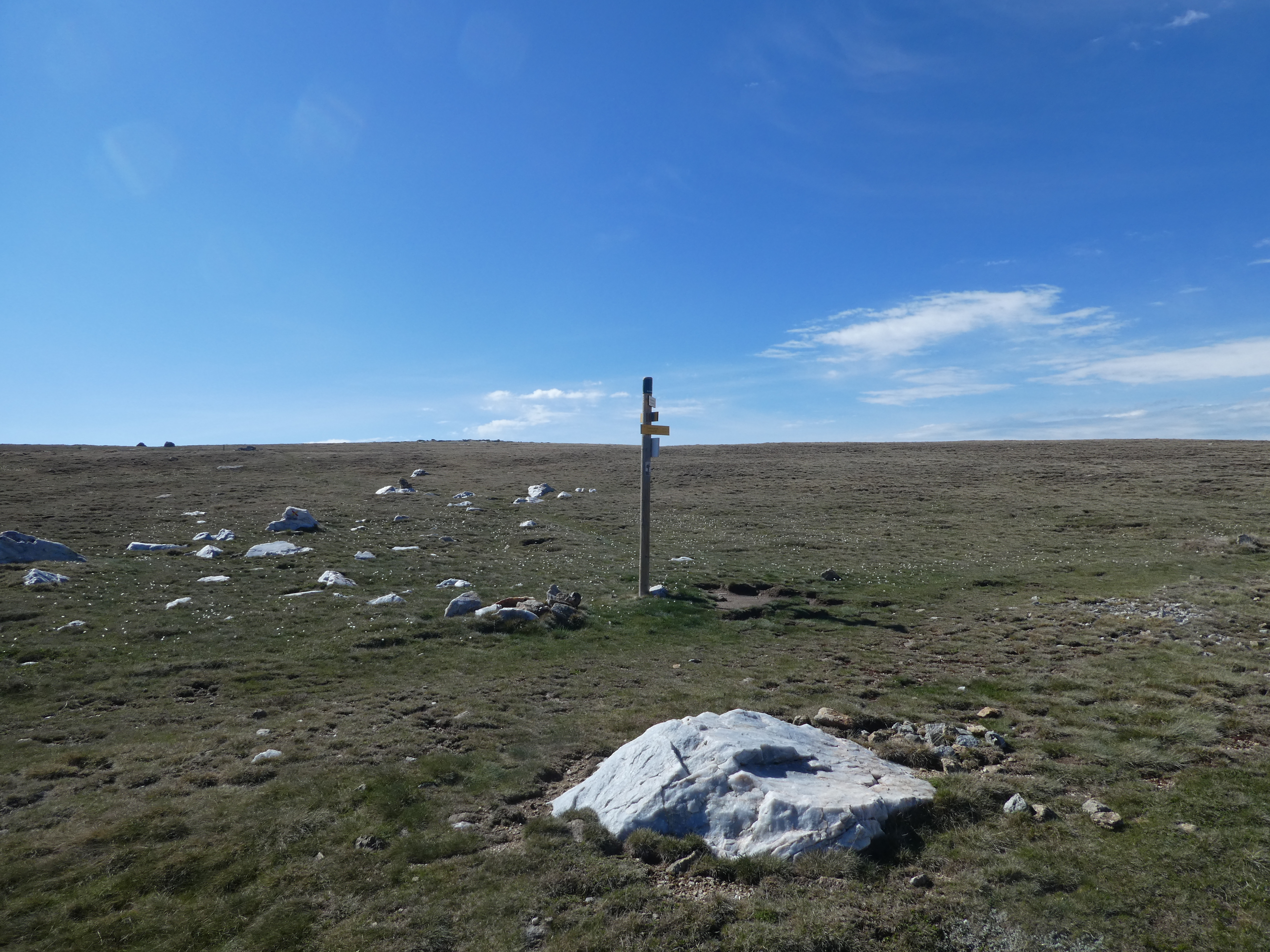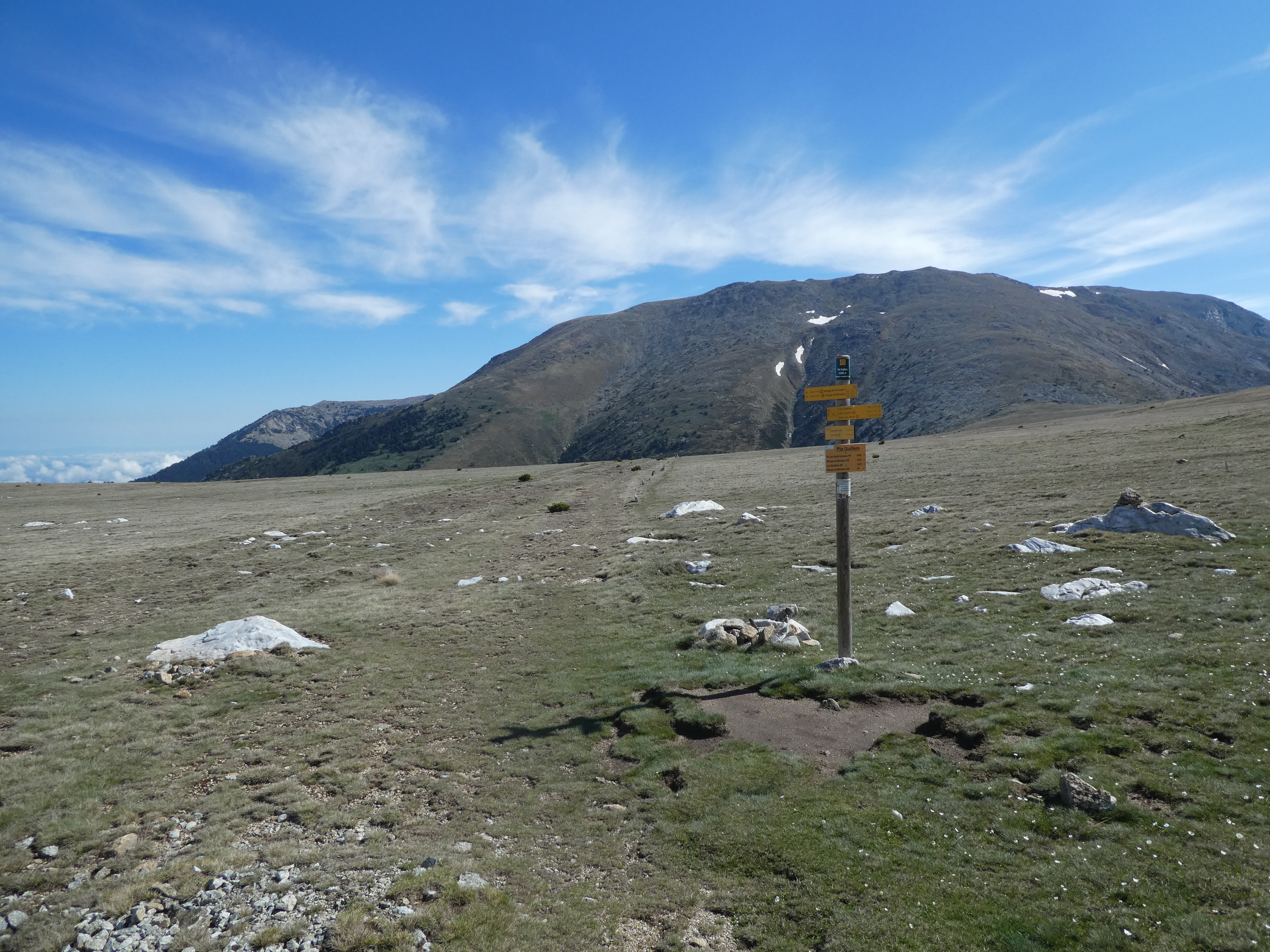 Collada de la Roqueta (2081 m) : suivre le GR partant légèrement sur la droite direction Pla Guillem, balisé en rouge et blanc, et en jaune et rouge dorénavant (entrée dans la Réserve Naturelle de Py)