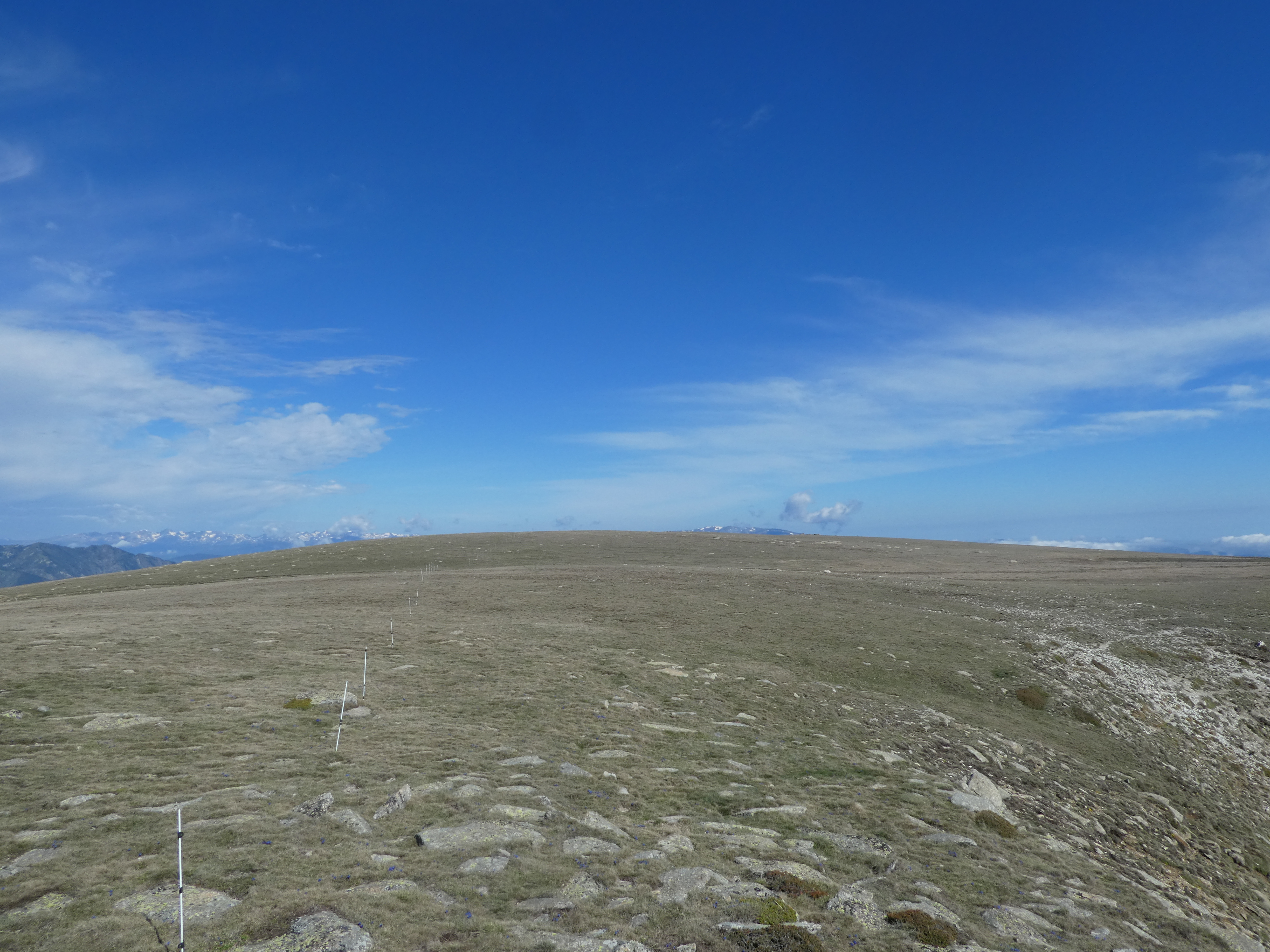 Arrivée au sommet du Pic de la Roqueta (2273 m) : vue sur le plateau du Pla Guillem, les sommets du Haut-Conflent, du Capcir, sur el Madres, el Dormidor, sur le Canigou, la crête du Pic dels Set Homes ainsi que sur la Vallée de la Têt