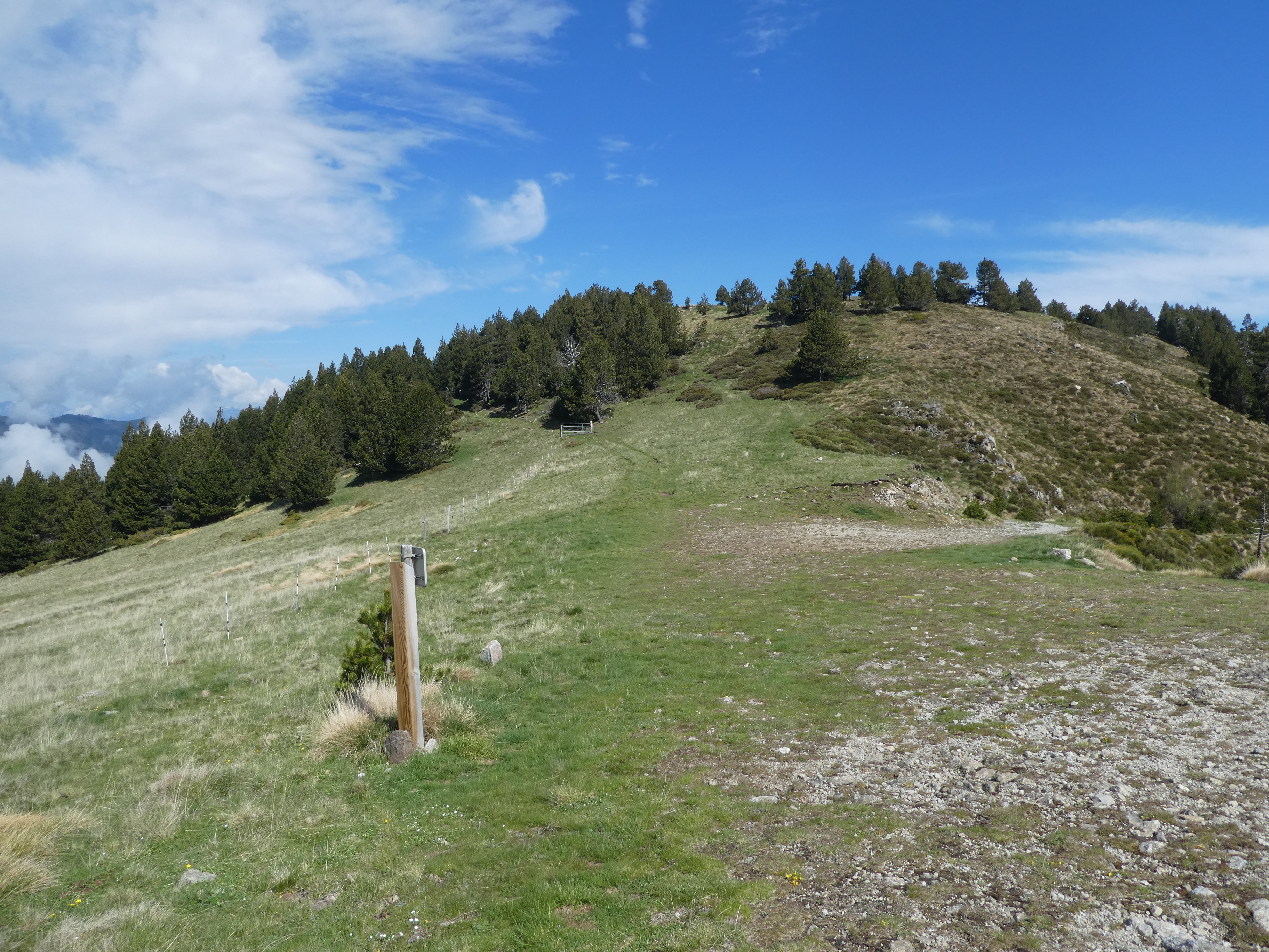 Coll del Cavall Mort (1458 m) : suivre le GR10 partant tout droit direction Coll de Jou, balisé en rouge et blanc dorénavant