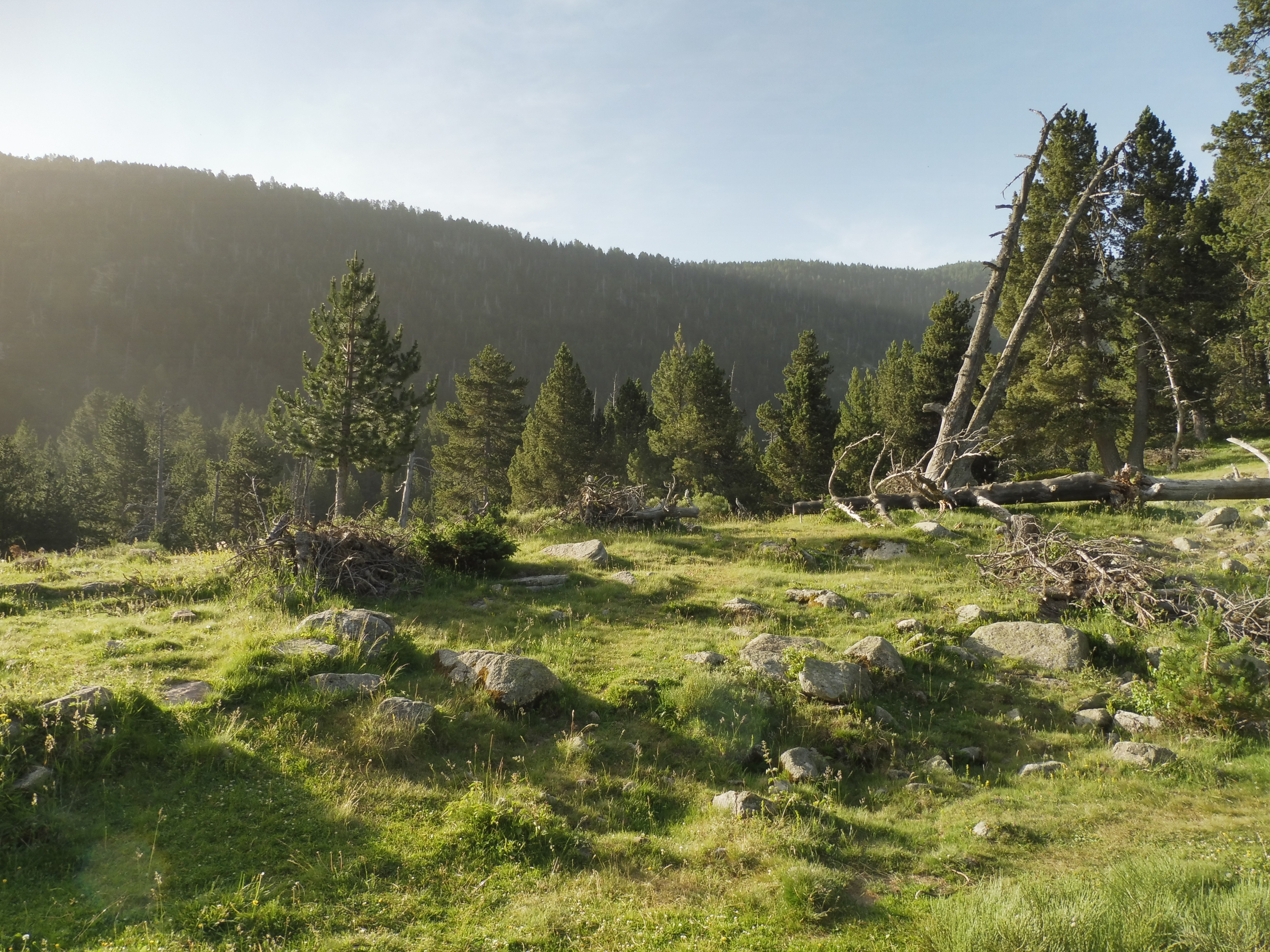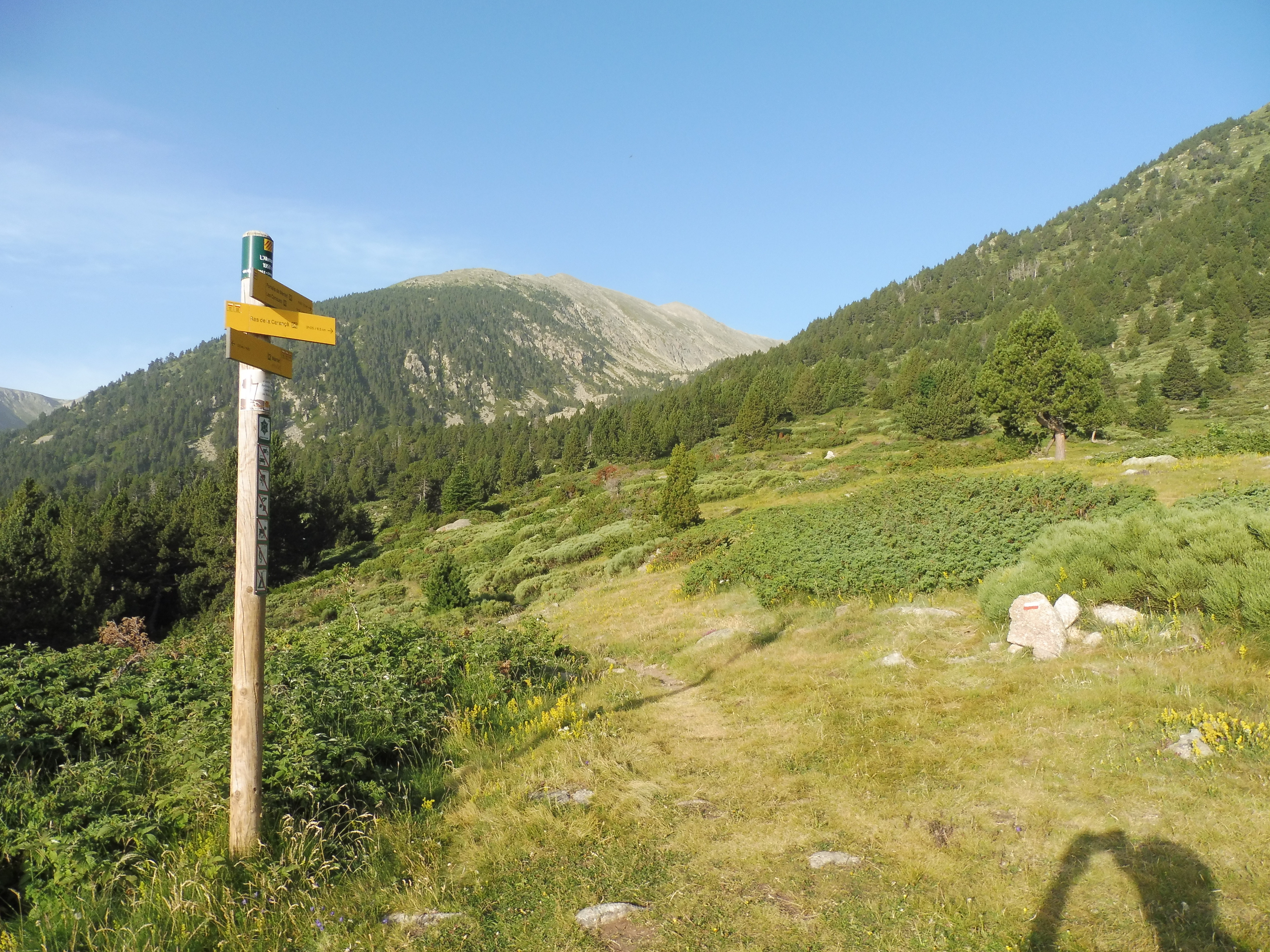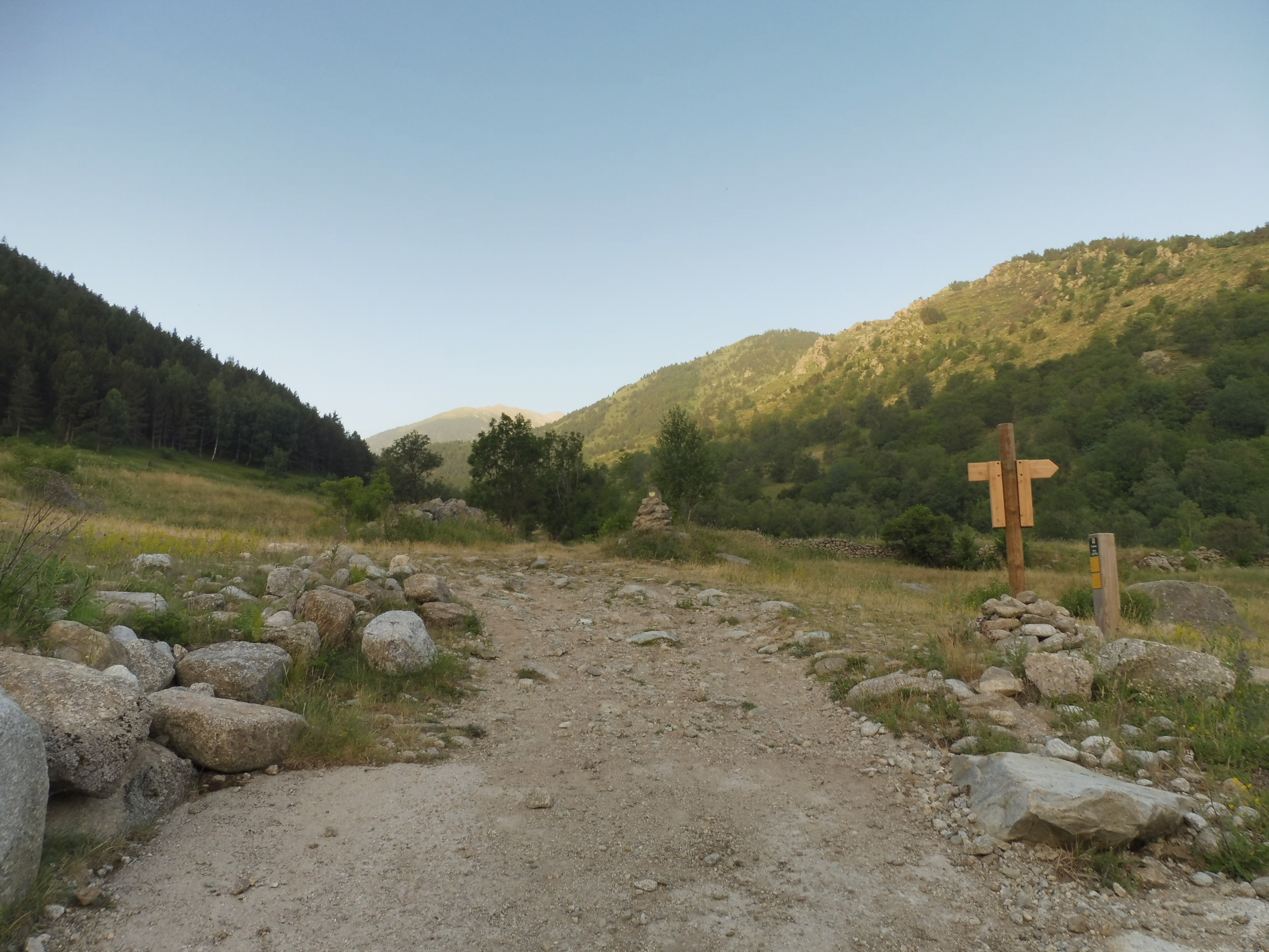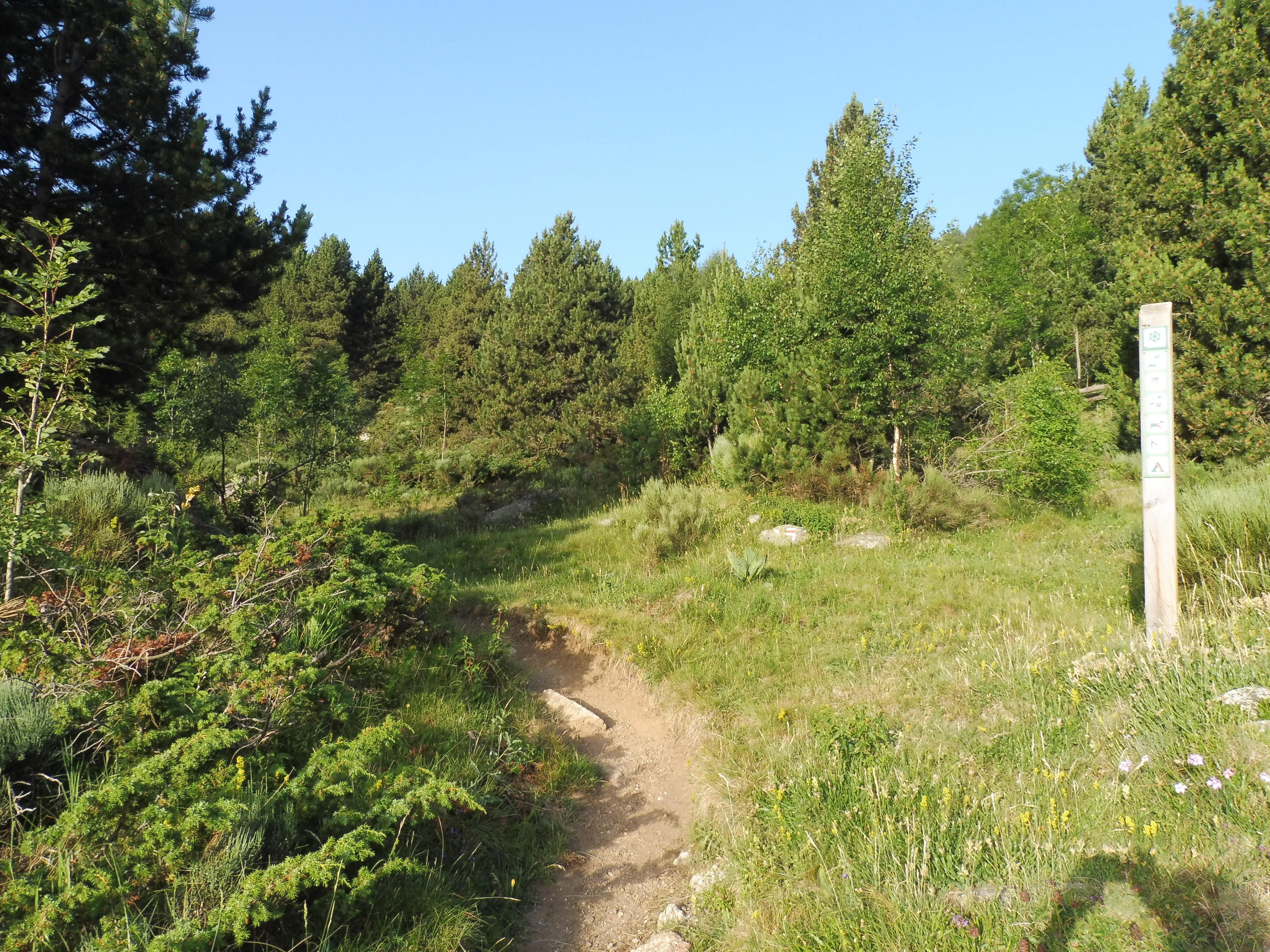 Dès que le GR10 est atteint (700 mètres après avoir quitté le replat herbeux), suivre ce dernier sur la droite direction Mantet, balisé en rouge et blanc dorénavant
