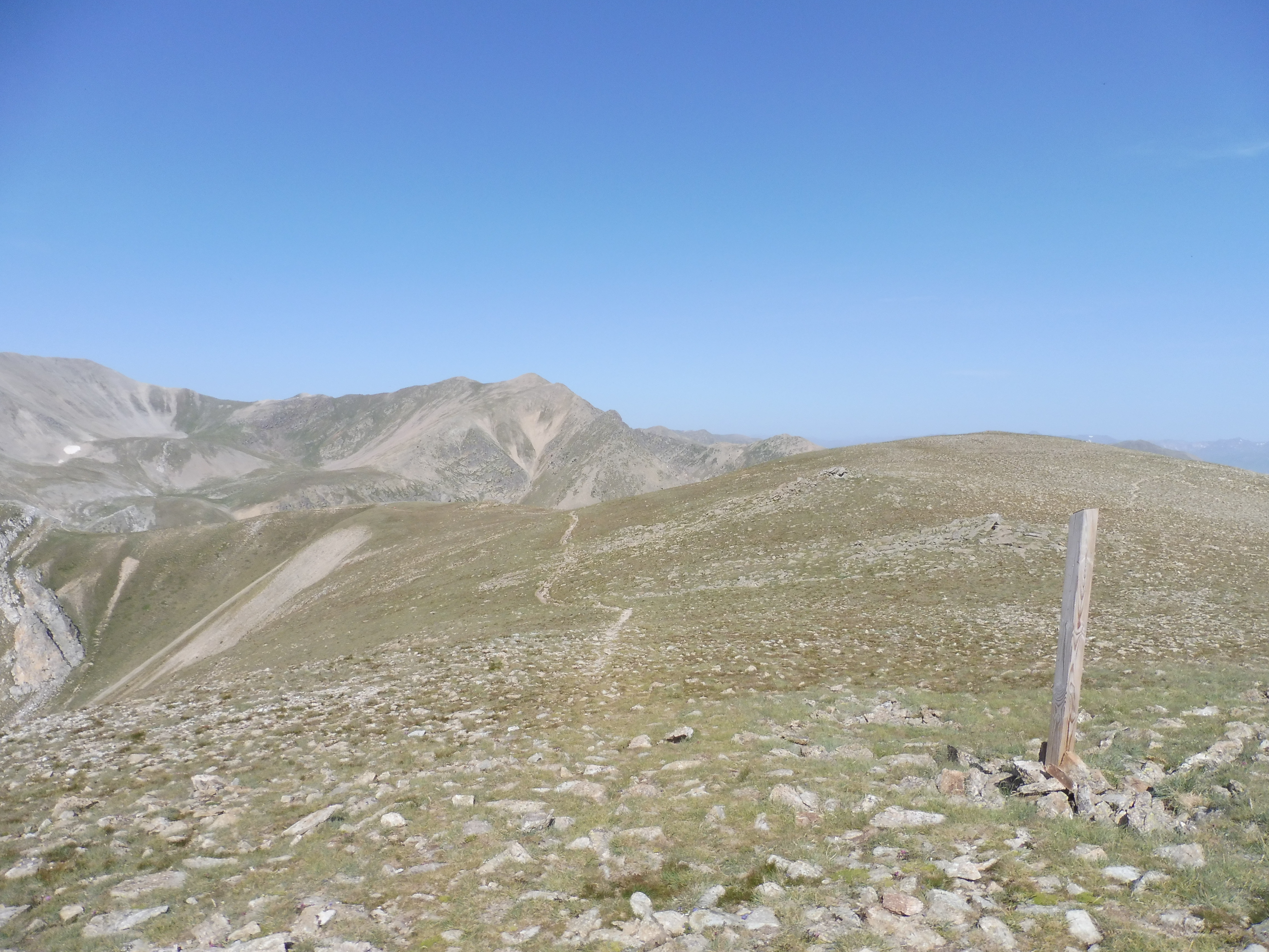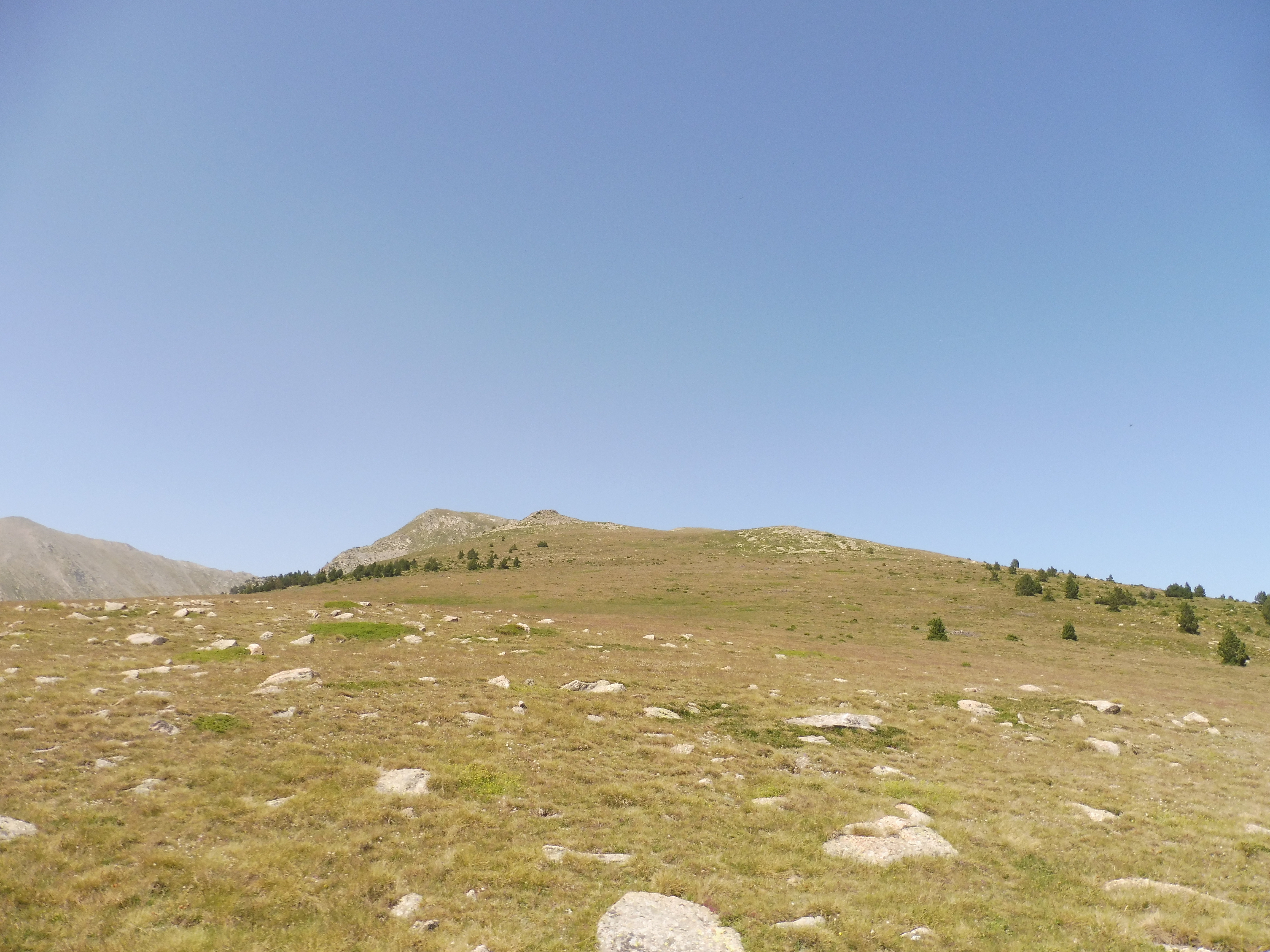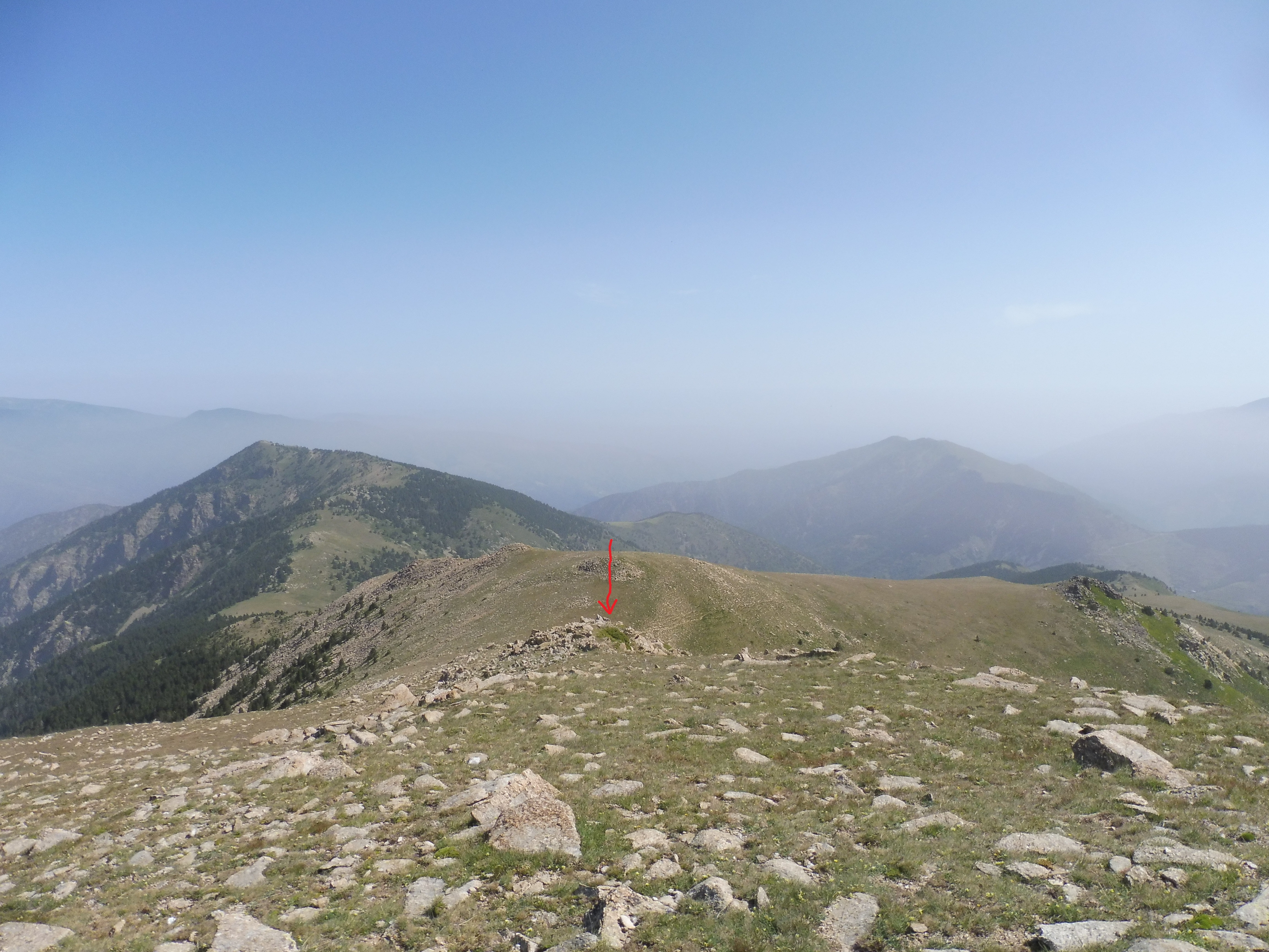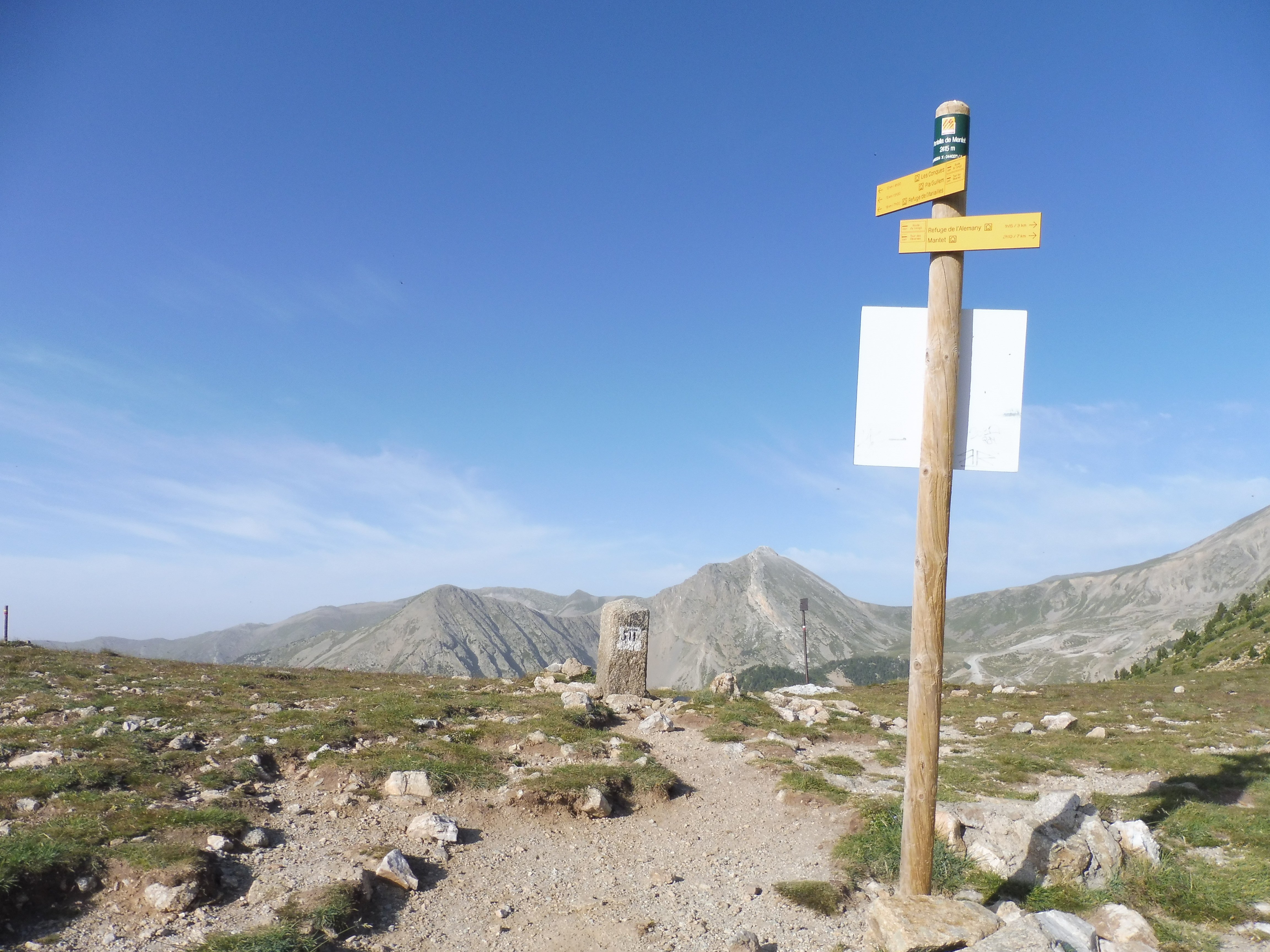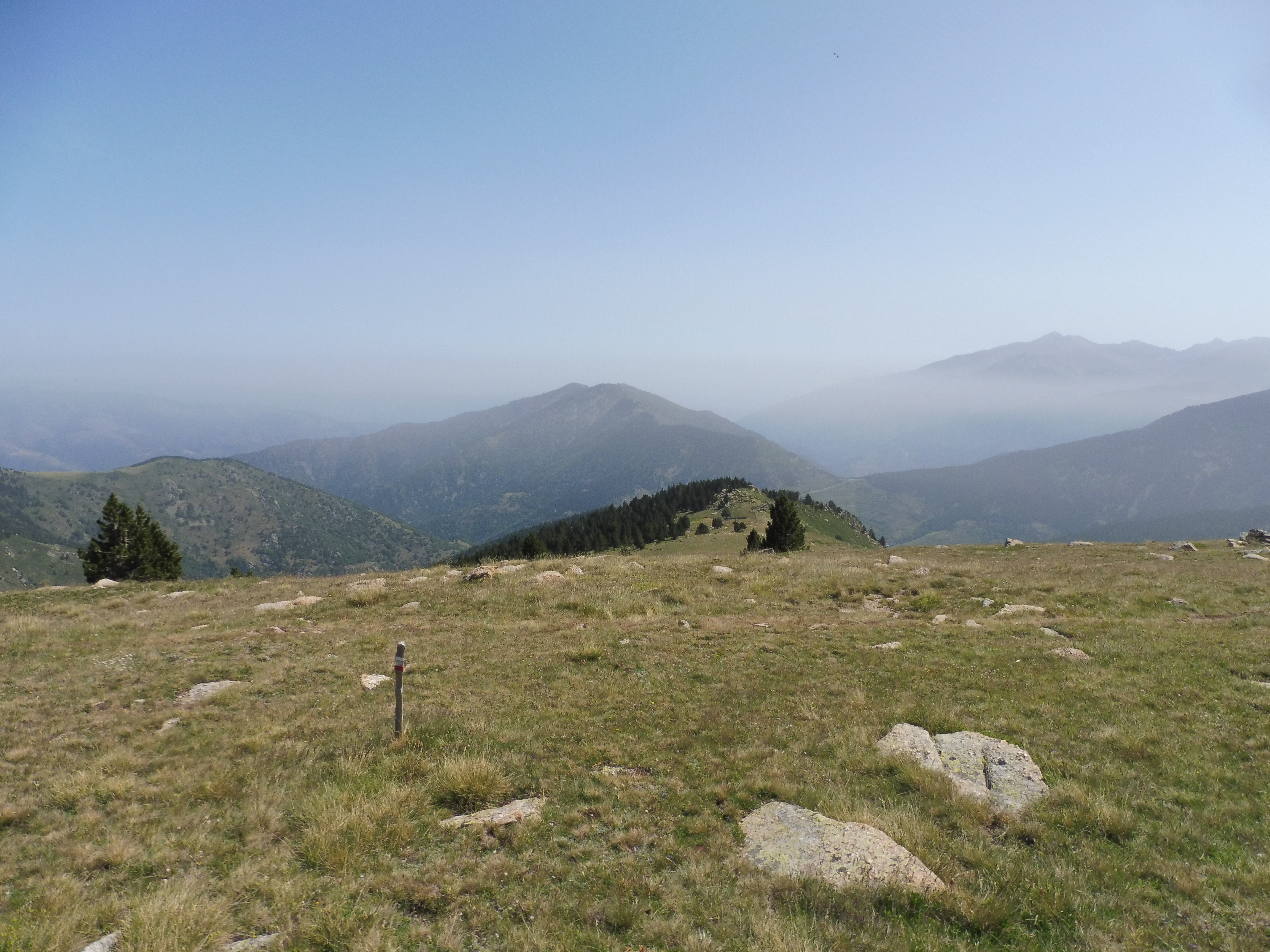 Au niveau du petit col (600 mètres après avoir quitté le Pic de Serra Gallinera) (2537 m), suivre le chemin partant sur la droite et perdant peu d'altitude jusqu'à arriver sur un large replat herbeux direction Mantet (ne pas suivre le chemin partant légèrement sur la gauche qui mène au Coll del Pal ...) (entrée dans la Réserve Naturelle de Mantet)