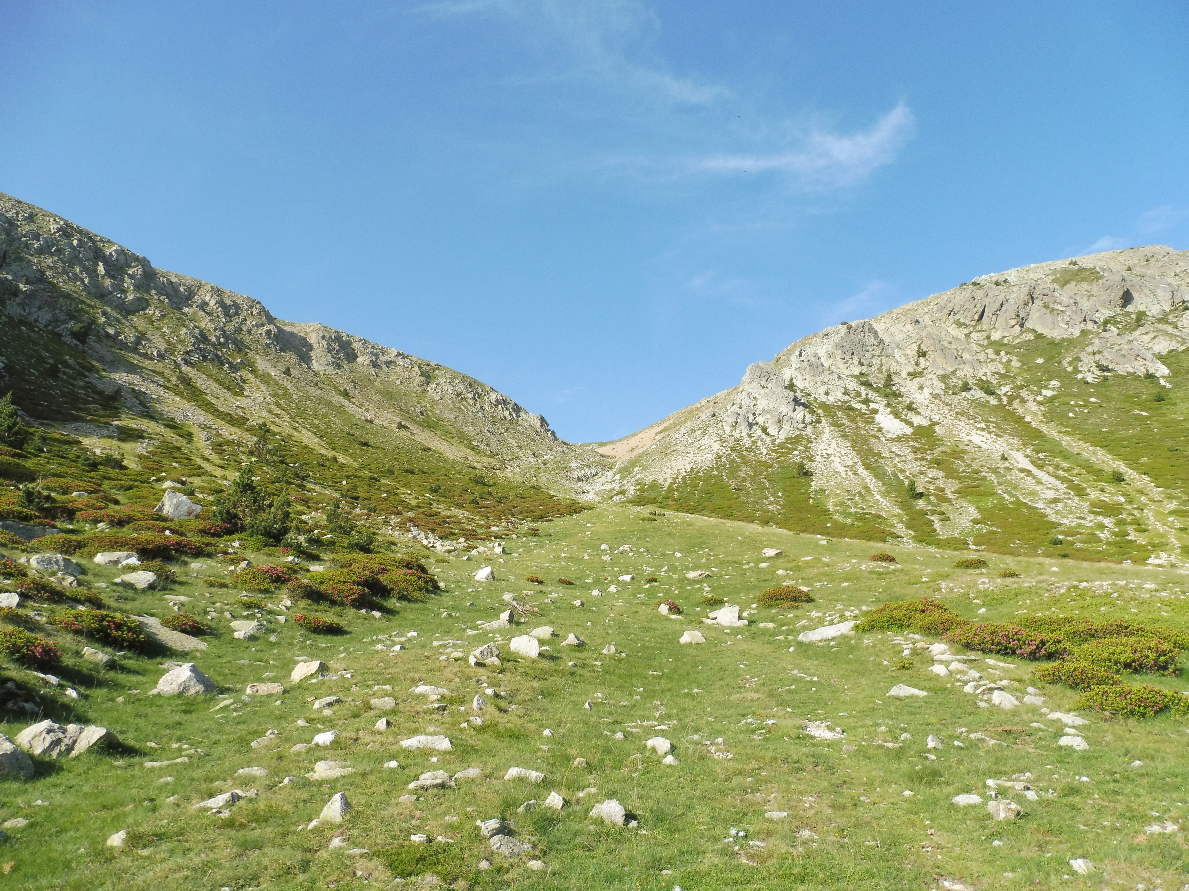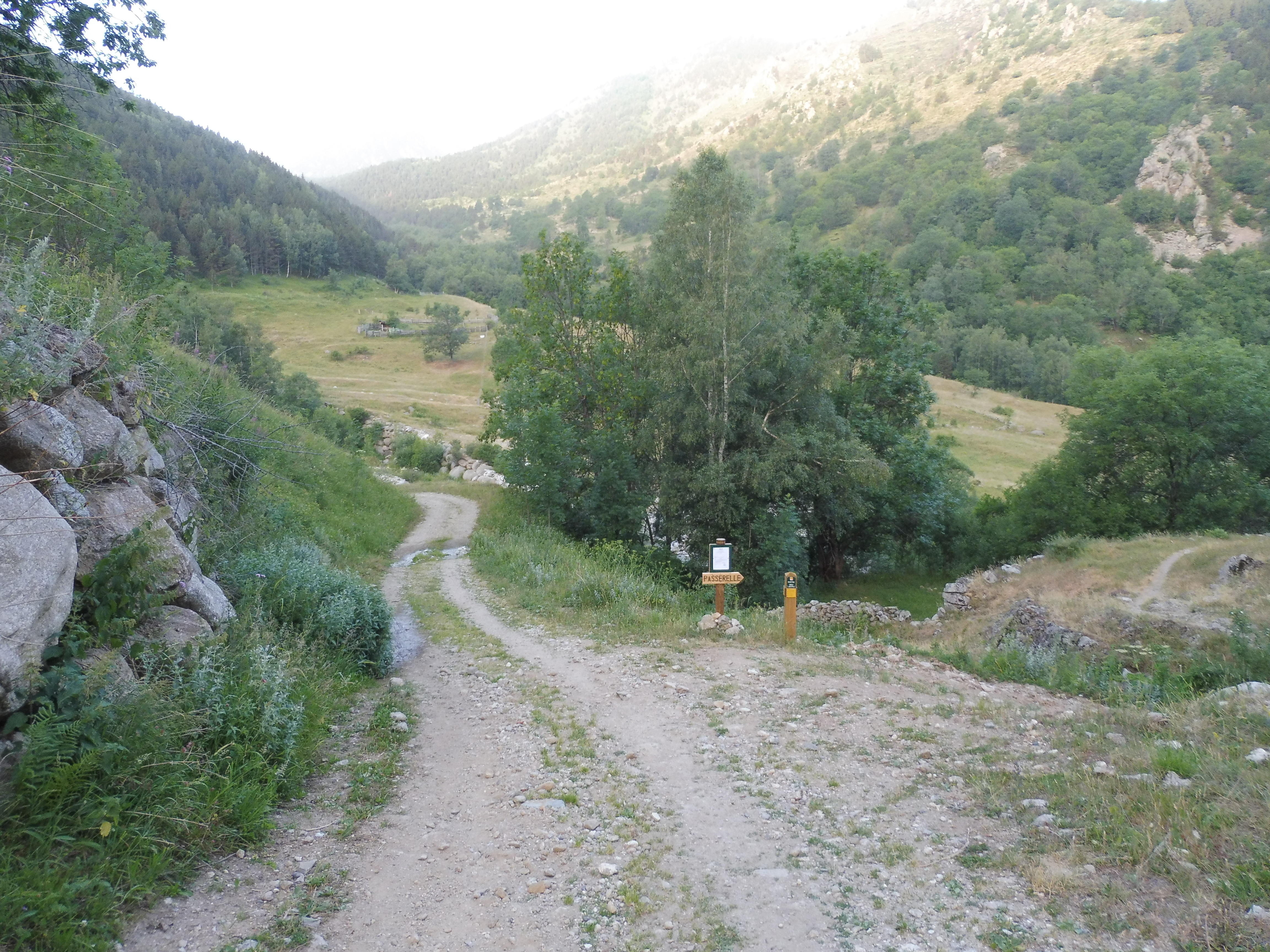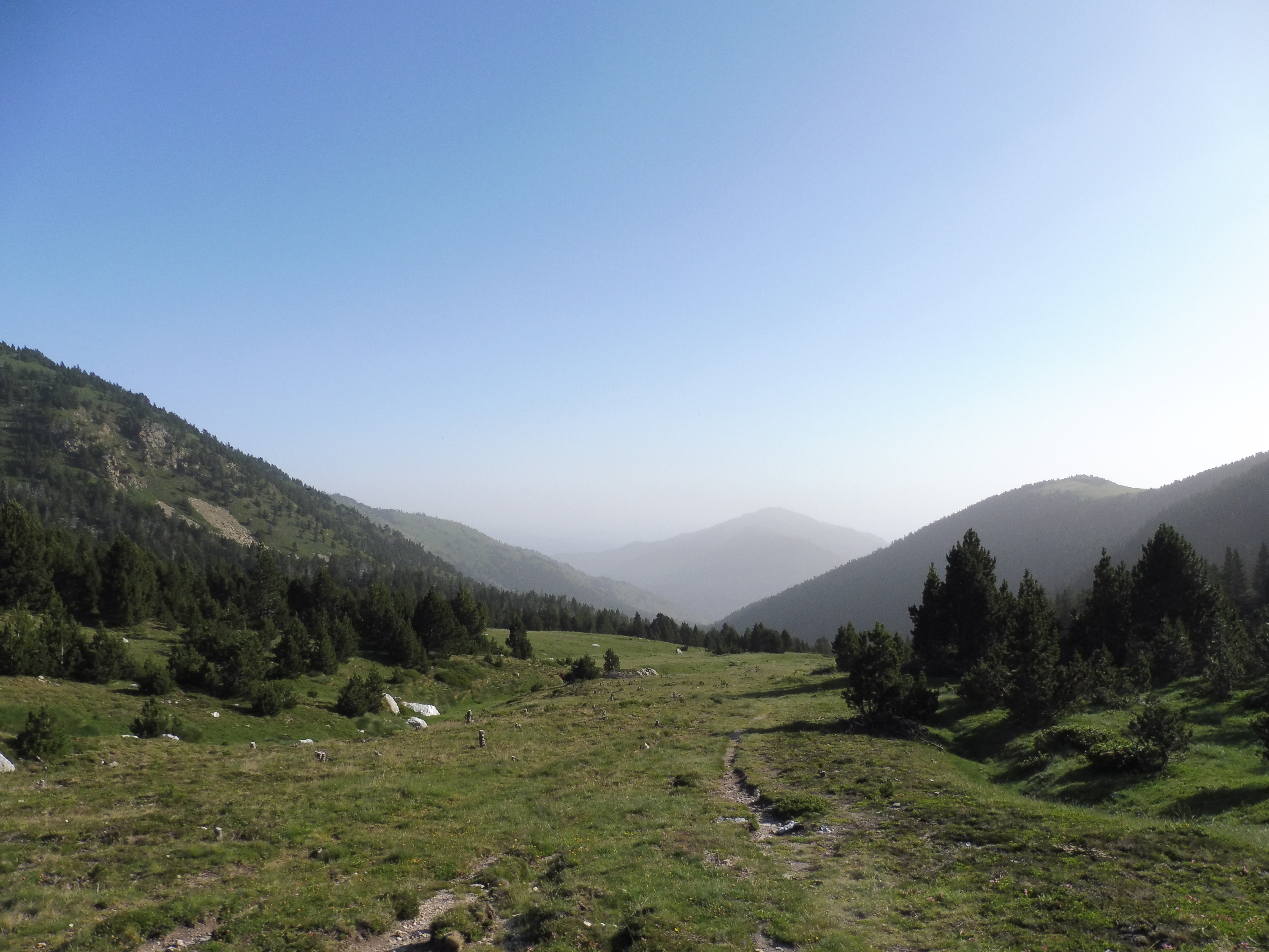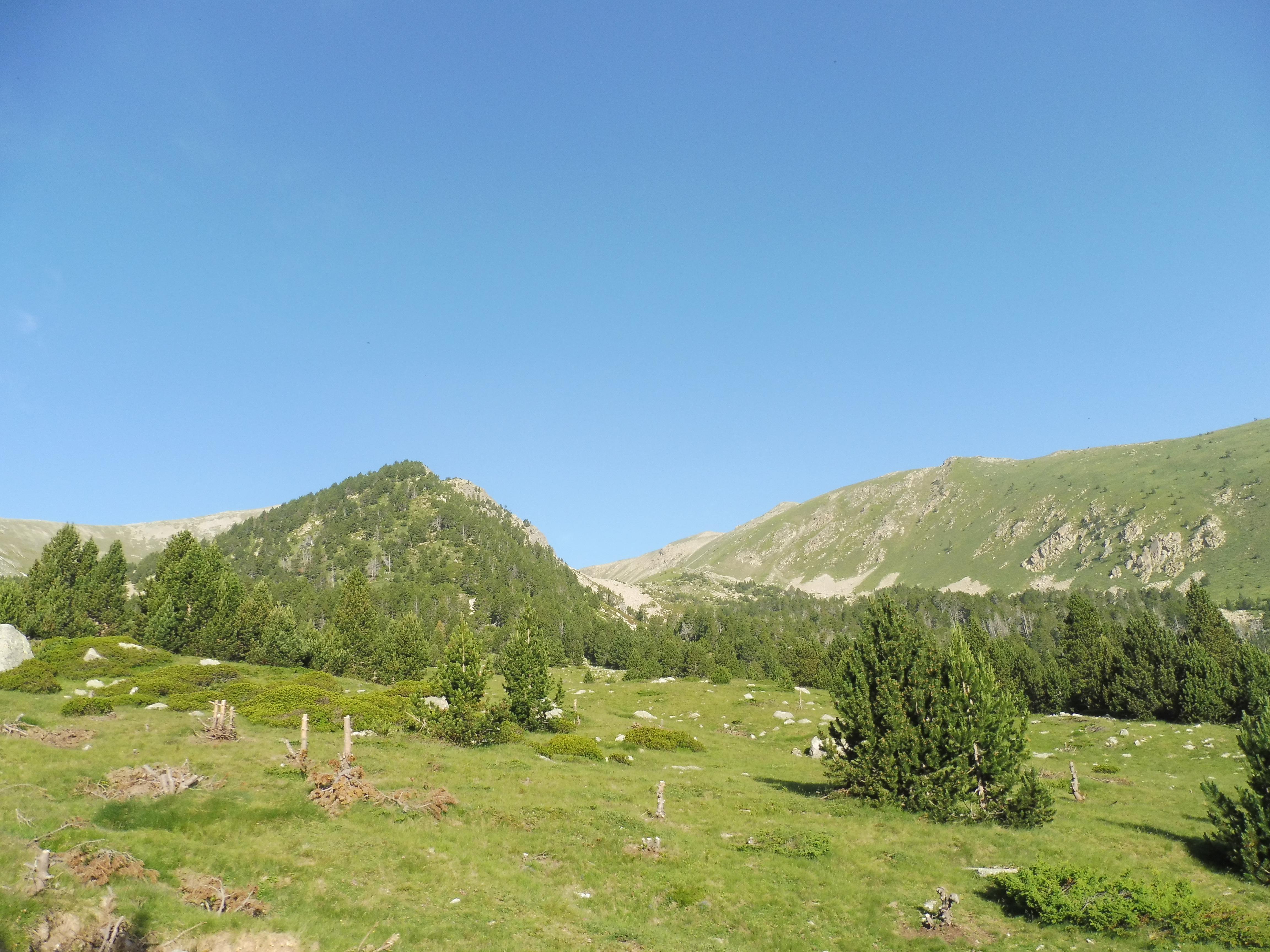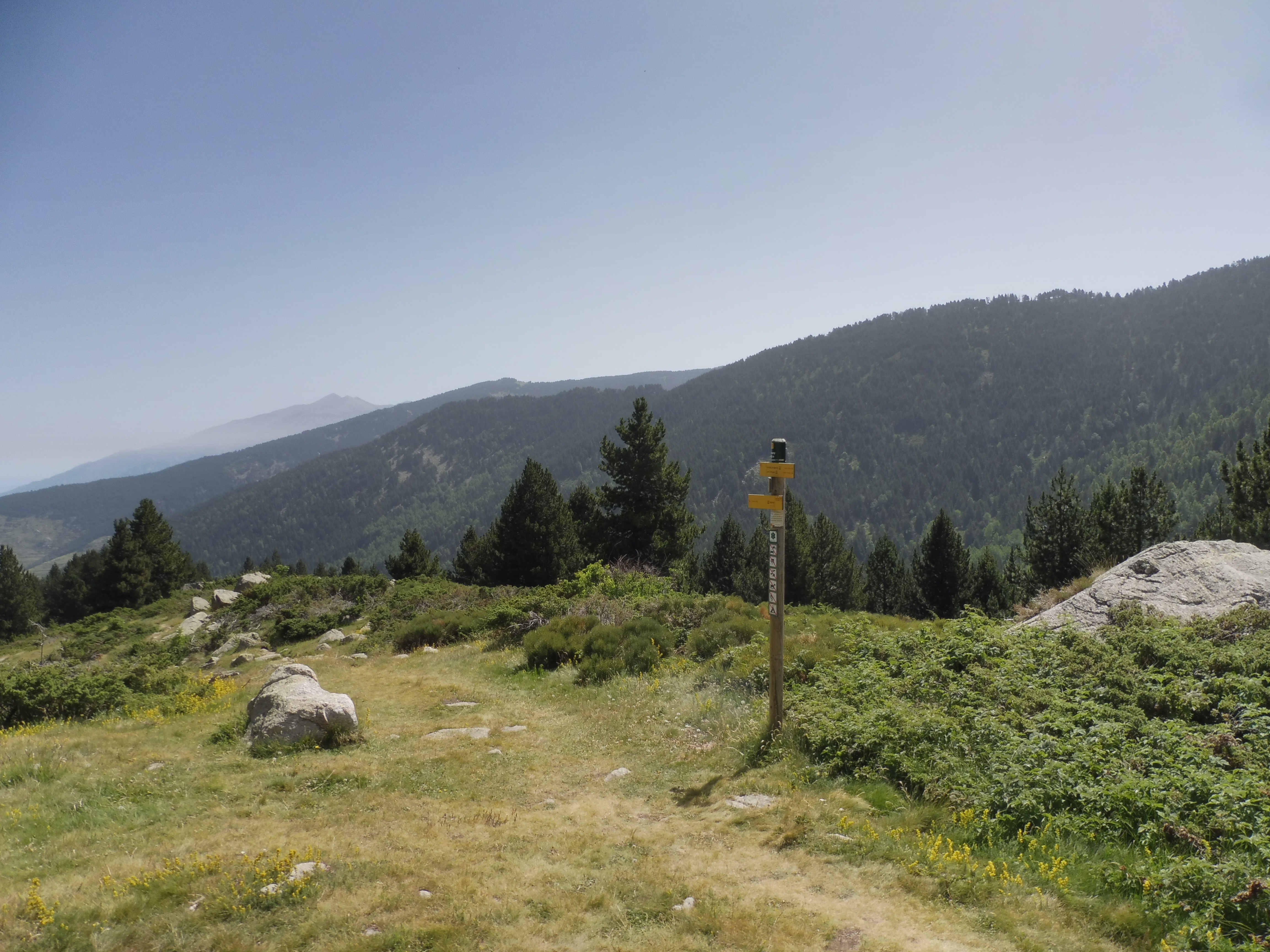 Au niveau du petit col (600 mètres après avoir quitté le Pic de Serra Gallinera) (2537 m), suivre le chemin partant sur la droite et perdant peu d'altitude jusqu'à arriver sur un large replat herbeux direction Mantet (ne pas suivre le chemin partant légèrement sur la gauche qui mène au Coll del Pal ...) (entrée dans la Réserve Naturelle de Mantet)