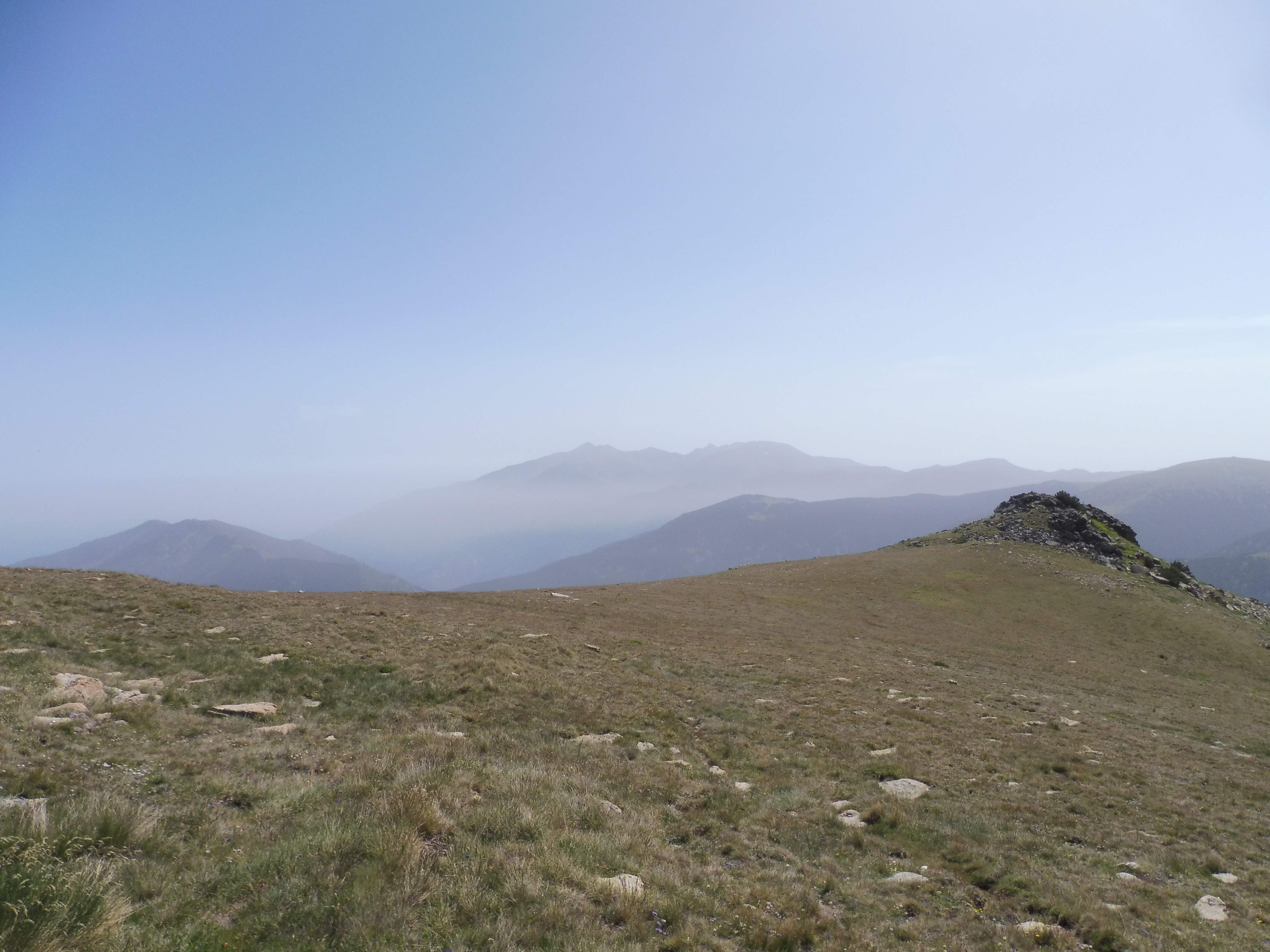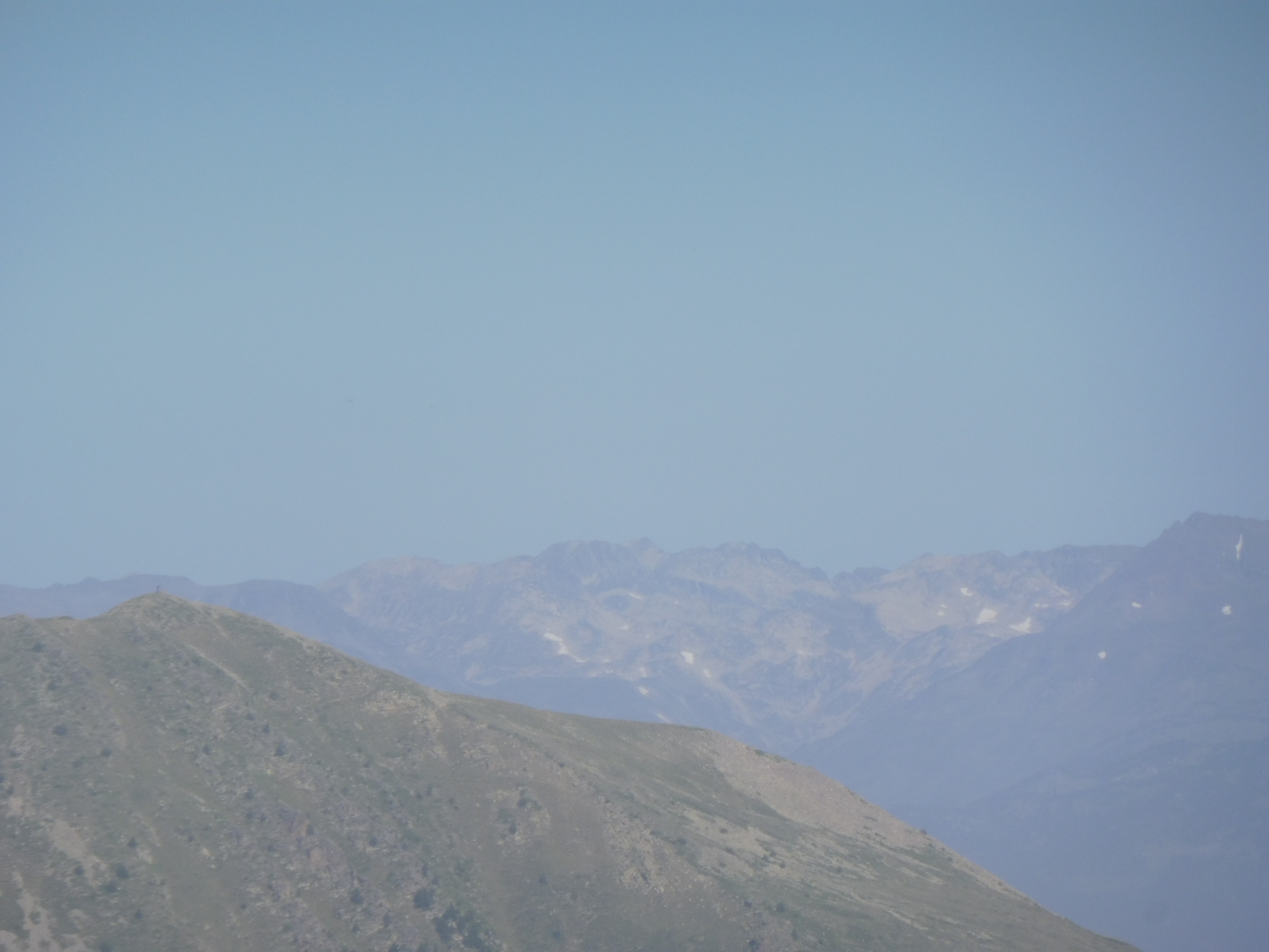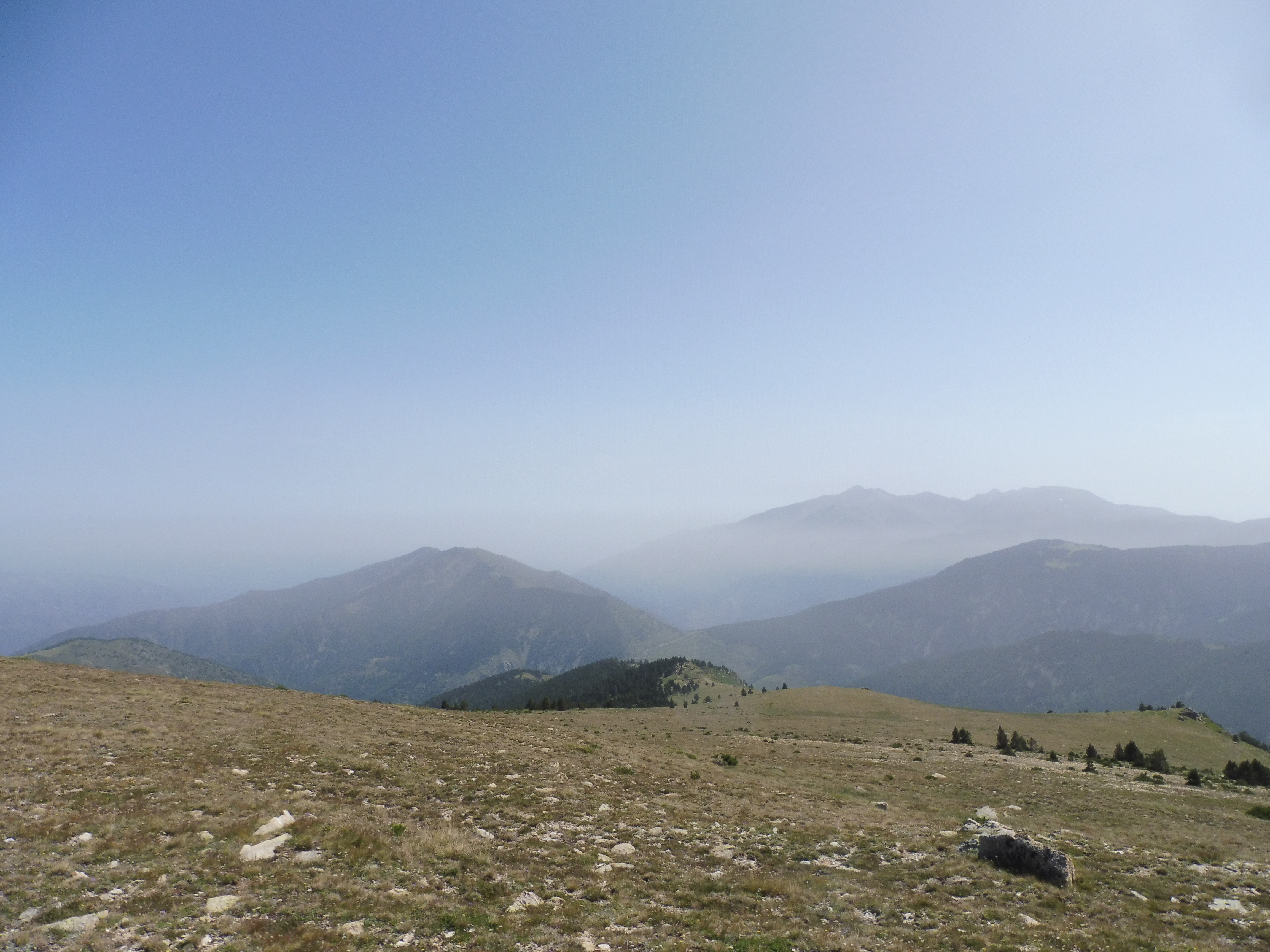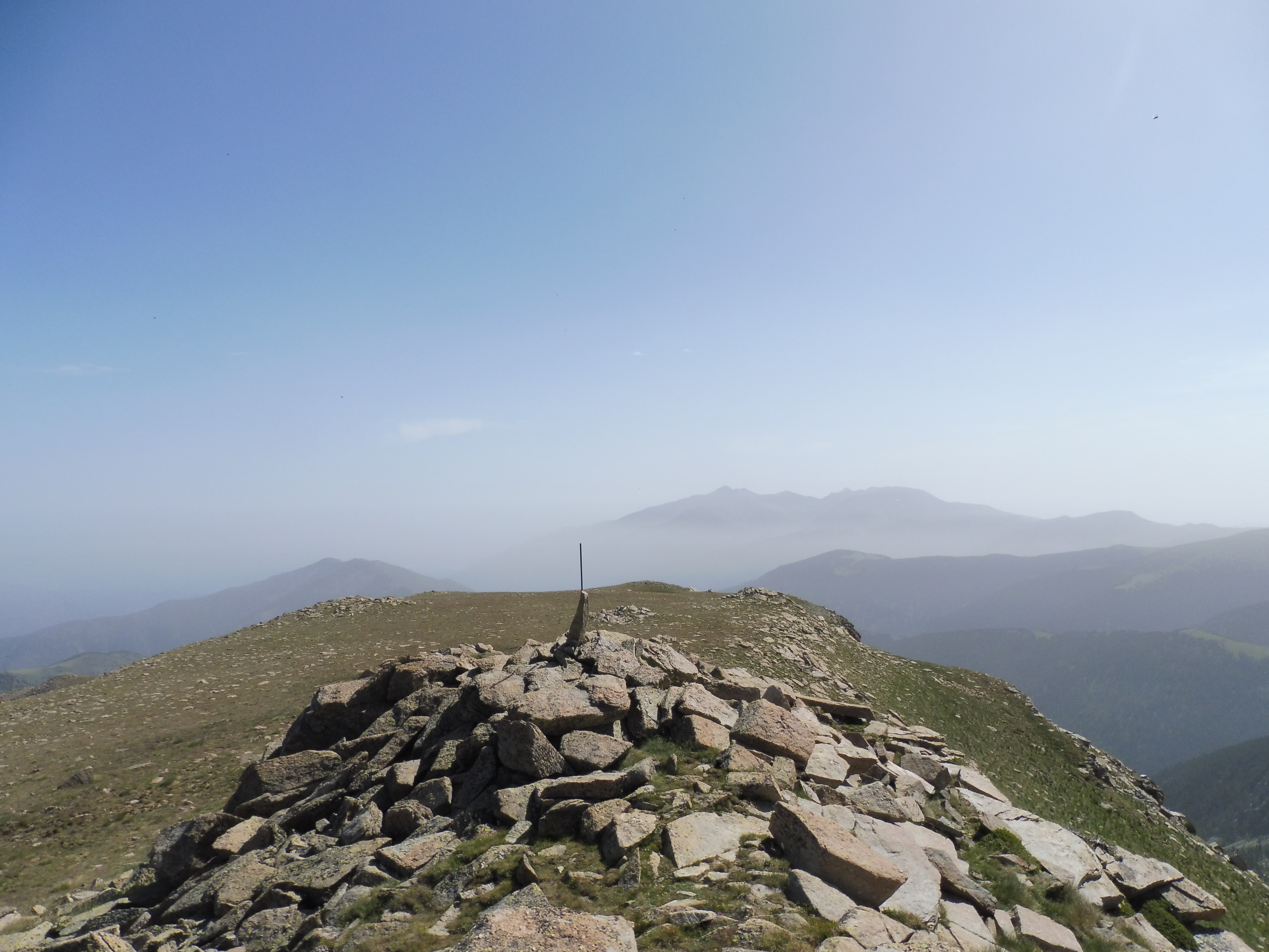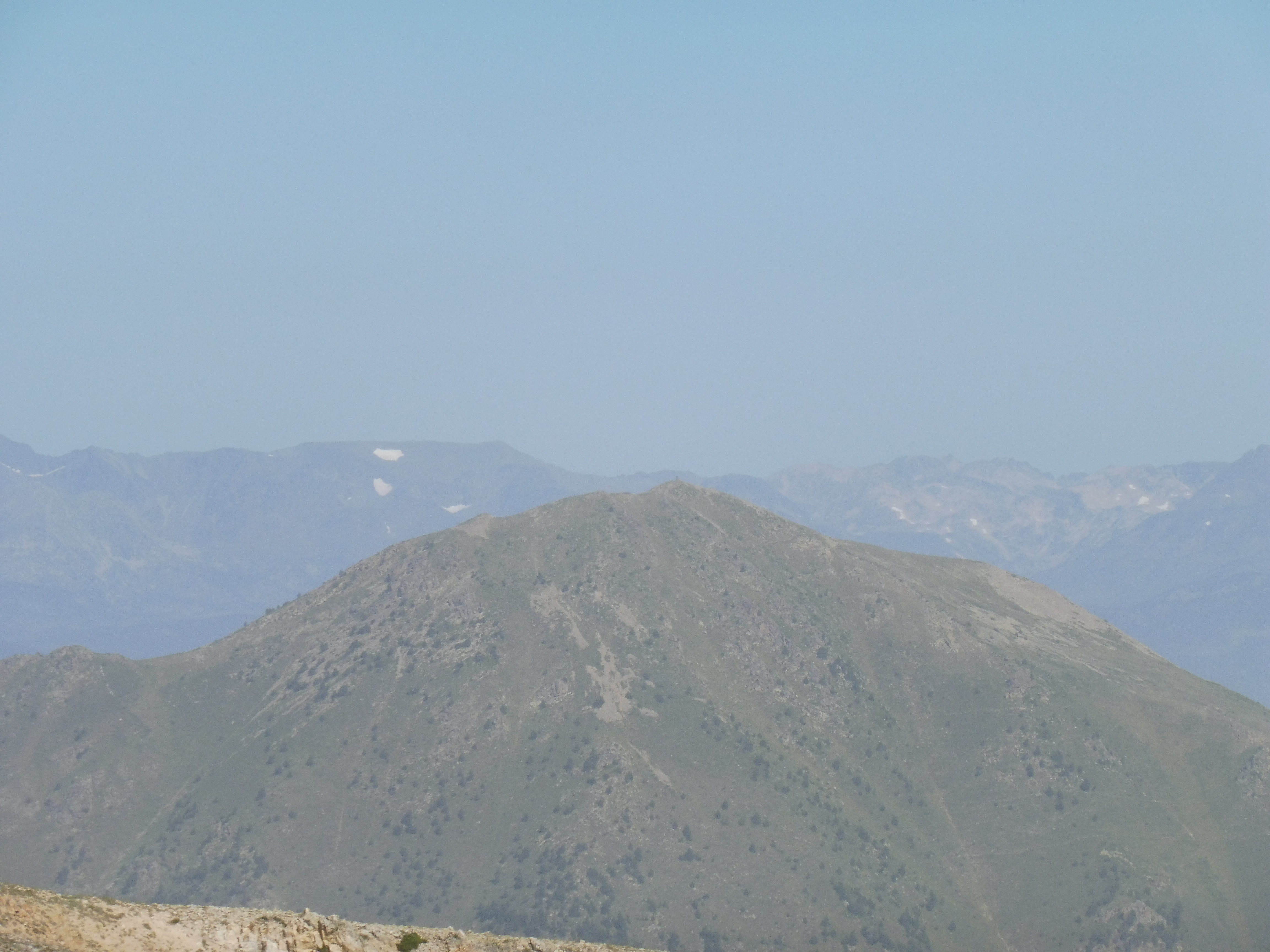 Arrivée au sommet du Pic de Serra Gallinera (2663 m) : beau panorama sur les sommets du Conflent, de la Cerdagne, du Capcir ... la brume de poussière est toujours là !