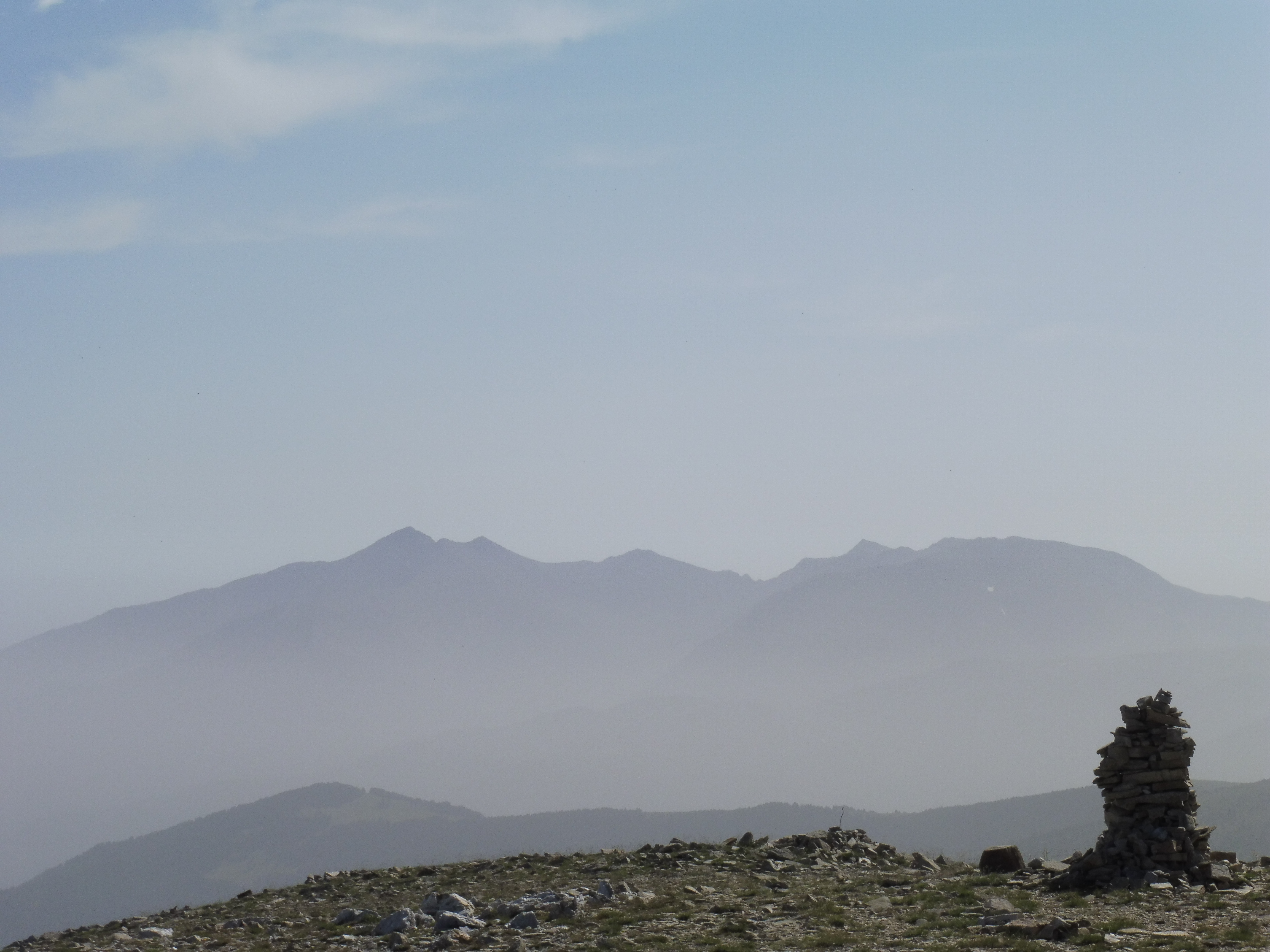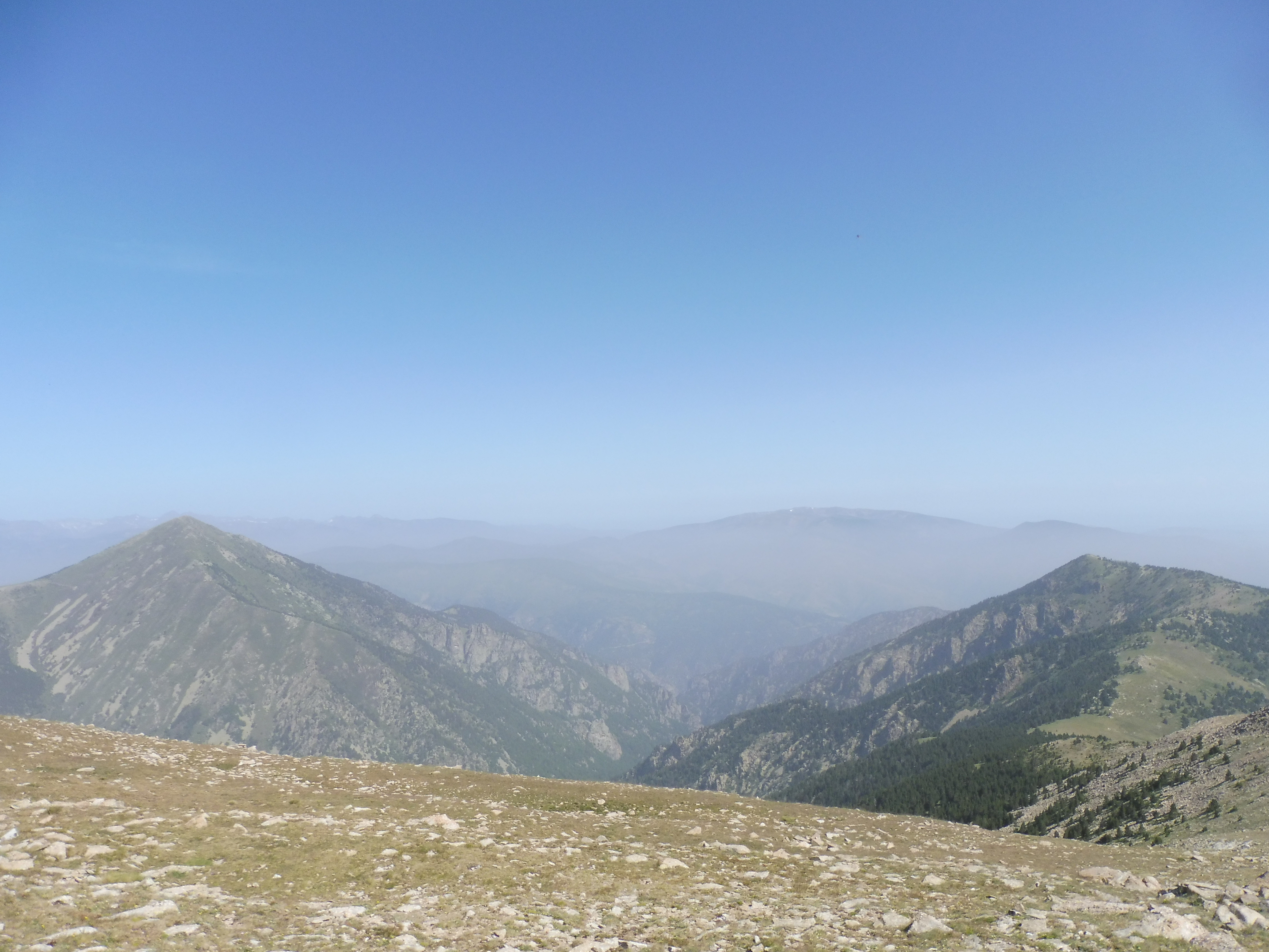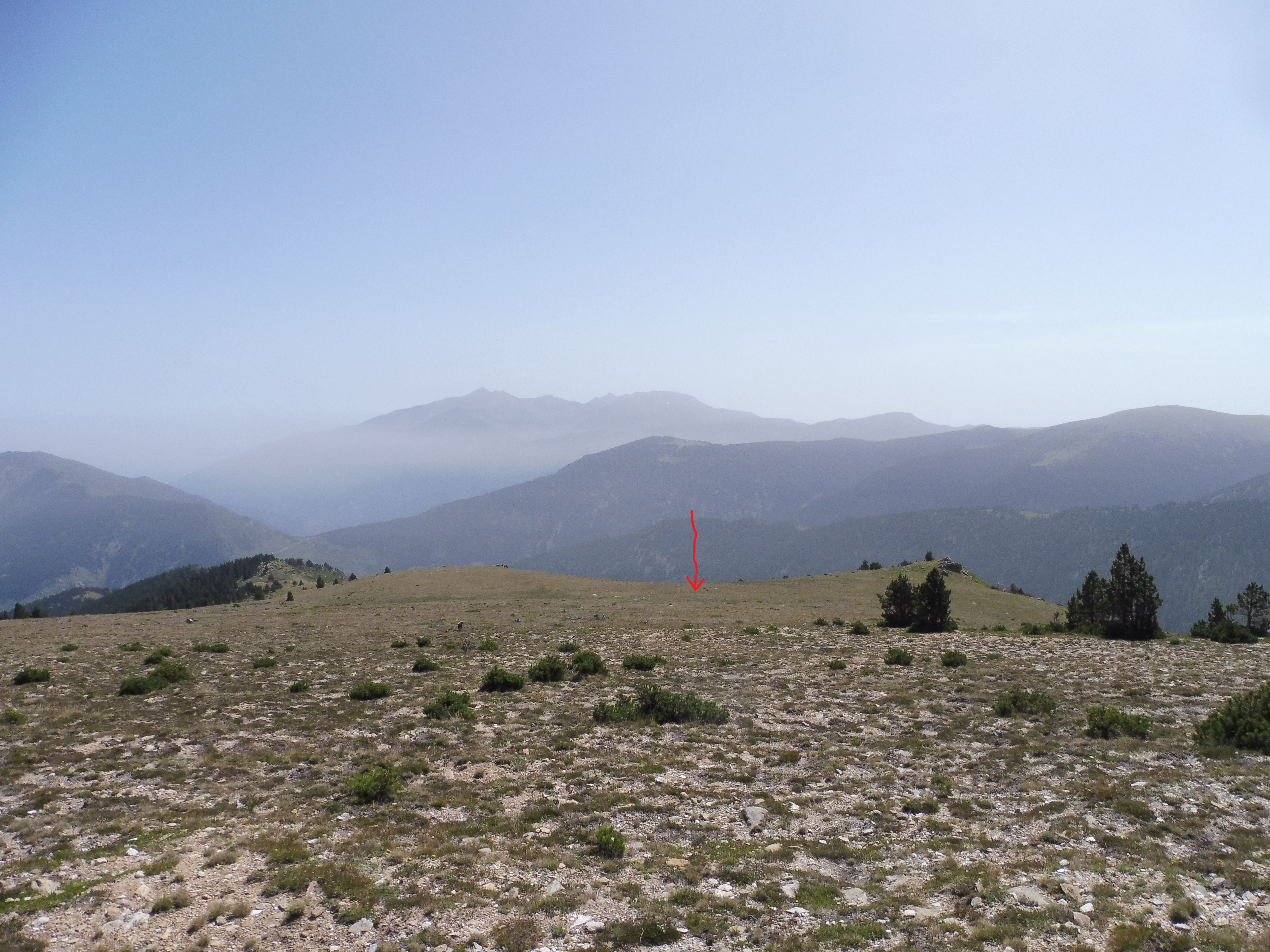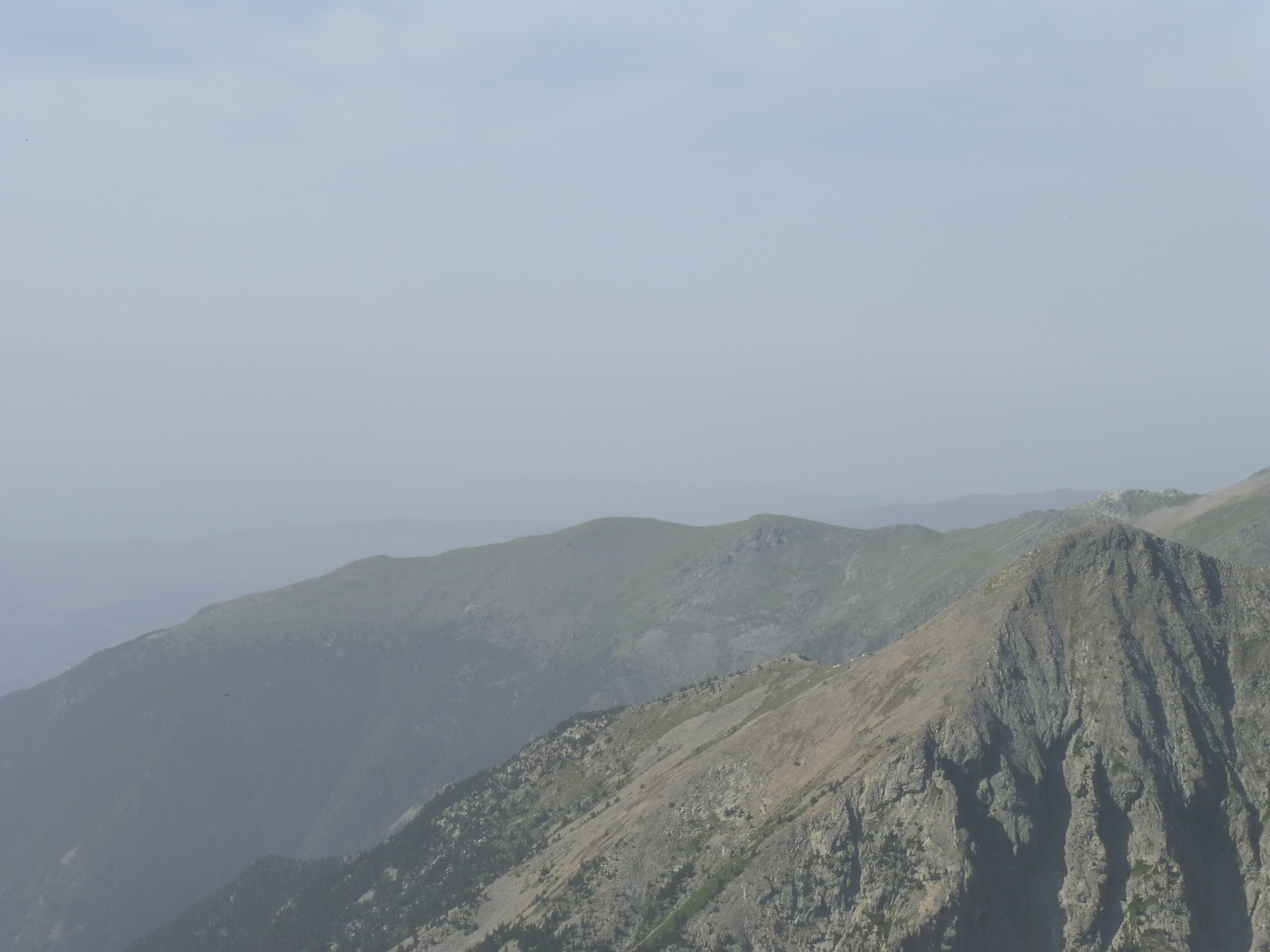 Arrivée au sommet du Pic de Serra Gallinera (2663 m) : beau panorama sur les sommets du Conflent, de la Cerdagne, du Capcir ... la brume de poussière est toujours là !