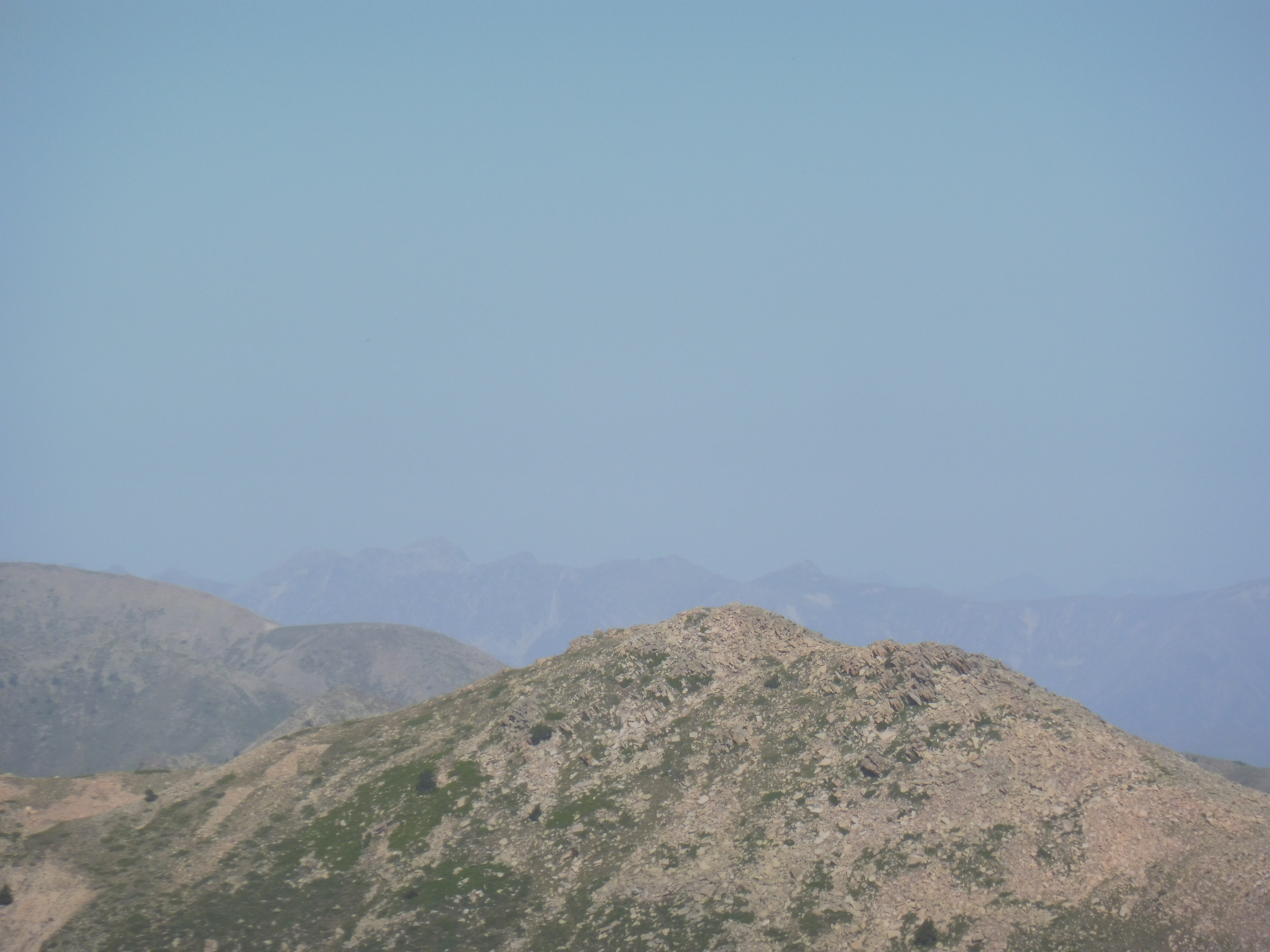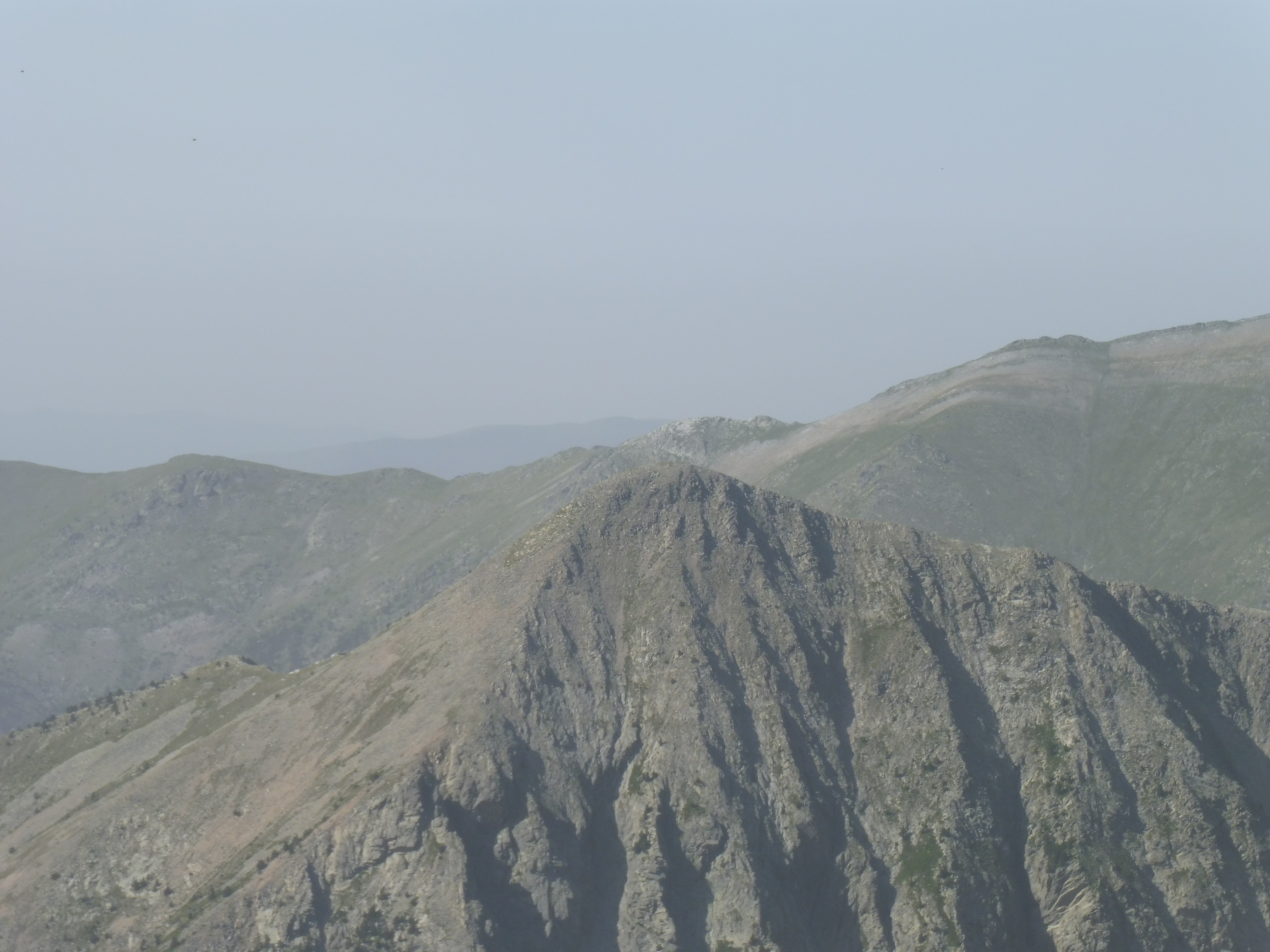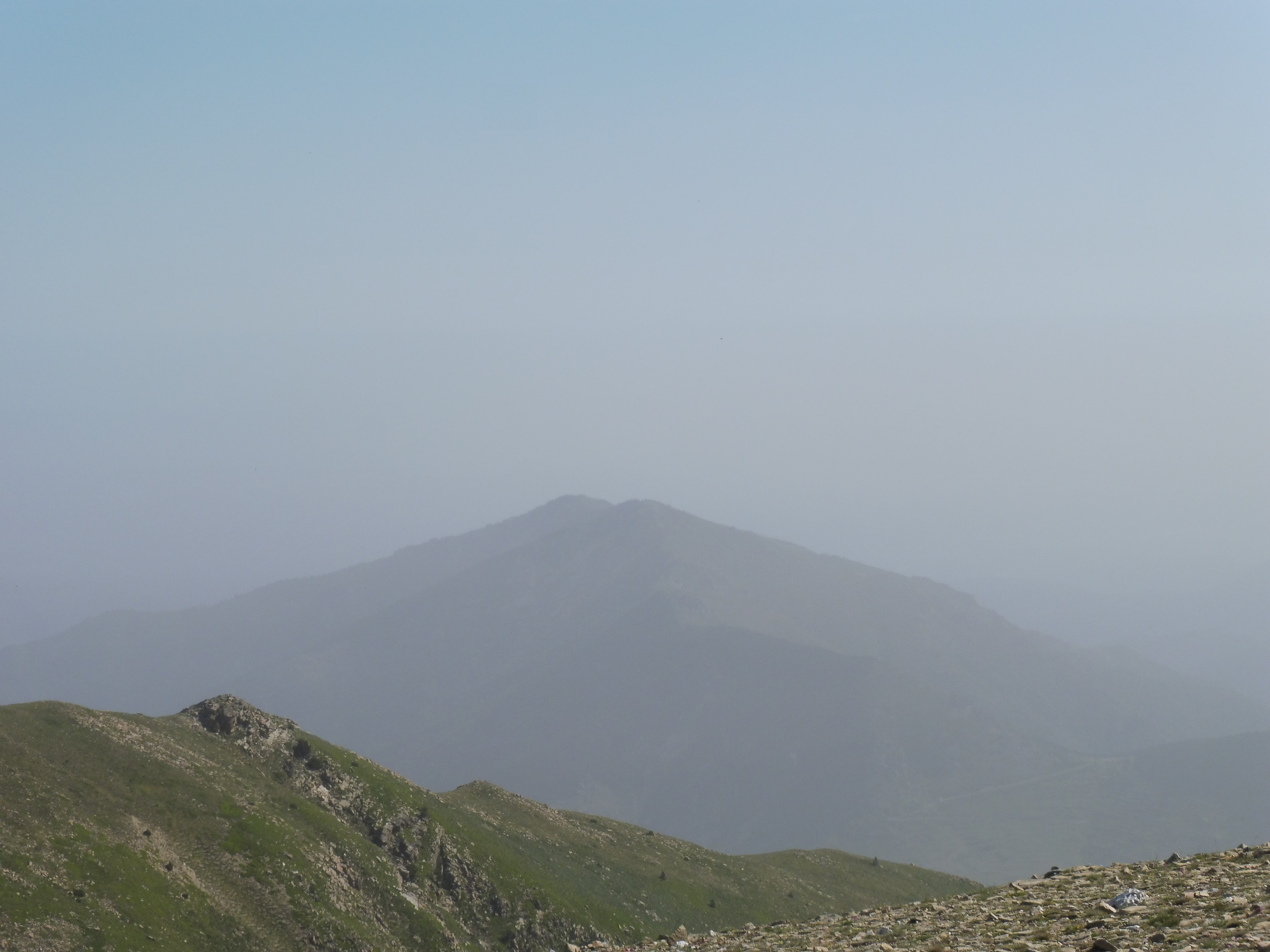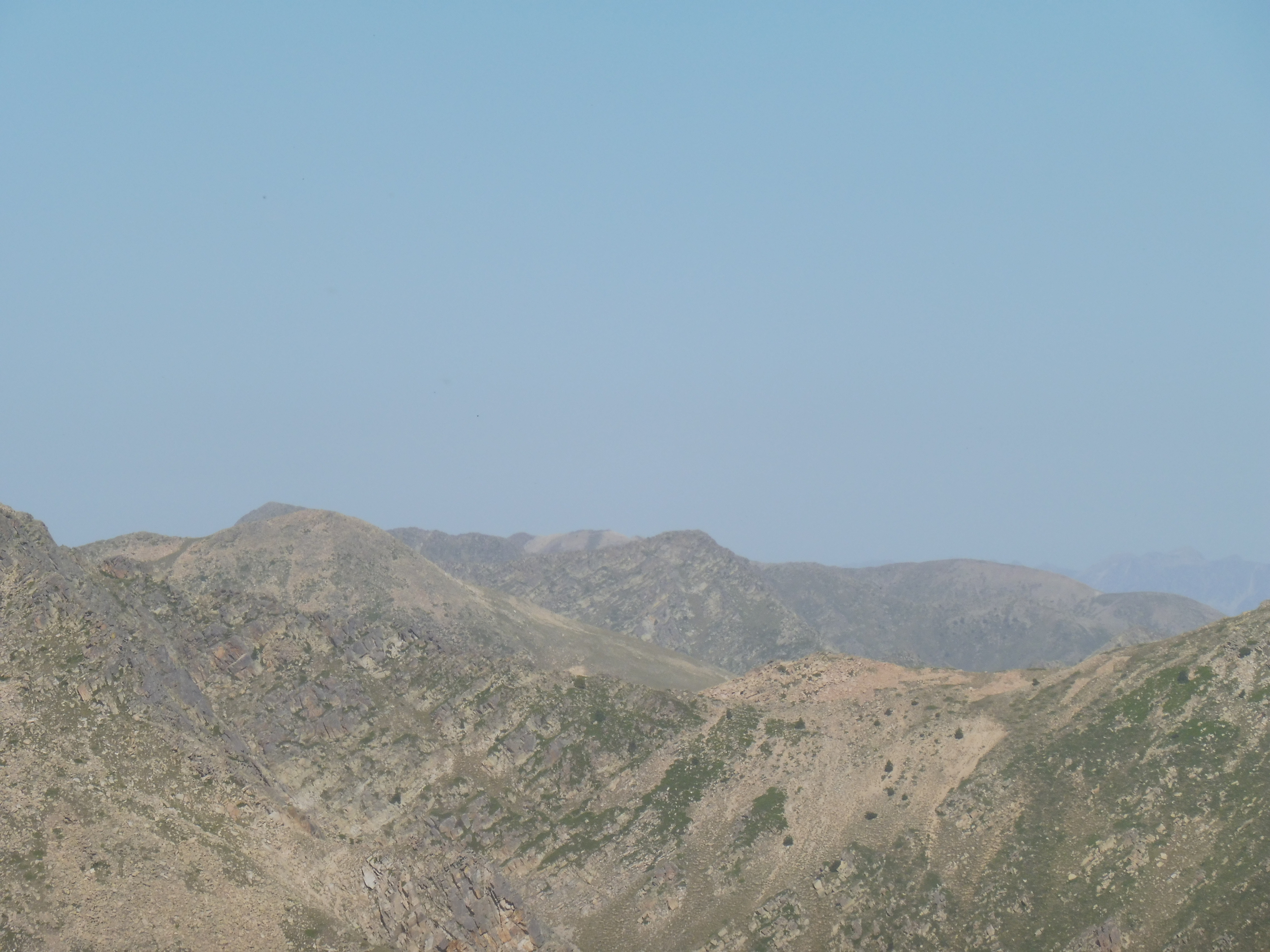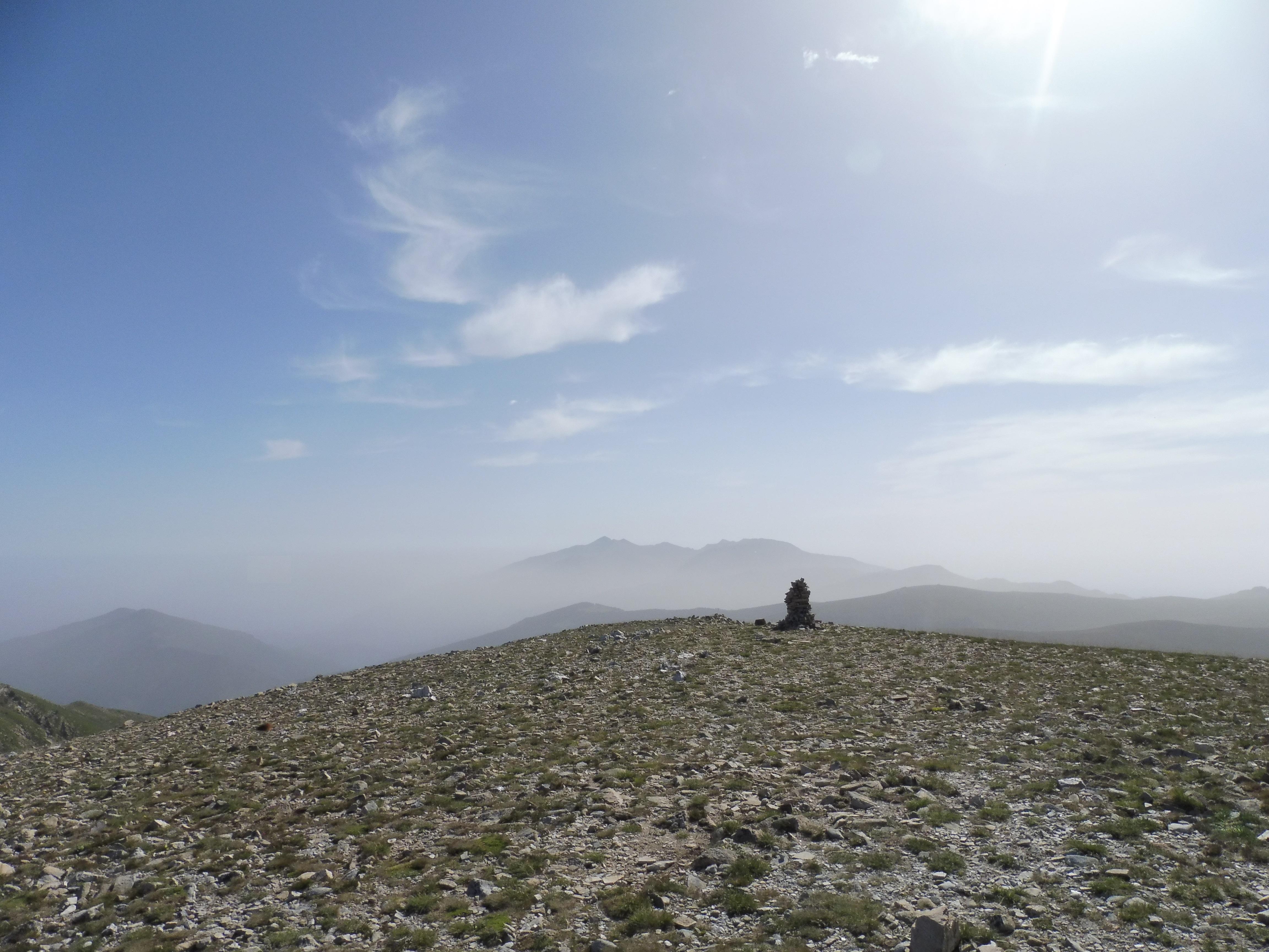 Arrivée au sommet du Pic de Serra Gallinera (2663 m) : beau panorama sur les sommets du Conflent, de la Cerdagne, du Capcir ... la brume de poussière est toujours là !