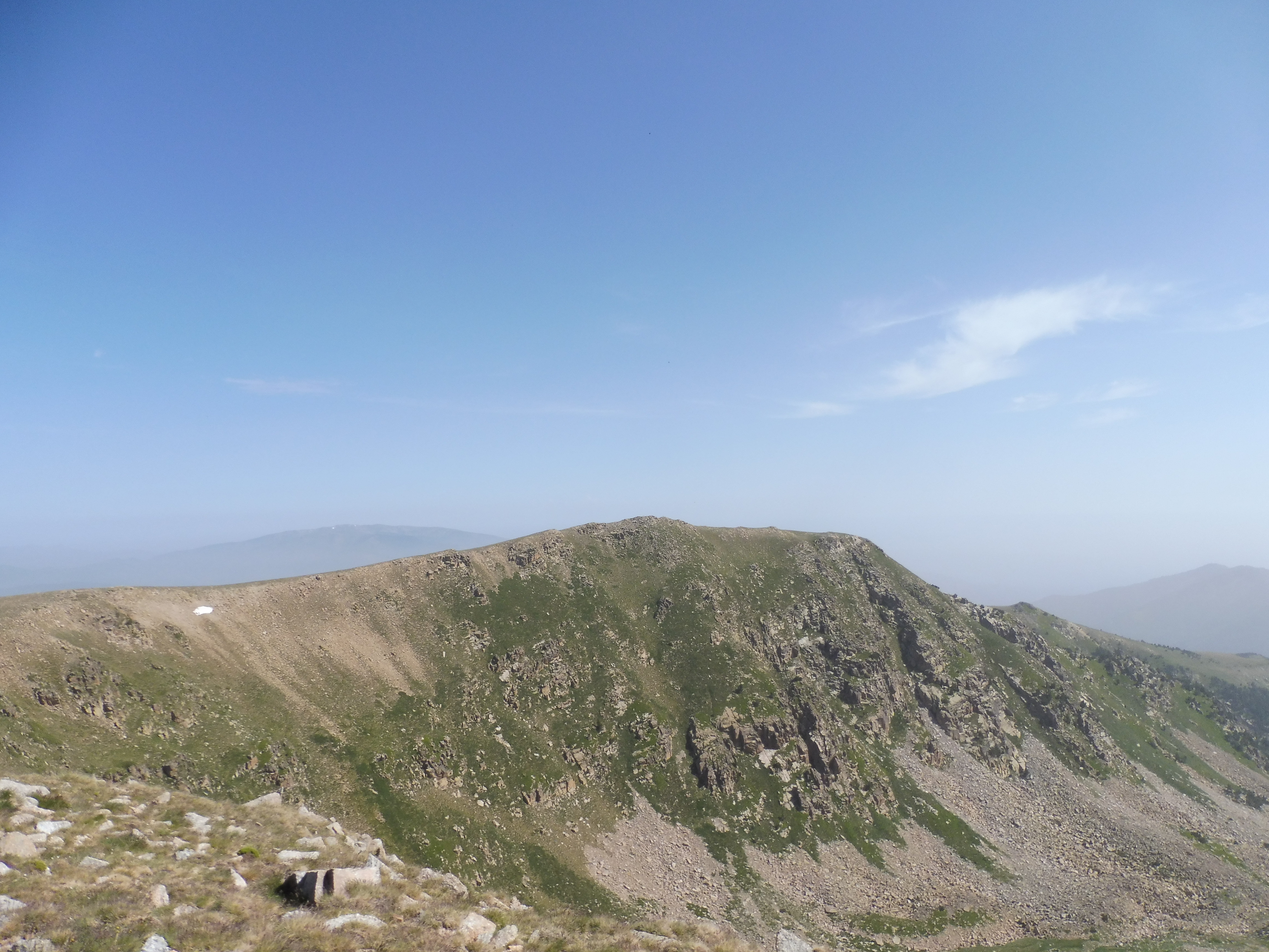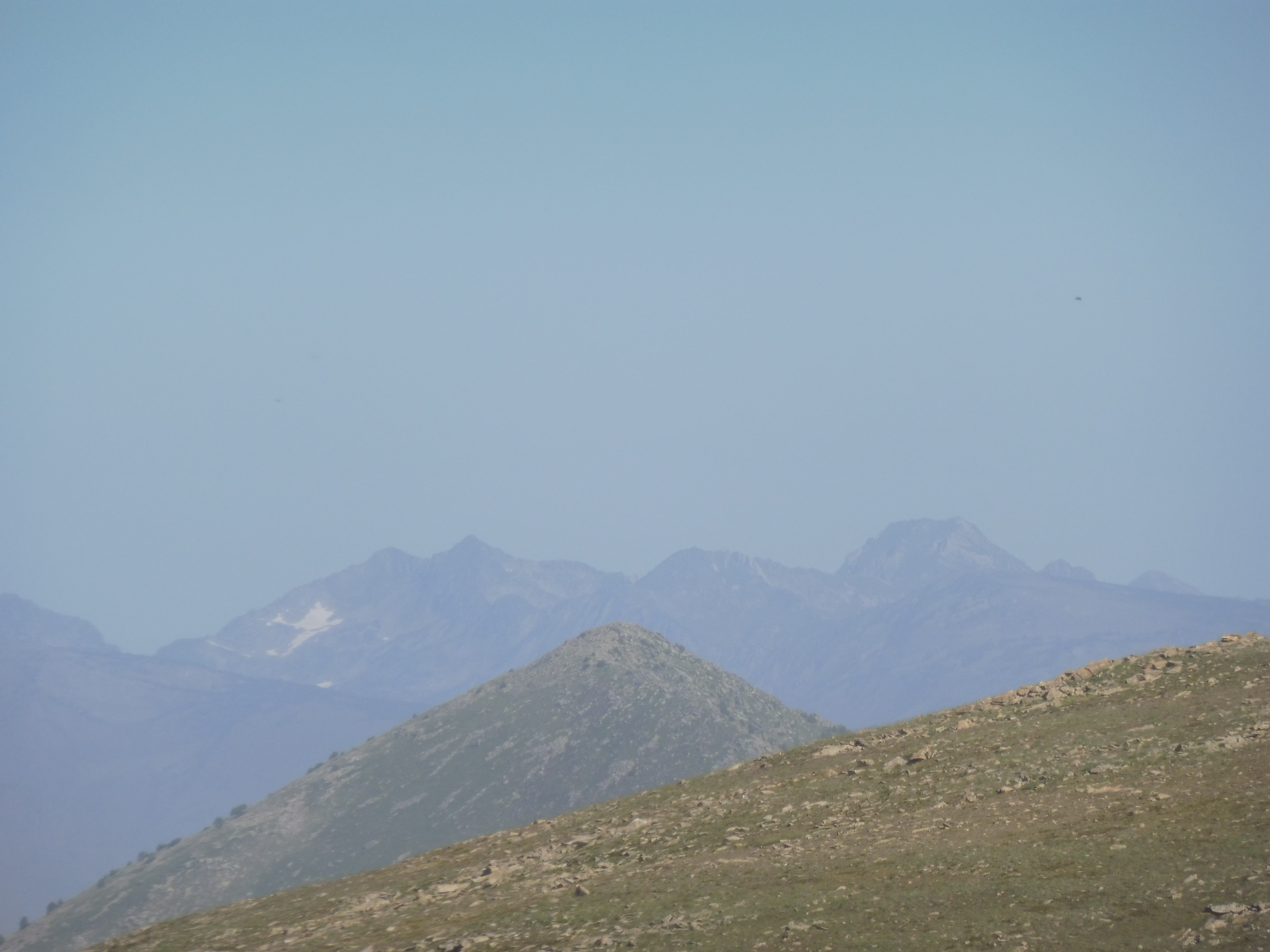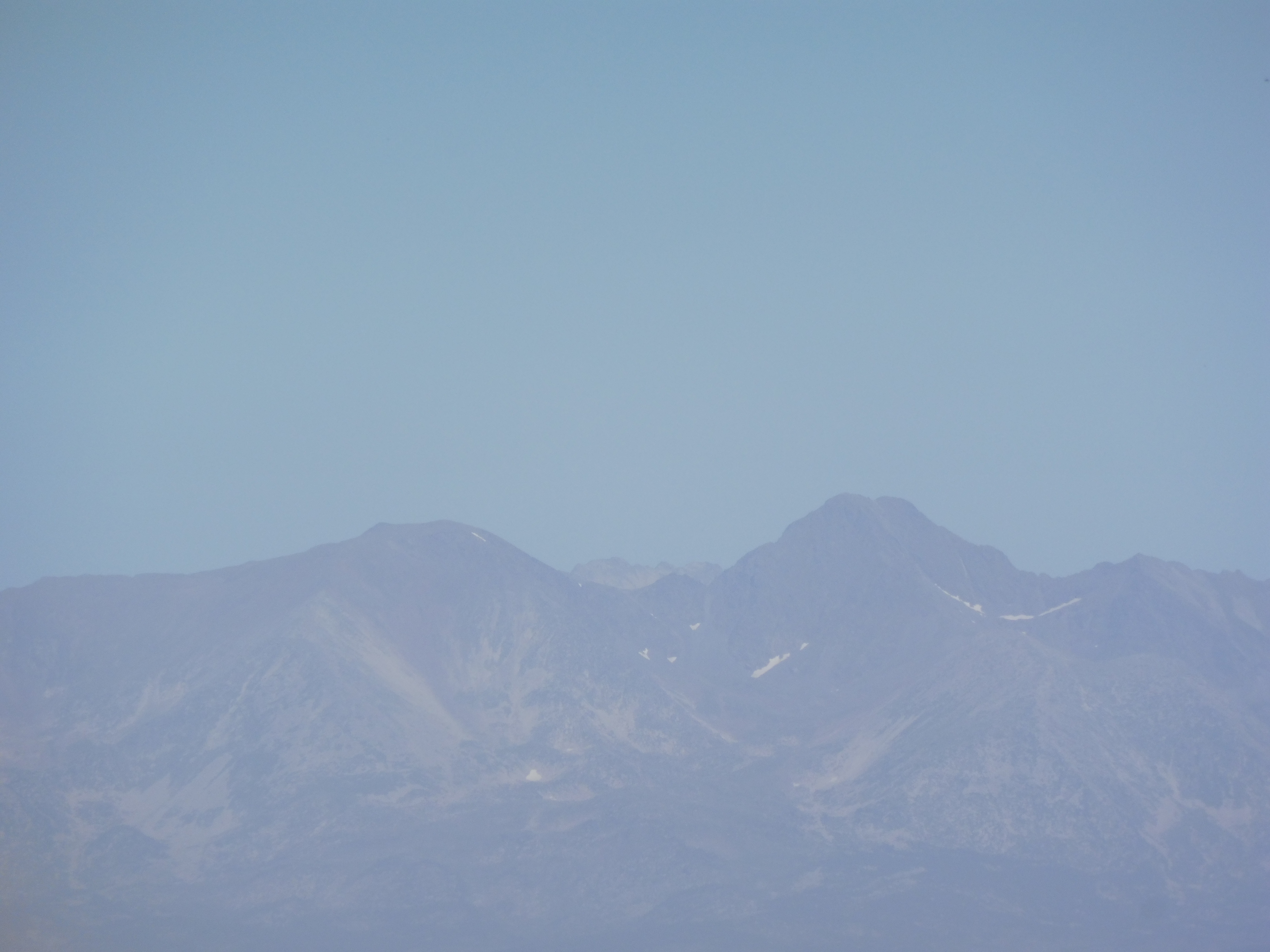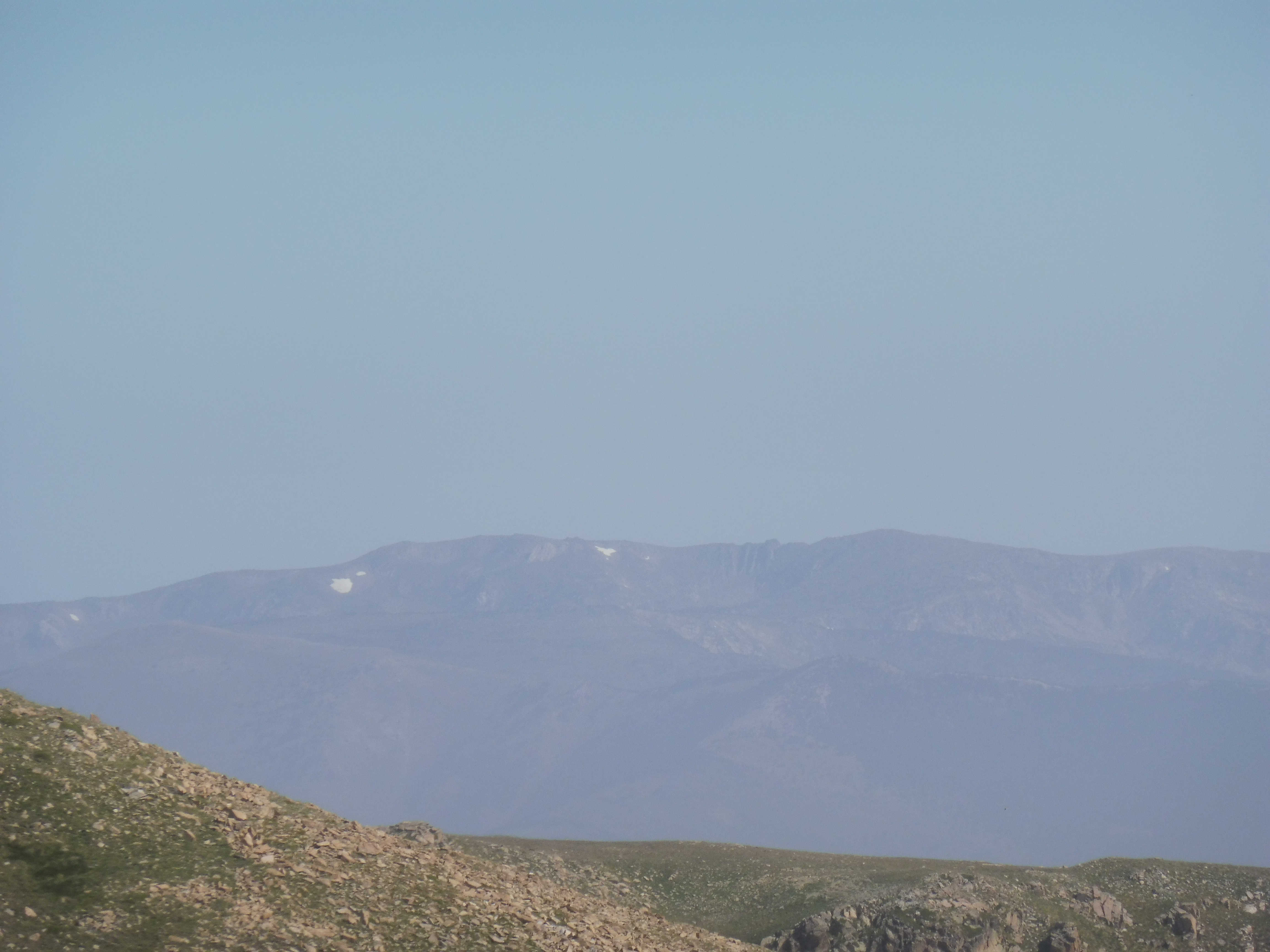 Arrivée au sommet du Pic de Serra Gallinera (2663 m) : beau panorama sur les sommets du Conflent, de la Cerdagne, du Capcir ... la brume de poussière est toujours là !