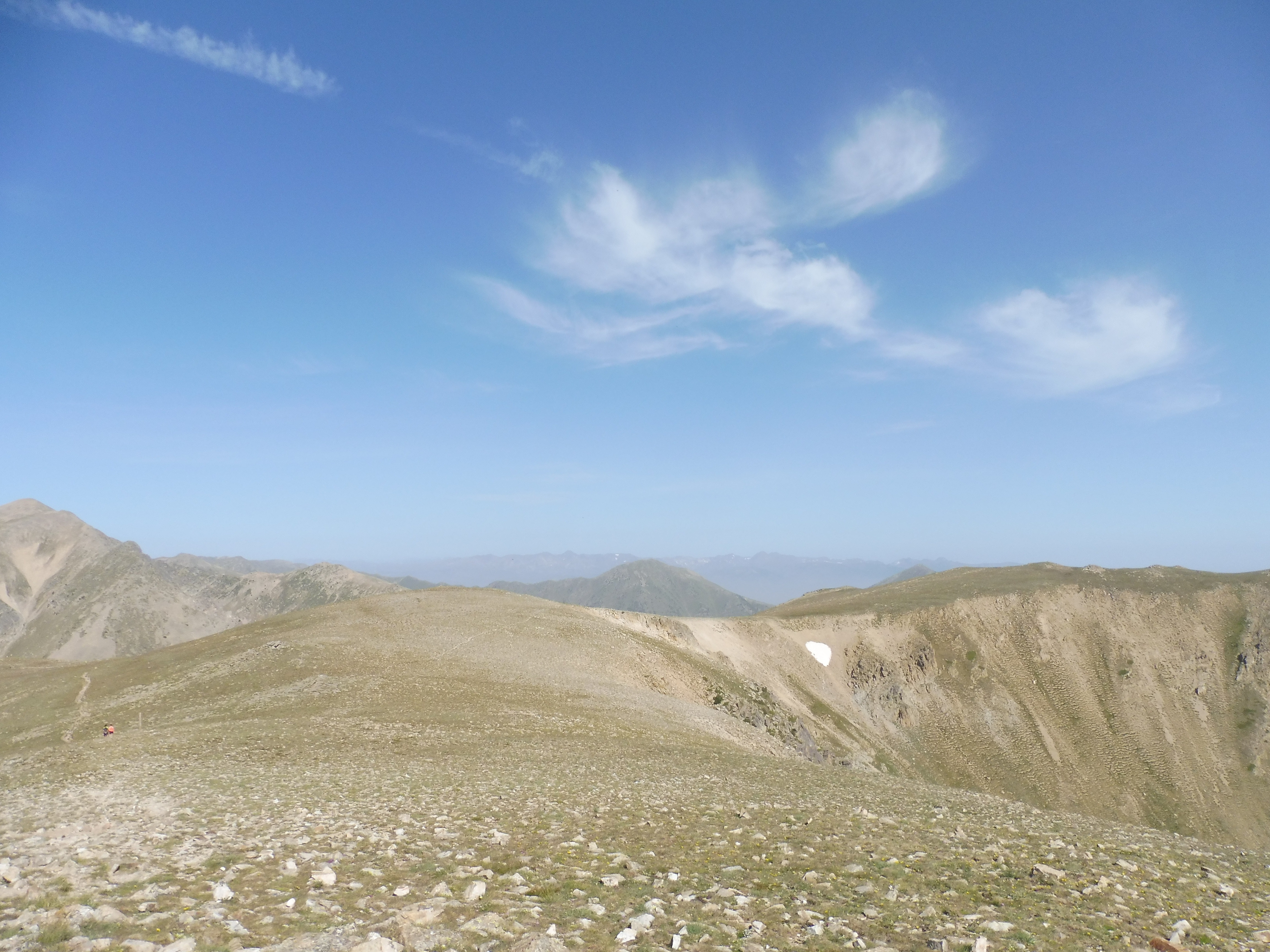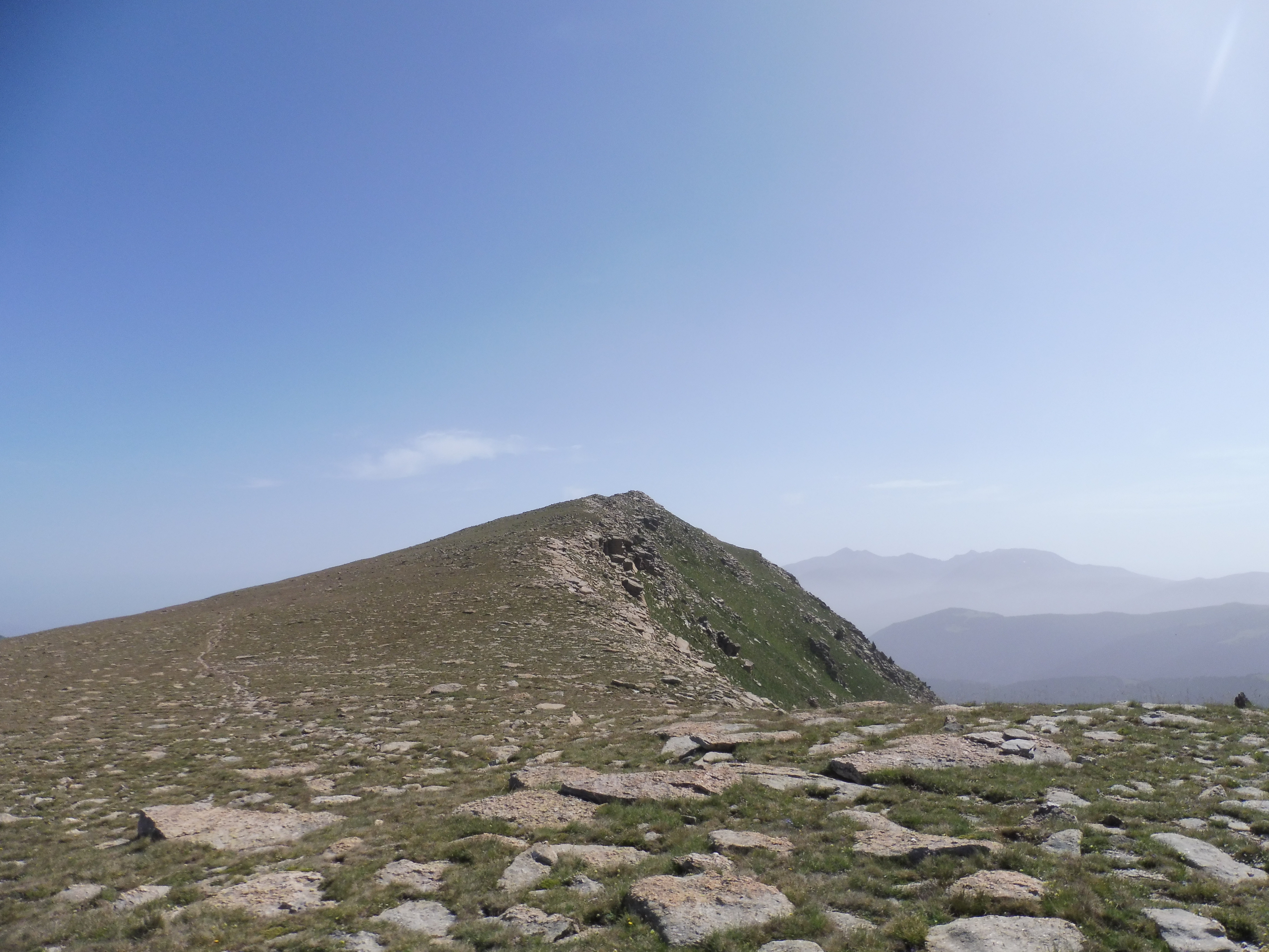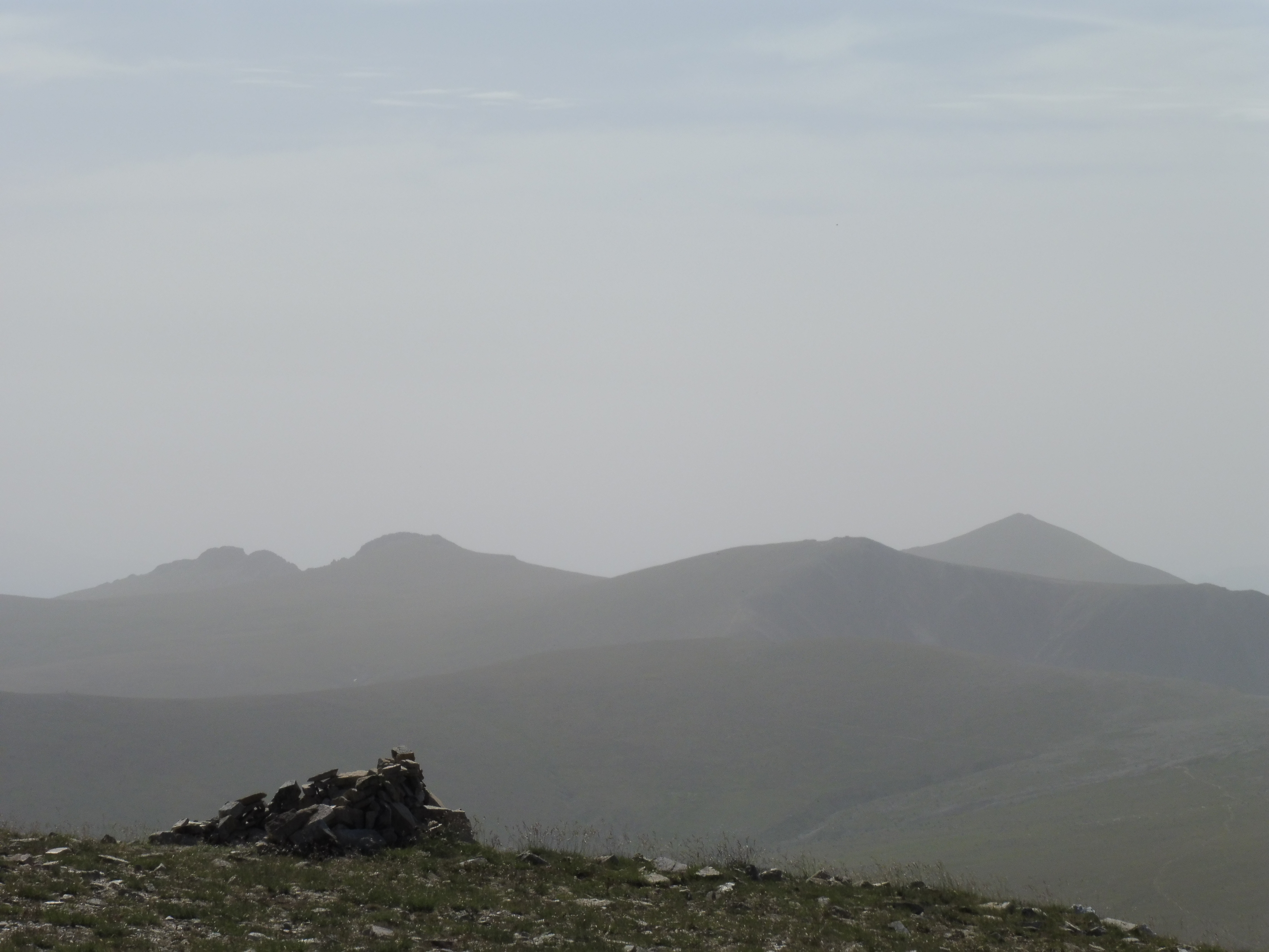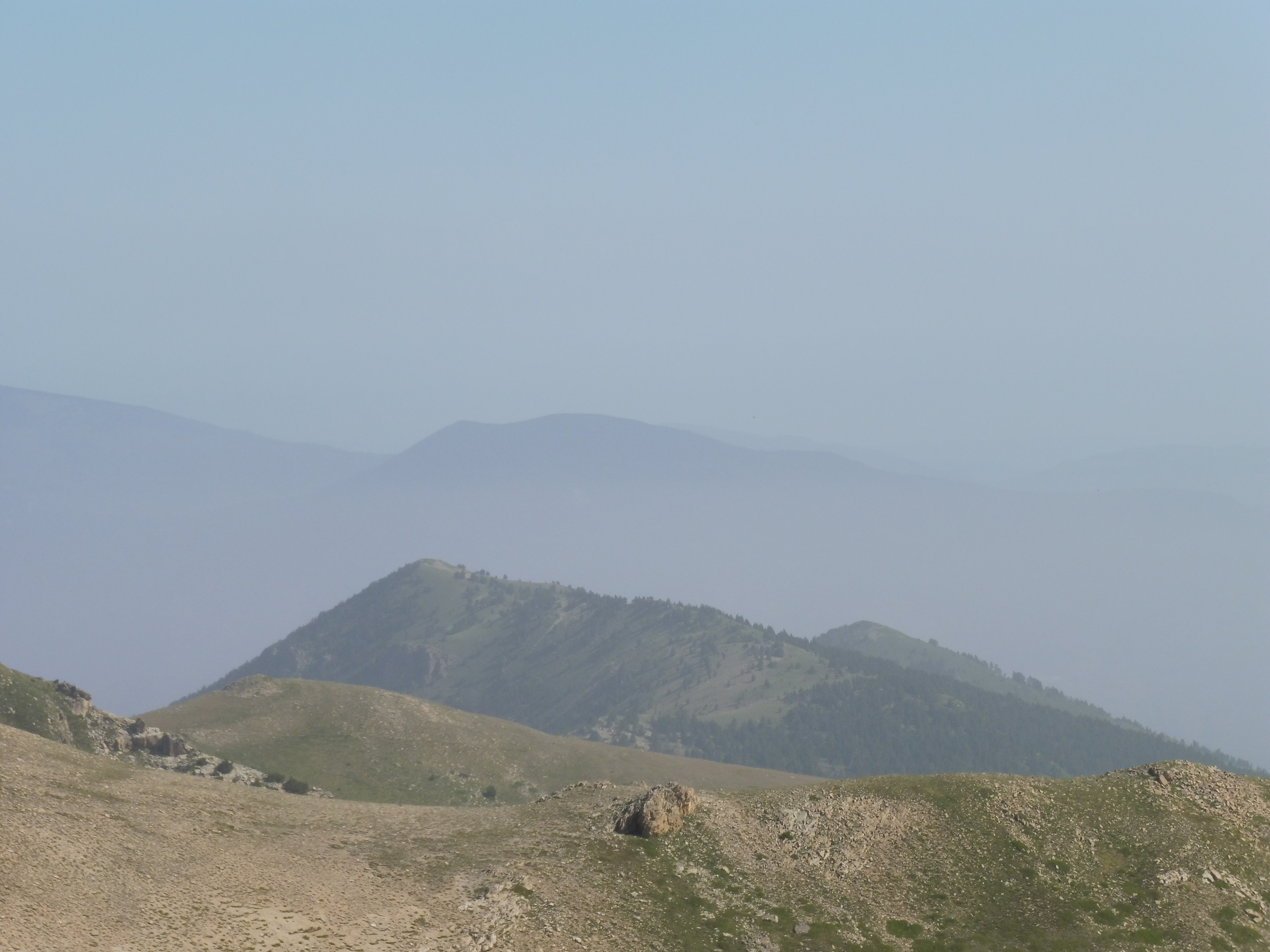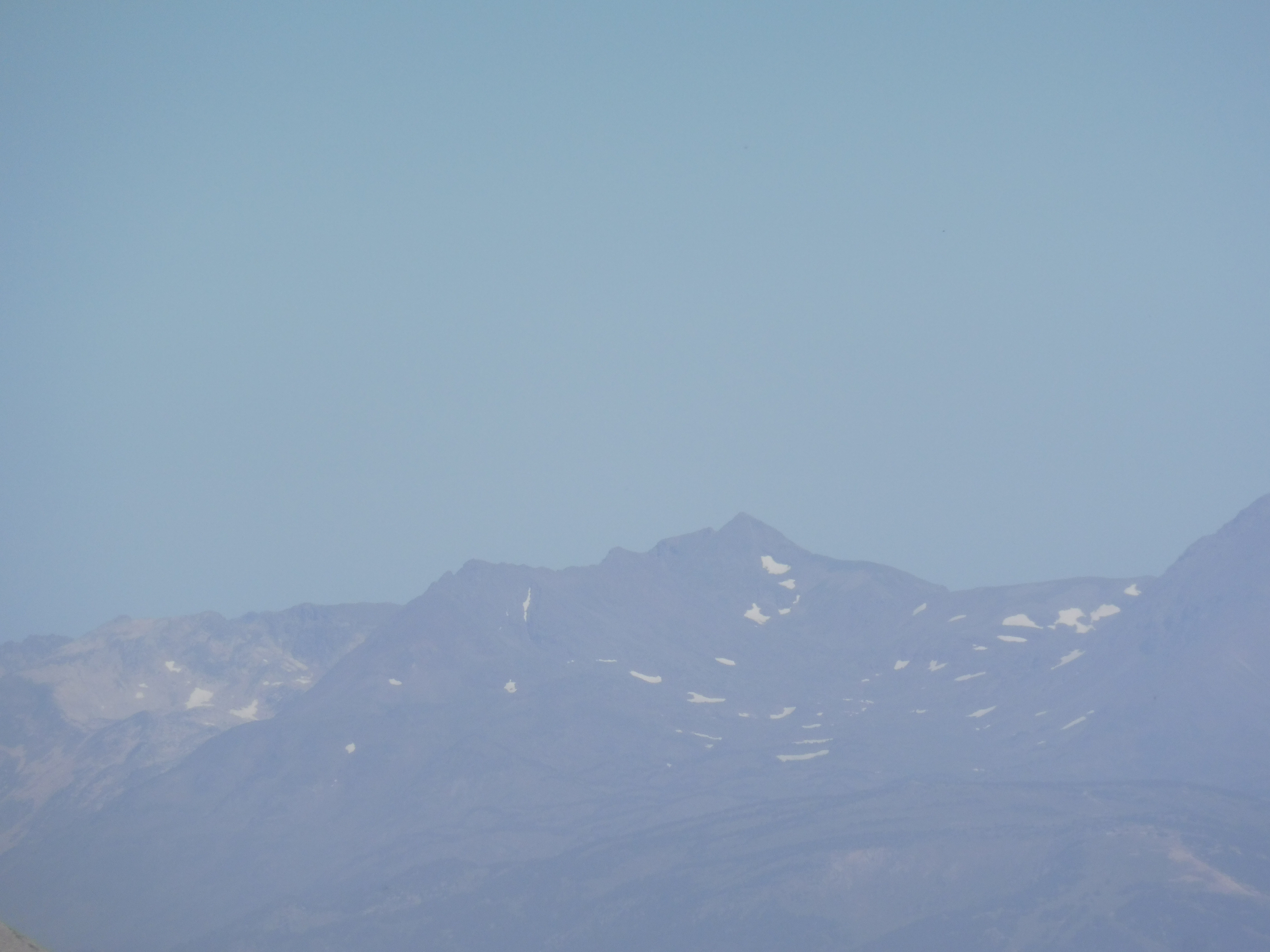 Arrivée au sommet du Pic de Serra Gallinera (2663 m) : beau panorama sur les sommets du Conflent, de la Cerdagne, du Capcir ... la brume de poussière est toujours là !