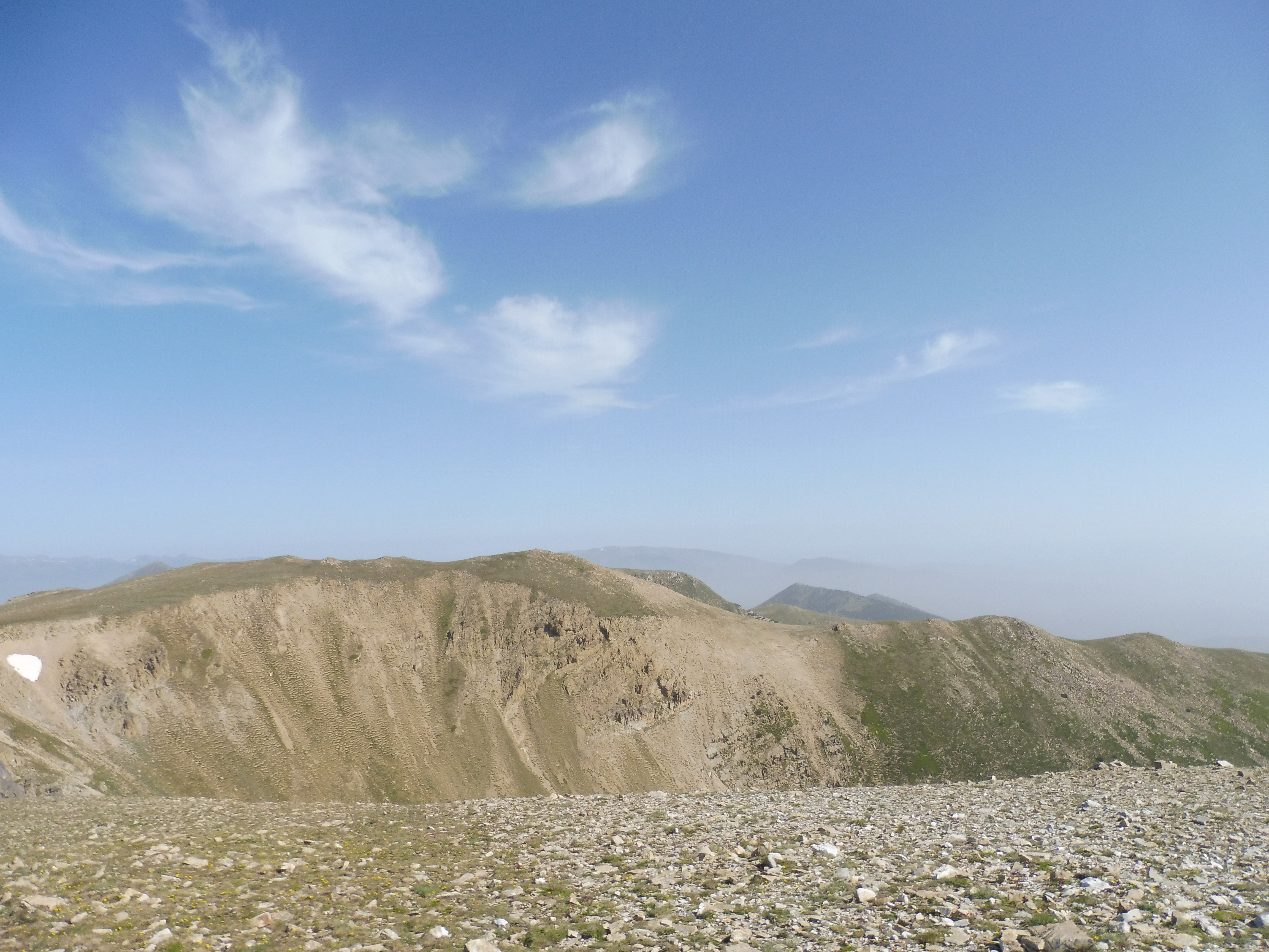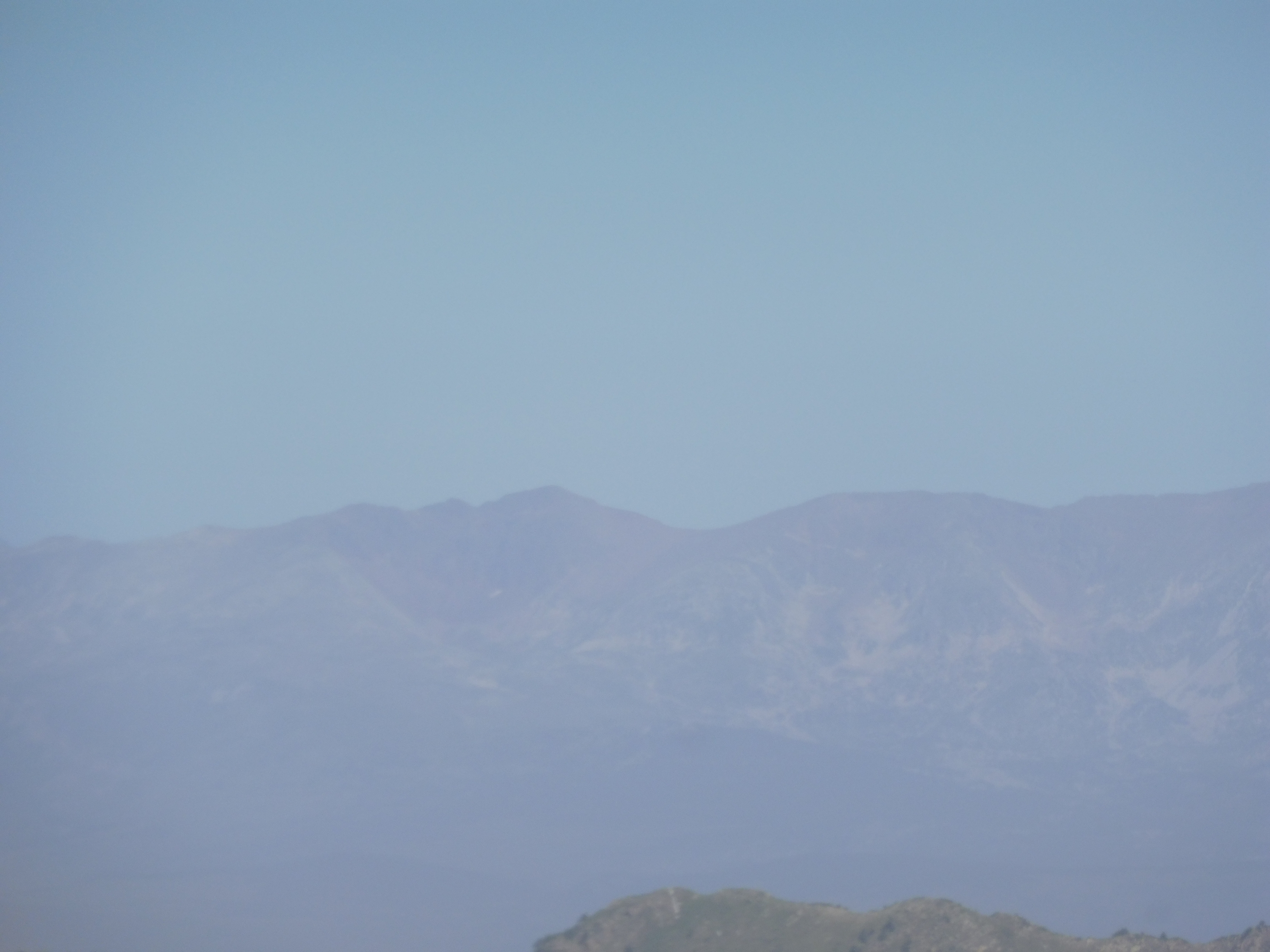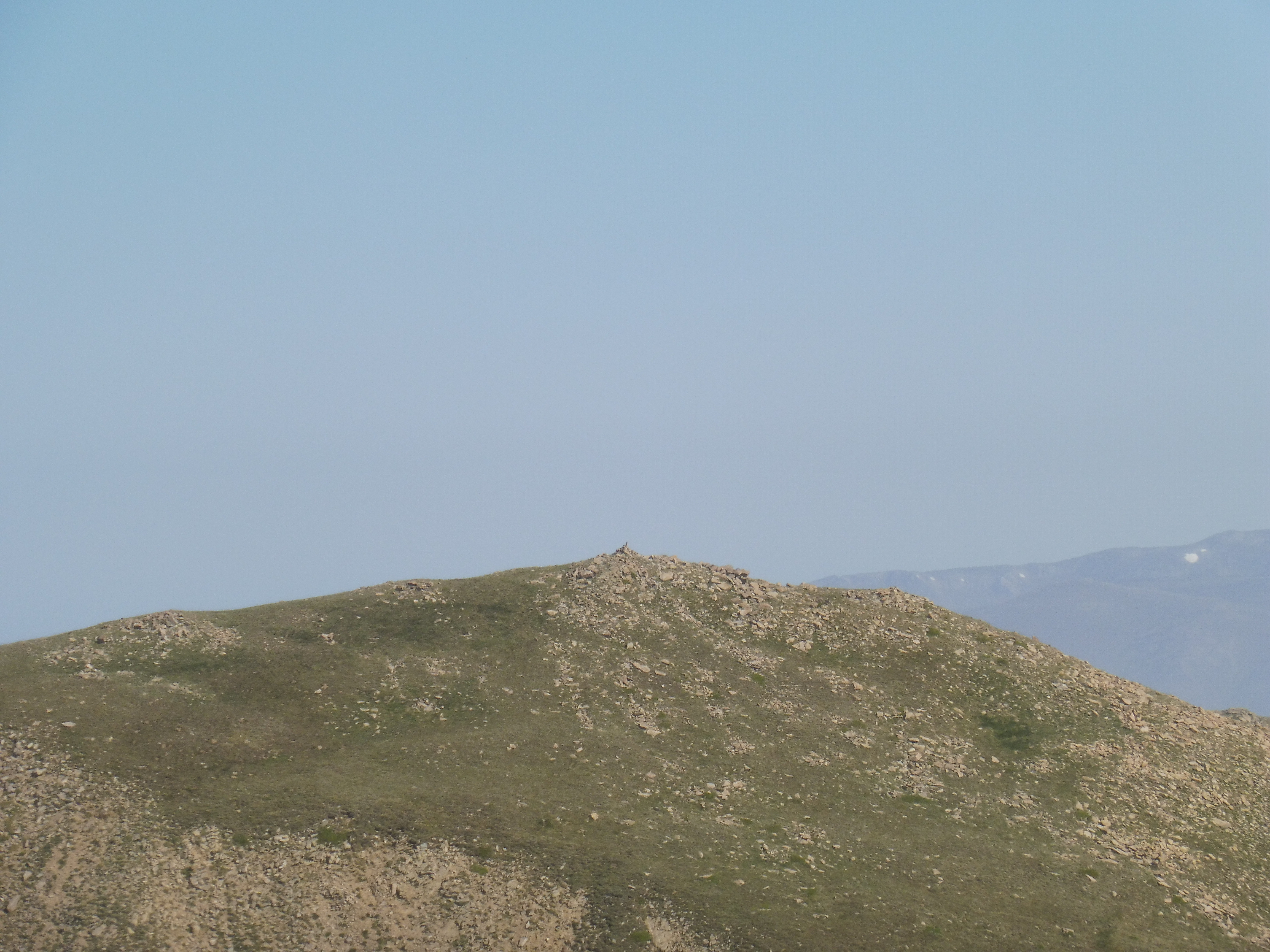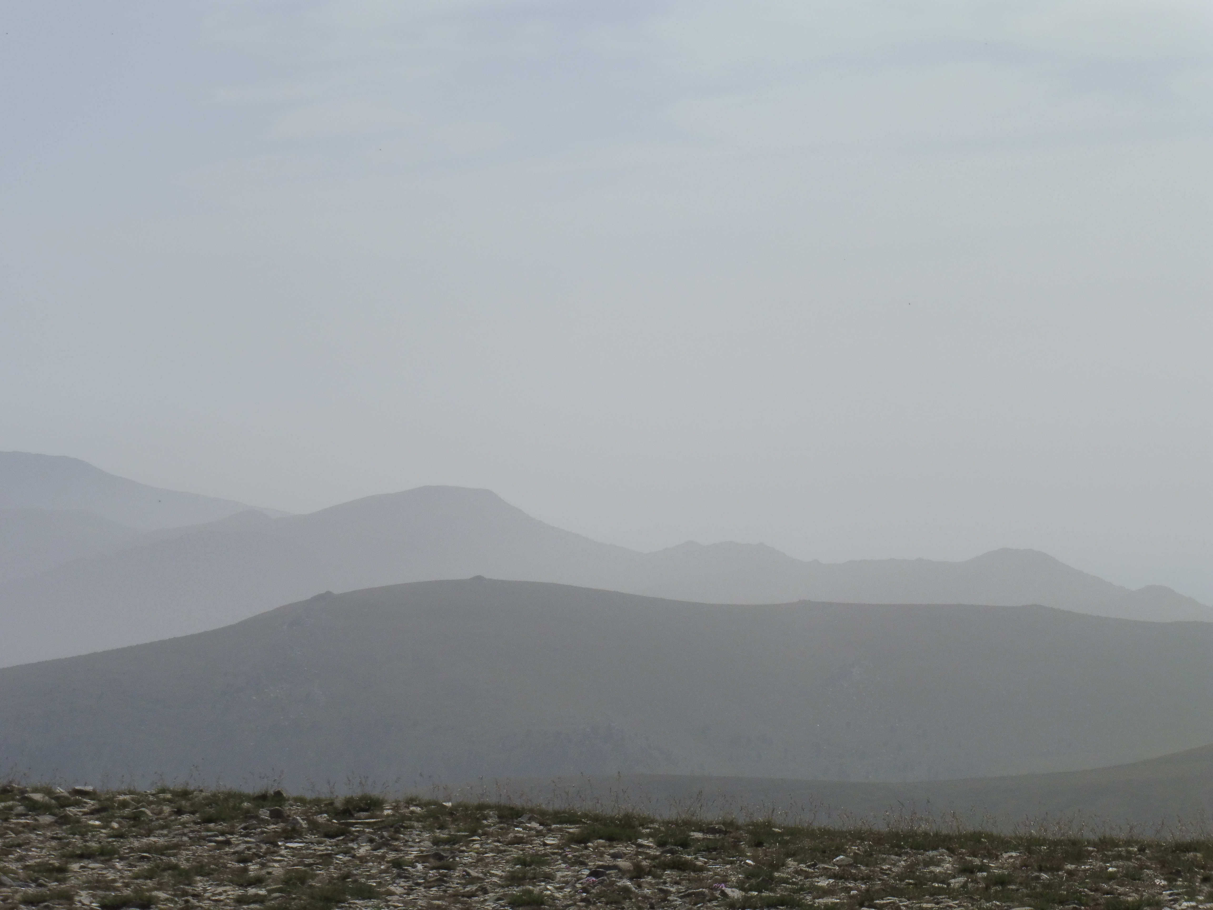 Arrivée au sommet du Pic de Serra Gallinera (2663 m) : beau panorama sur les sommets du Conflent, de la Cerdagne, du Capcir ... la brume de poussière est toujours là !