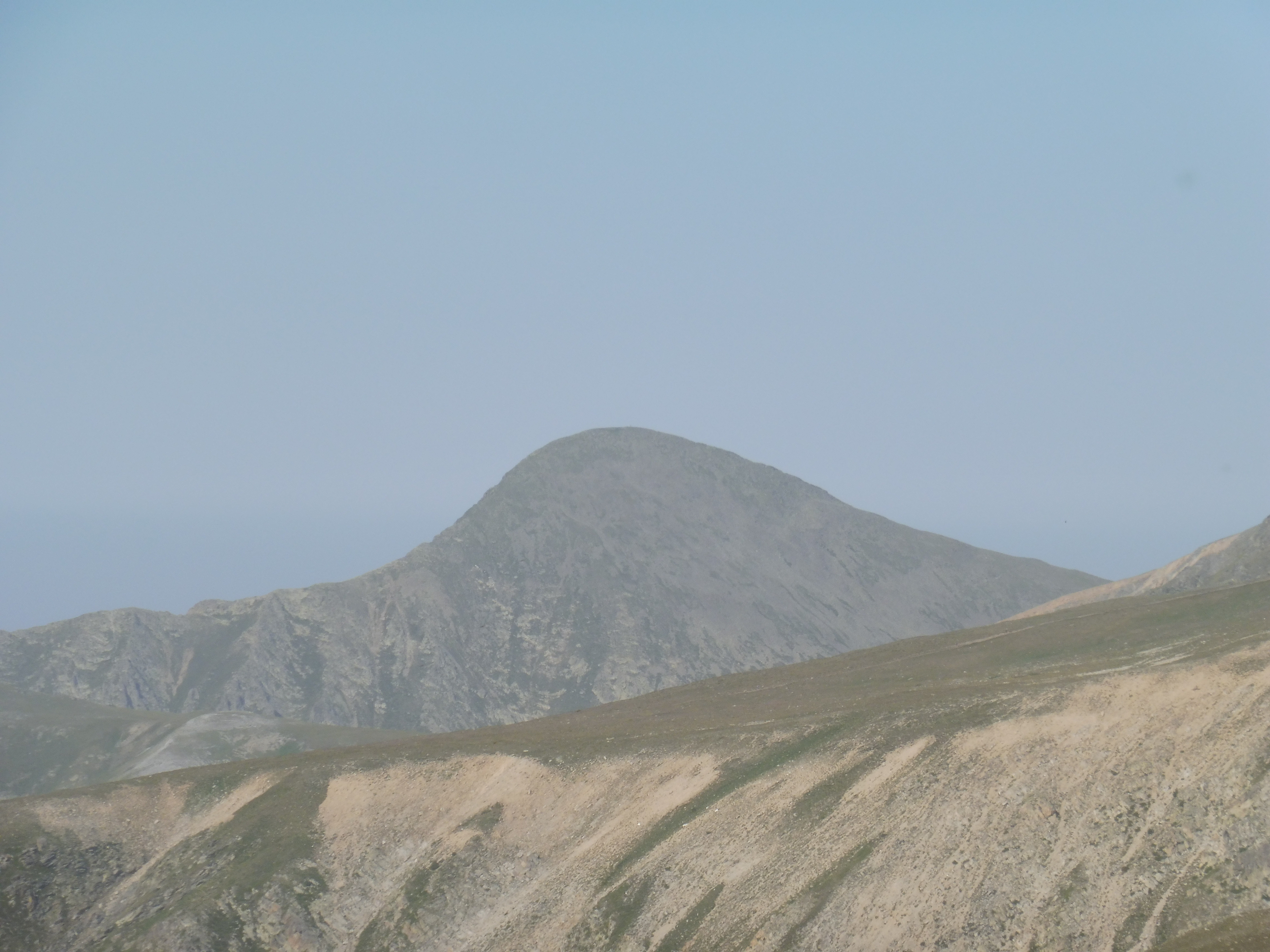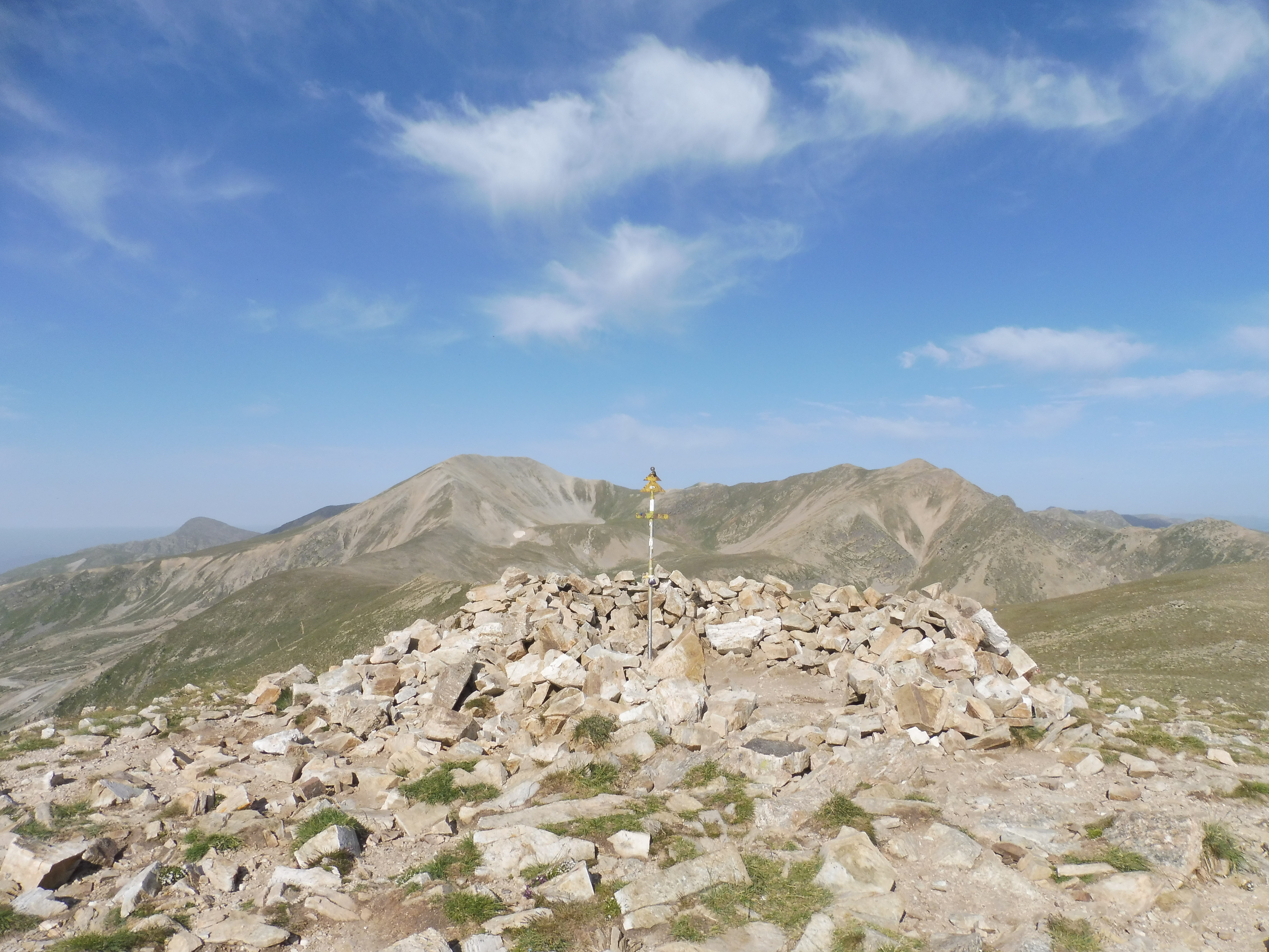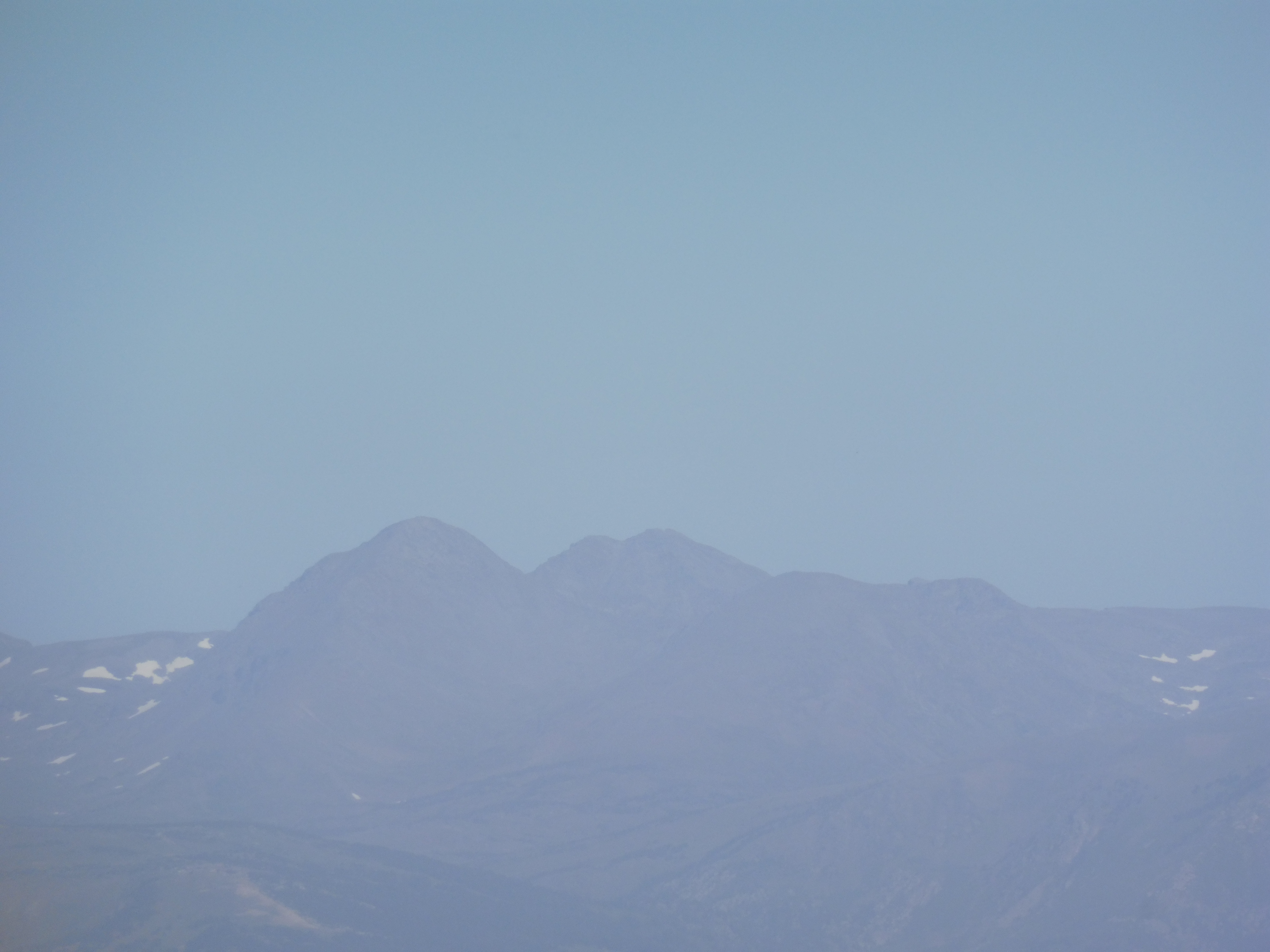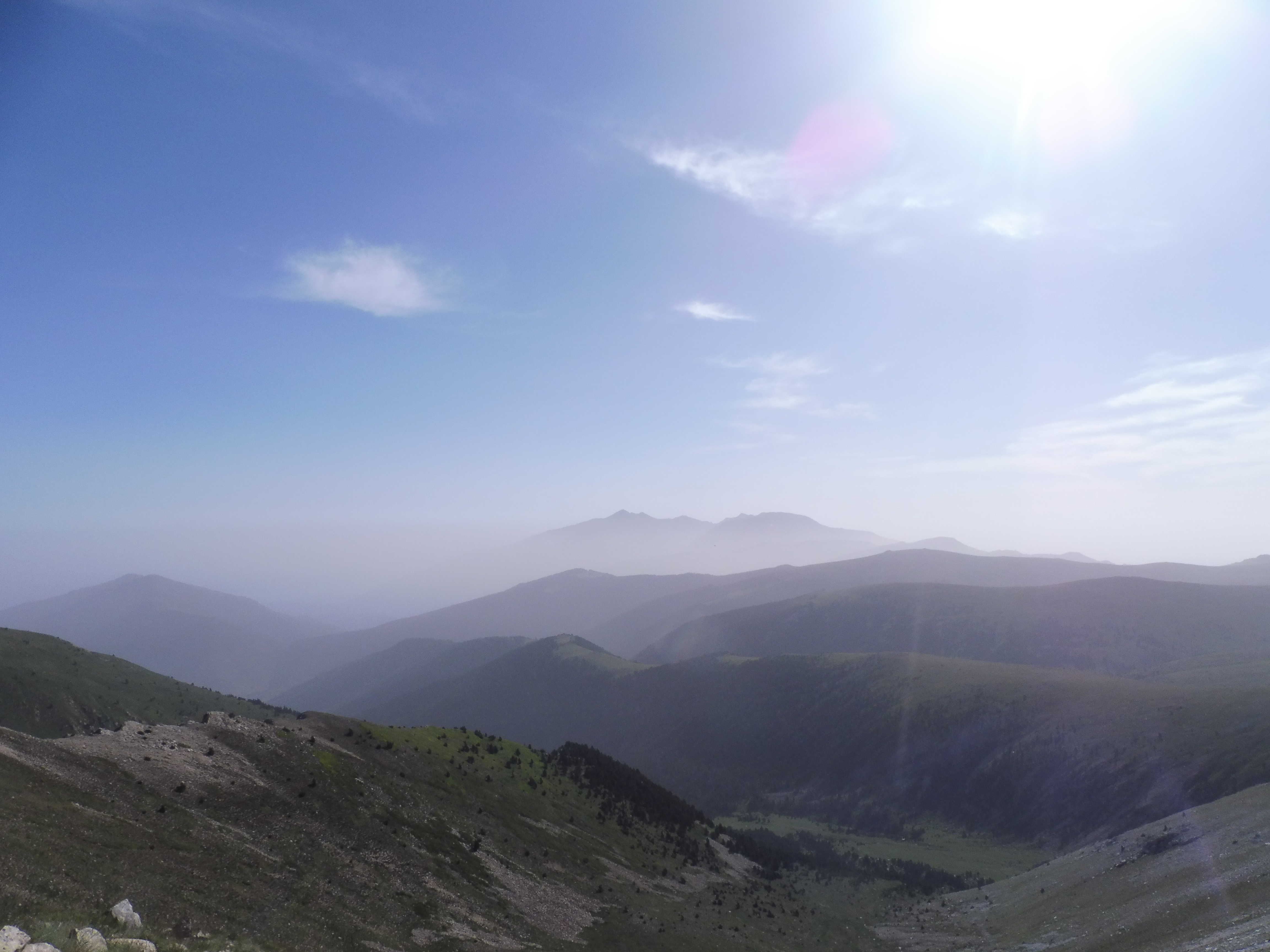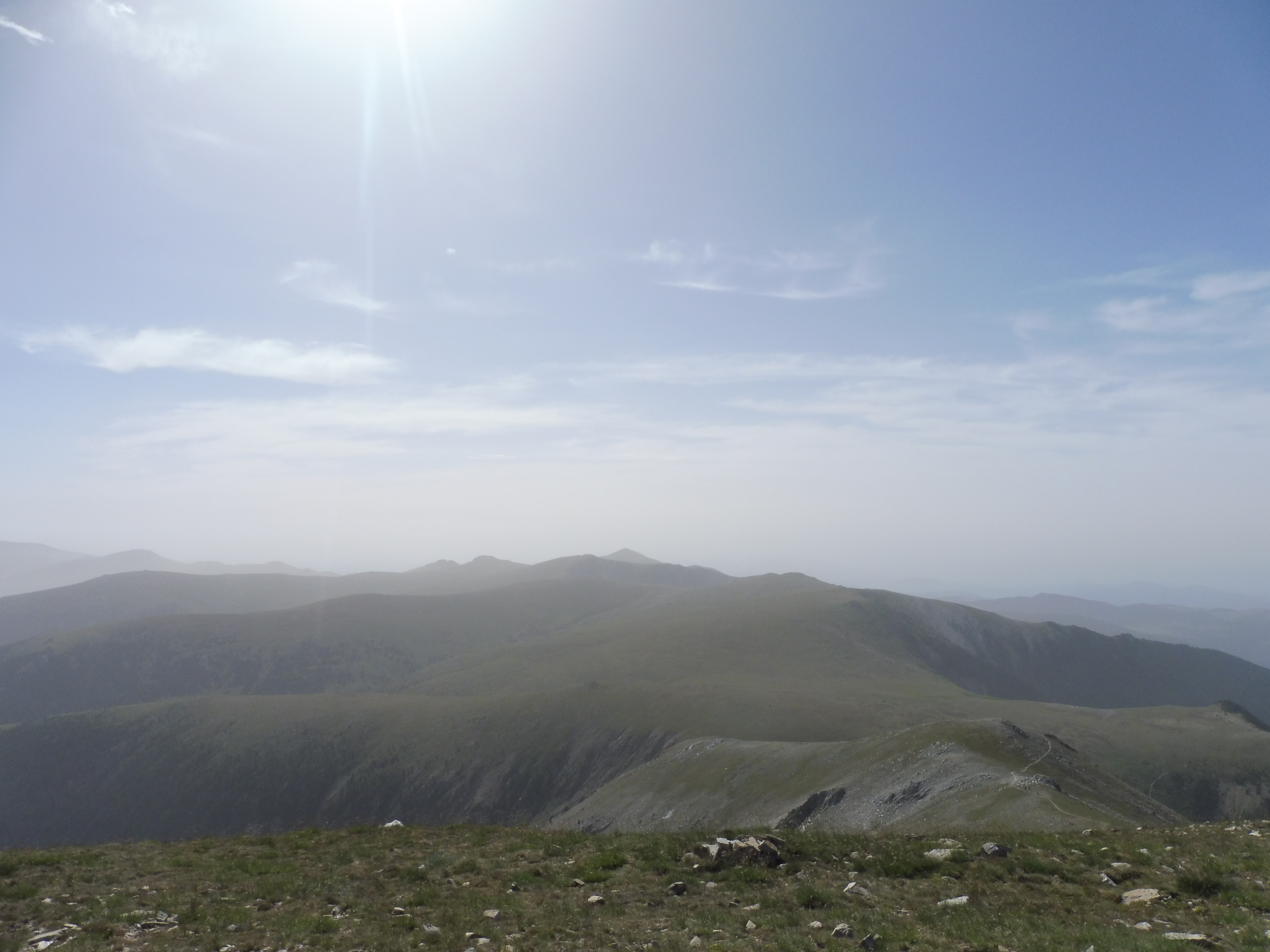 Arrivée au sommet du Pic de Serra Gallinera (2663 m) : beau panorama sur les sommets du Conflent, de la Cerdagne, du Capcir ... la brume de poussière est toujours là !