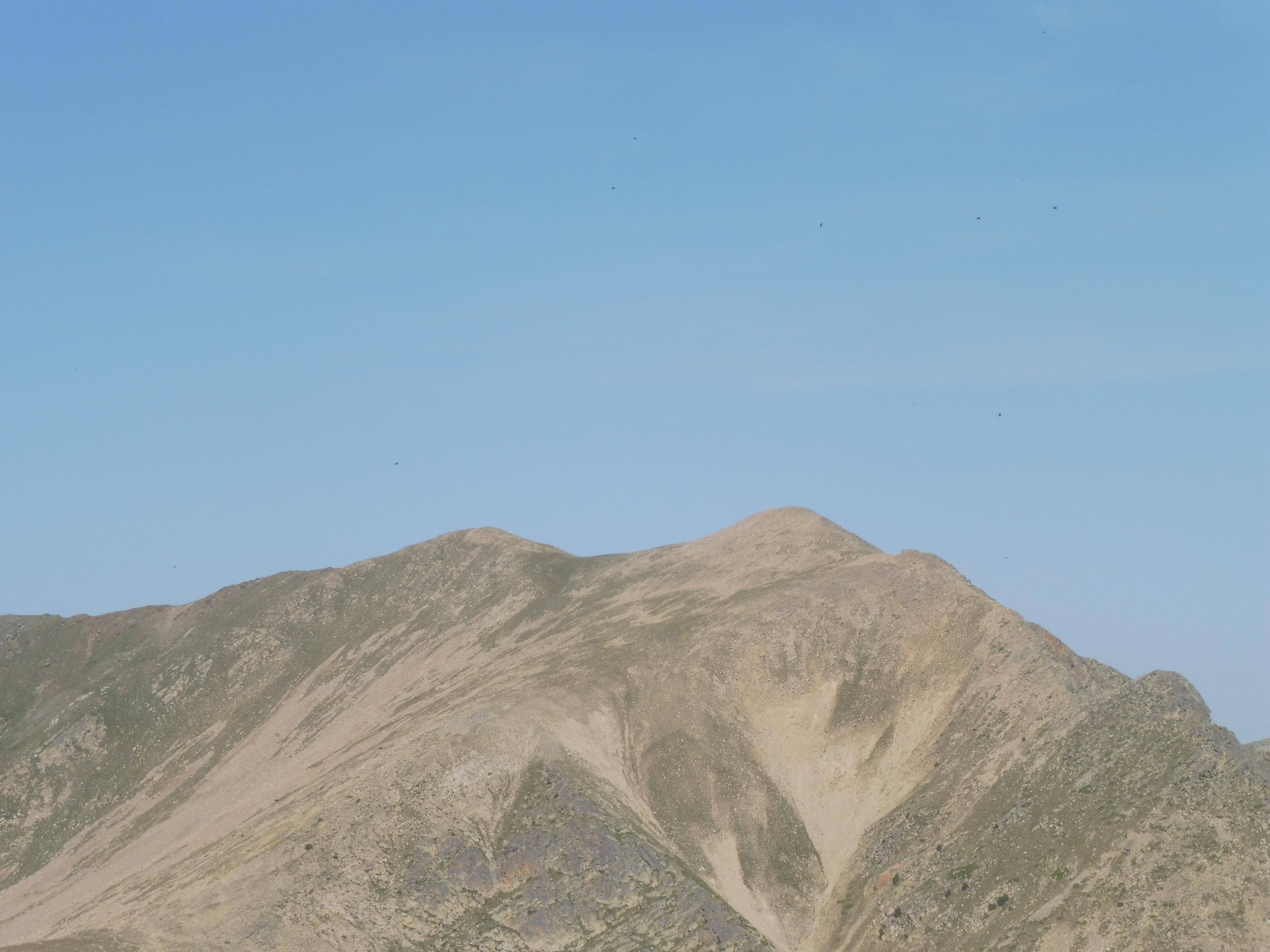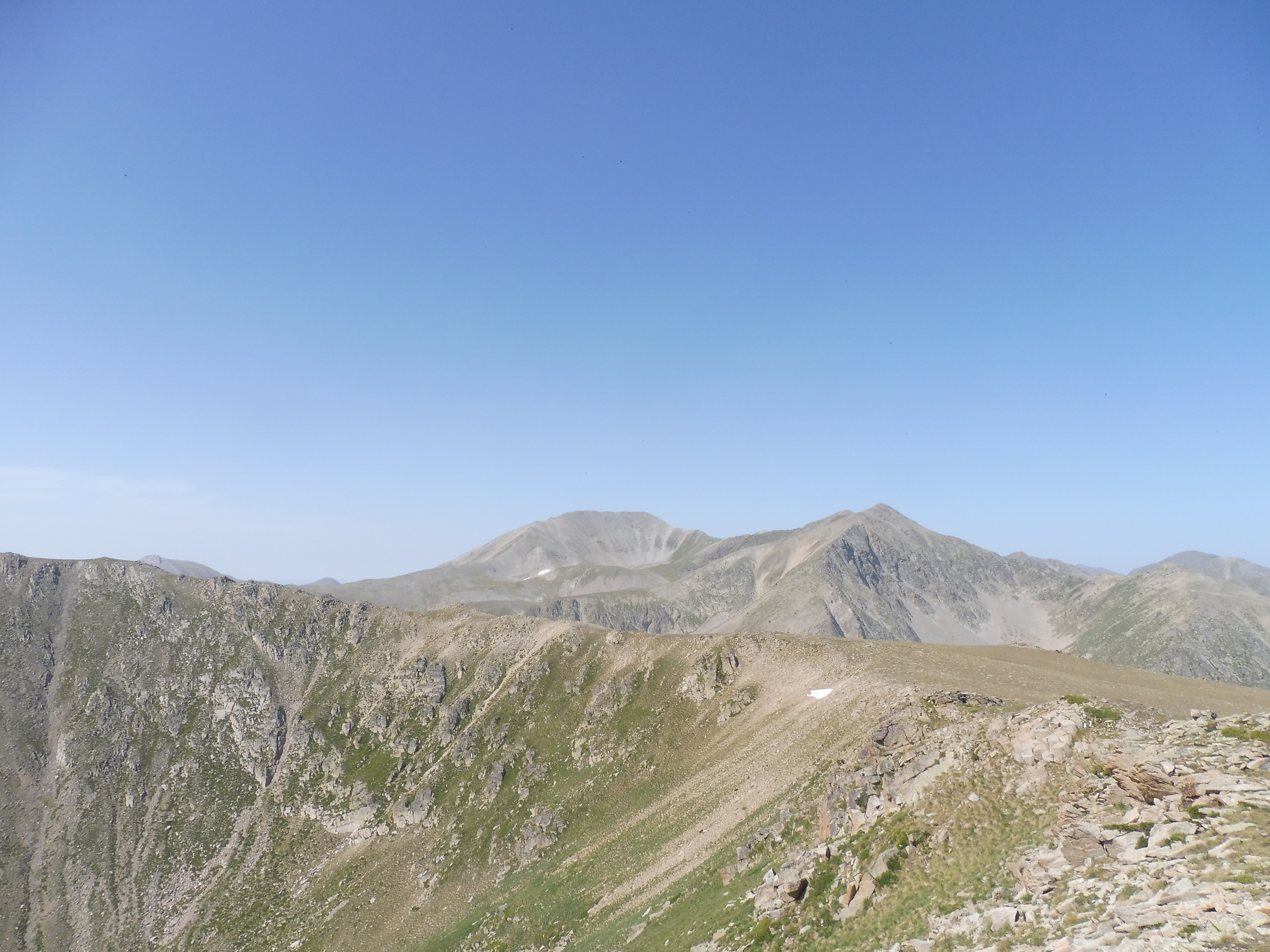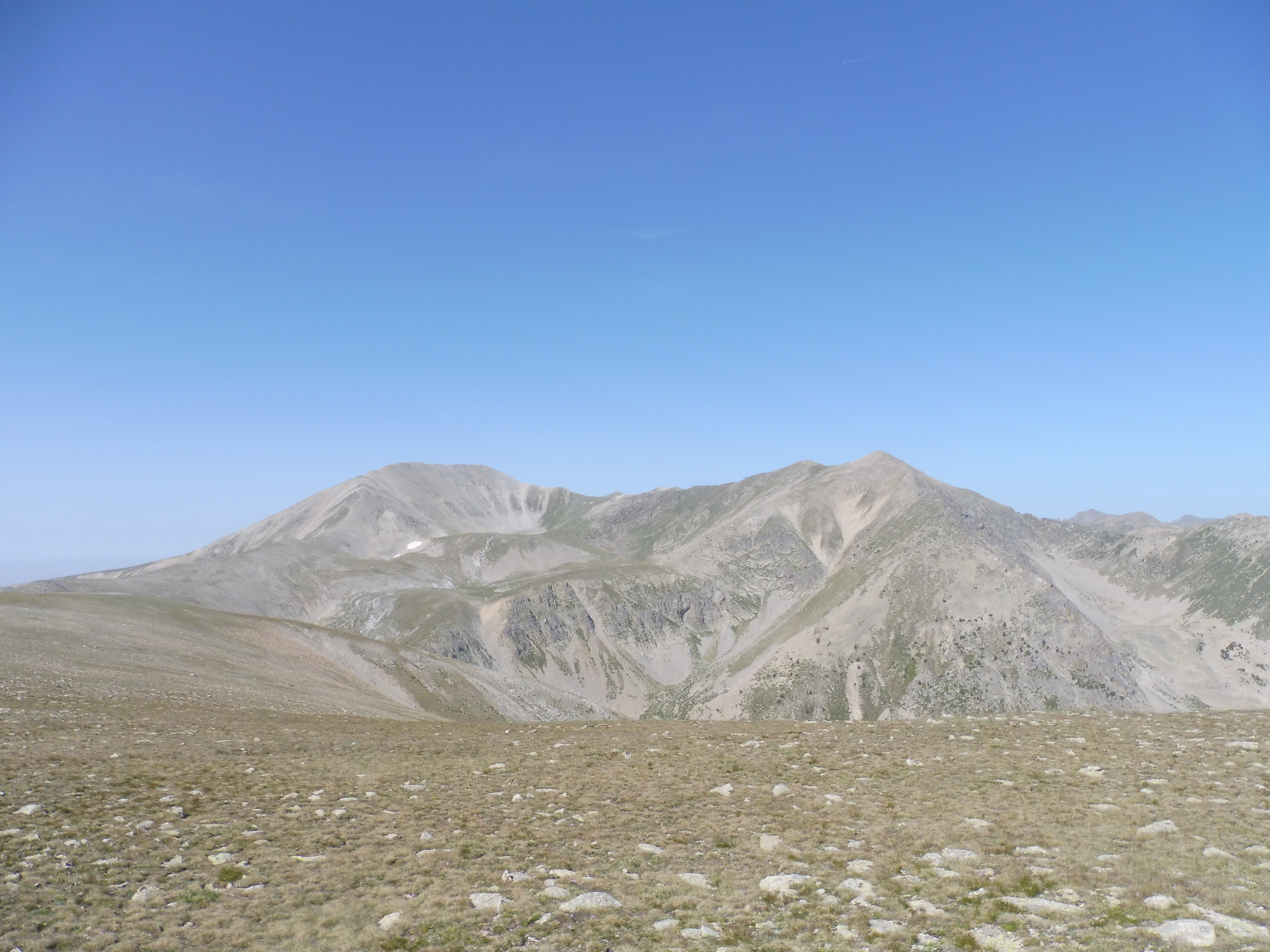 Zoom sur la Mort de l'Escolà (2463 m) à gauche, et la Roca Colom (2507 m) et le Pic de Costabona (2467 m) à droite