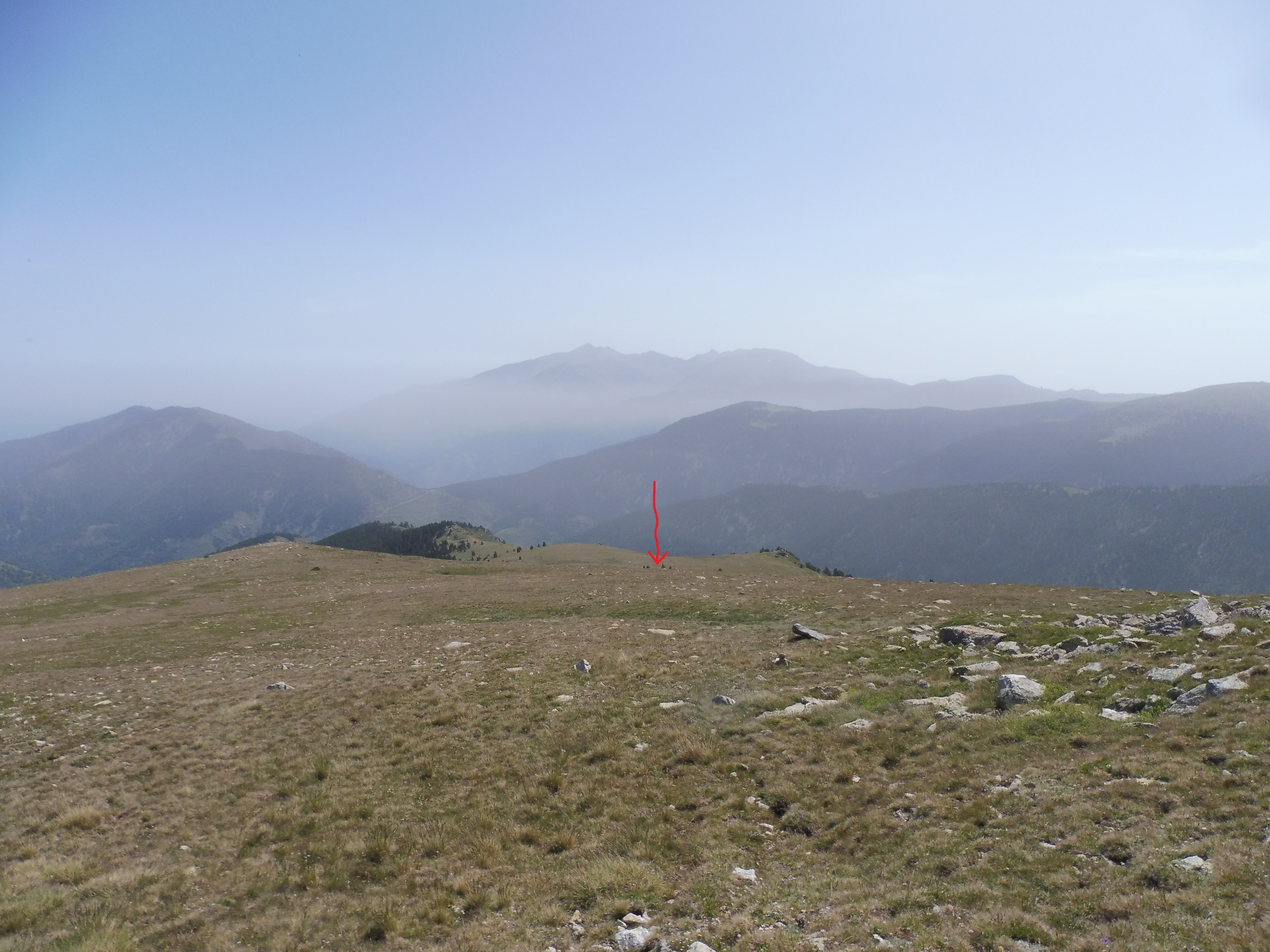 Arrivée au sommet du Pic de la Dona (2702 m) : beau panorama malgré la brume de sable sur les sommets du Conflent, de la Cerdagne et du Capcir ... ceux de l'Empordà, de la Garrotxa, du Ripollès ne sont pas visible à cause de la brume !