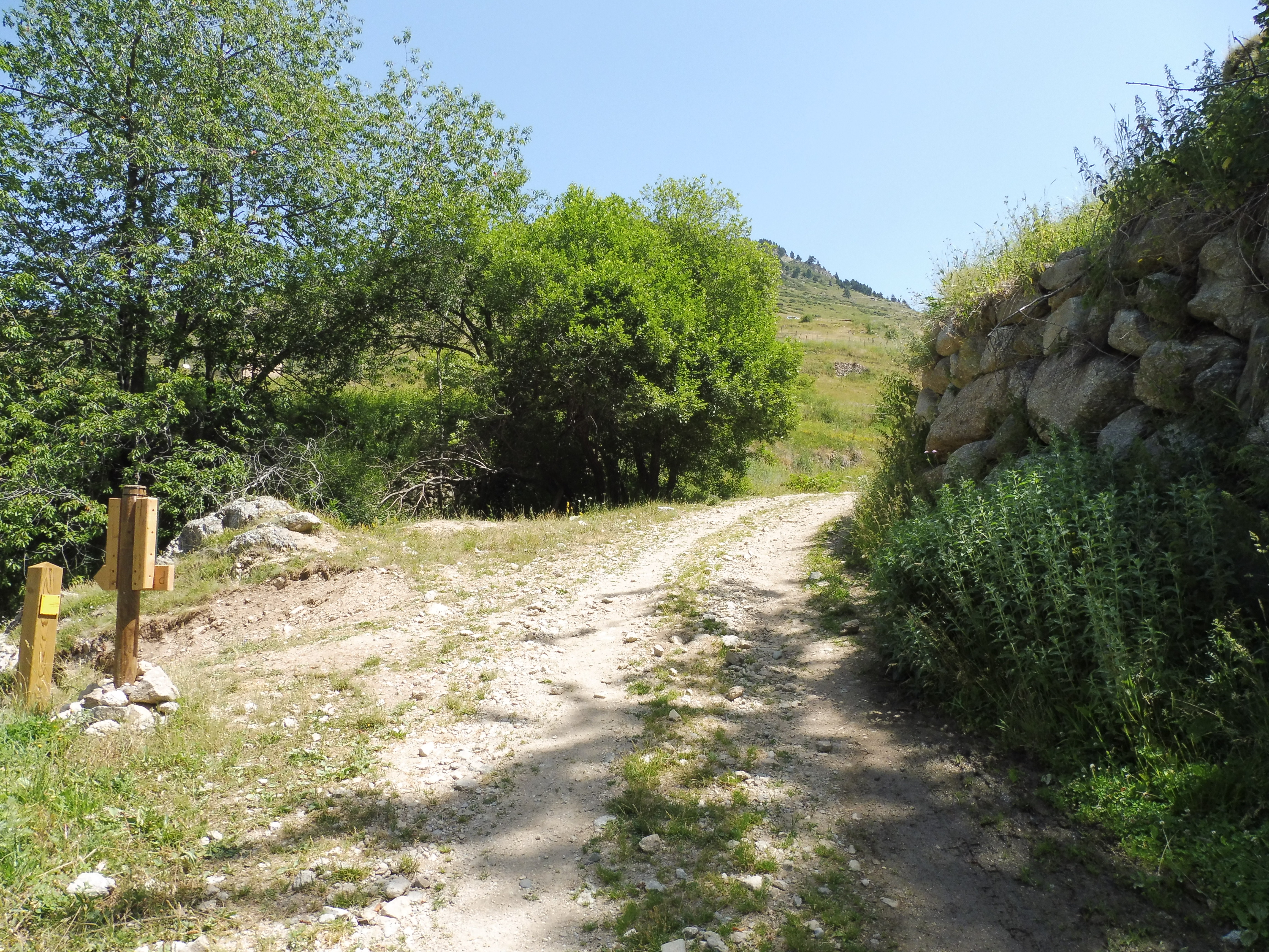 Mantet - Bas (1486 m) : suivre le large chemin partant tout droit vers le passage à gué direction Portella de Mantet, balisé en rouge et blanc
