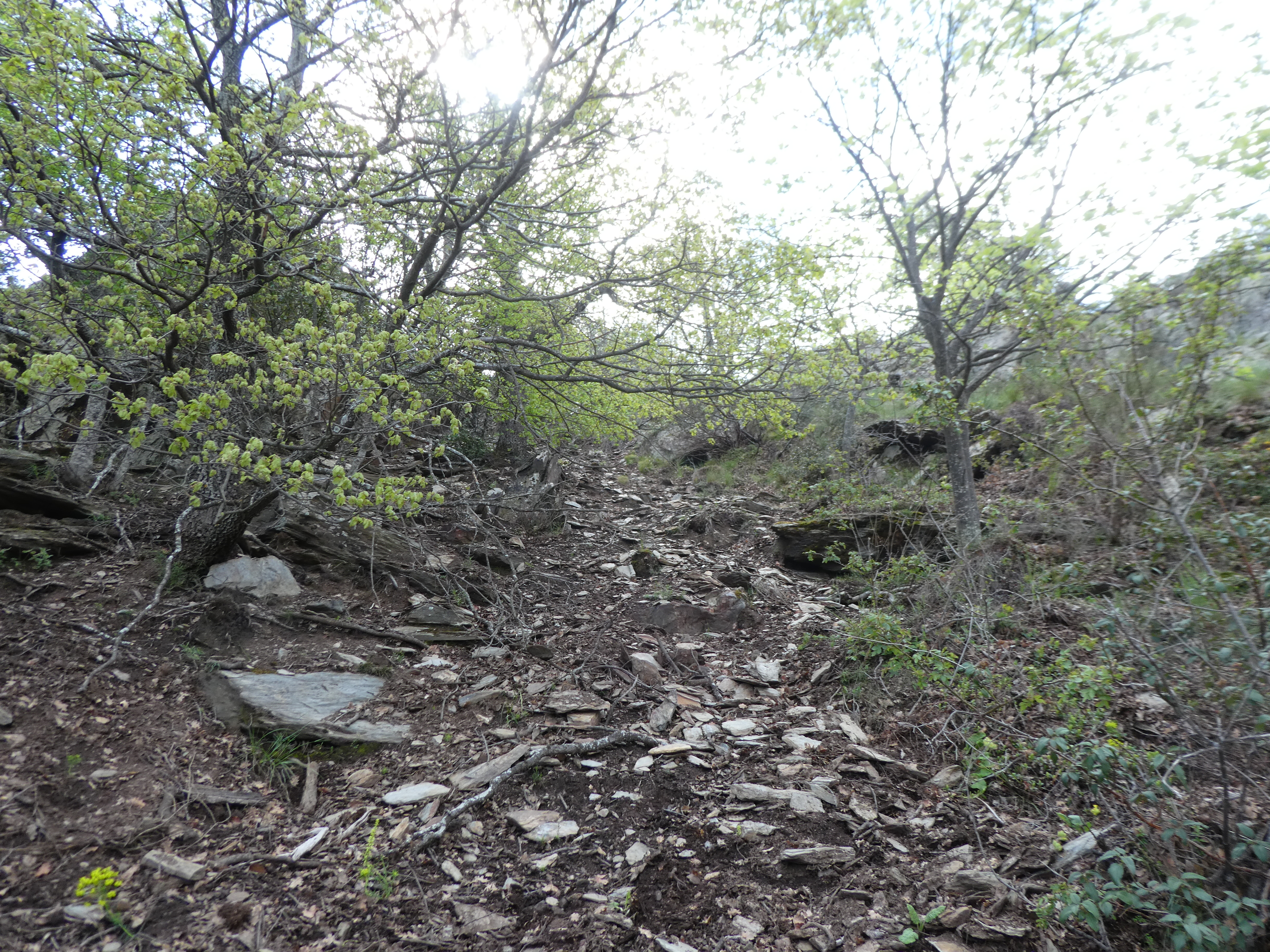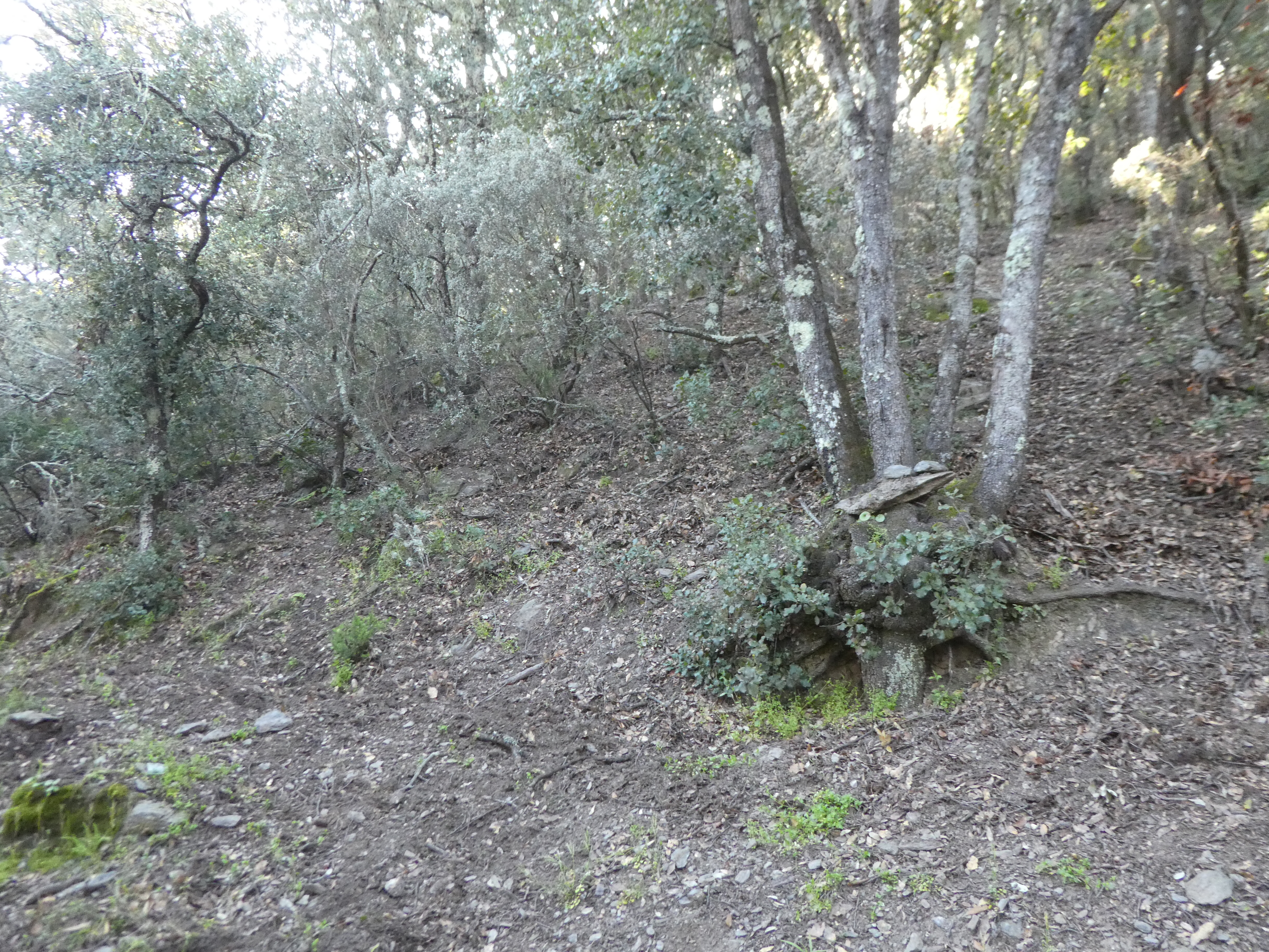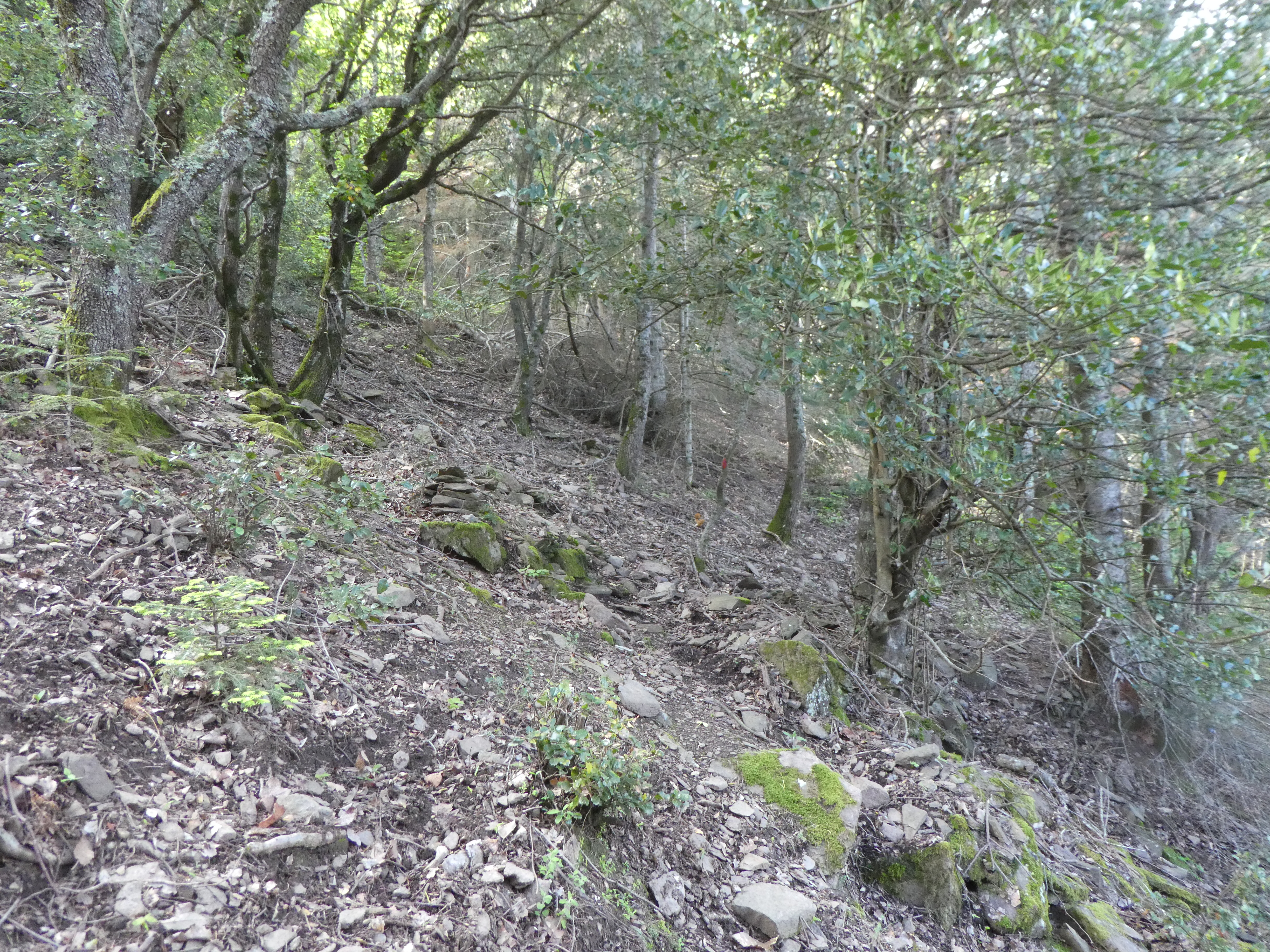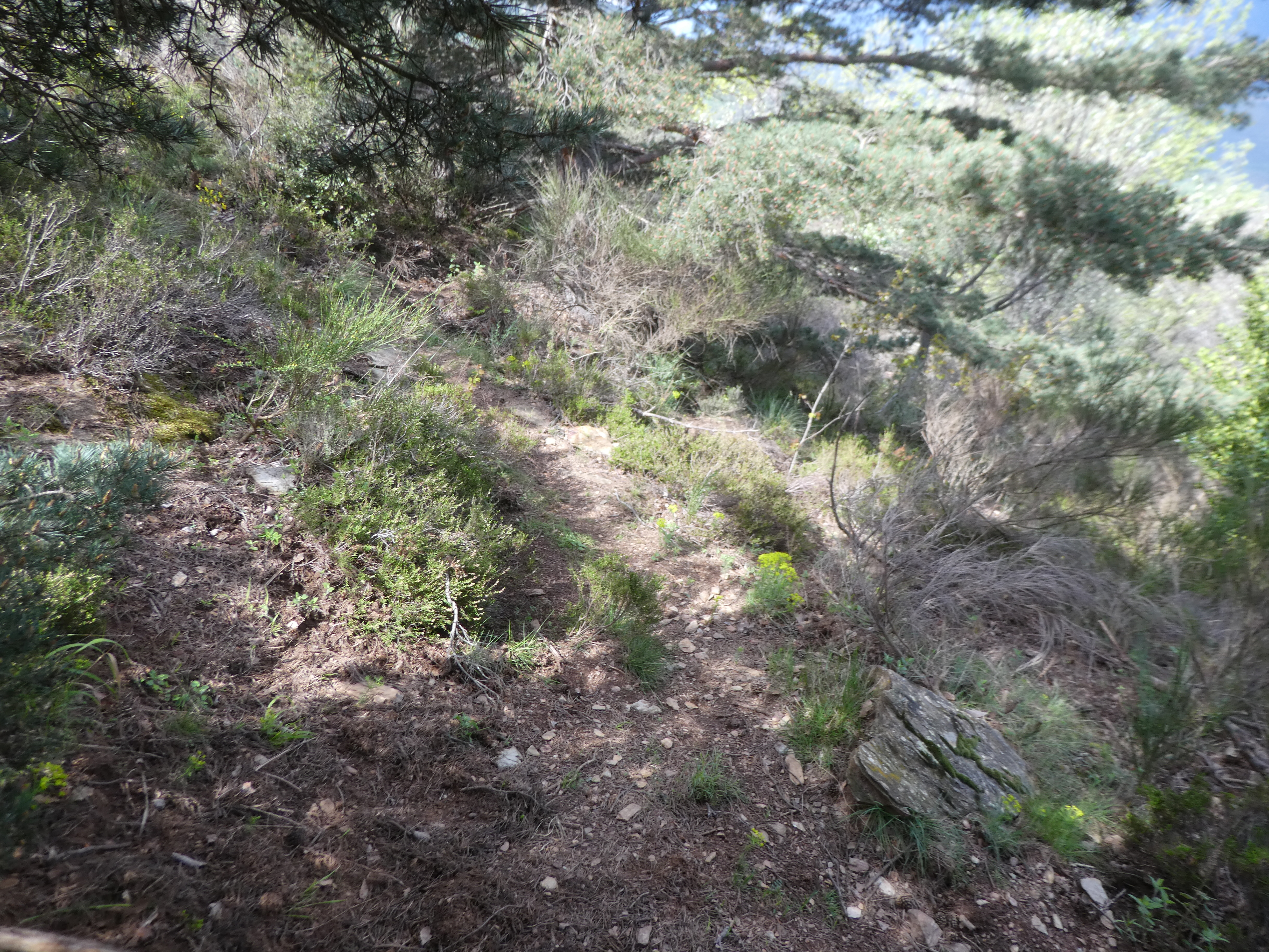 Le sentier très discret et raide de montée vers le Puig dels Moros