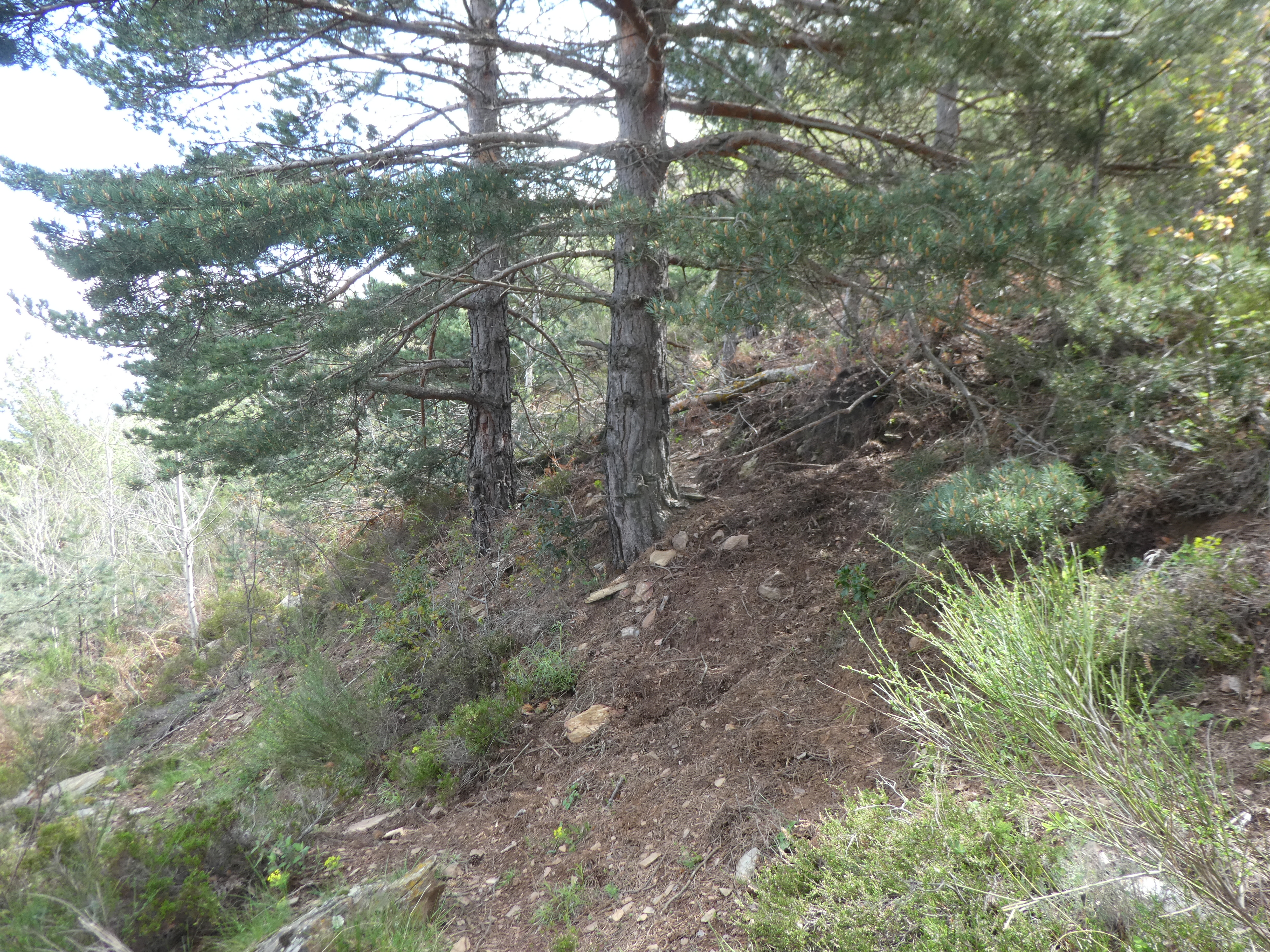 A ce croisement avec un itinéraire balisé en points oranges (1200 mètres après le précédent), suivre le chemin montant sur la droite direction Collada d'en Jaume, balisé sporadiquement en points rouges et oranges dorénavant