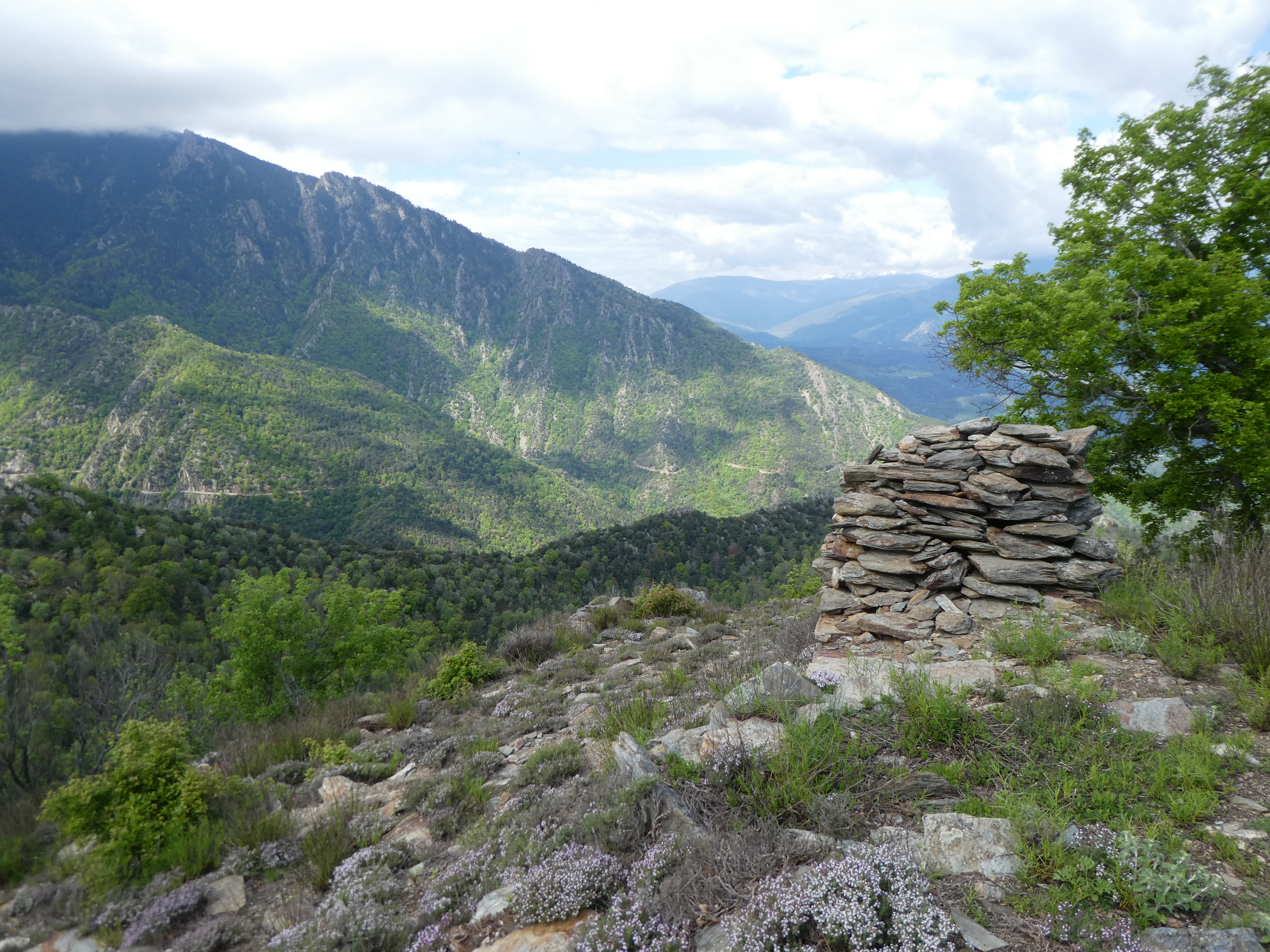 Arrivée au sommet du Puig de Marbet (726 m) : beau point de vue sur les sommets du Conflent, des Pyrénées Audoises, du Fenouillèdes, des Corbières ainsi que sur la Vallée de la Têt