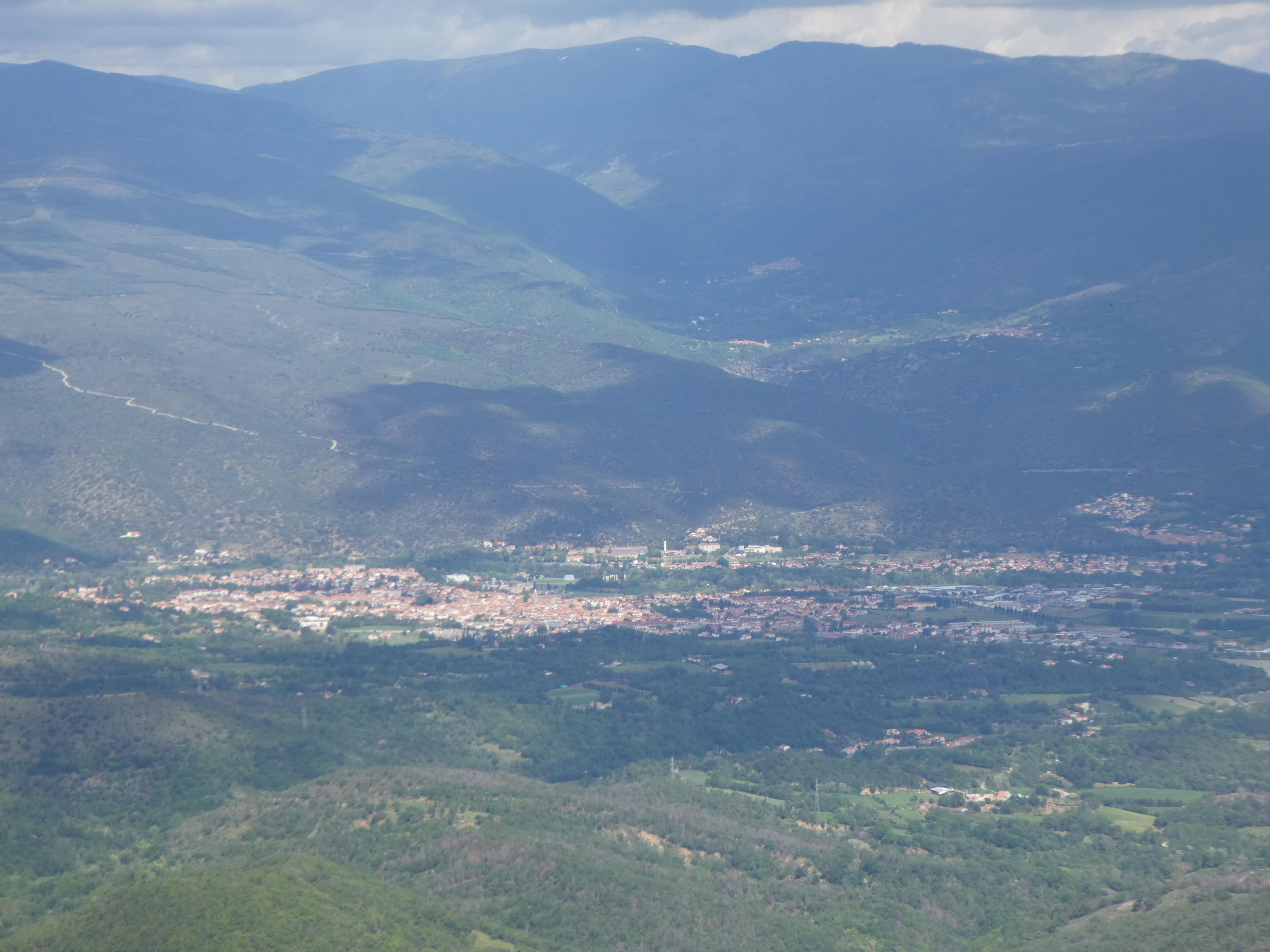Arrivée au sommet du Puig dels Moros (1211 m) : beau panorama malgré la présence de végétation sur les sommets du Conflent, des Pyrénées Audoises, du Fenouillèdes, des Corbières, des Aspres ainsi que sur la Vallée de la Têt et la plaine du Roussillon .. le massif du Canigou est partiellement dans les nuages