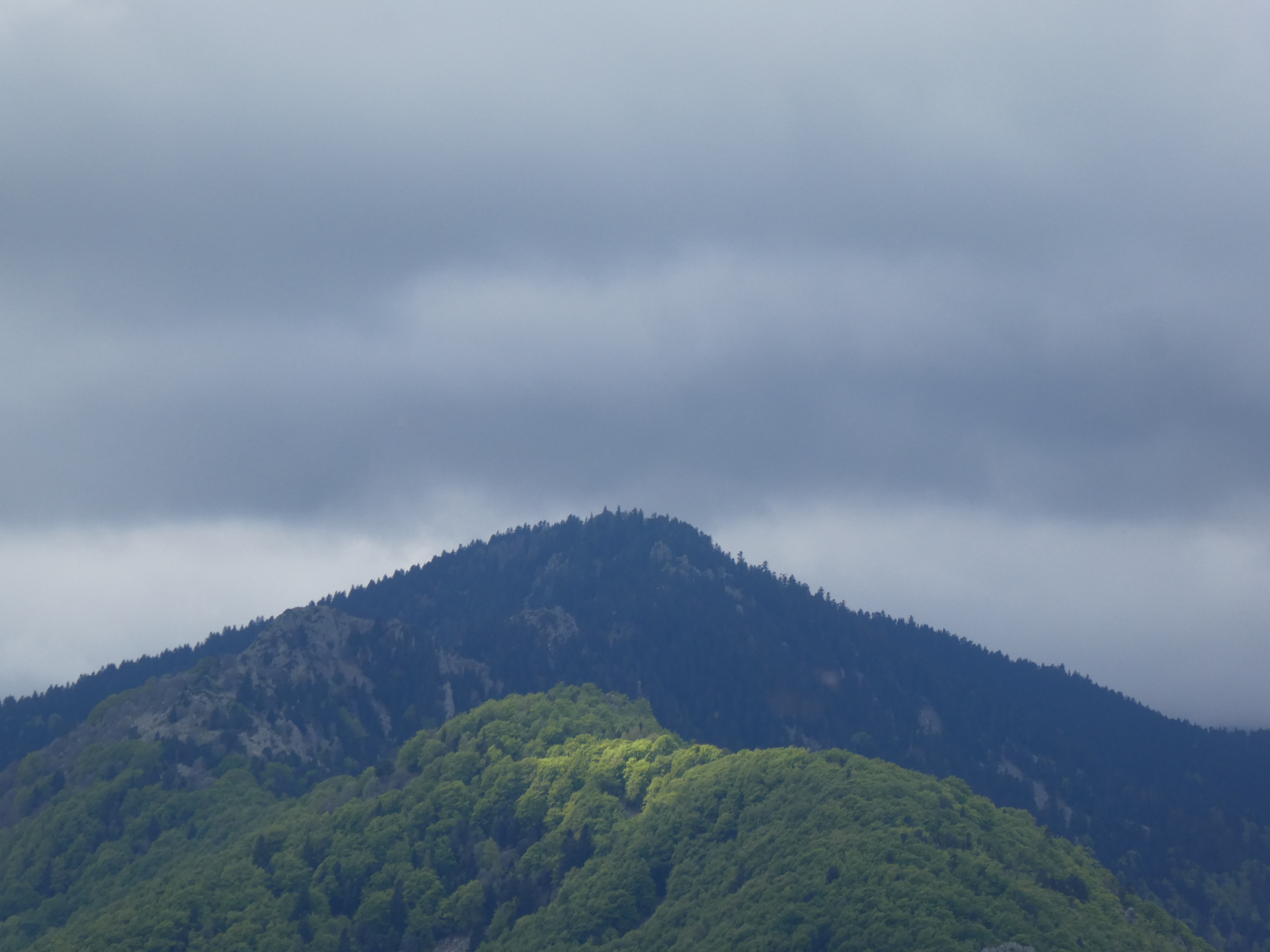 Zoom sur le Mont Coronat (2171 m) partiellement dans les nuages