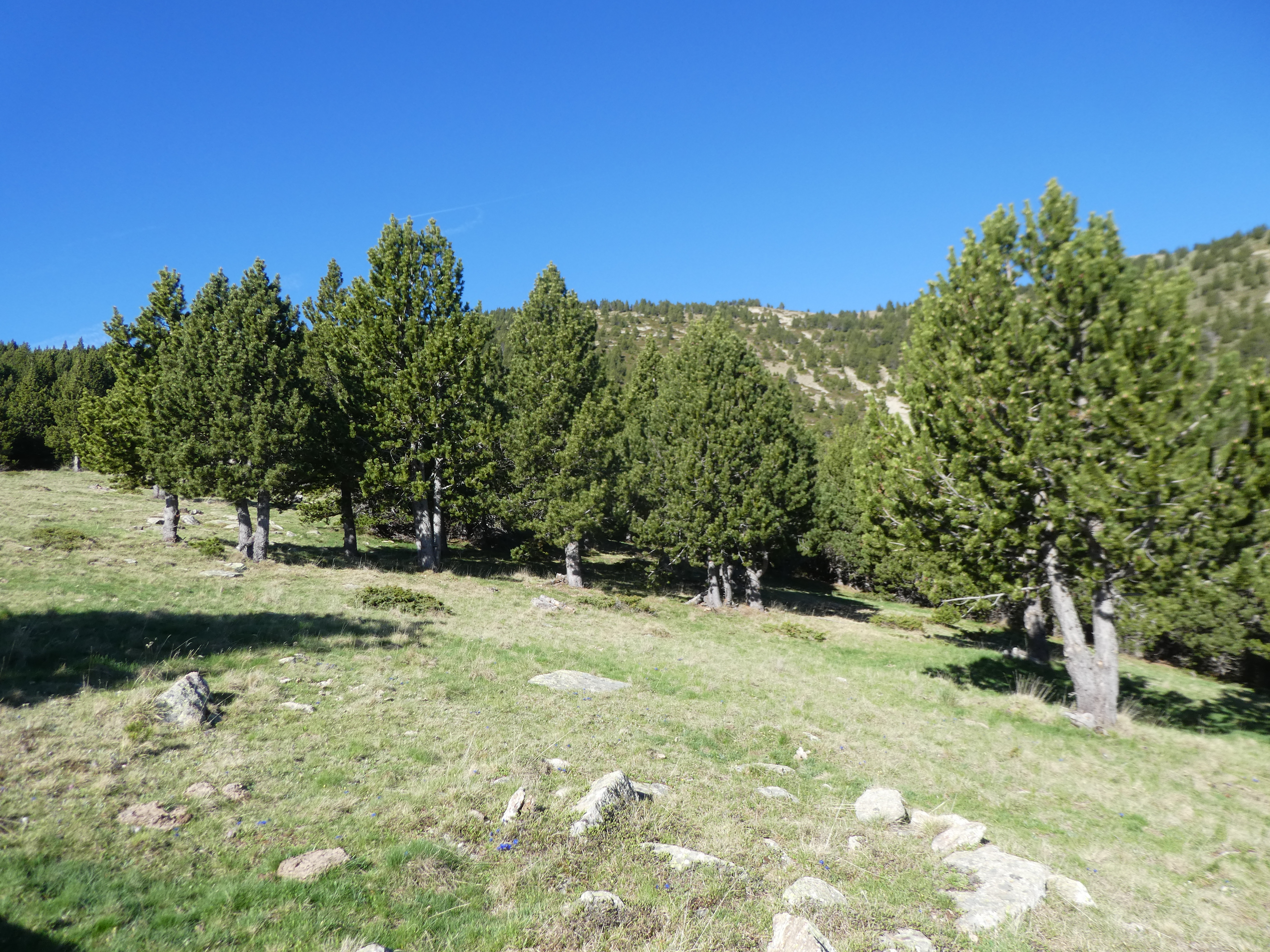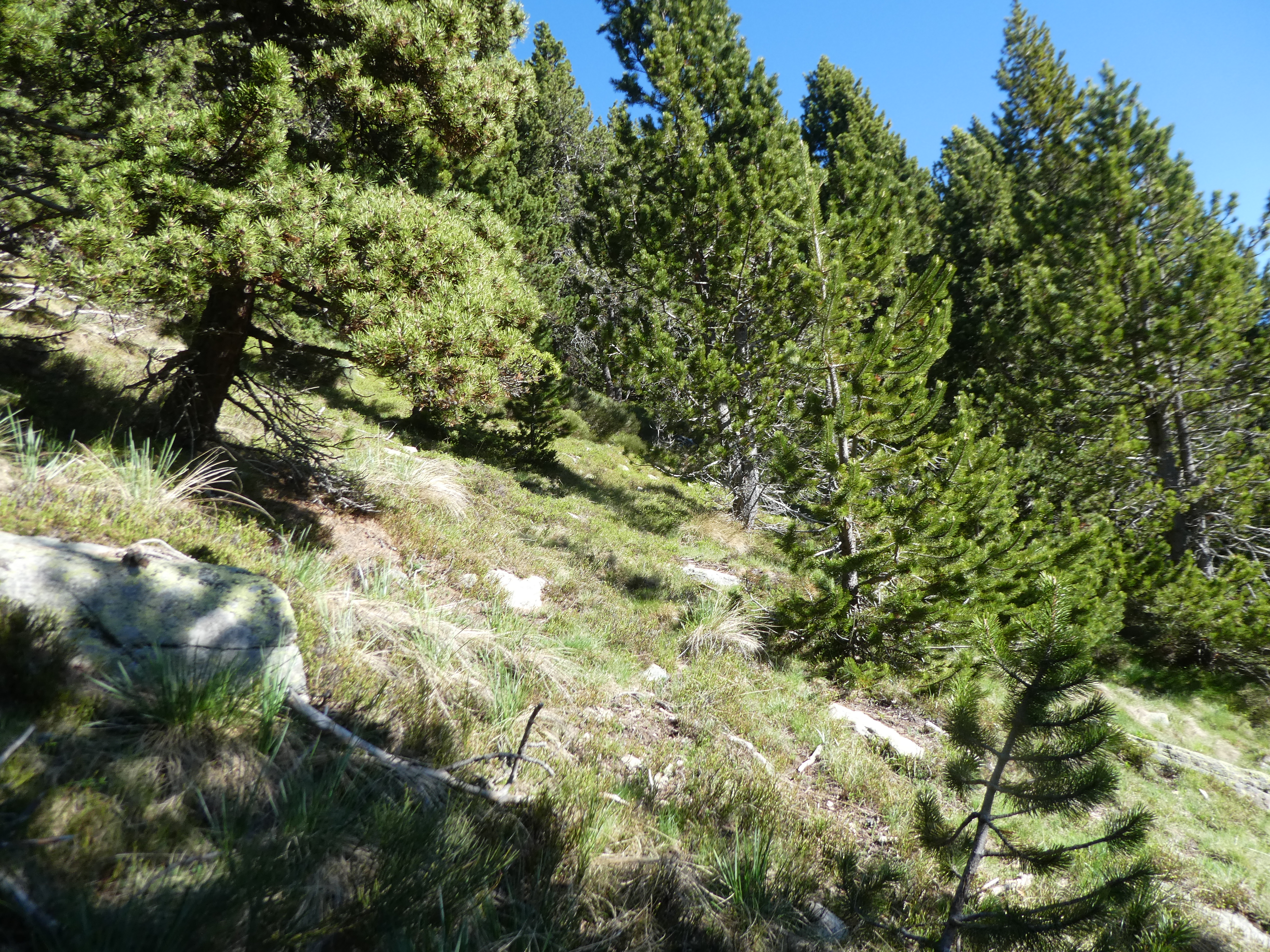 Dès que la progression n'est plus possible à cause de la végétation à proximité de la cote 1796 m (1100 mètres après la précédent croisement), monter à vue sur la droite pour atteindre le sommet de la crête du Puig de l'Orri direction Puig de l'Orri (le semblant de chemin partant tout droit commence à perdre de l'altitude)