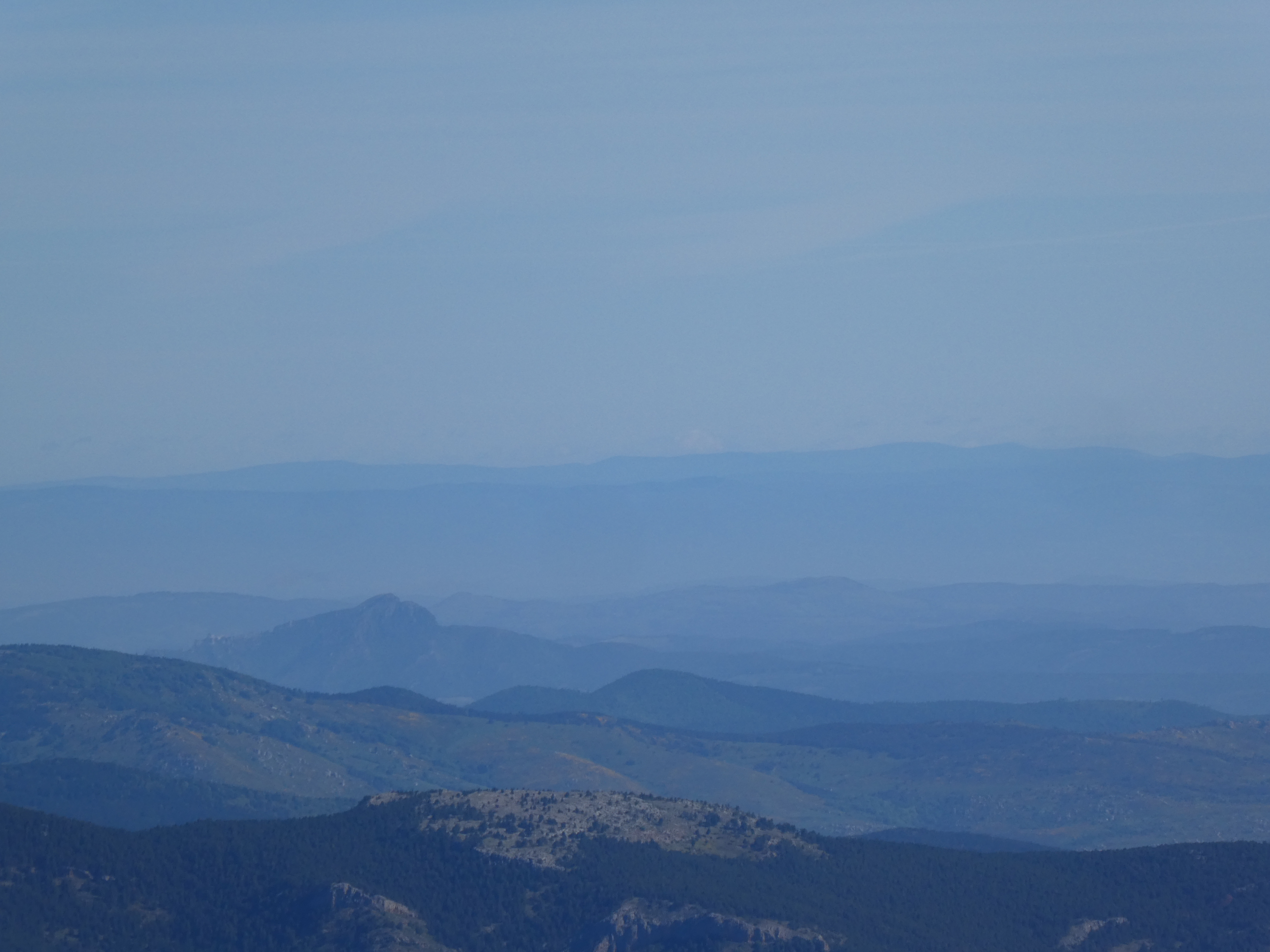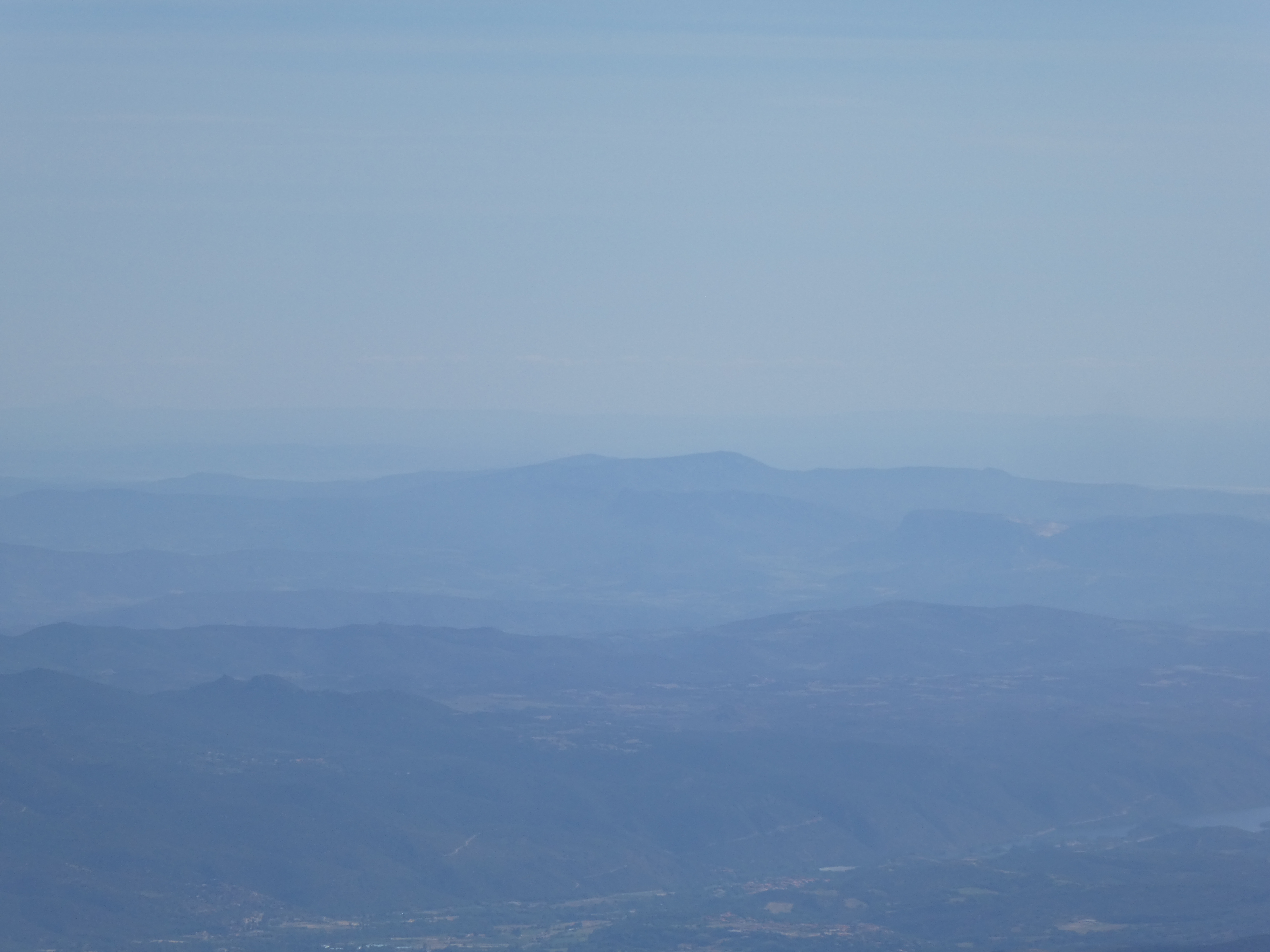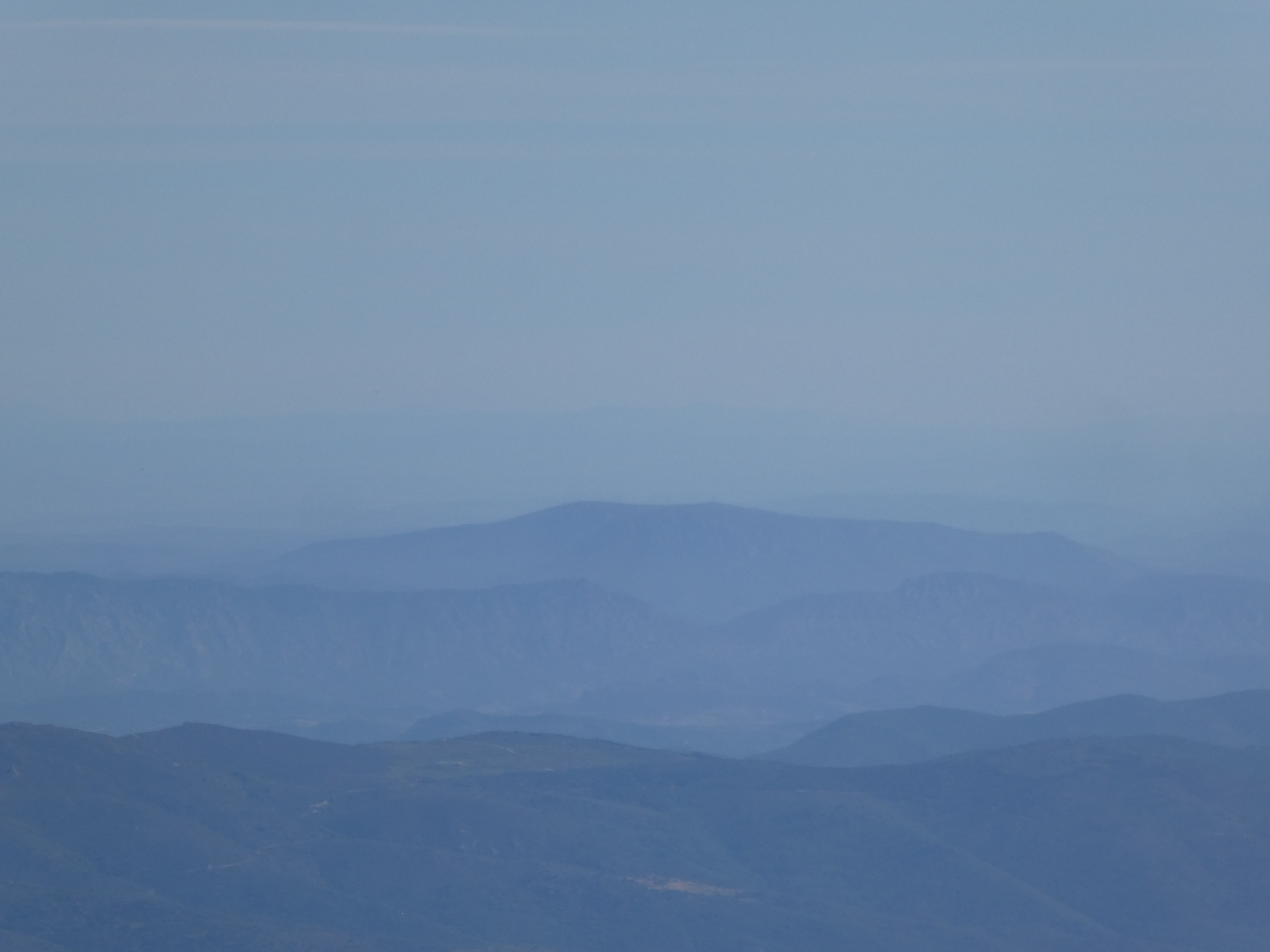 Zoom sur le Pic de Montaud (1031 m) à gauche et le Pic de Nore (1211 m) à droite situés dans la Montagne Noire ... en bas à droite, on aperçoit le Pech de Bugarach (1230 m)