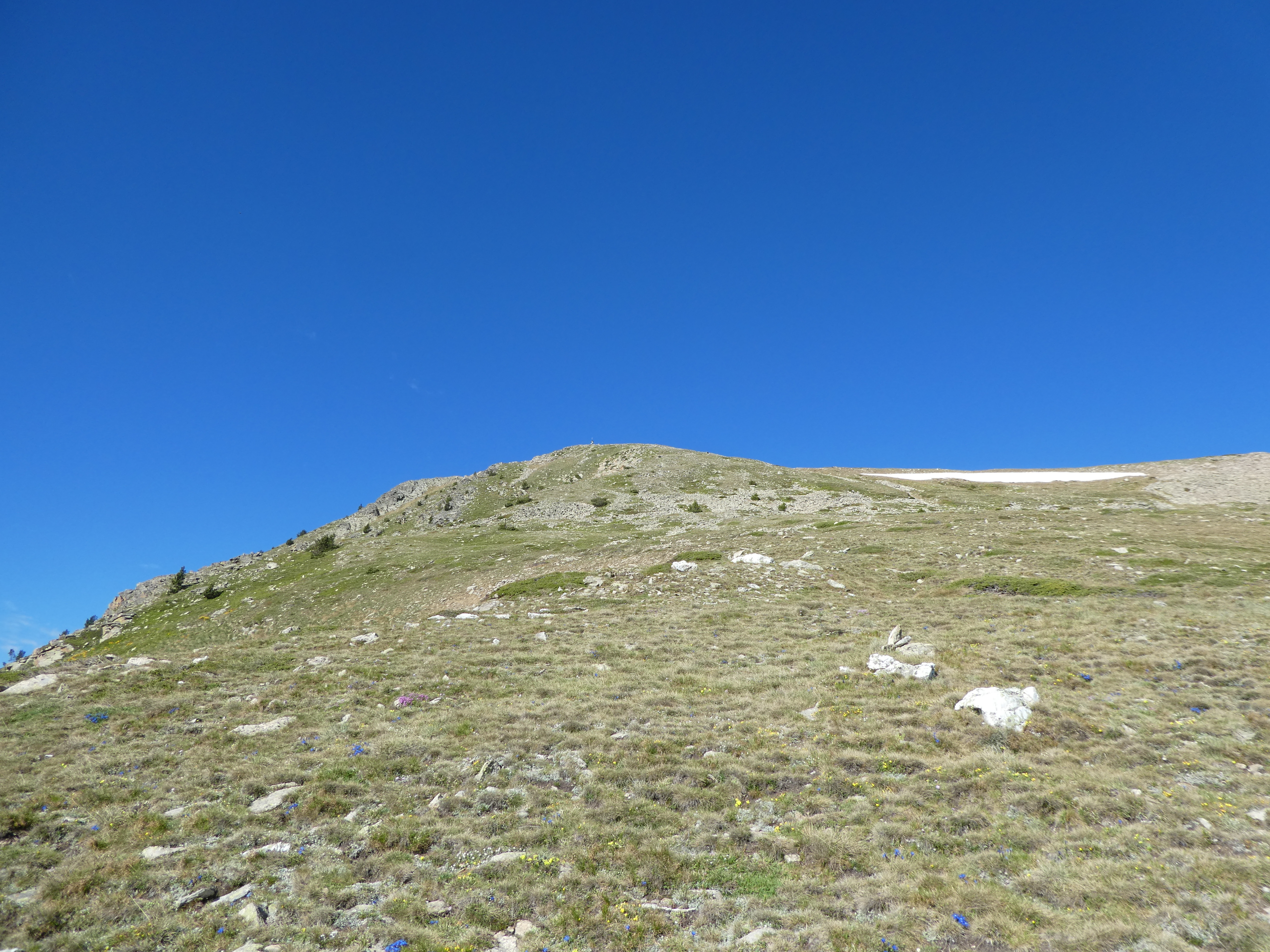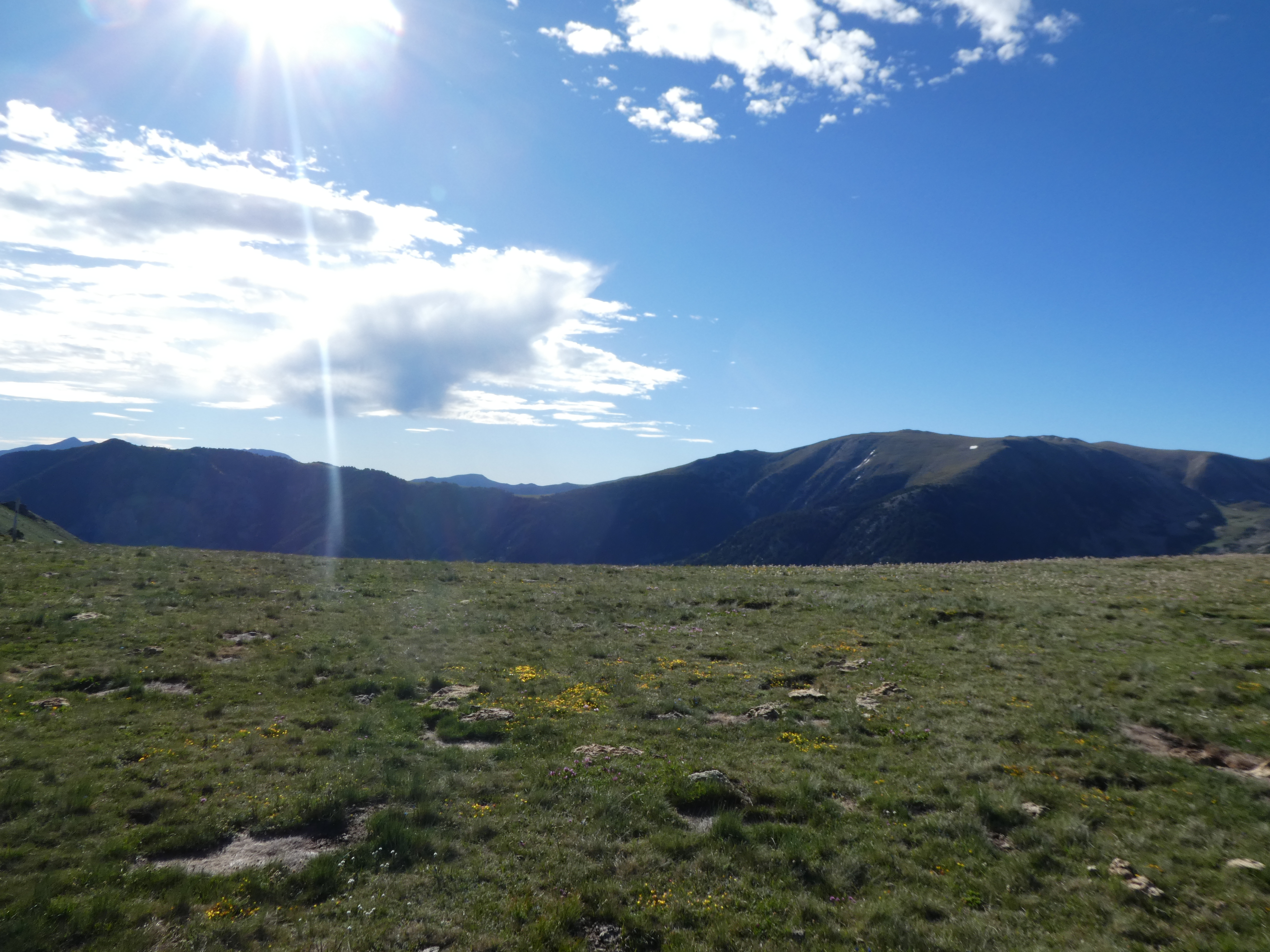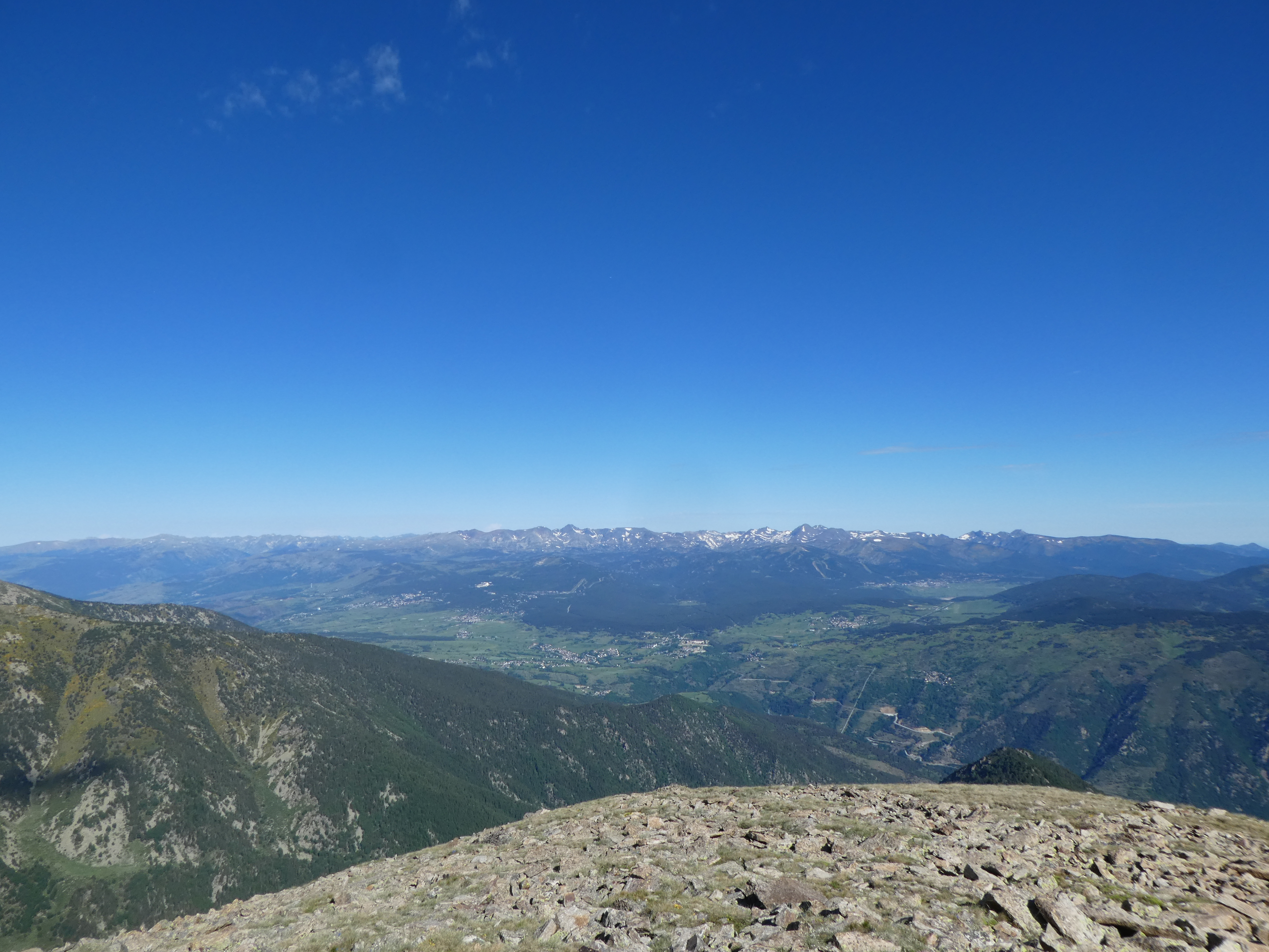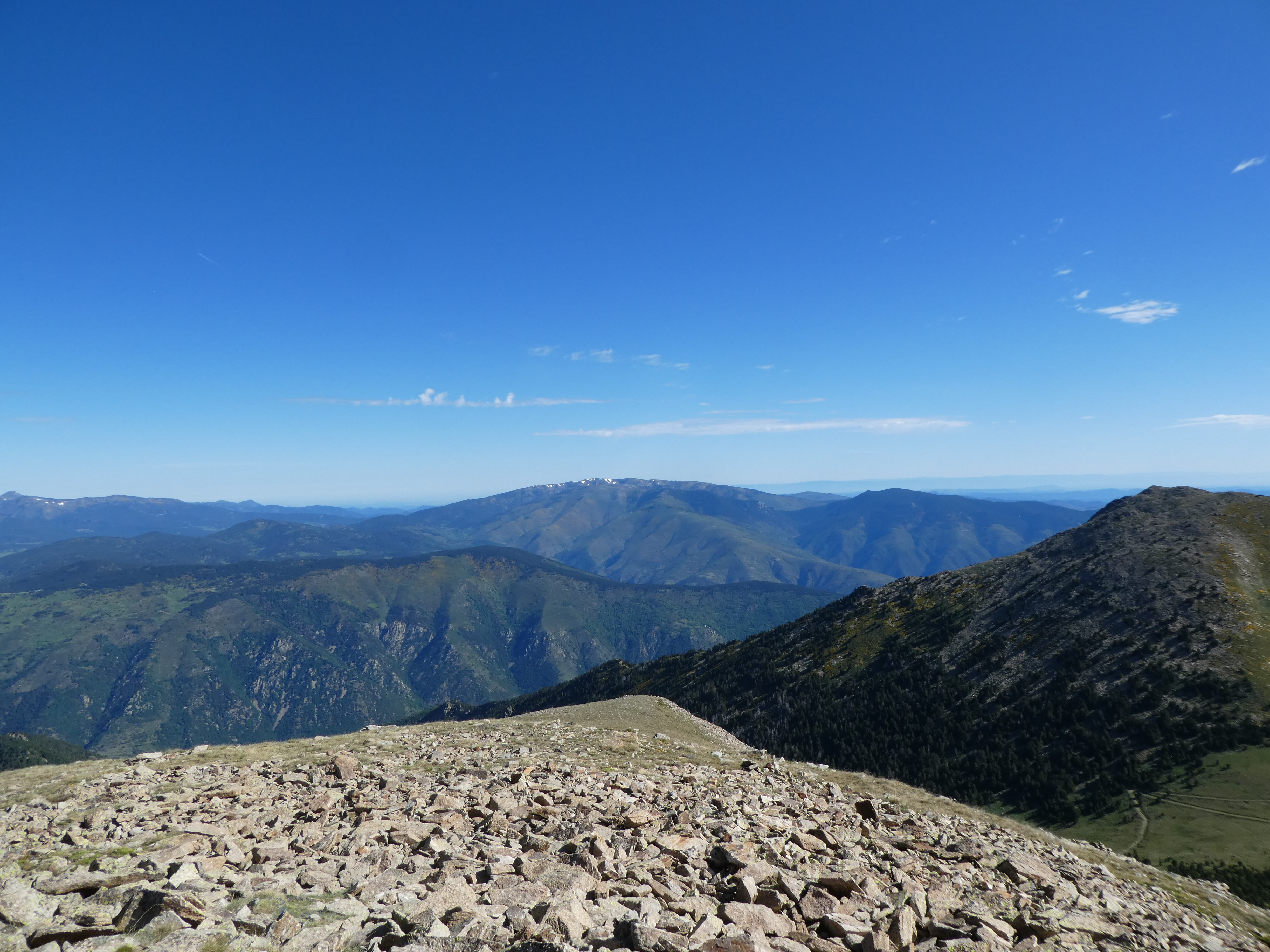Arrivée au sommet du Puig Rodon (2677 m) : beau panorama sur les sommets du Conflent, de la Cerdagne, du Capcir, du massif du Madres, de la Montagne Noire, du Parc Naturel Régional du Haut-Languedoc, des Corbières ainsi que sur le plateau de Cerdagne, du Capcir et la Vallée de la Têt