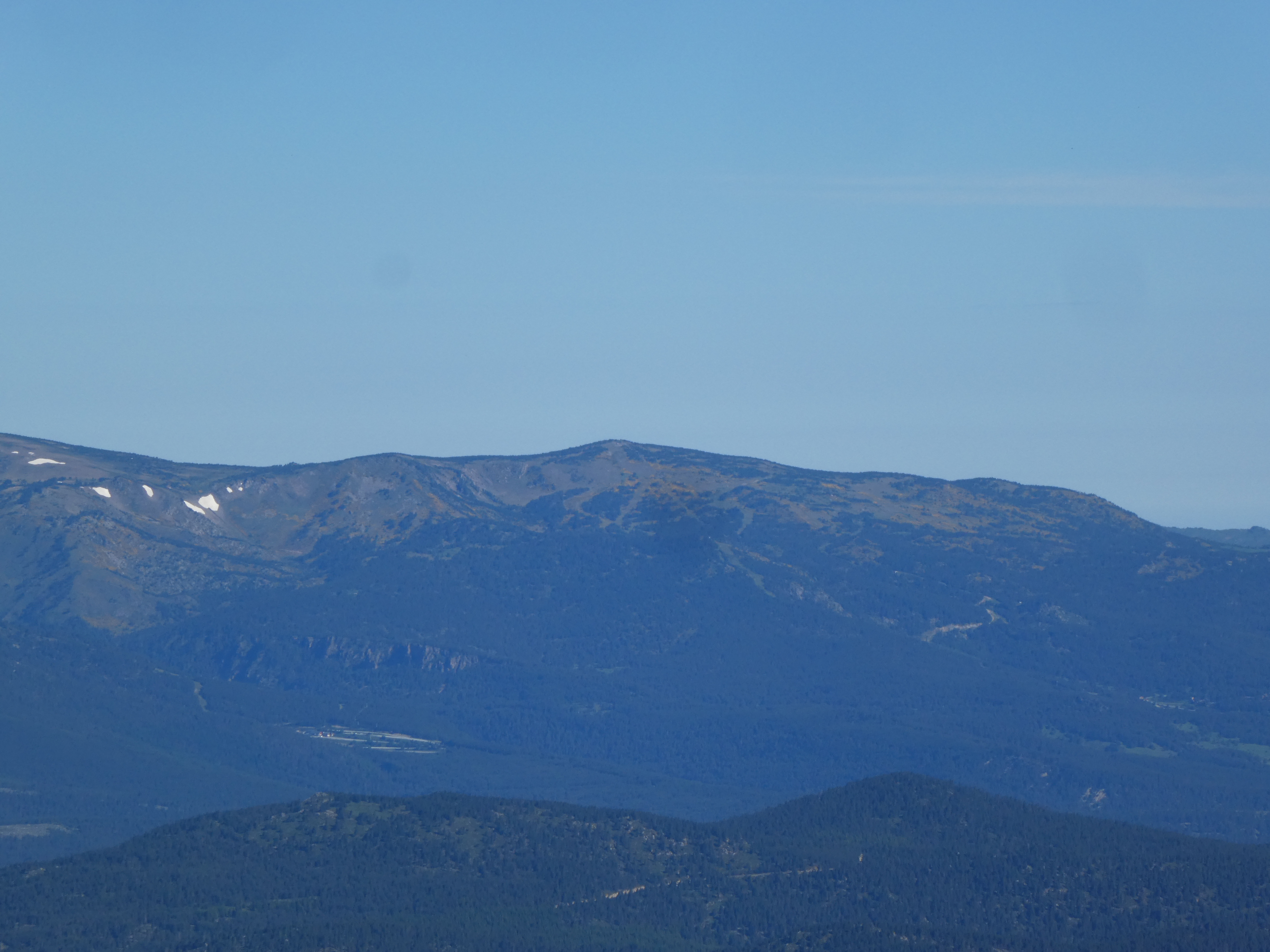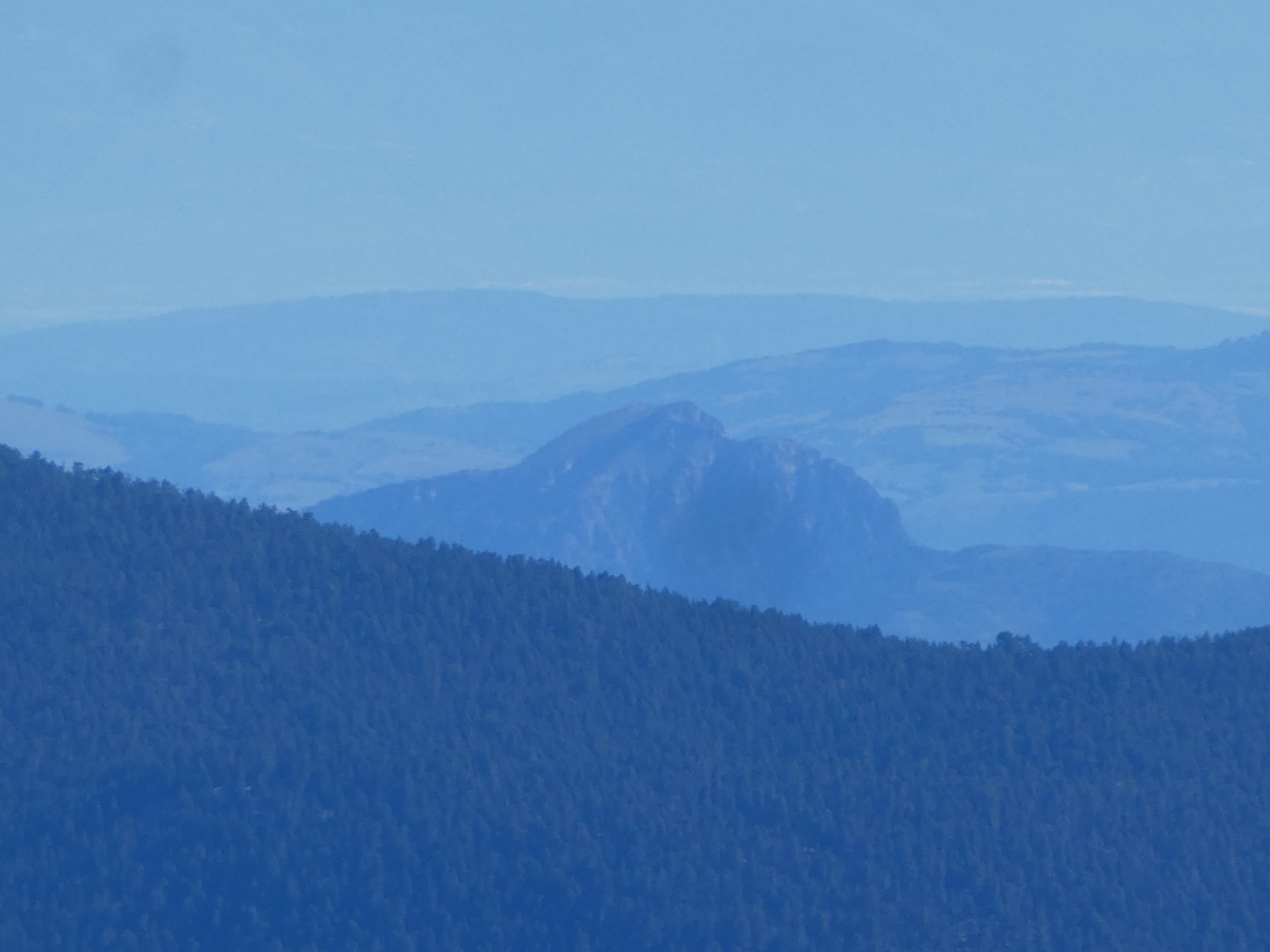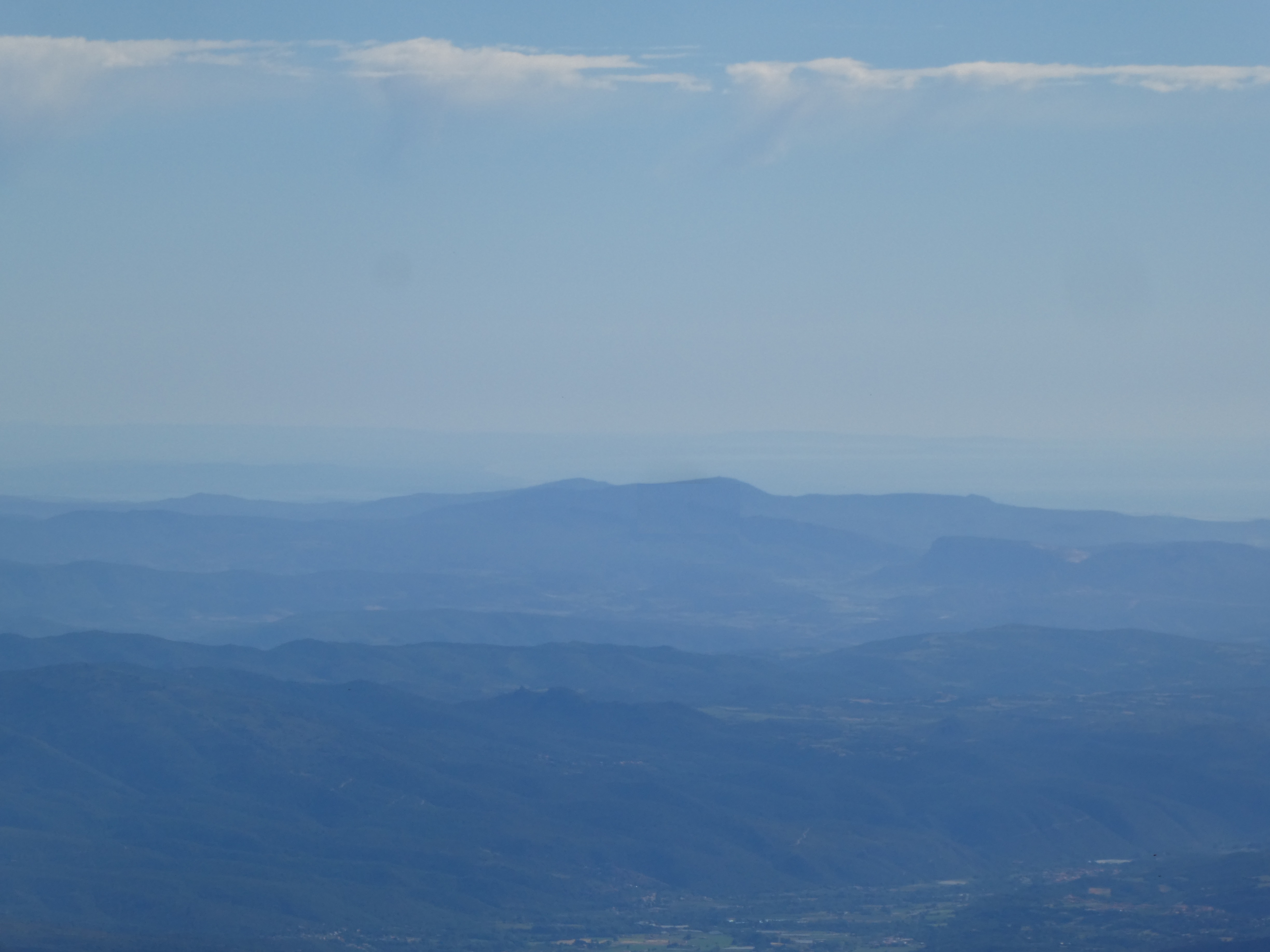 Zoom sur el Dormidor (1843 m) à gauche, le Mont Coronat (2172 m) au centre ... au fond, on aperçoit clairement la Montagne Noire située à 110 kilomètres