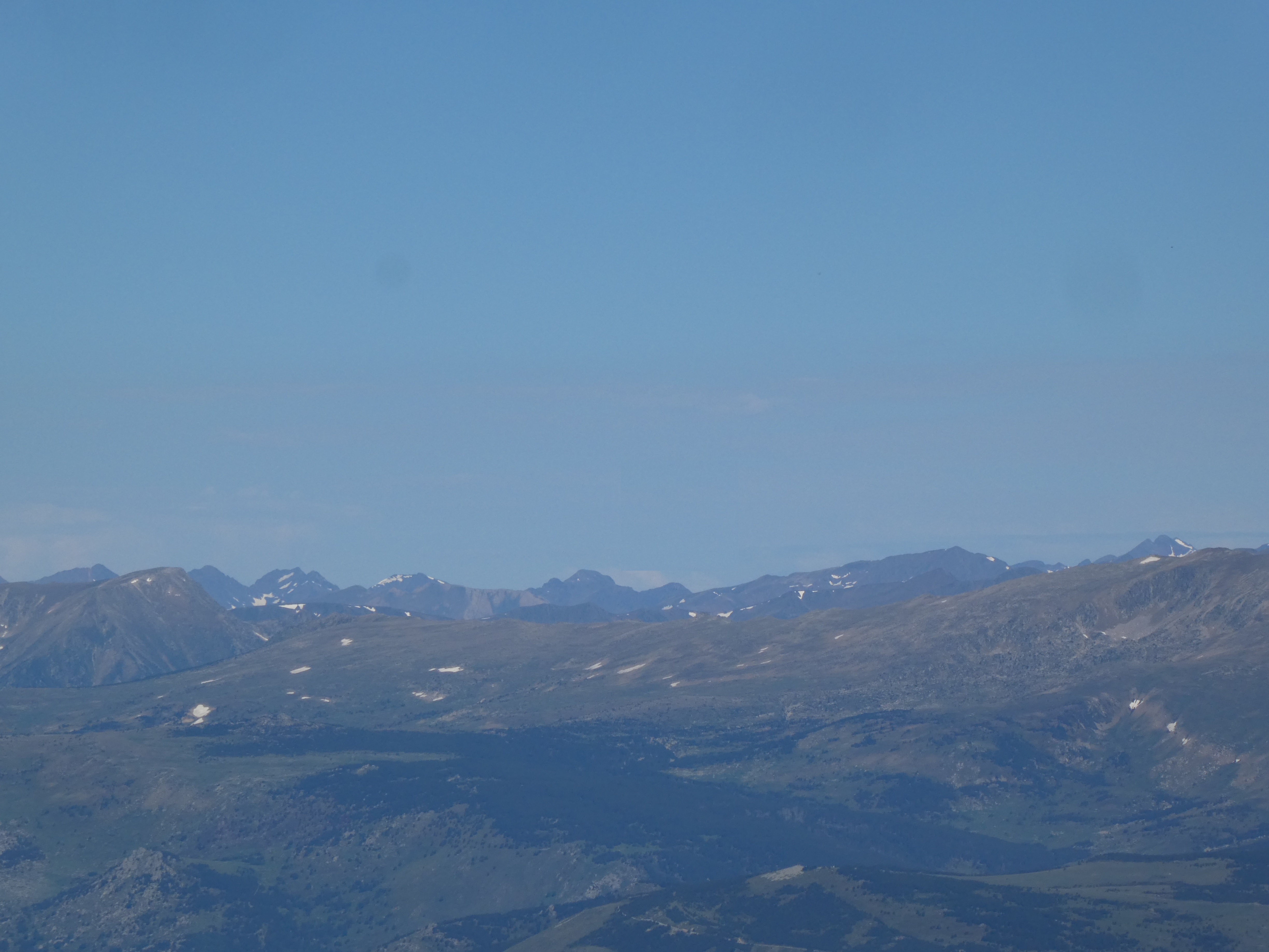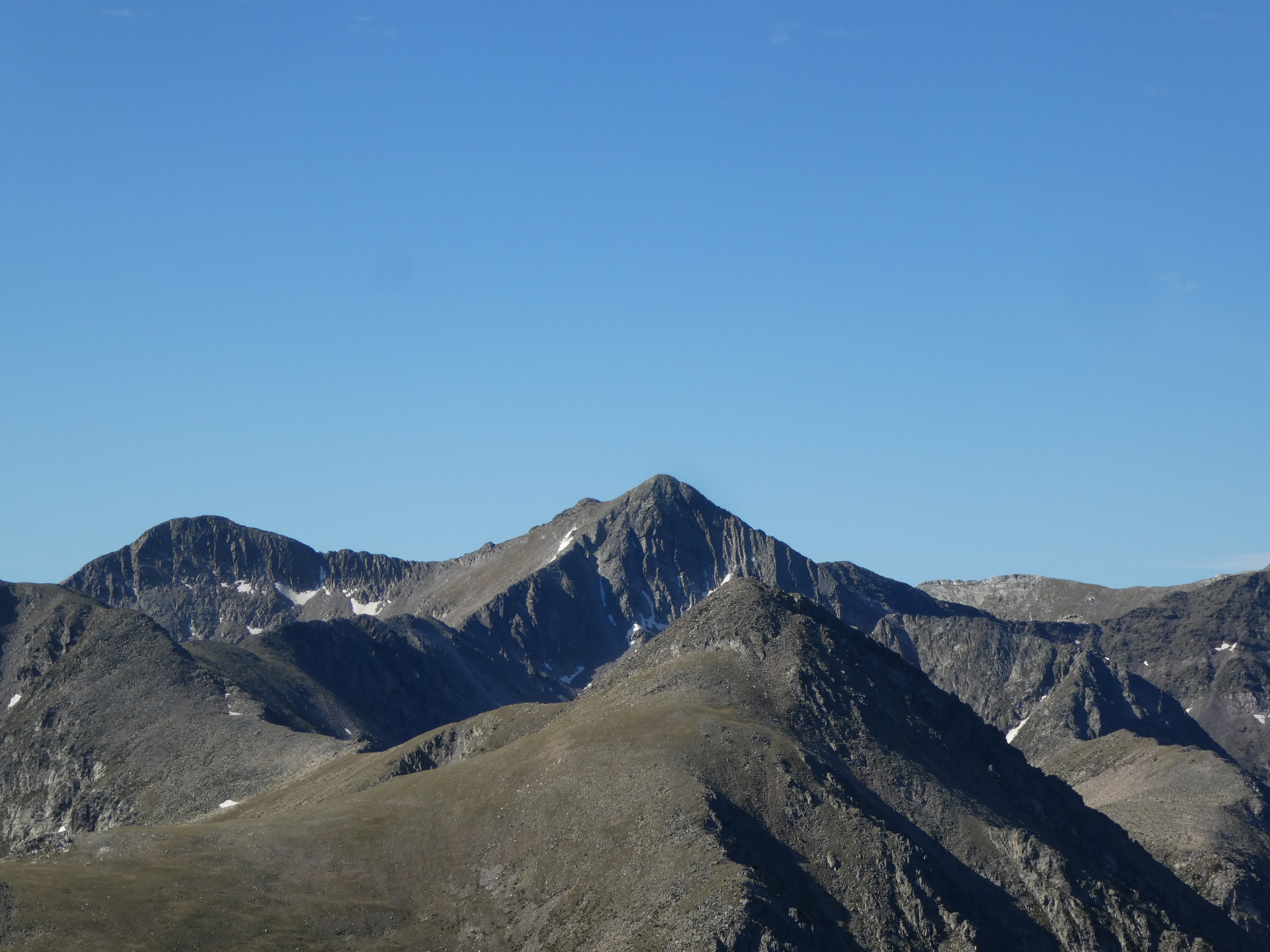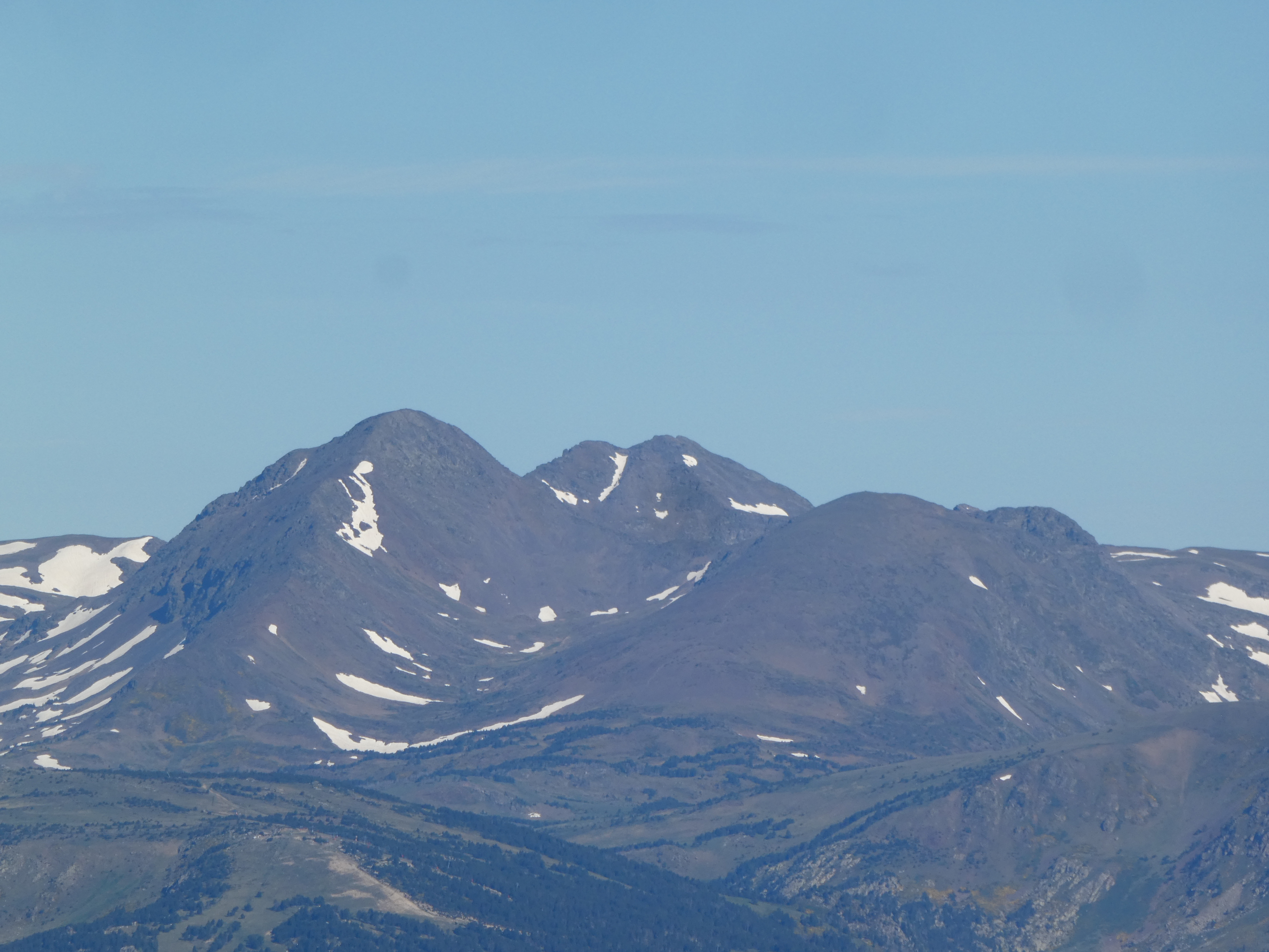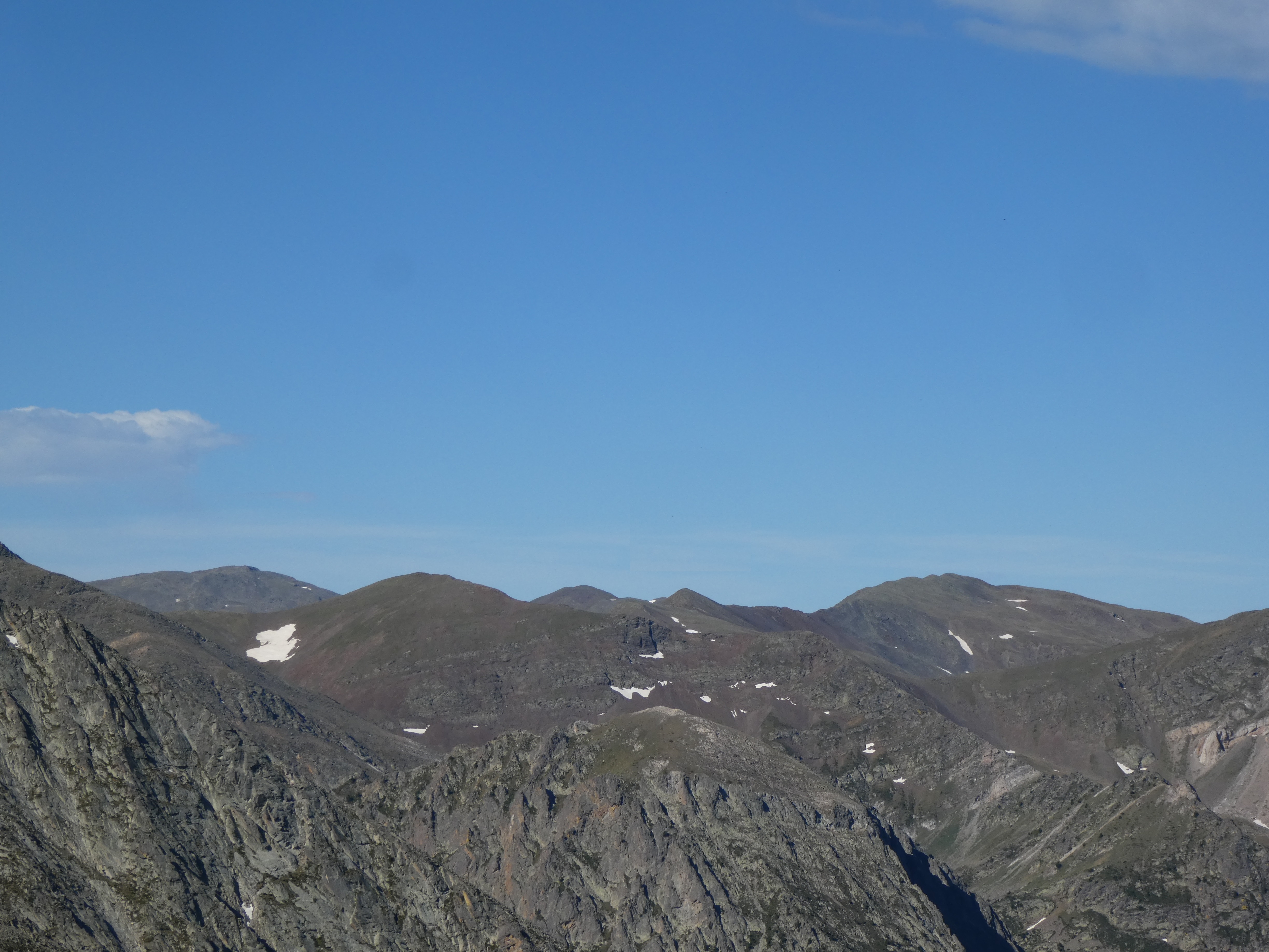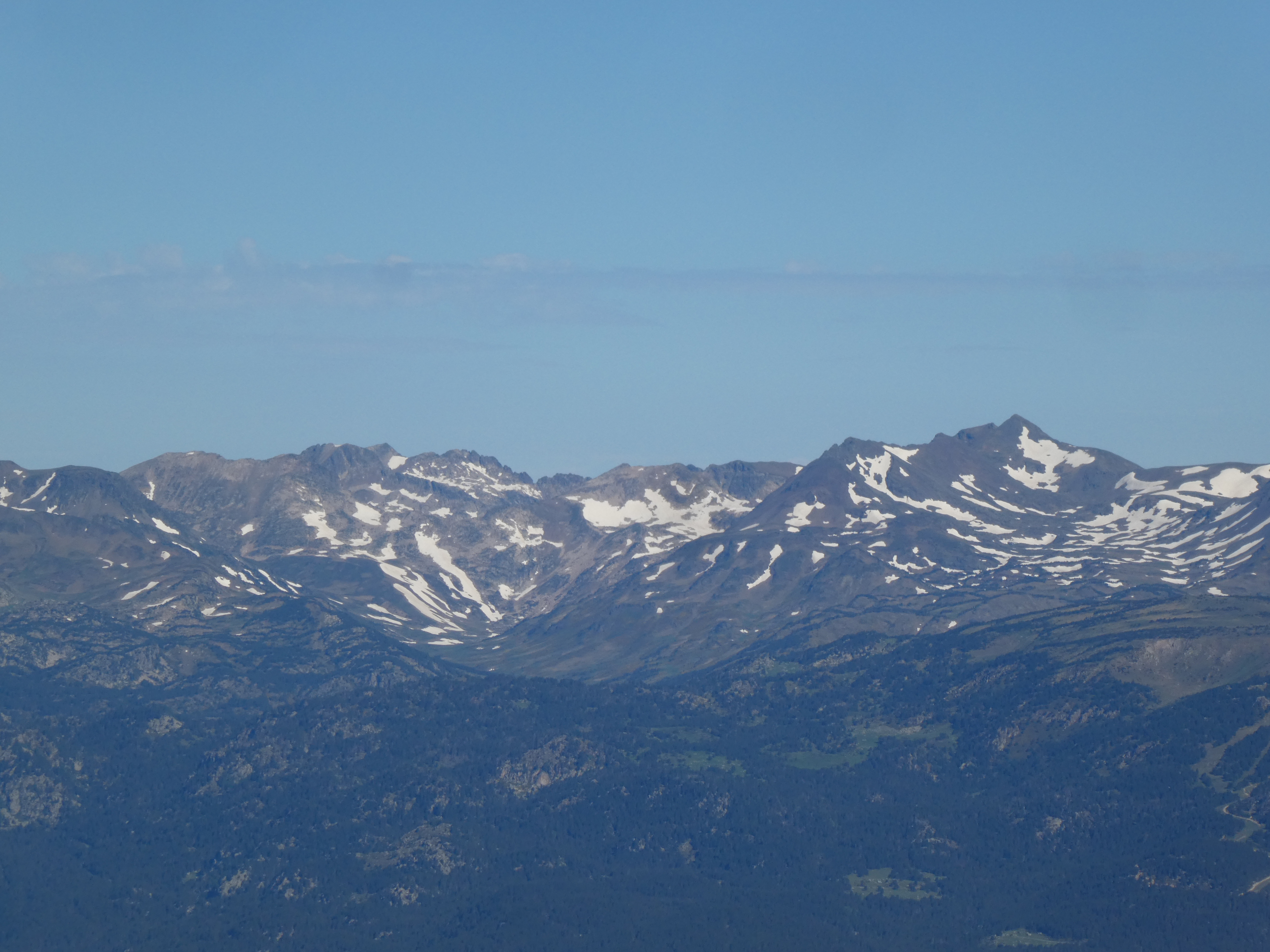 Zoom sur les sommets entre Ariège et Andorre avec le Pic de Médécourbe (2914 m) et le Pic de Racofred (2836 m) à gauche, la Pica Roja (2903 m) au centre, et le Pic del Estanyó (2915 m) et la Pique d'Estats (3143 m) à droite