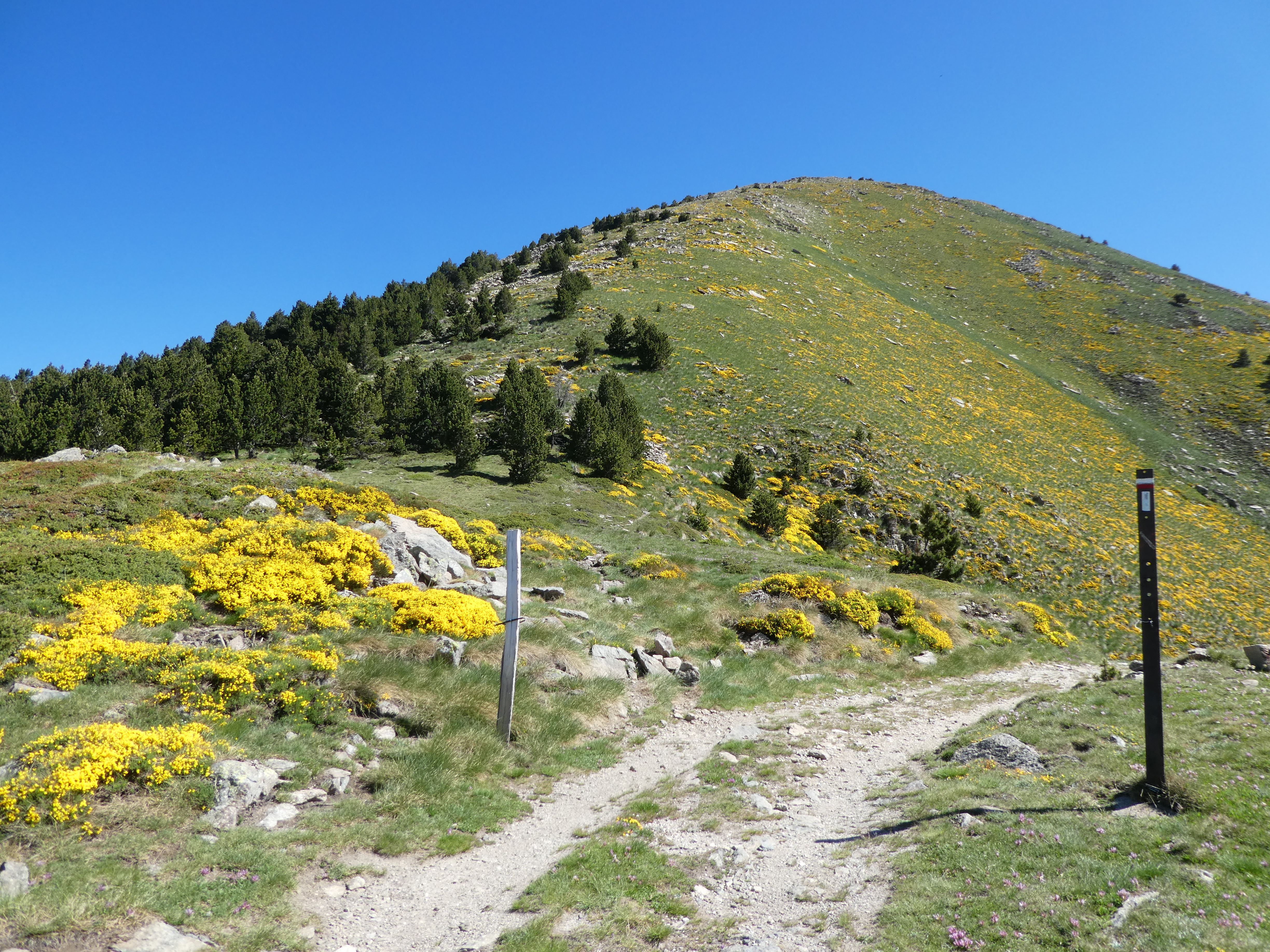 Coll Mitjà (2367 m) (panneau manquant) : suivre le chemin partant sur la droite direction Puig Rodon, aucun balisage dorénavant (la montée est bien cairnée quasiment jusqu'au sommet) (pour ceux qui ne voudraient monter qu'au Pic Gallinàs, suivre le chemin partant sur la gauche)