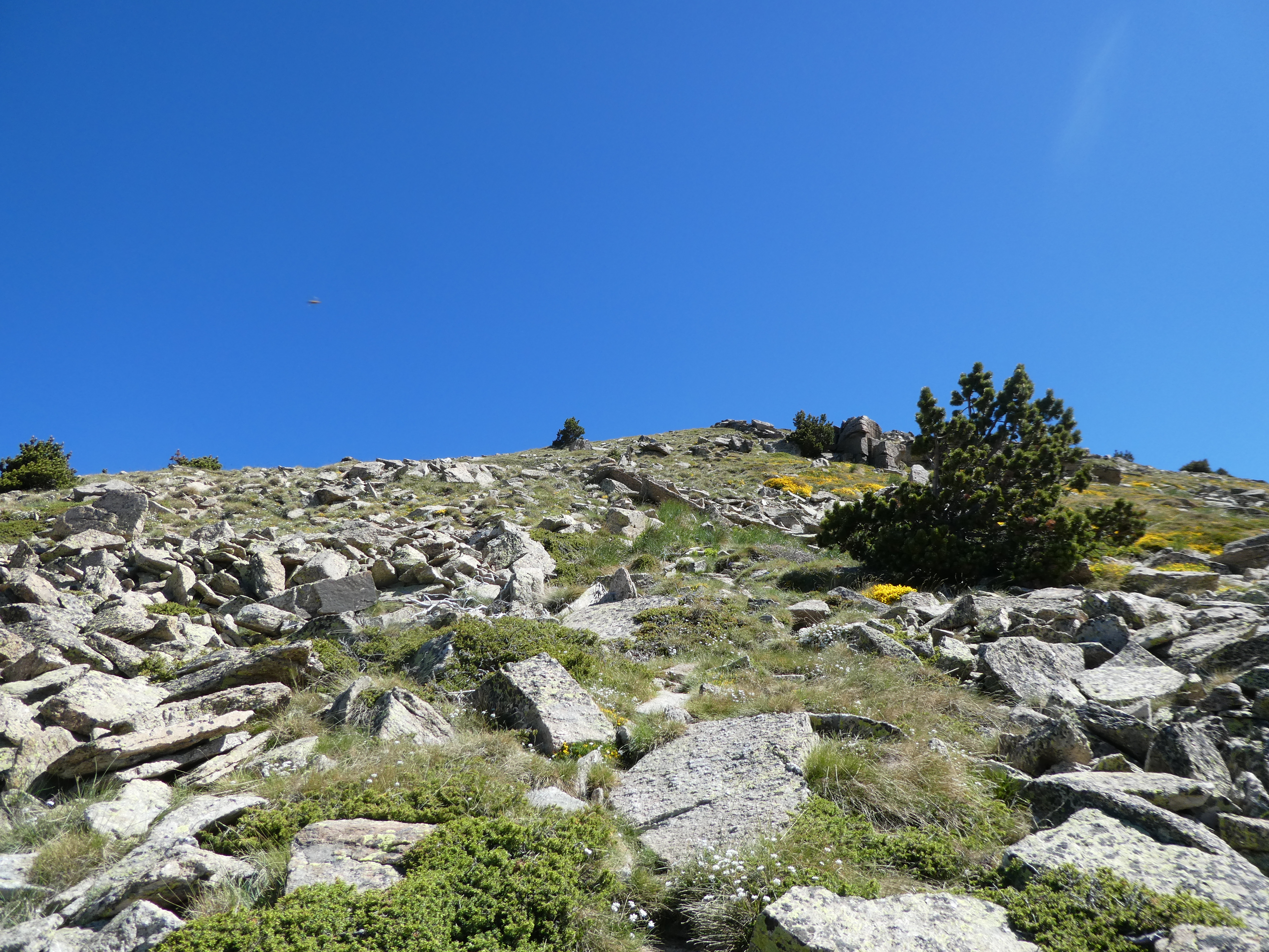 Dès que le chemin disparaît (400 mètres après le Coll Mitjà), monter à vue en suivant les cairns et en visant le sommet direction Puig Rodon