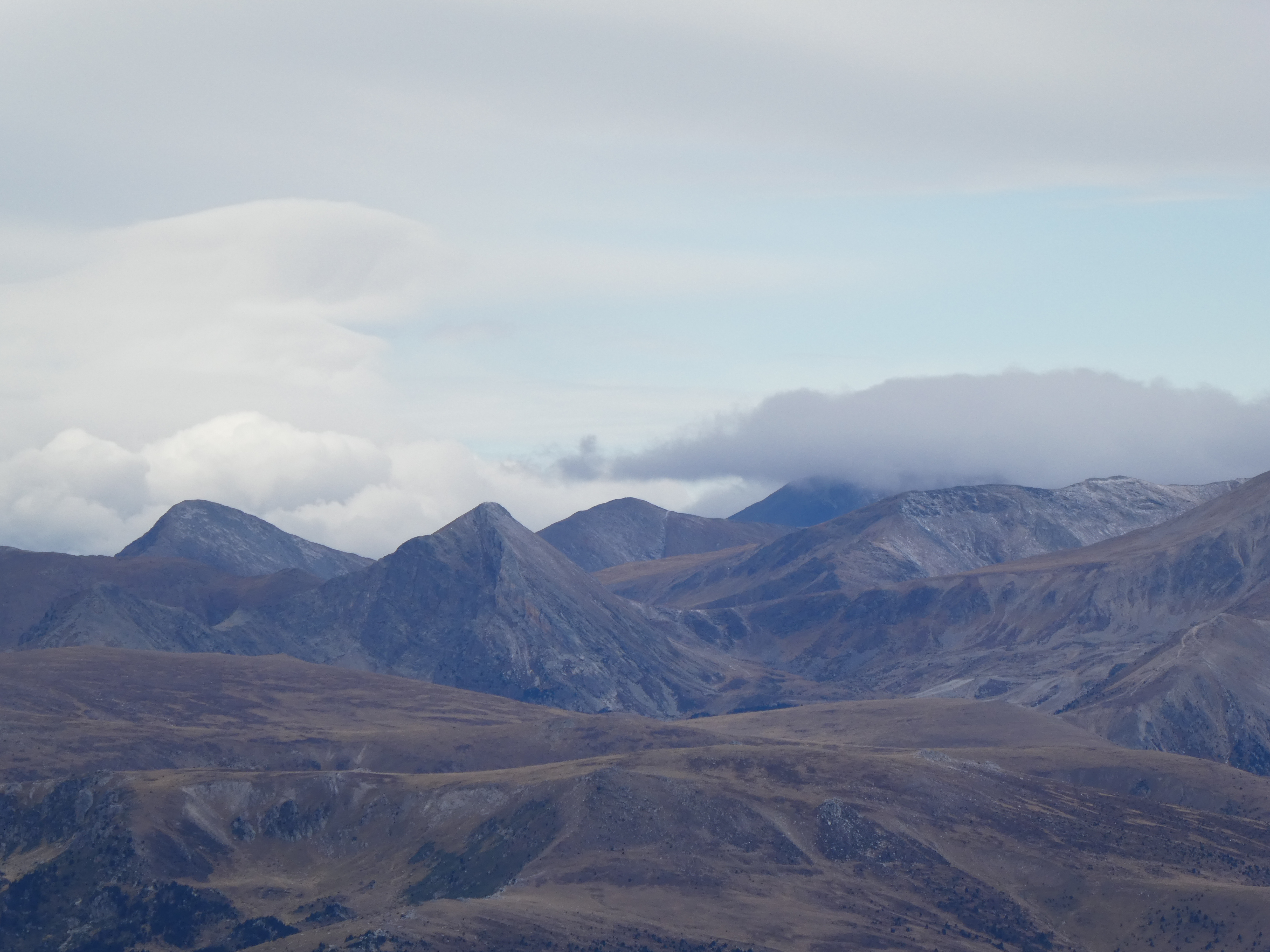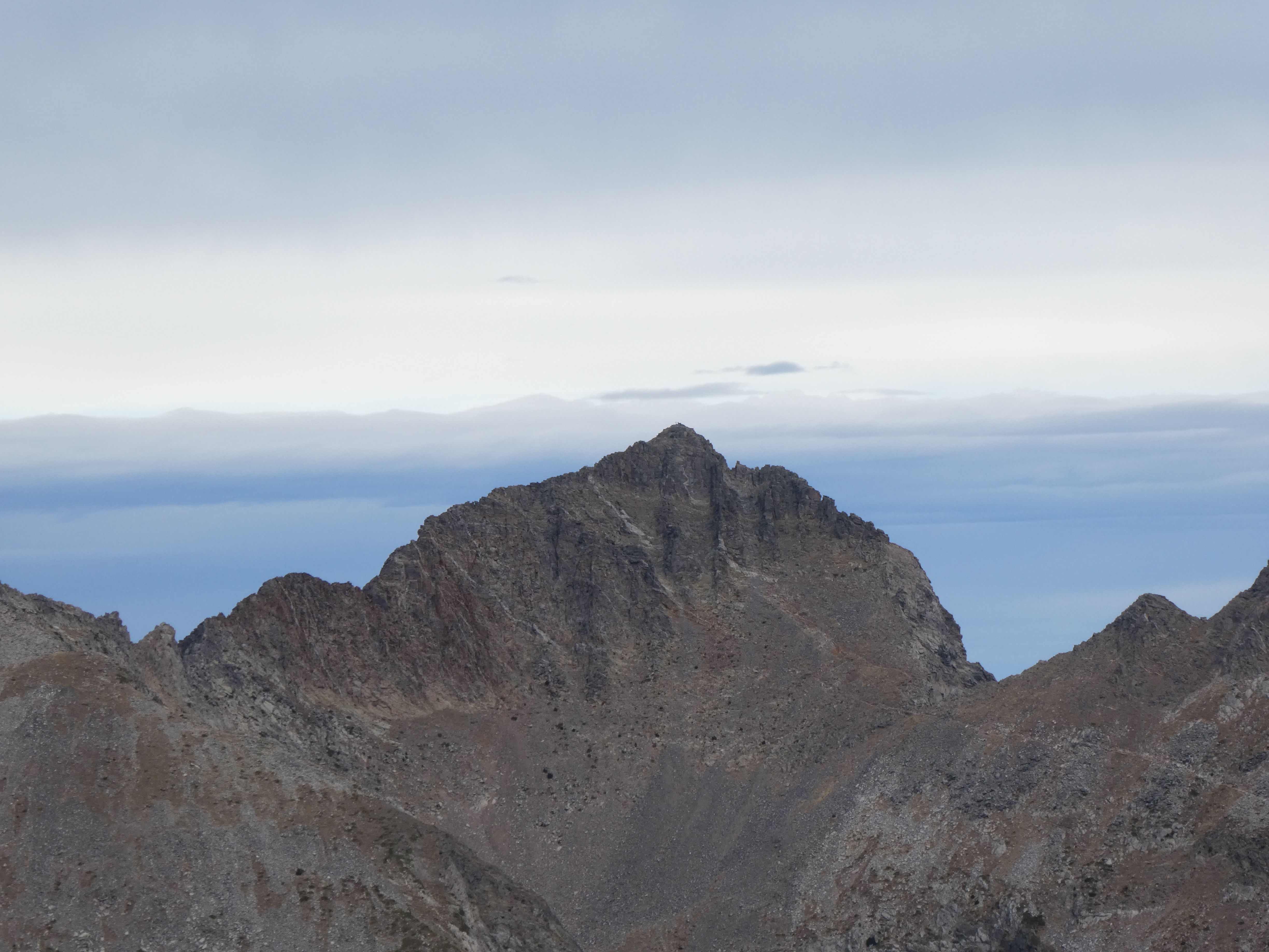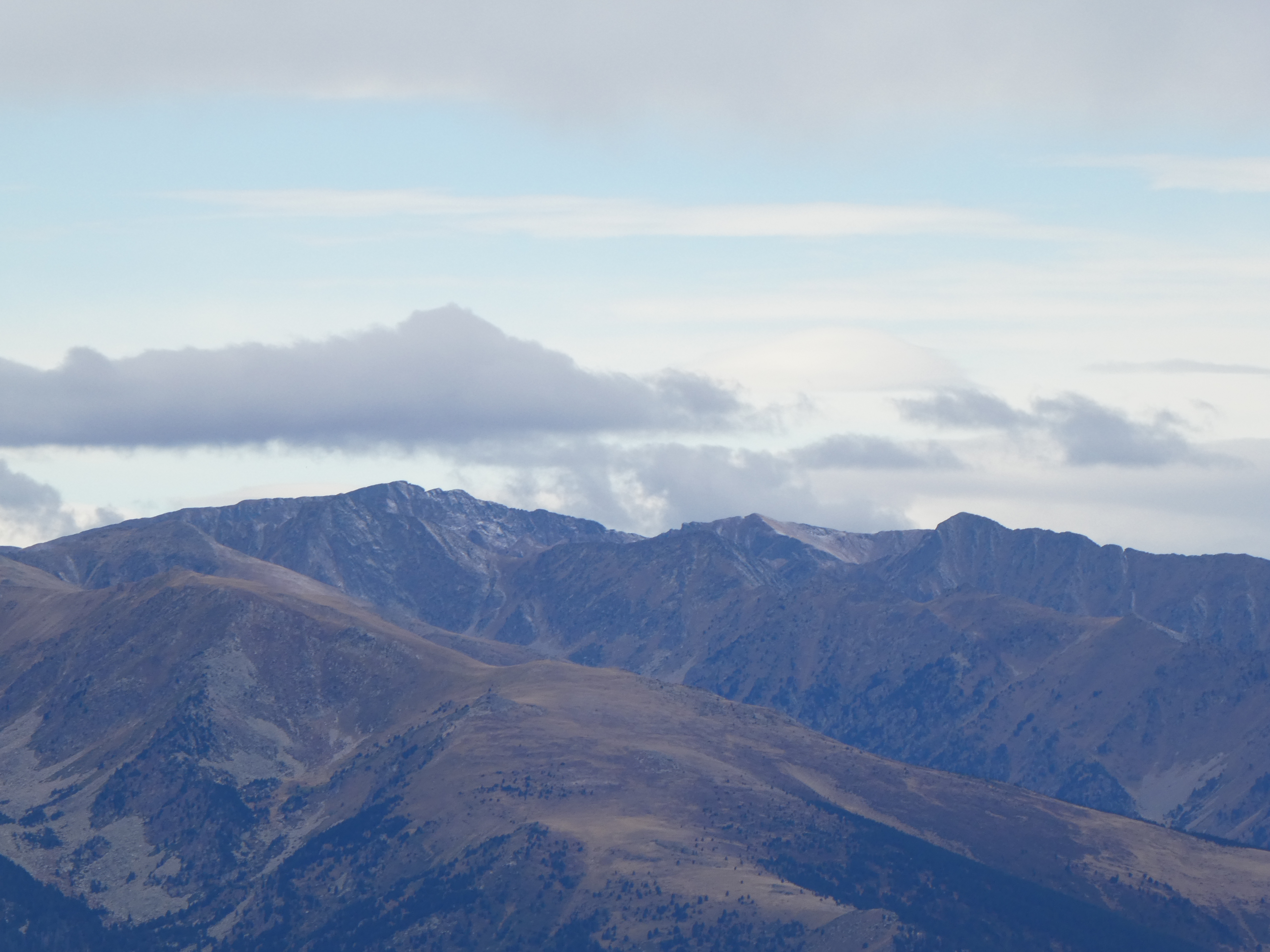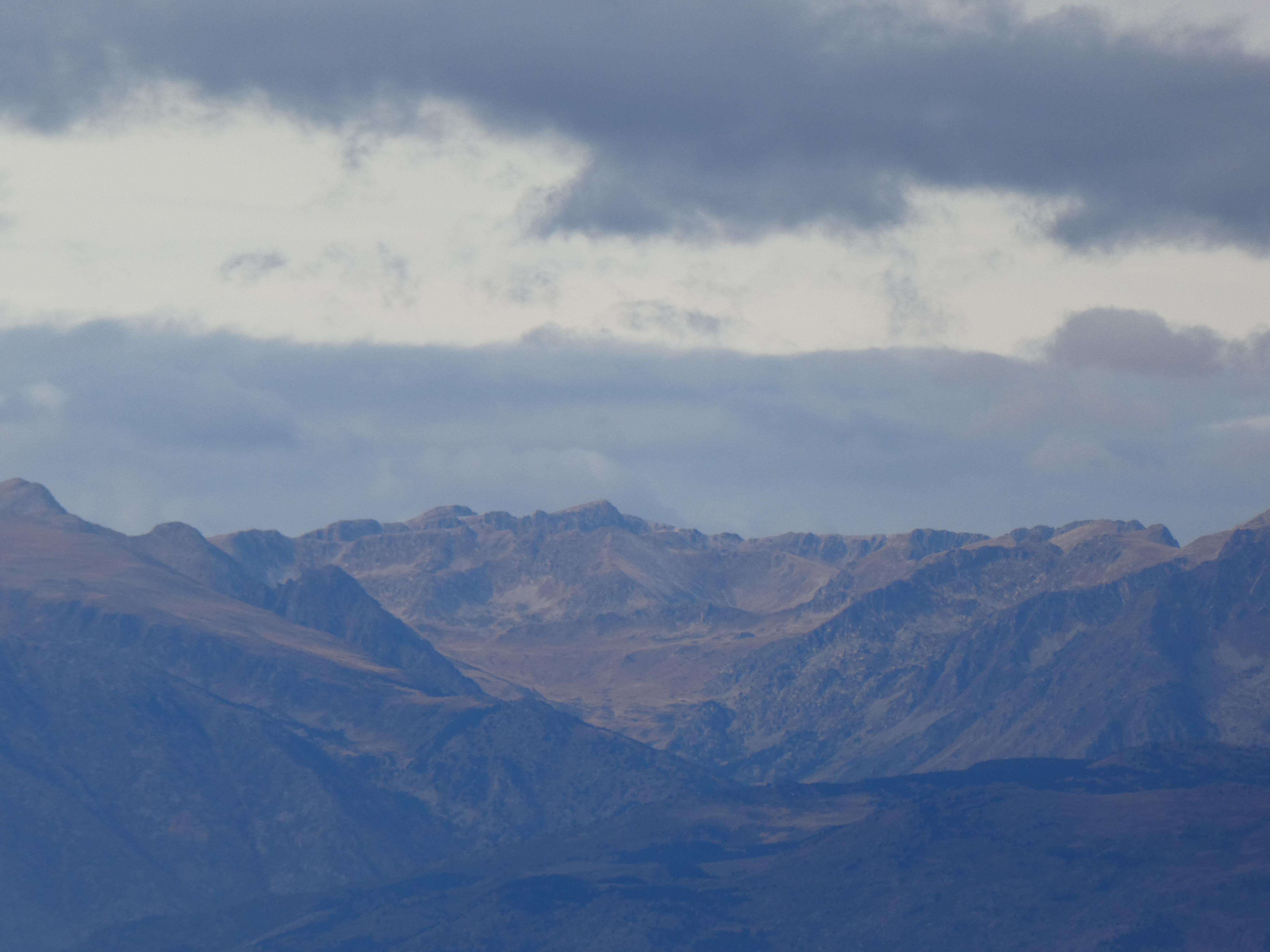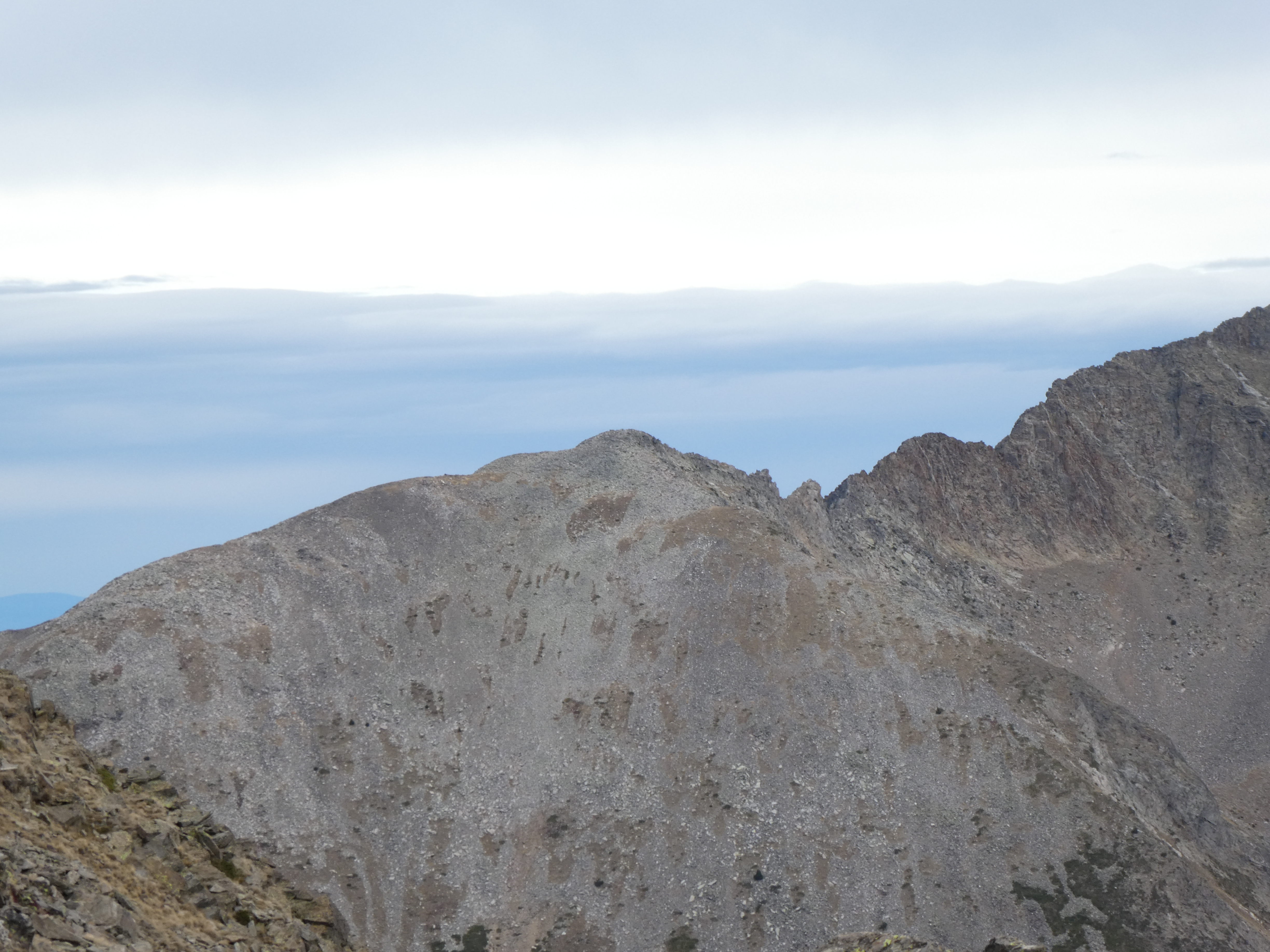 Zoom sur le Torreneules (2713 m) à gauche, le Gra de Fajol (2714 m) et le Cim de la Coma del Clot (2739 m) au centre, et le Puigmal (2910 m) à droite dans les nuages