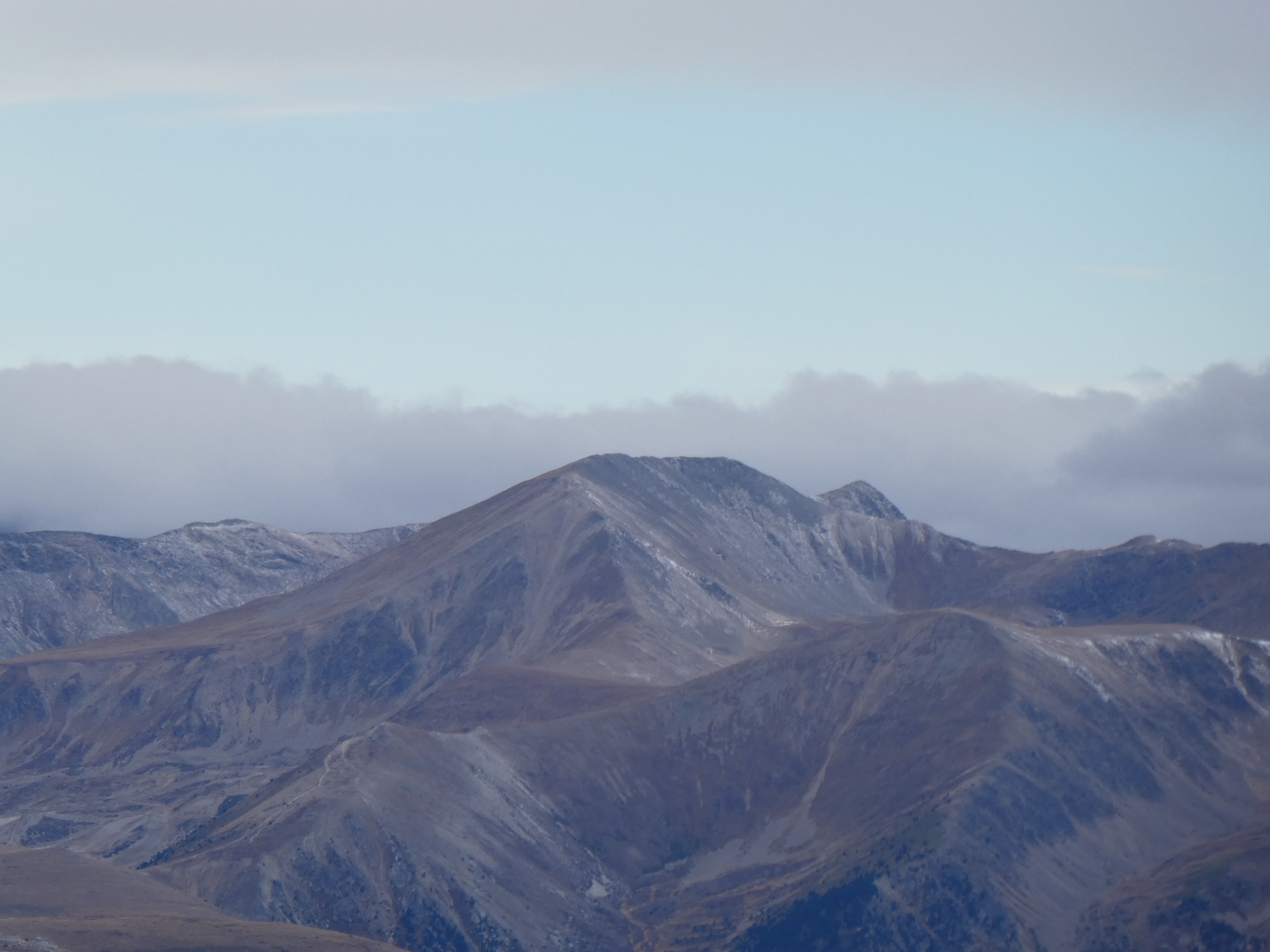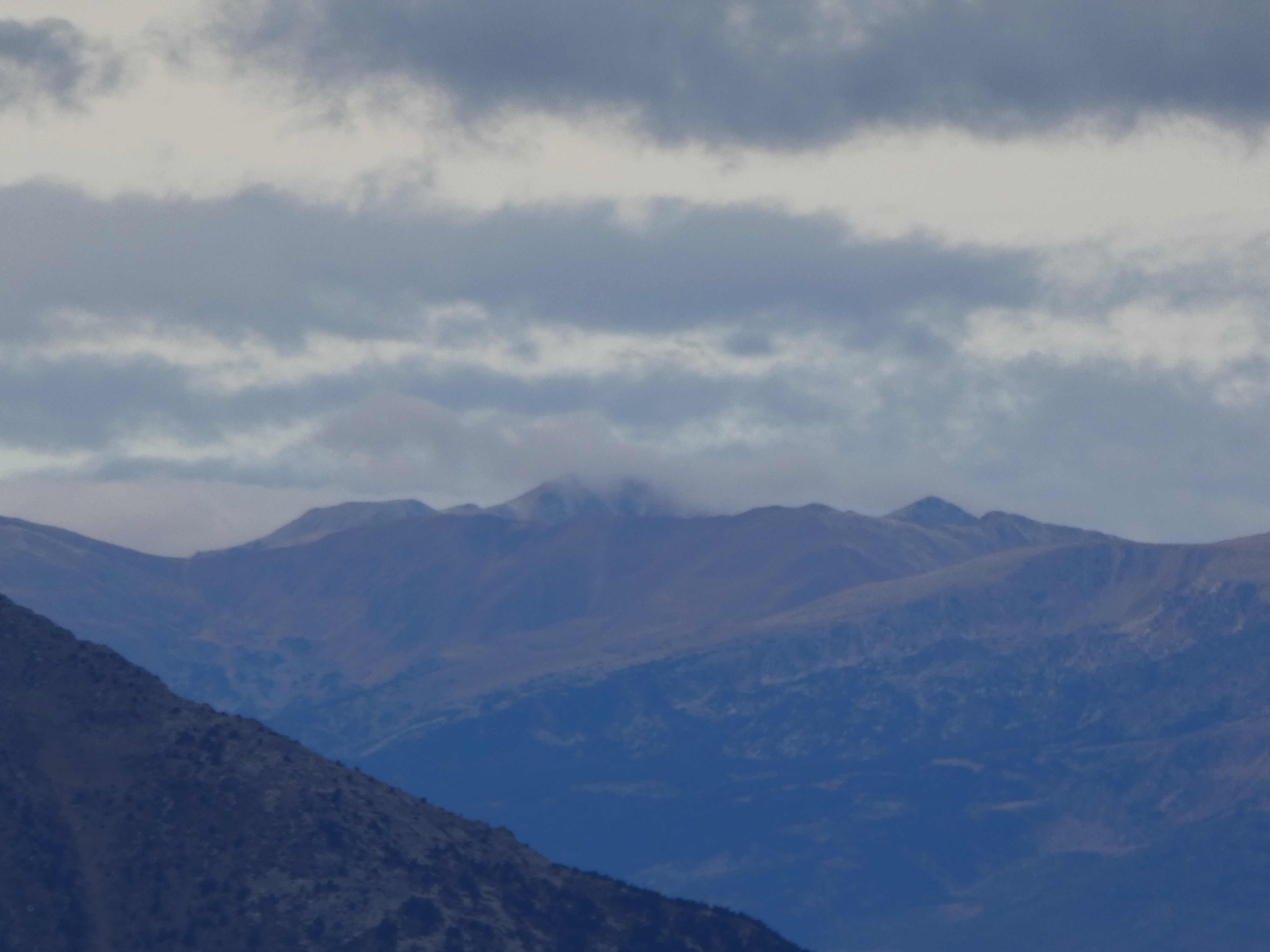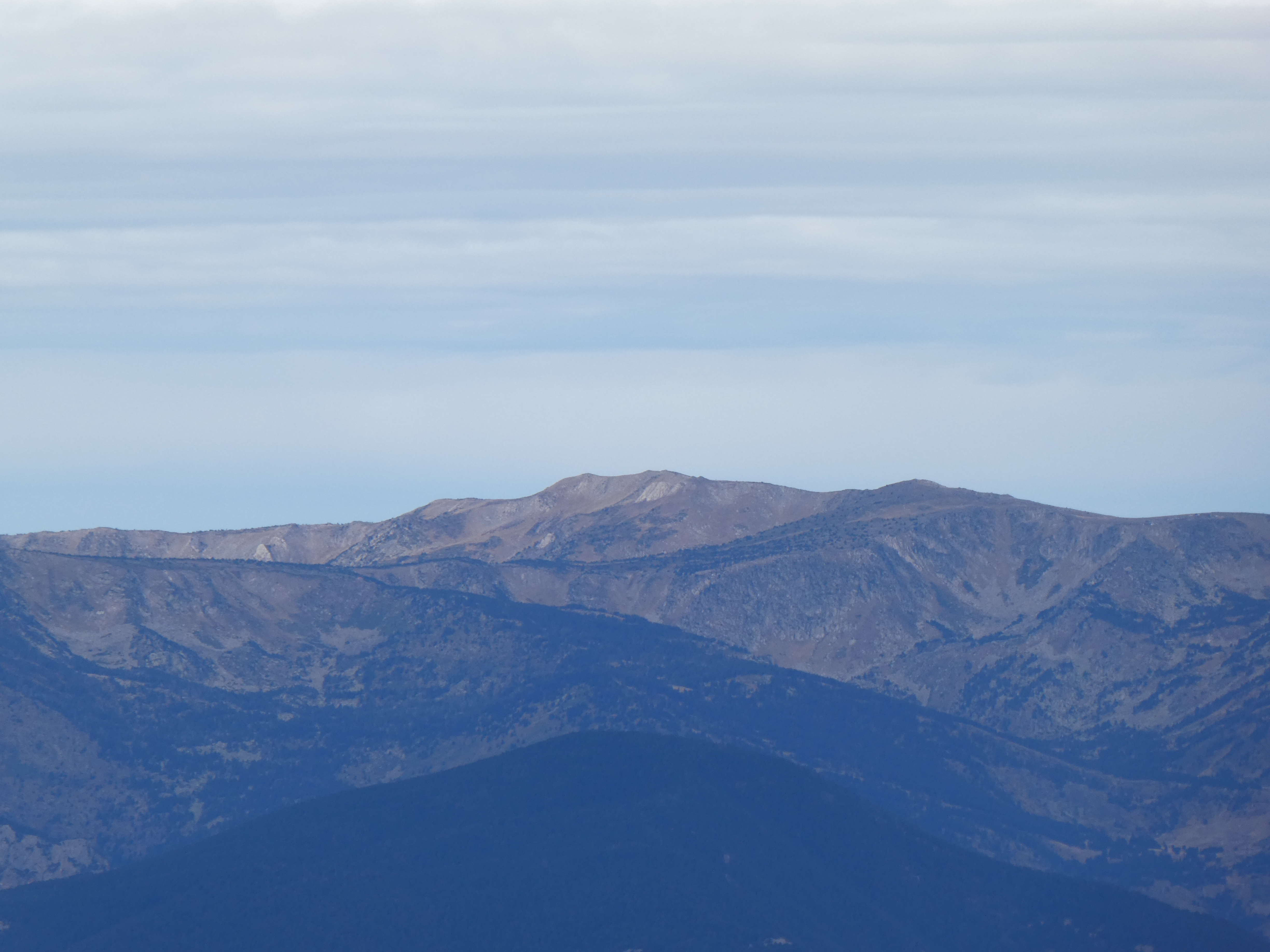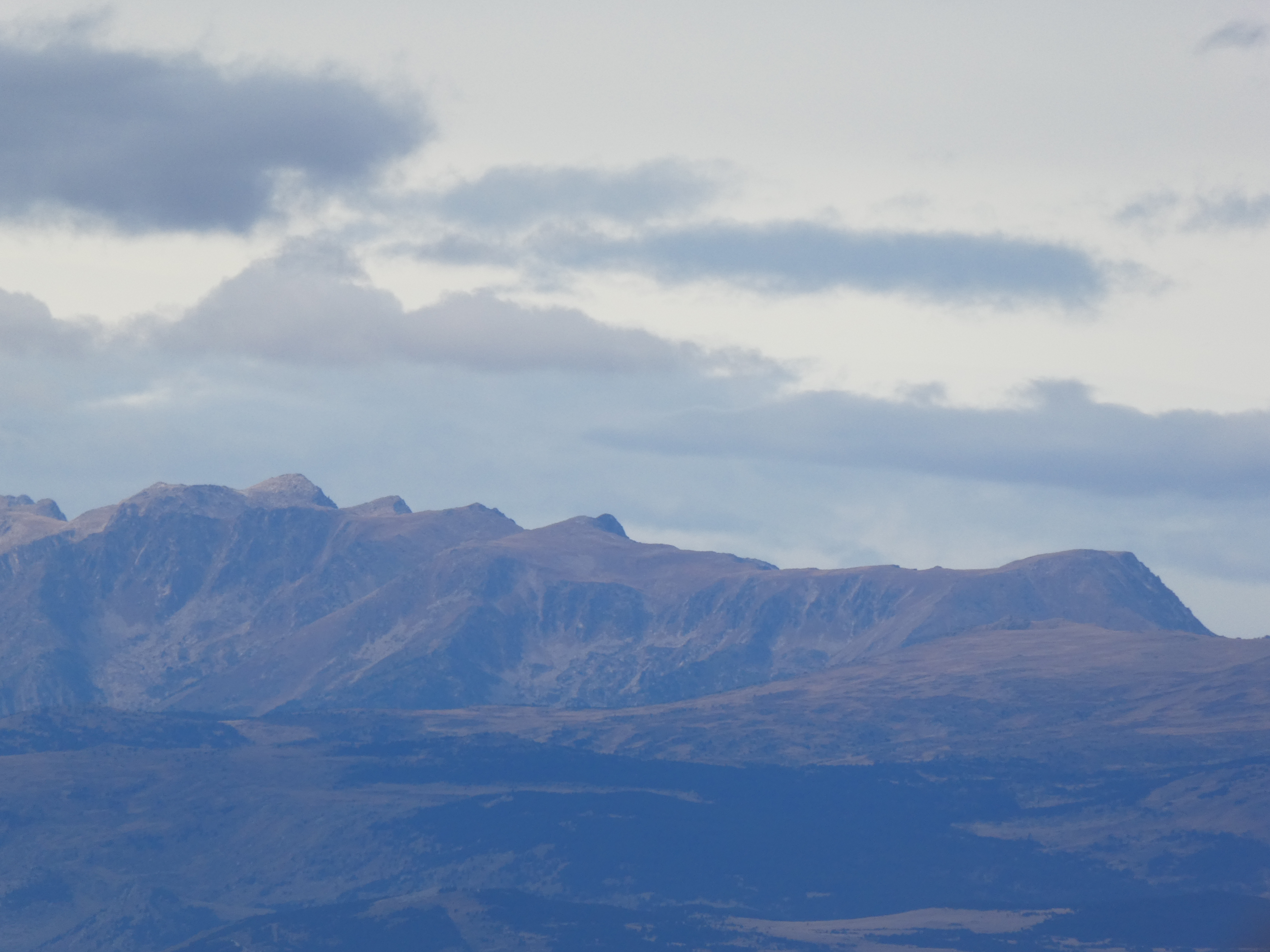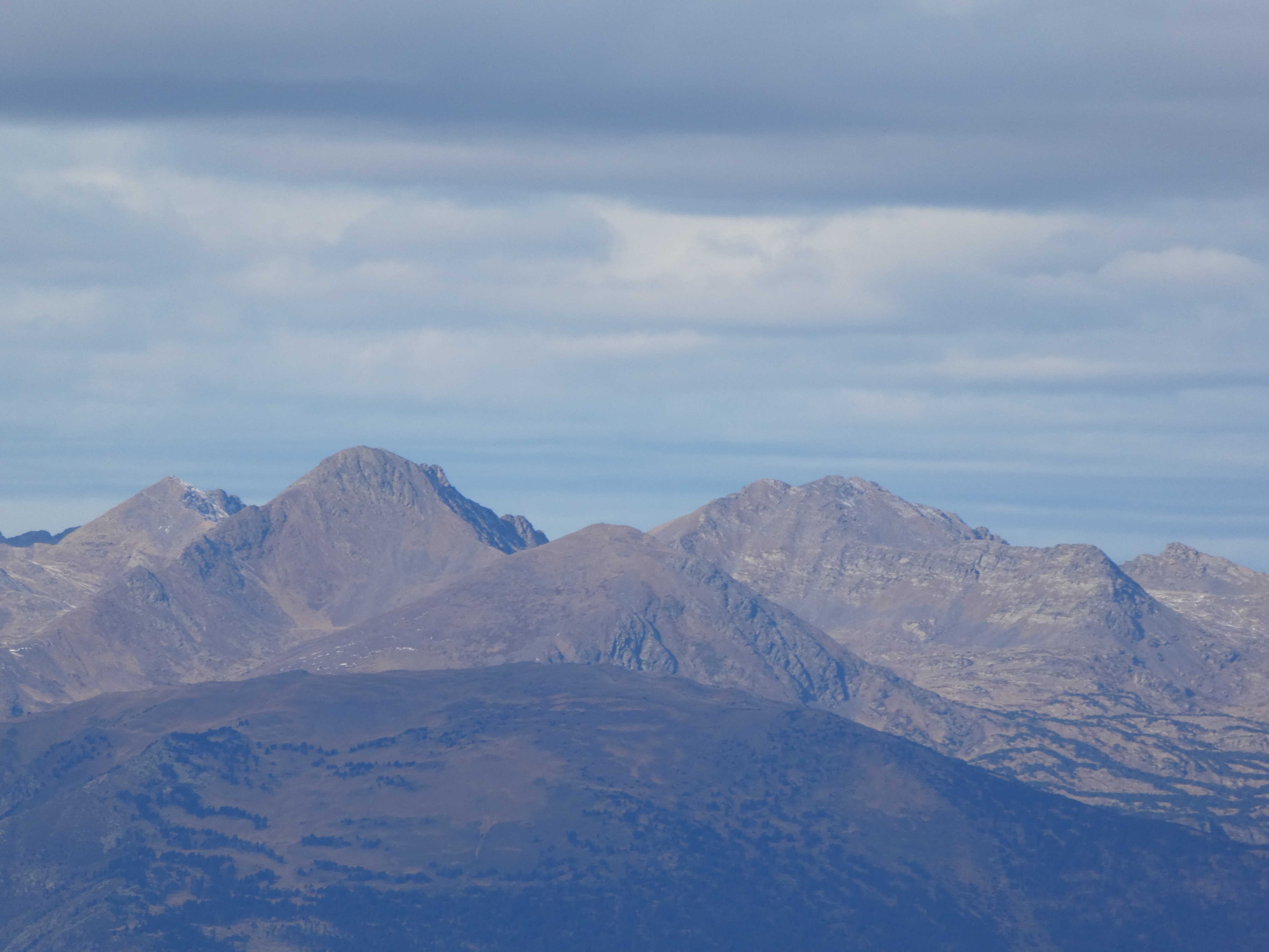 Zoom sur le Torreneules (2713 m) à gauche, le Gra de Fajol (2714 m) et le Cim de la Coma del Clot (2739 m) au centre, et le Puigmal (2910 m) à droite dans les nuages