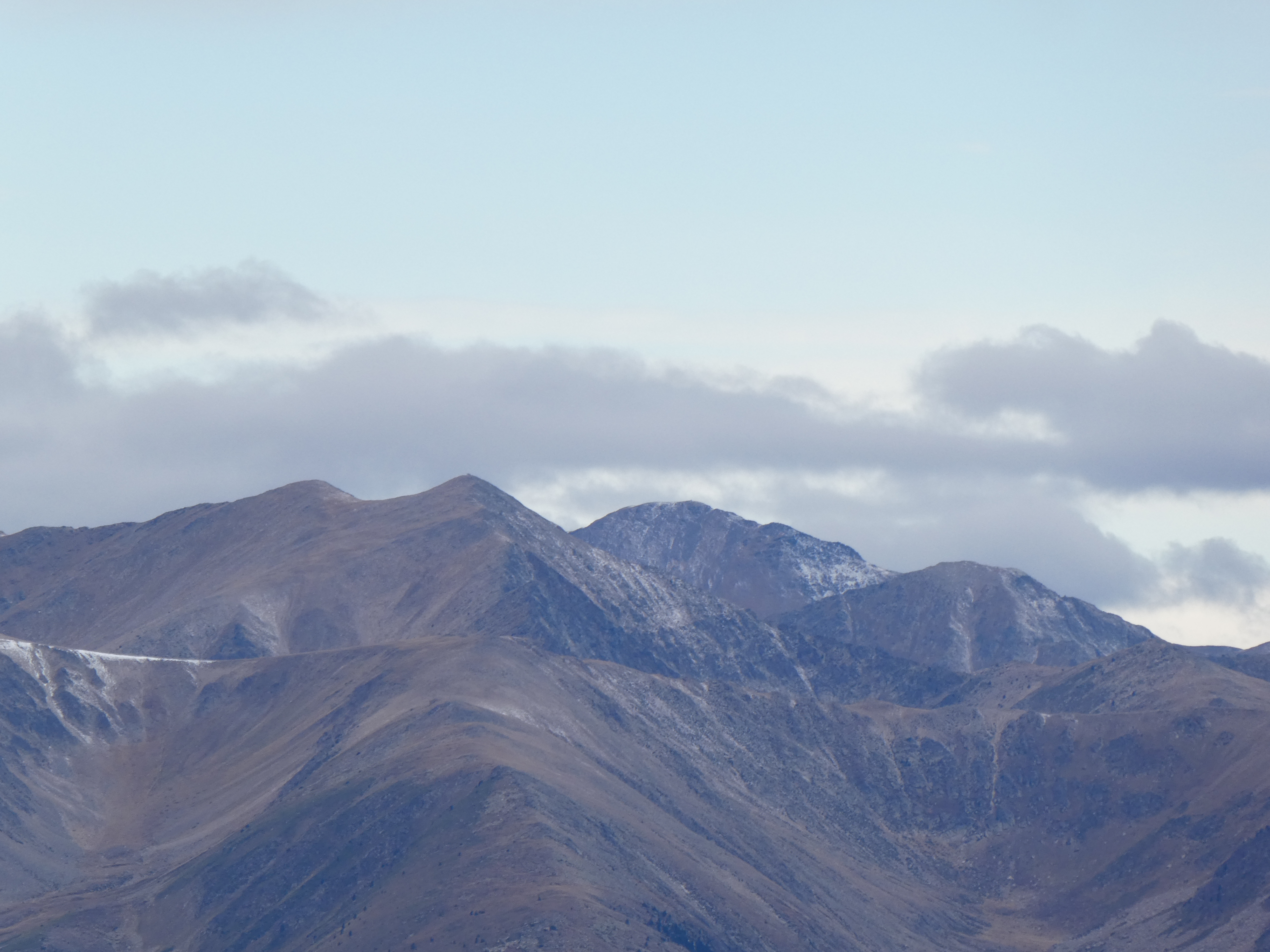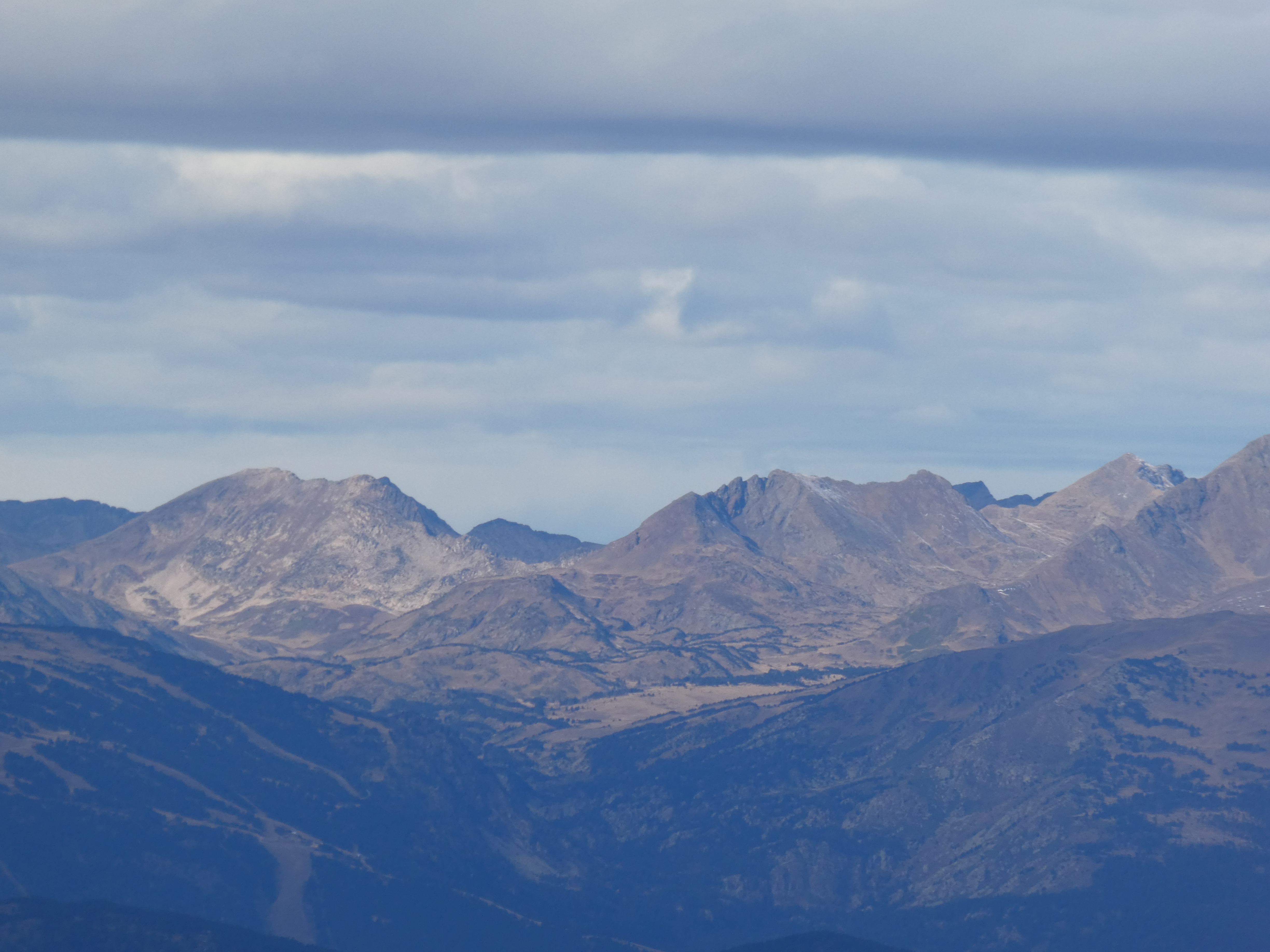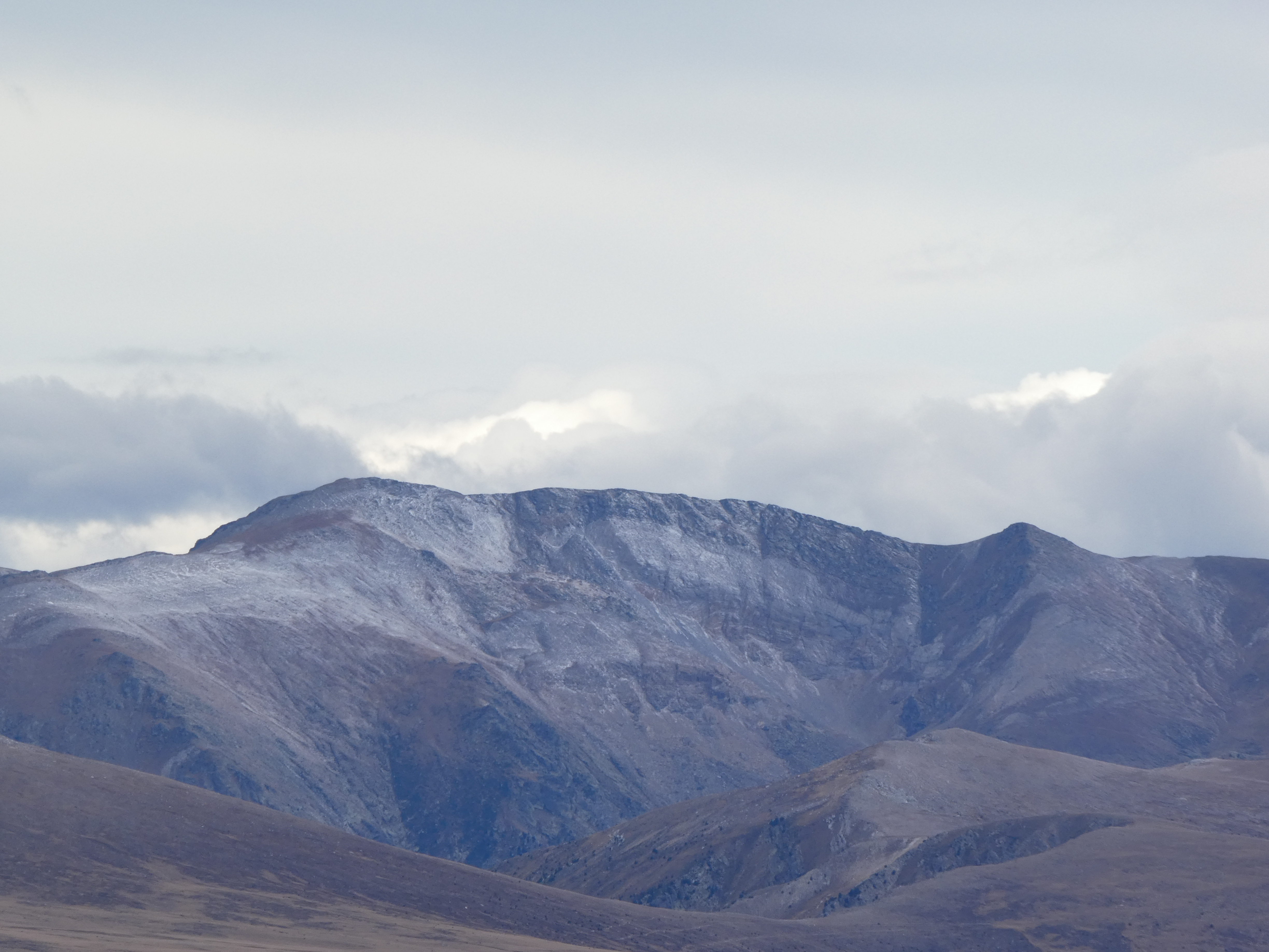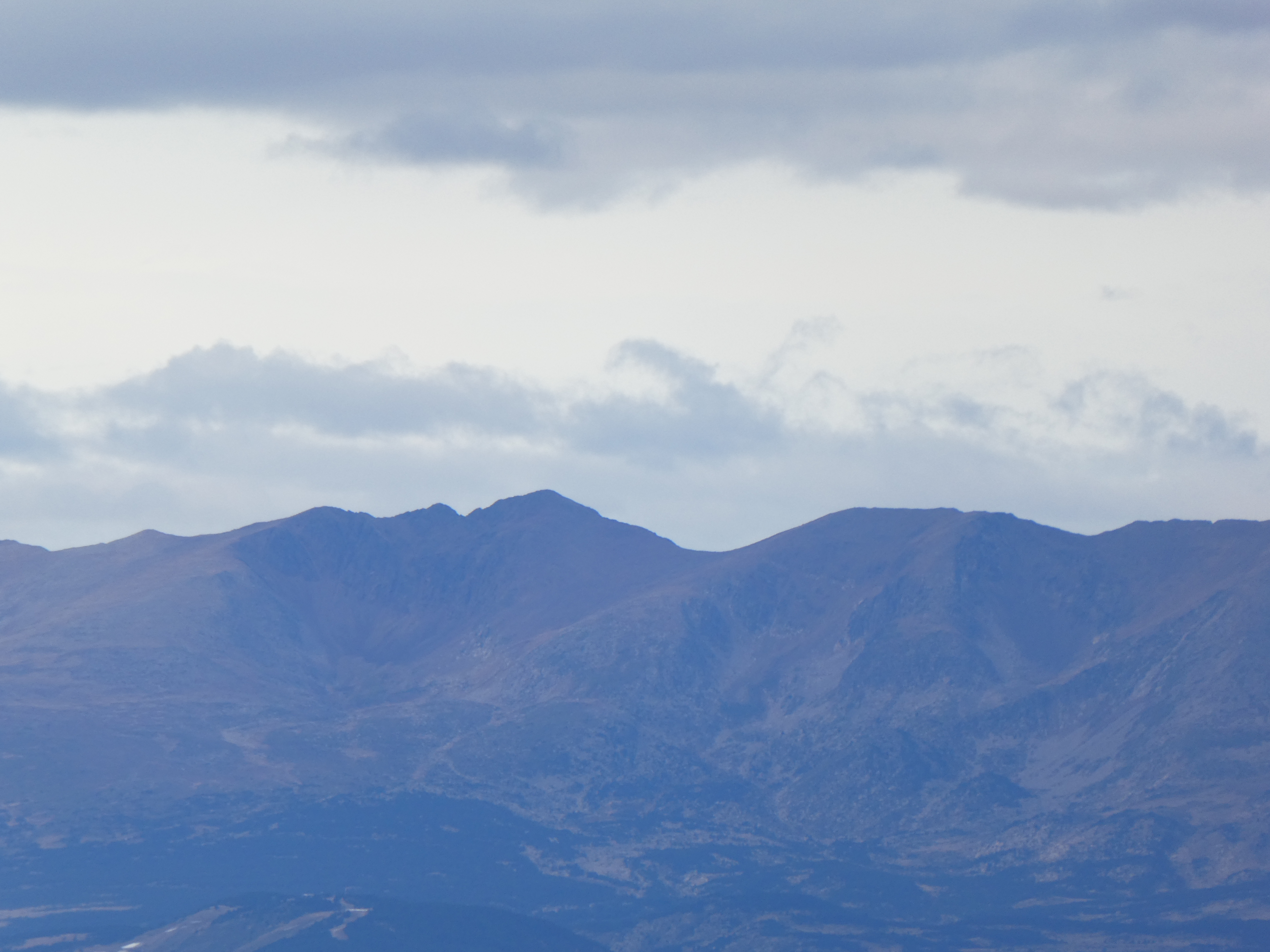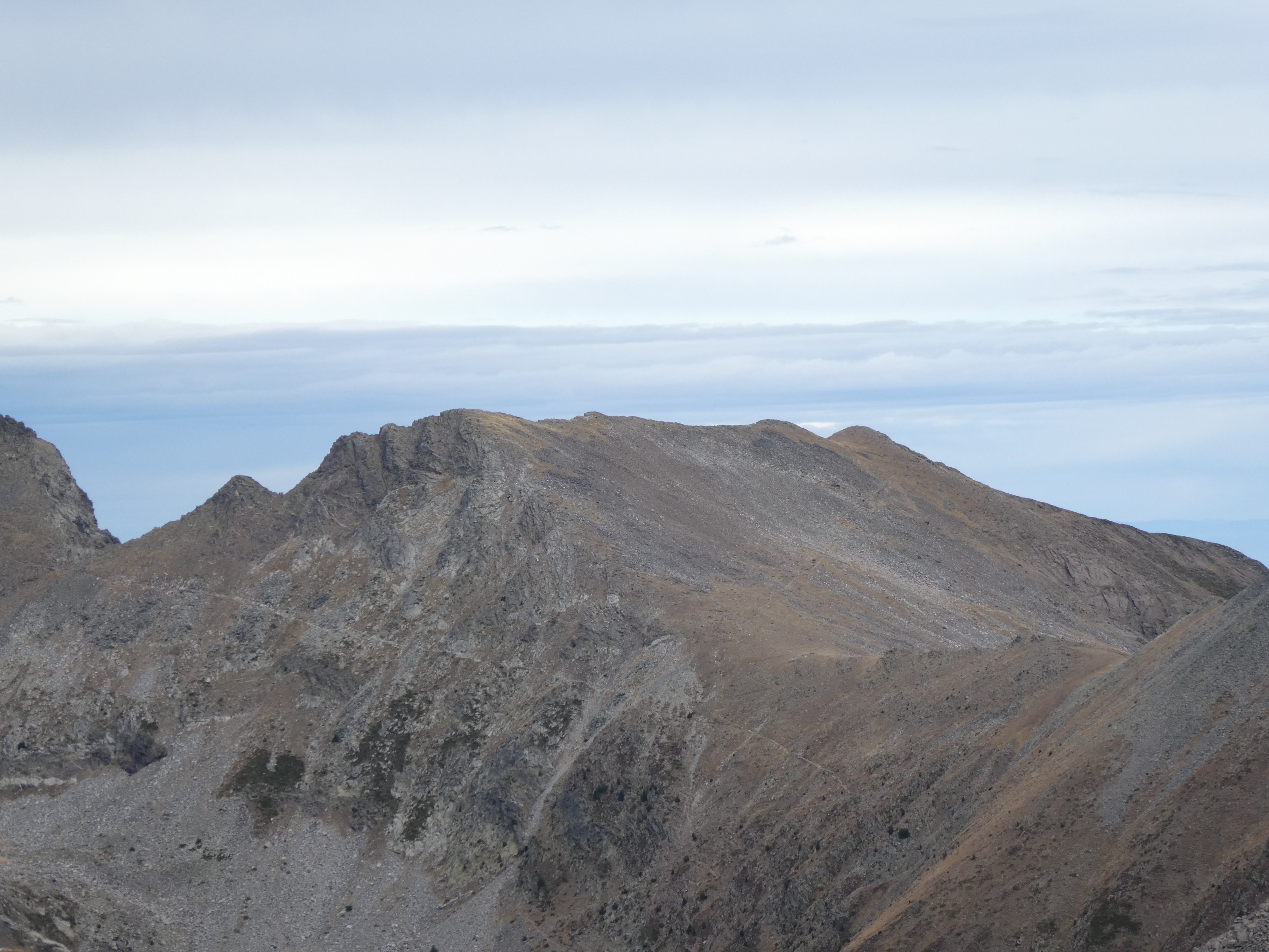 Zoom sur le Torreneules (2713 m) à gauche, le Gra de Fajol (2714 m) et le Cim de la Coma del Clot (2739 m) au centre, et le Puigmal (2910 m) à droite dans les nuages
