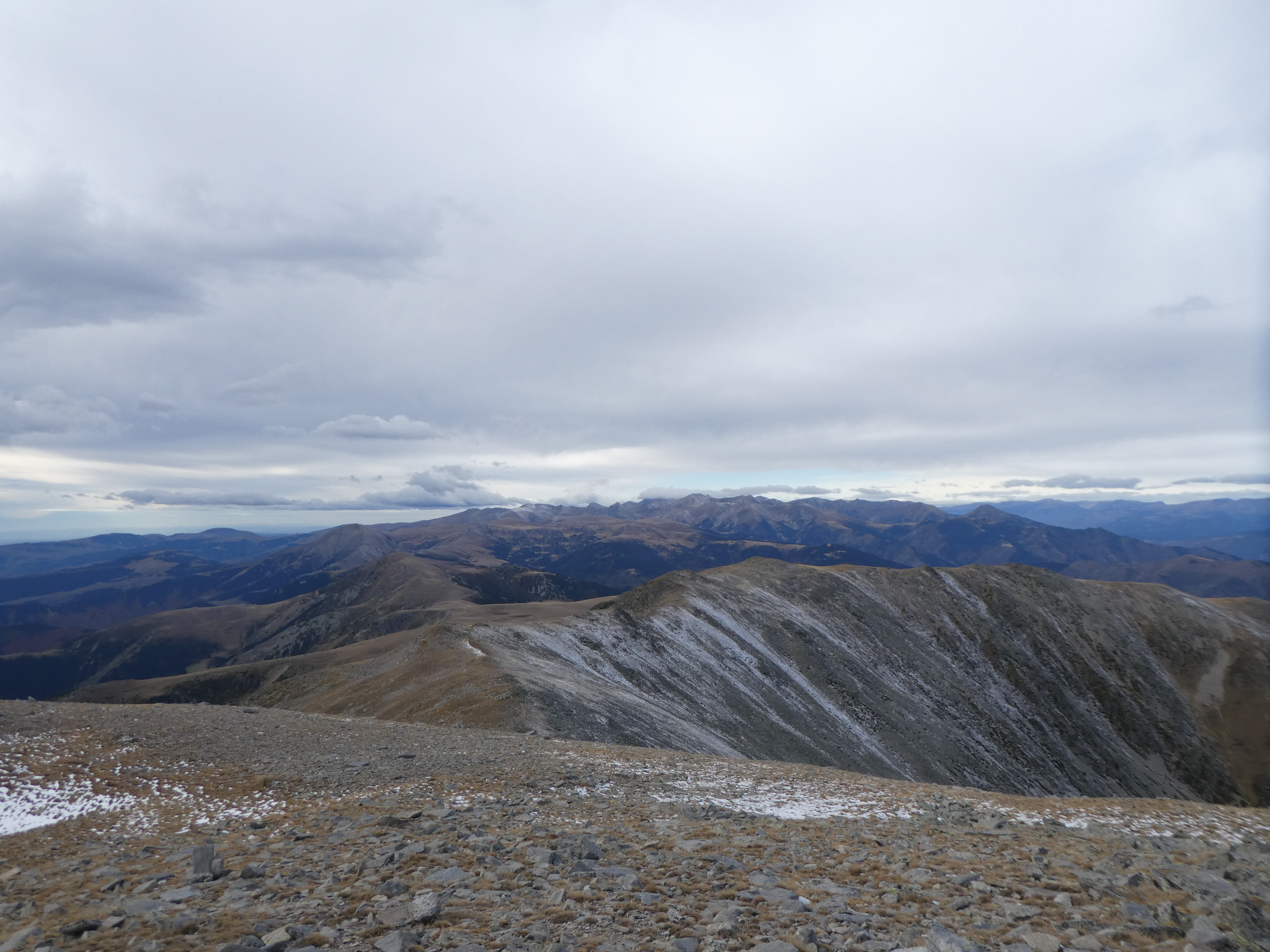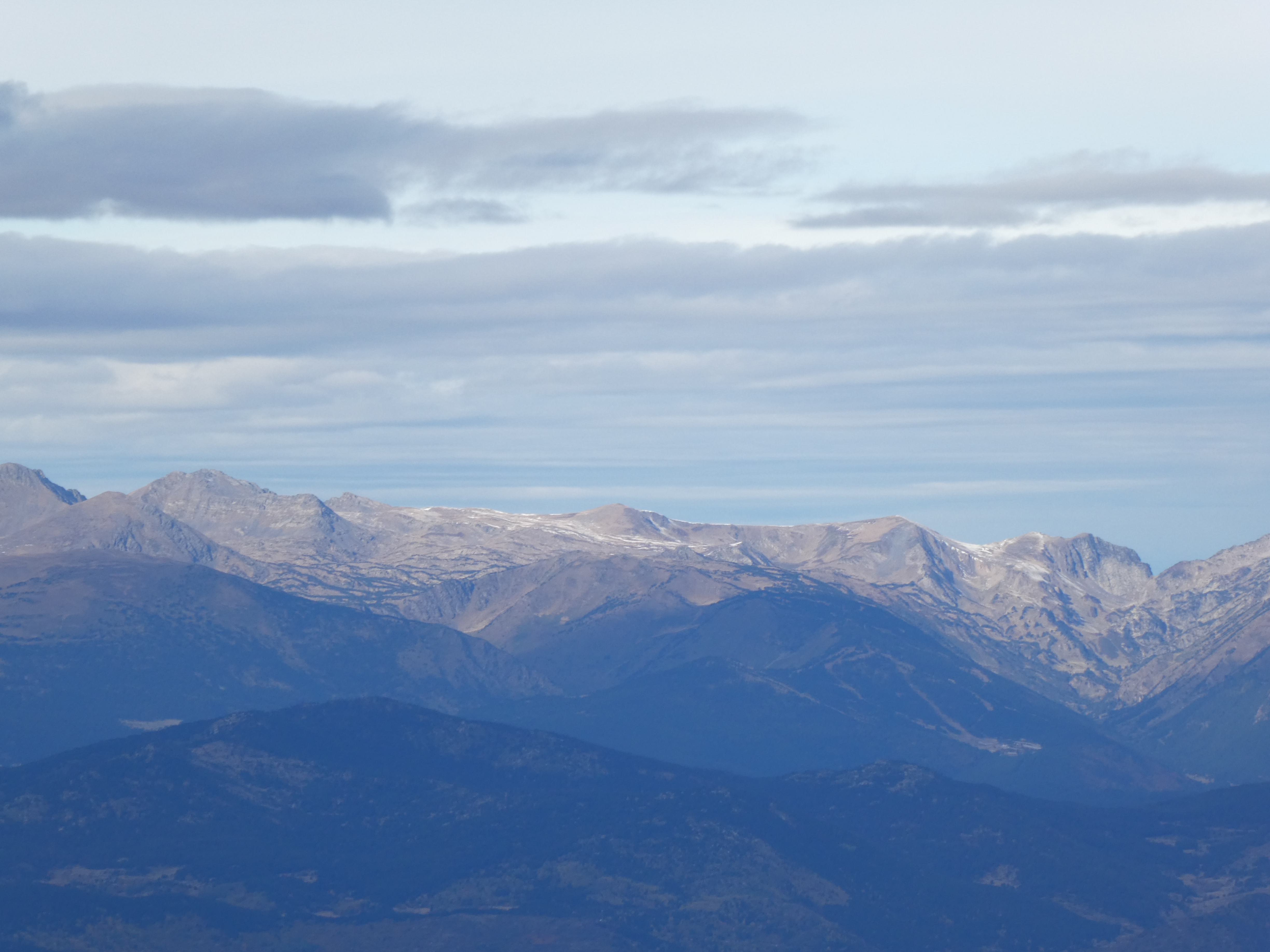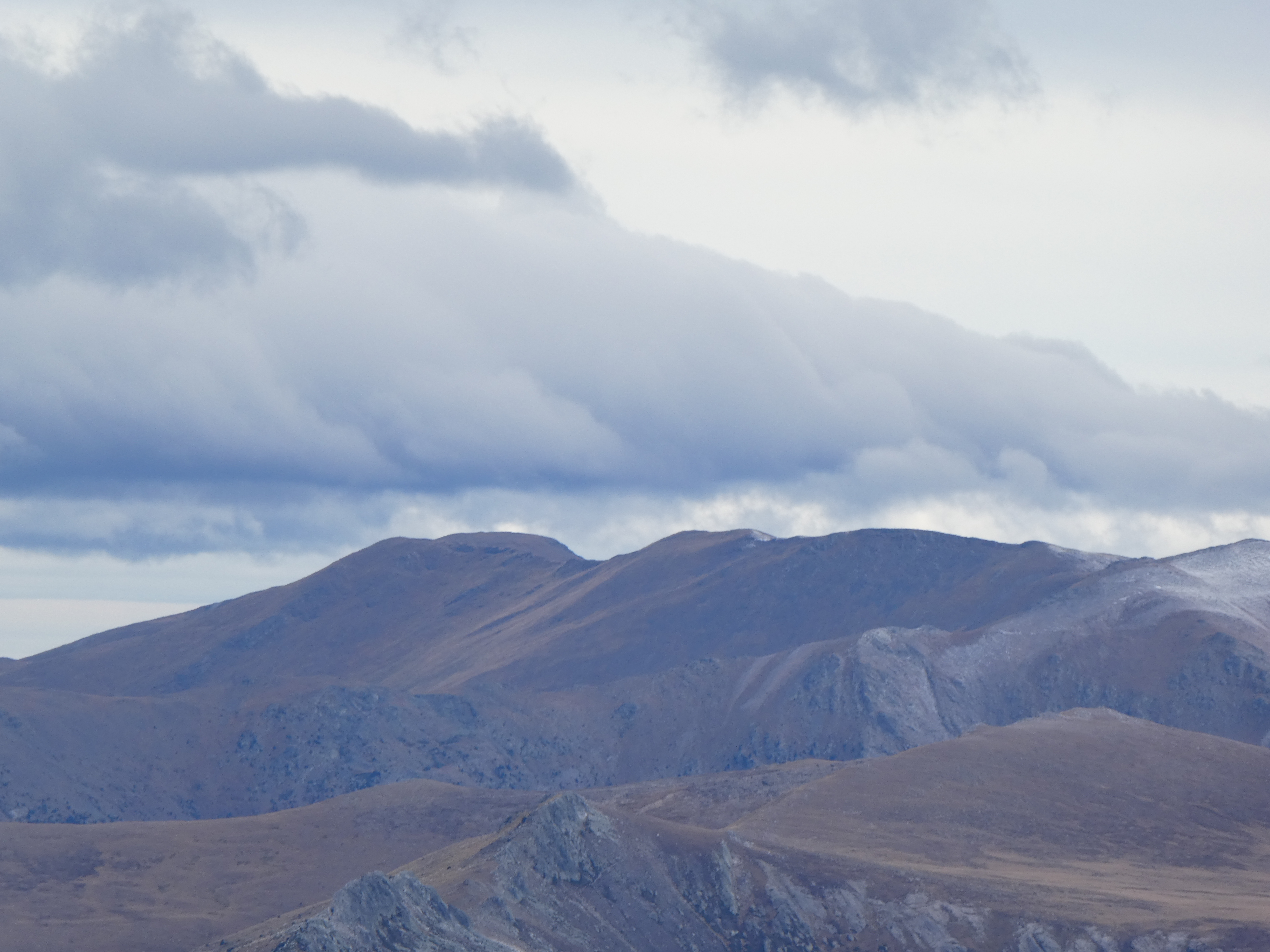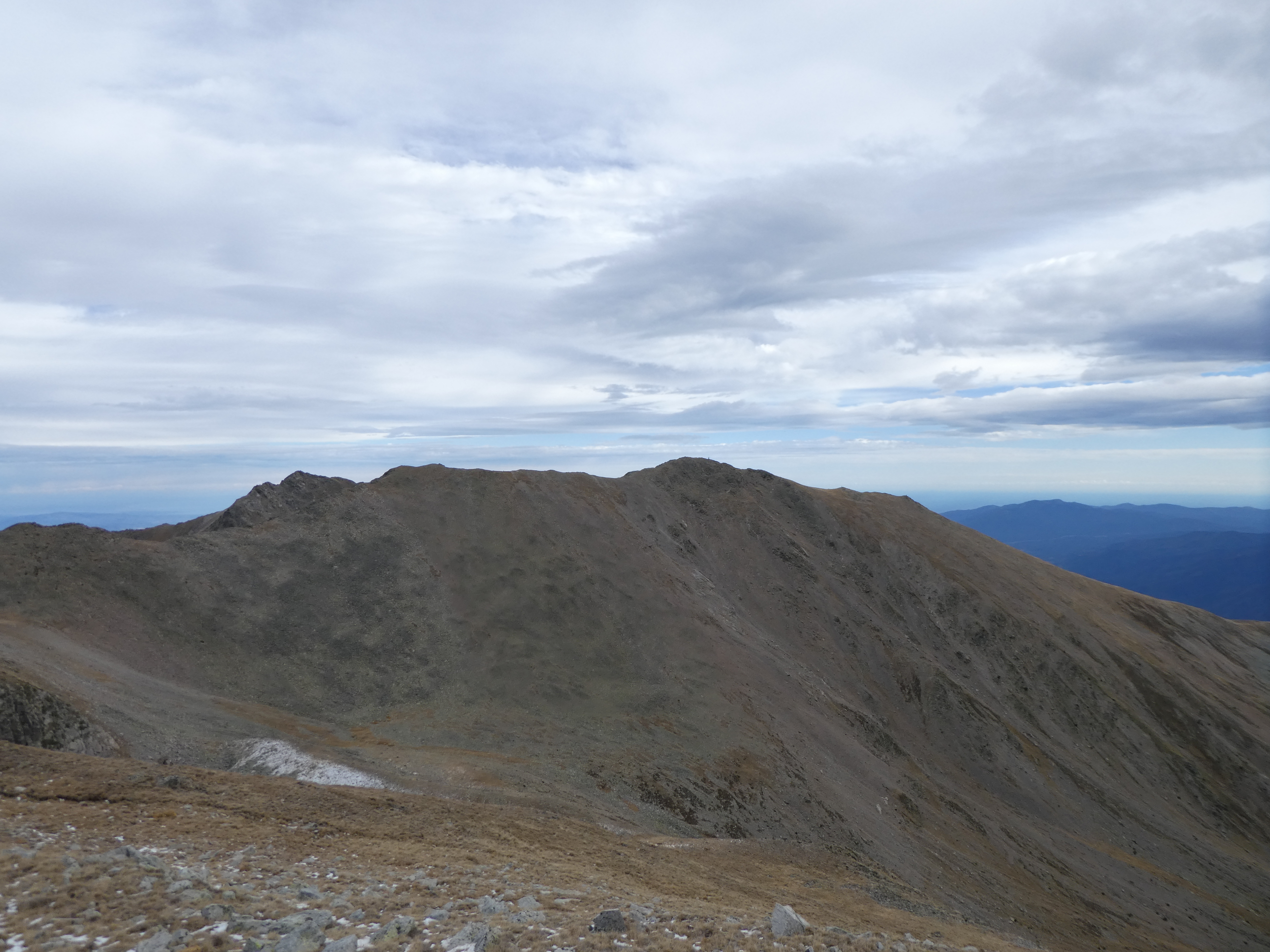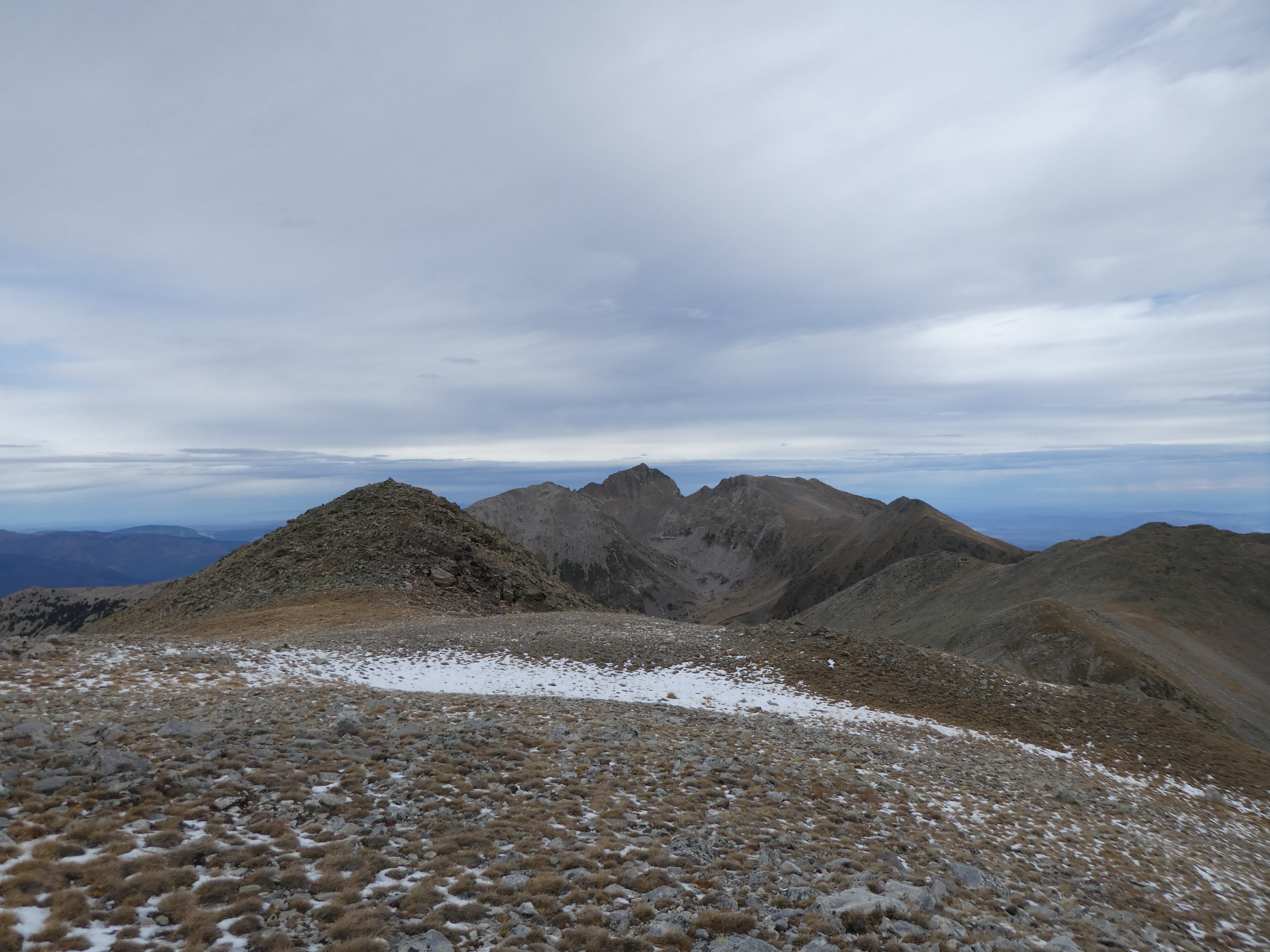 Zoom sur le Torreneules (2713 m) à gauche, le Gra de Fajol (2714 m) et le Cim de la Coma del Clot (2739 m) au centre, et le Puigmal (2910 m) à droite dans les nuages
