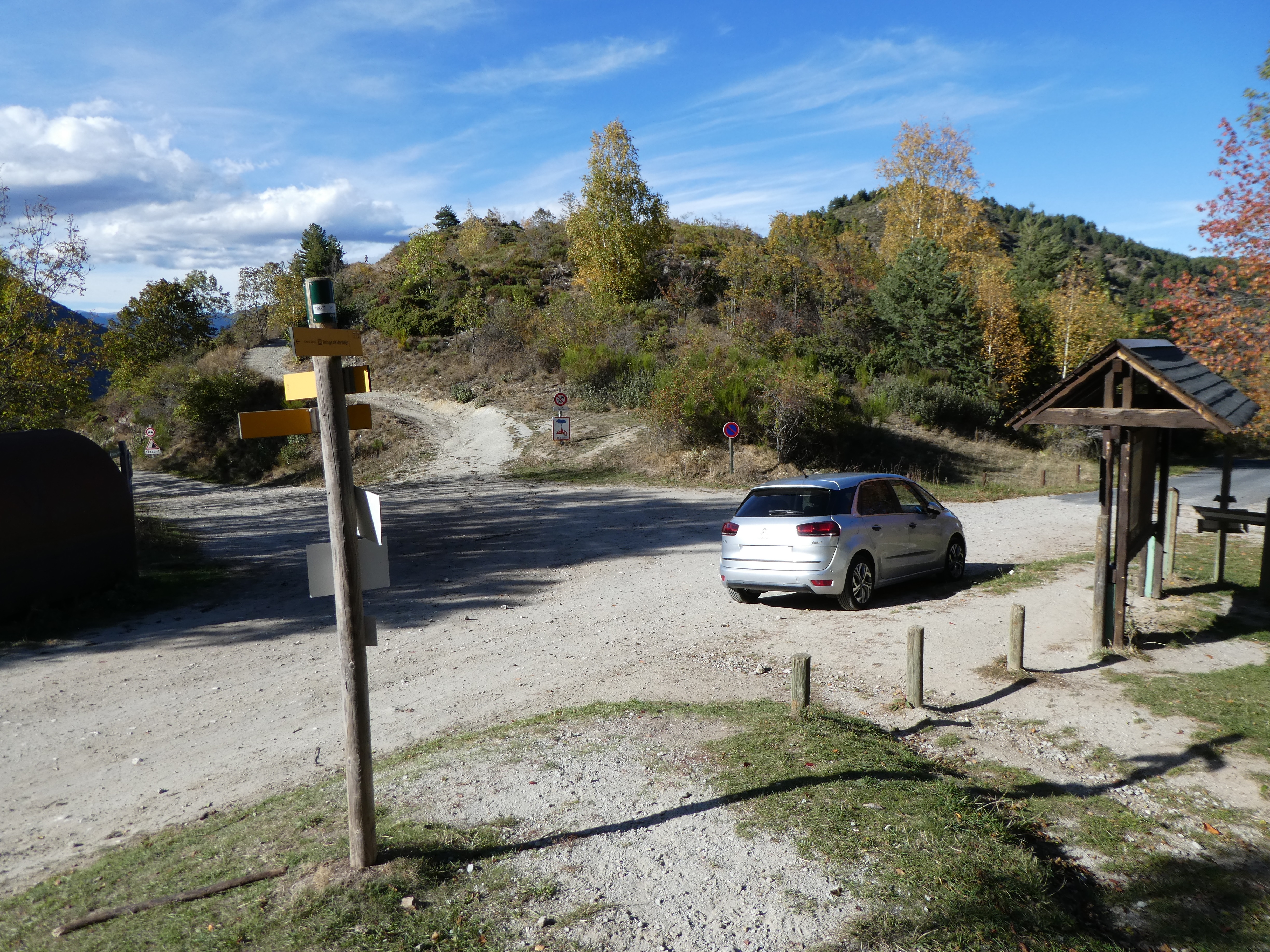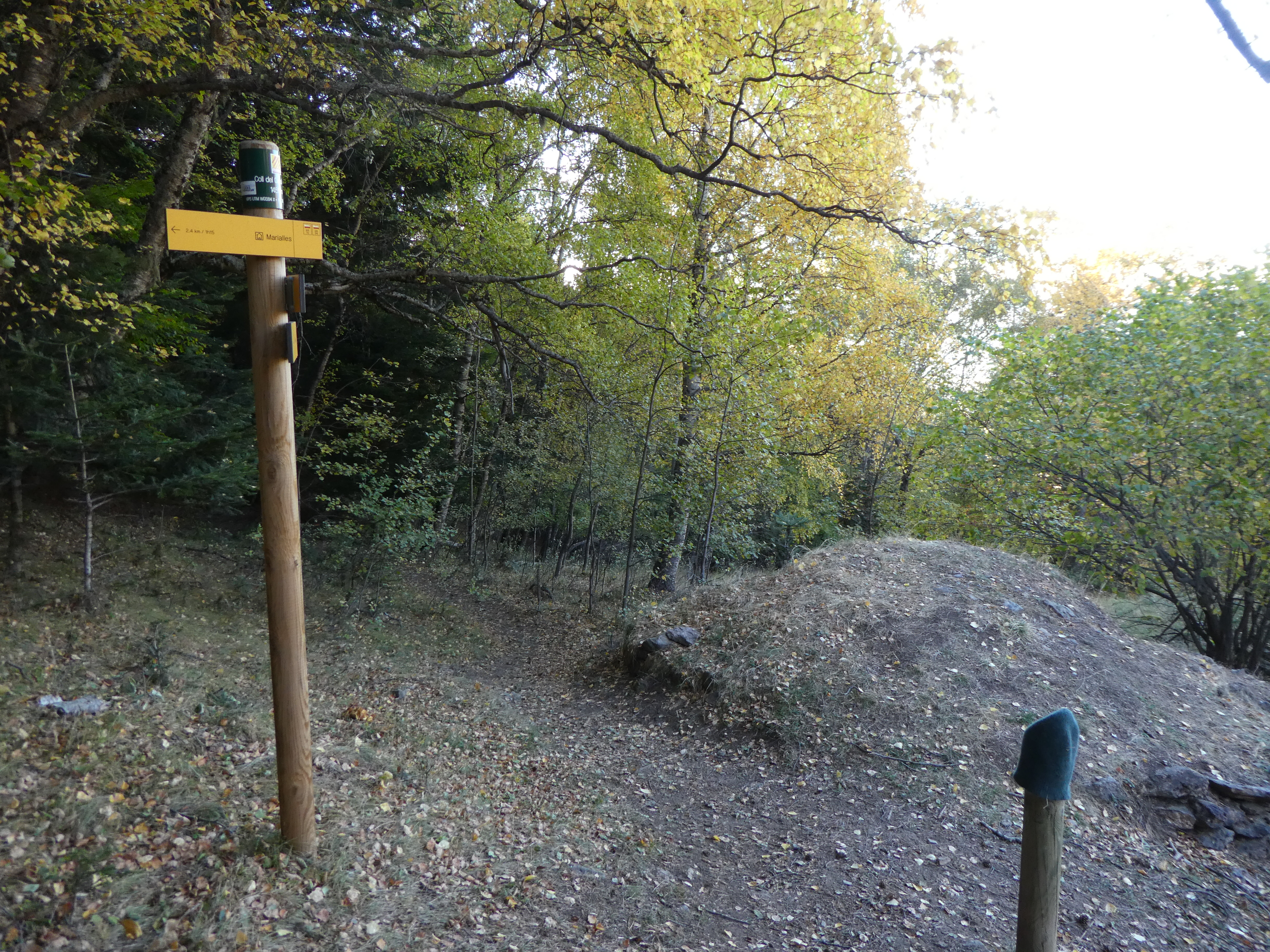 A ce croisement marqué par la présence d'un panneau directionnel (1500 mètres après le lieu-dit "Mariailles"), suivre le chemin partant tout droit direction Coll de Jou, balisé en rouge et blanc