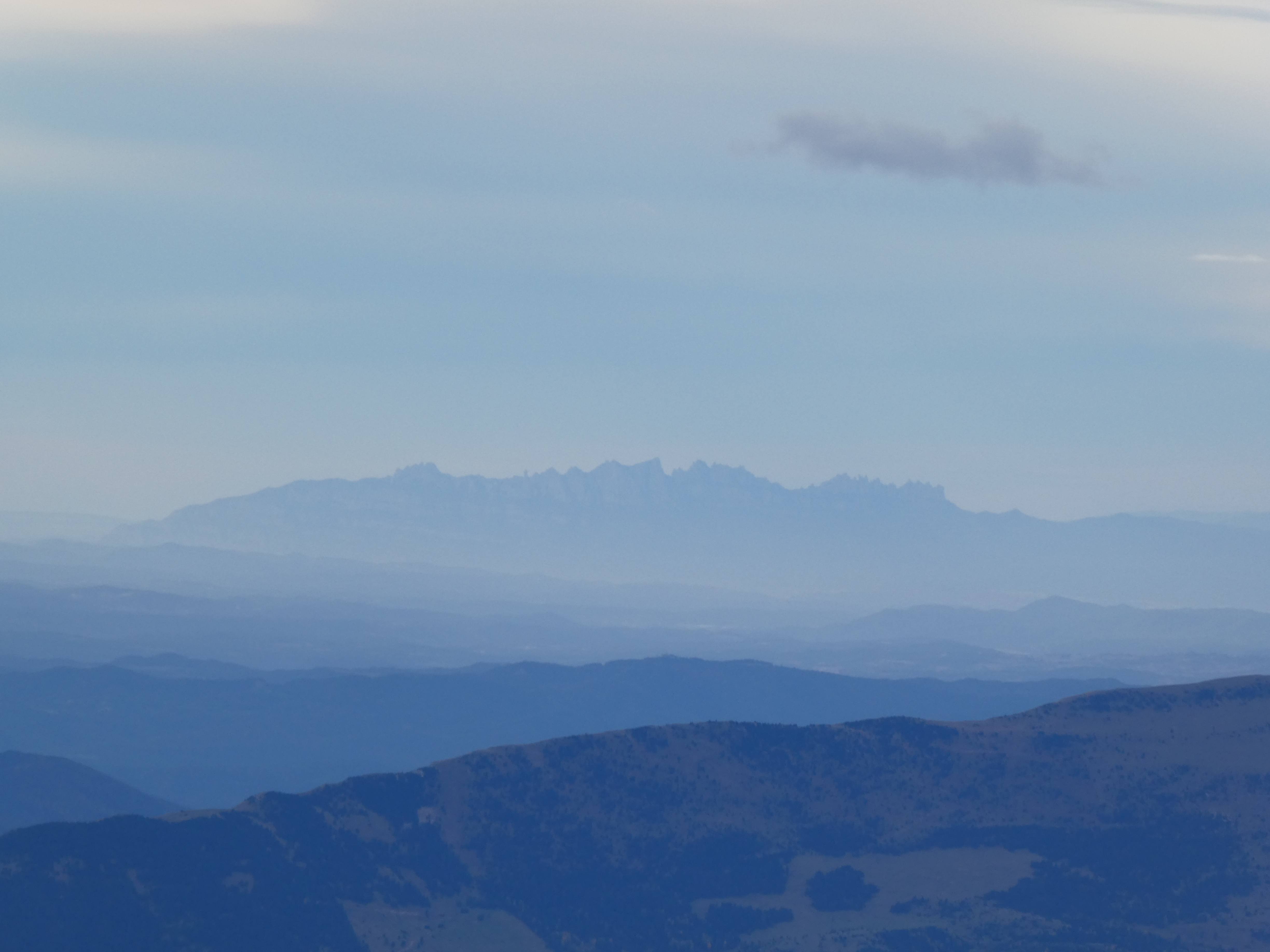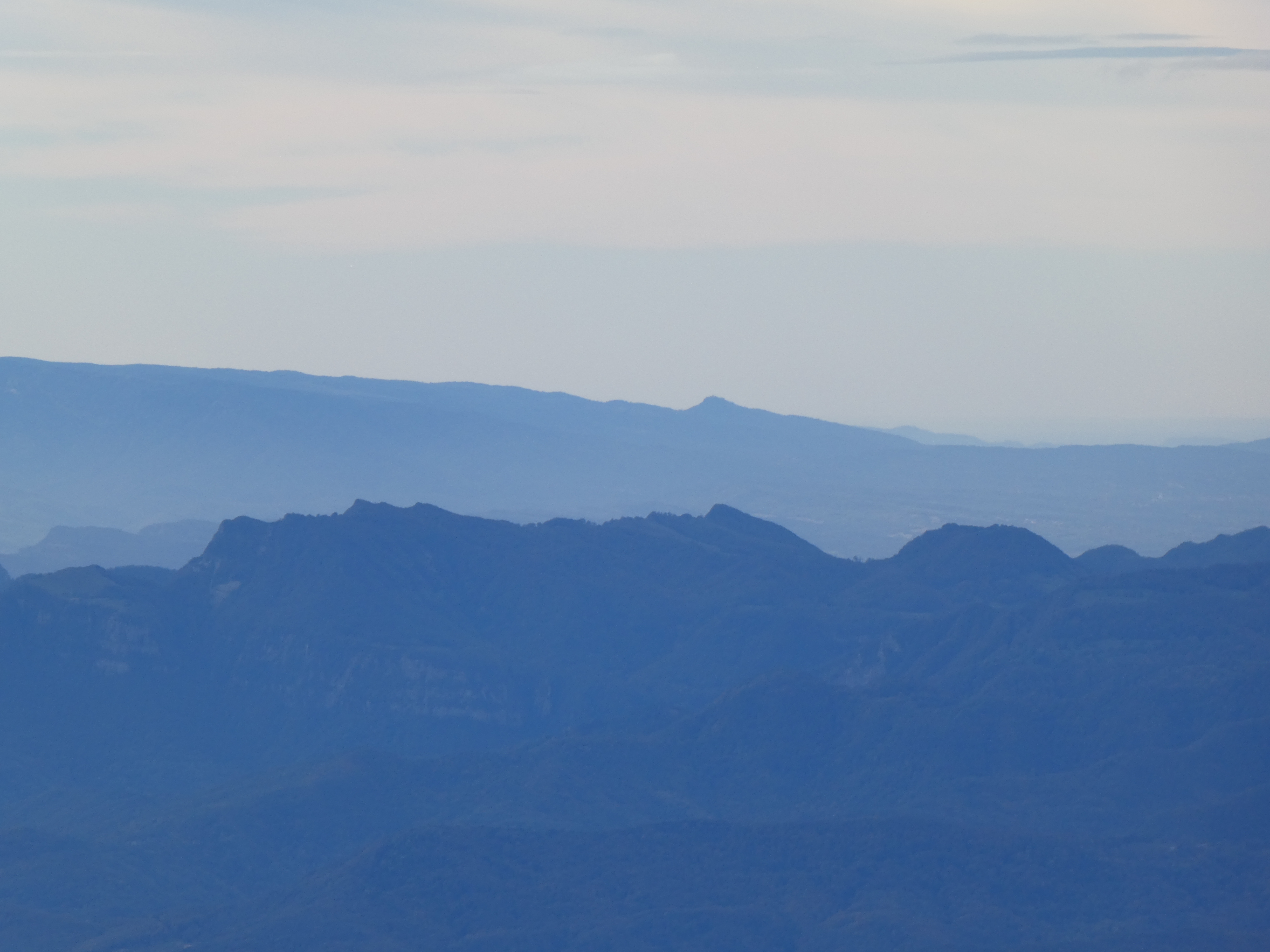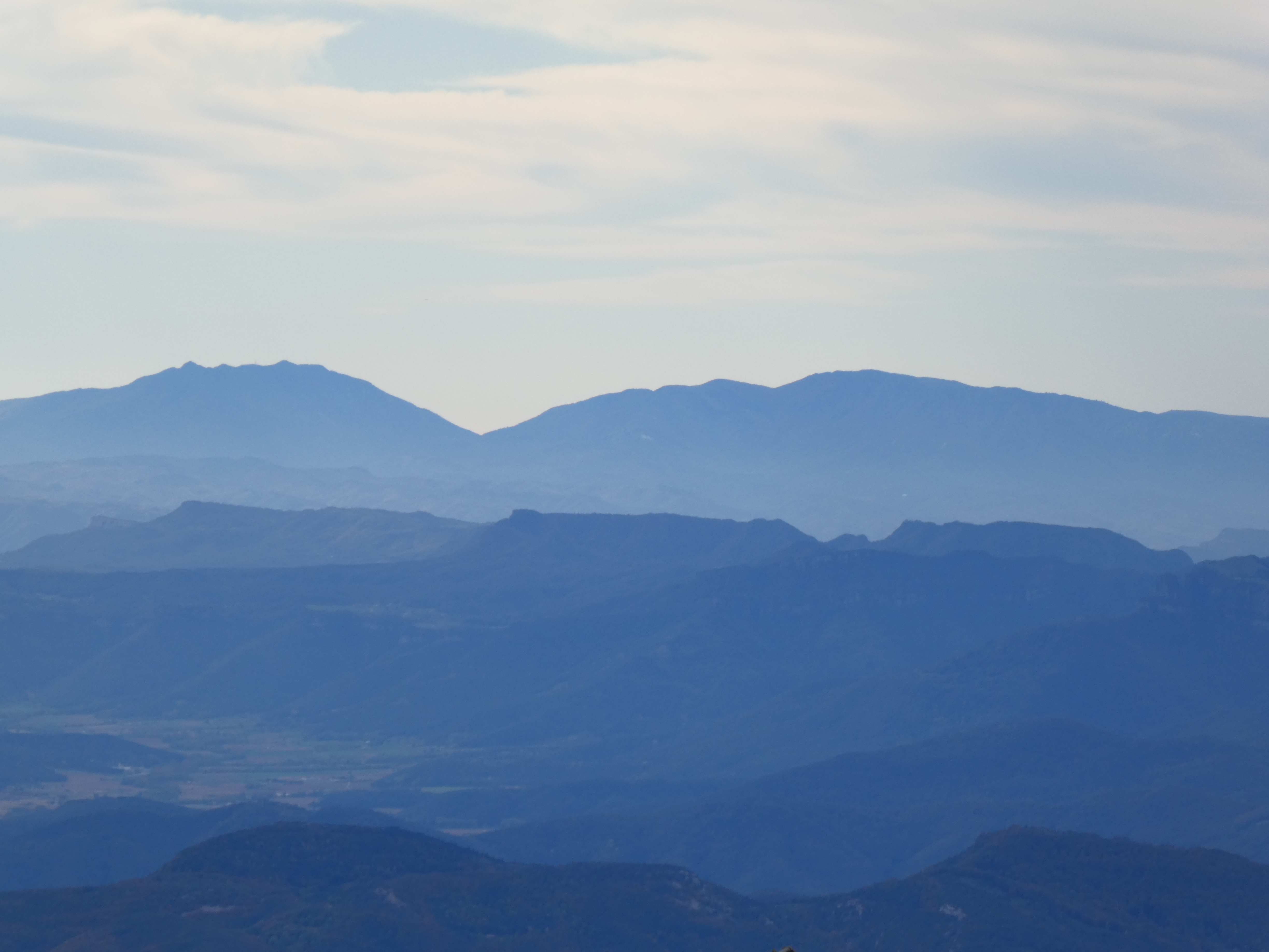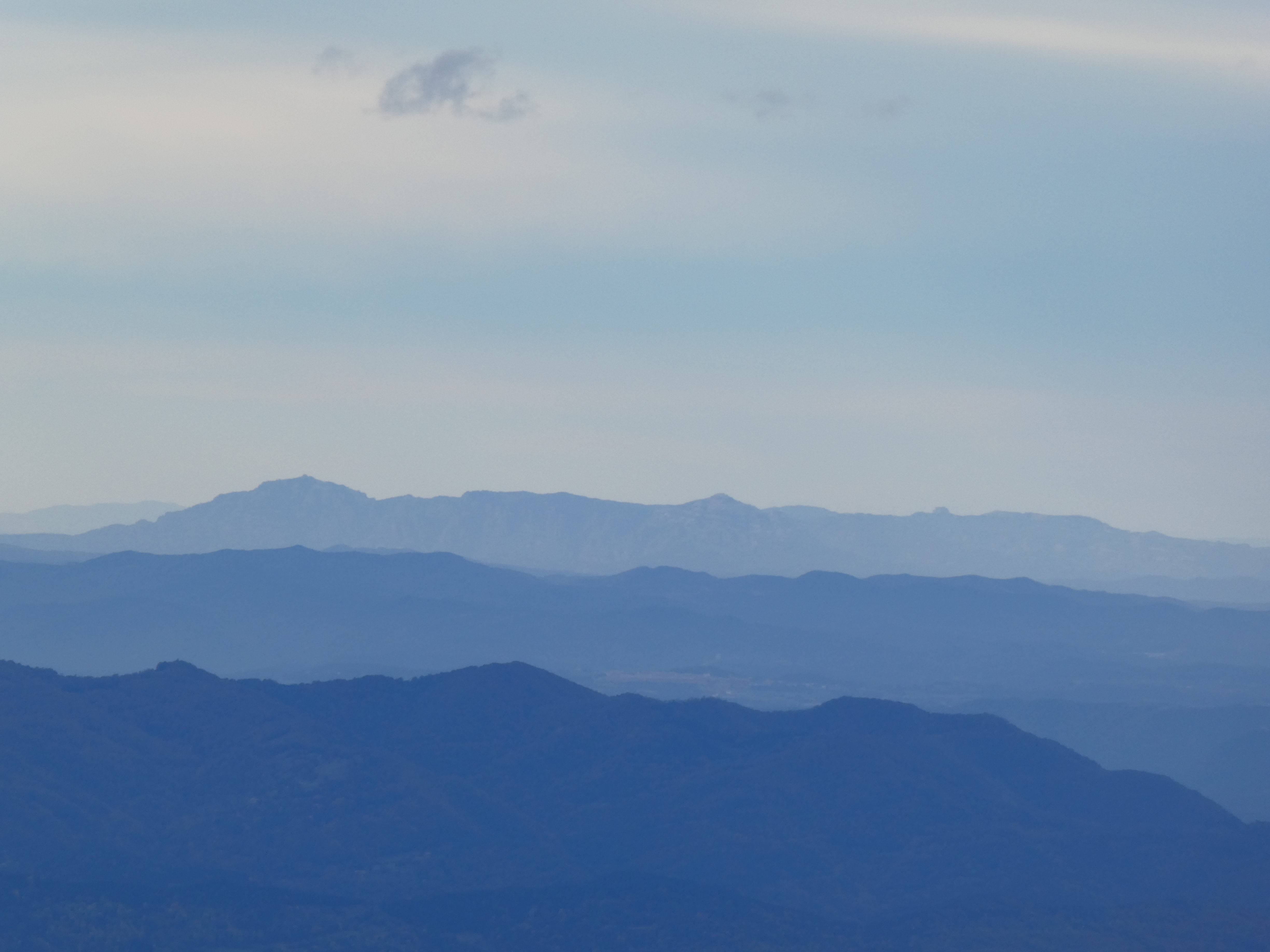 Zoom sur le Puig de Cortils (1196 m) à gauche, Aiats (1311 m) et le Puig Flabiol (1281 m) au centre, et Cabrera (1307 m) à droite ... en arrière-plan, on aperçoit le massif du Montseny avec le Turó de l'Home (1706 m) à gauche et Matagalls (1697 m) à droite
