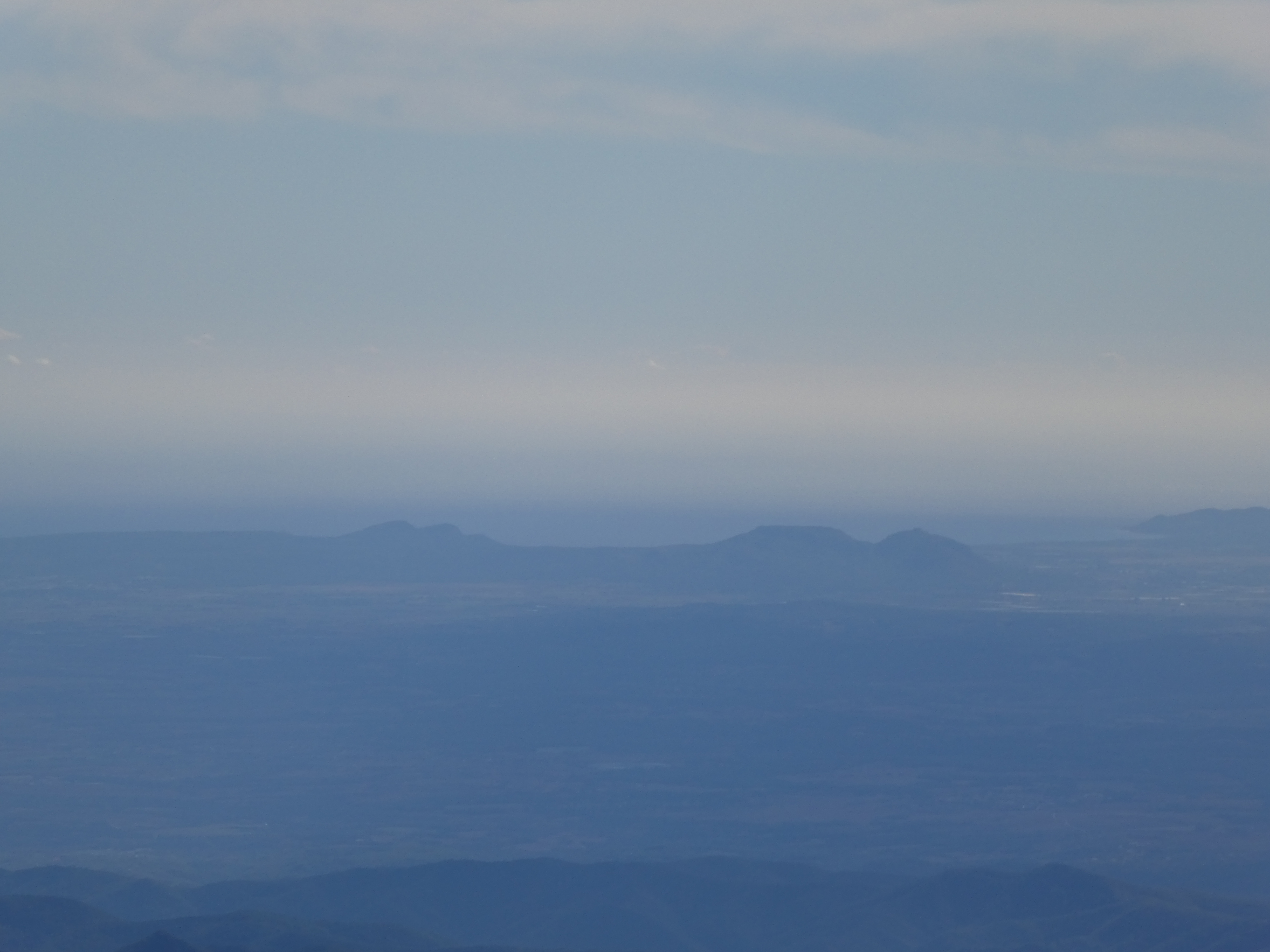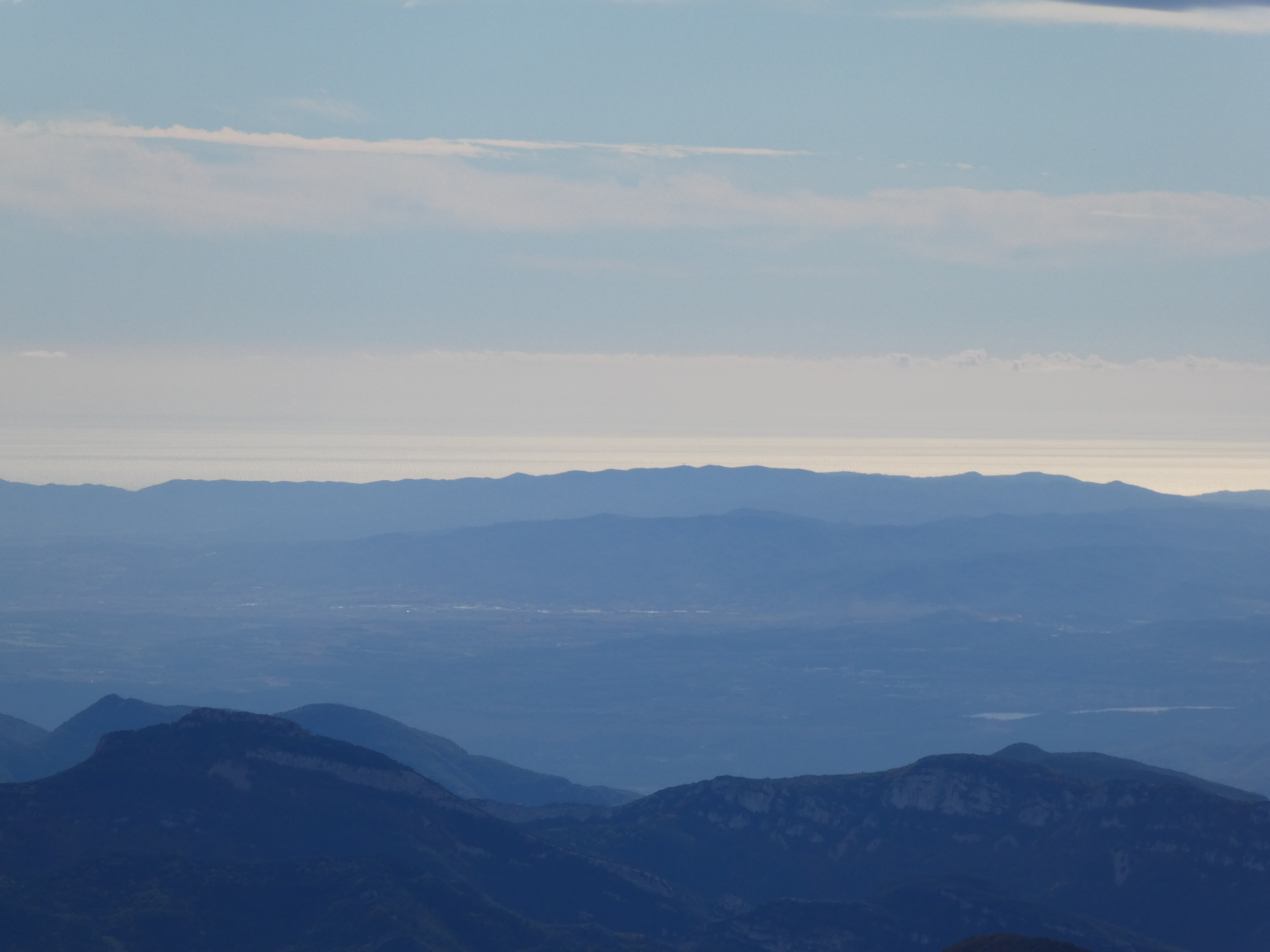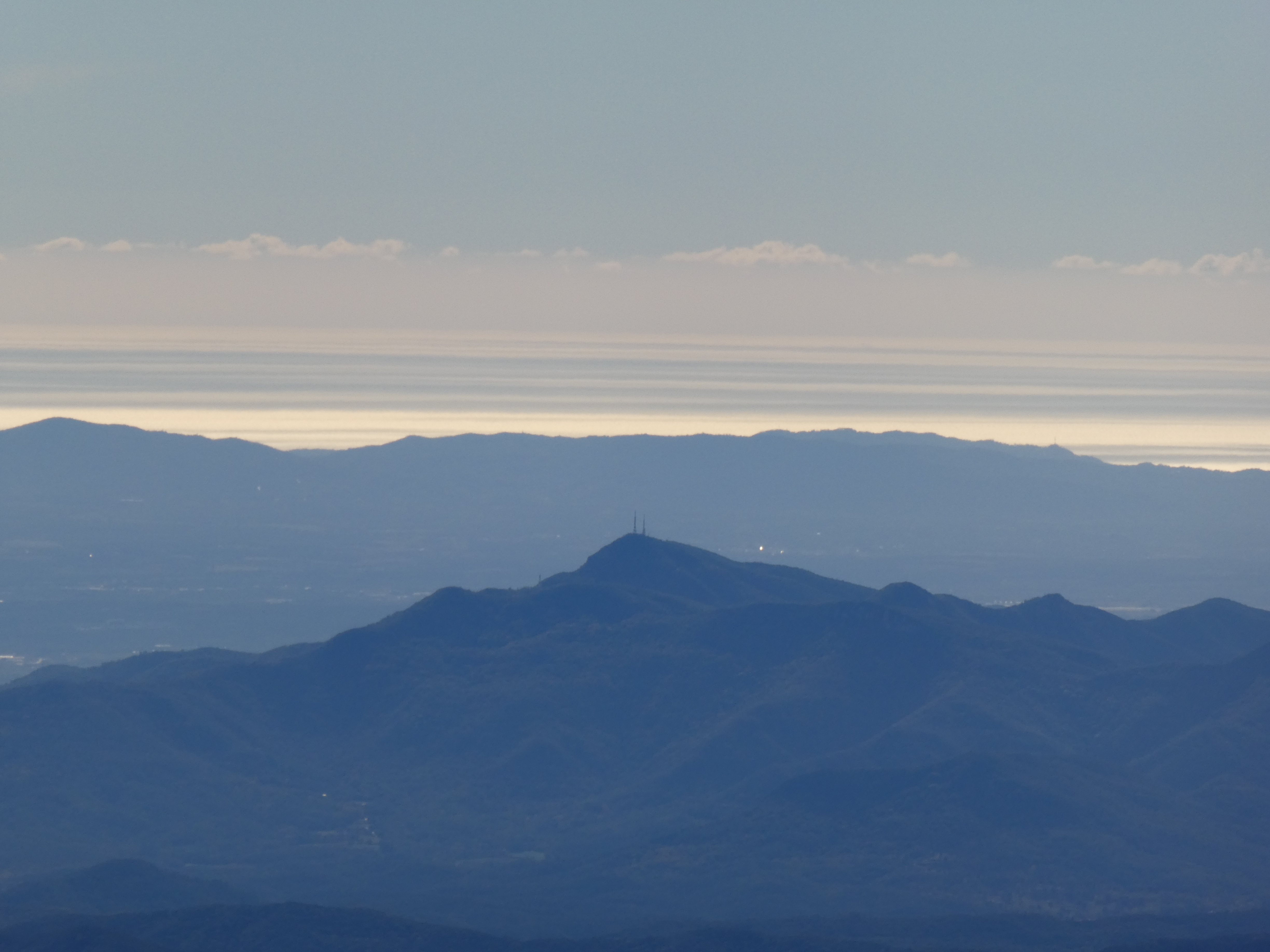 Zoom sur le Puig de Cortils (1196 m) à gauche, Aiats (1311 m) et le Puig Flabiol (1281 m) au centre, et Cabrera (1307 m) à droite ... en arrière-plan, on aperçoit le massif du Montseny avec le Turó de l'Home (1706 m) à gauche et Matagalls (1697 m) à droite