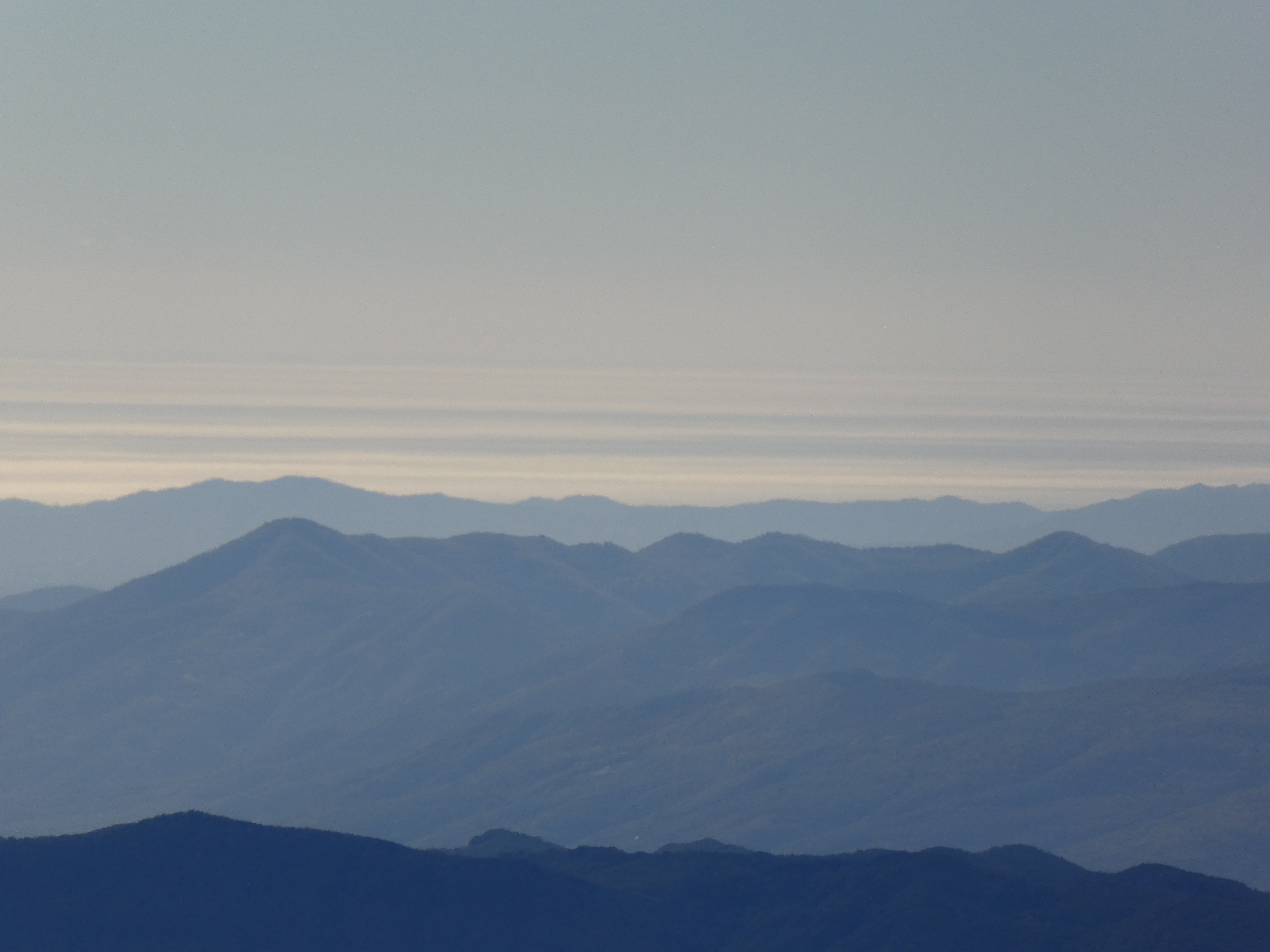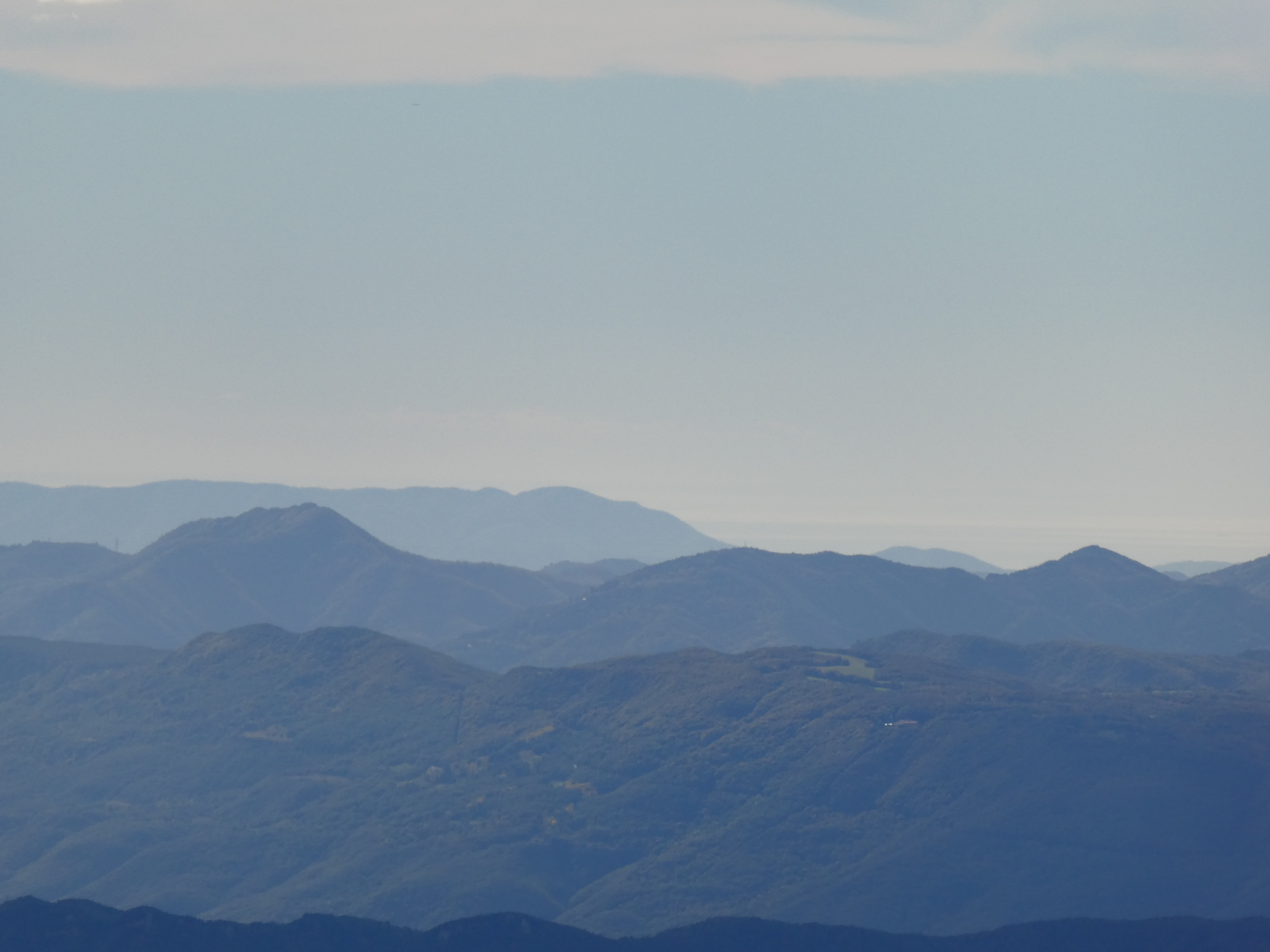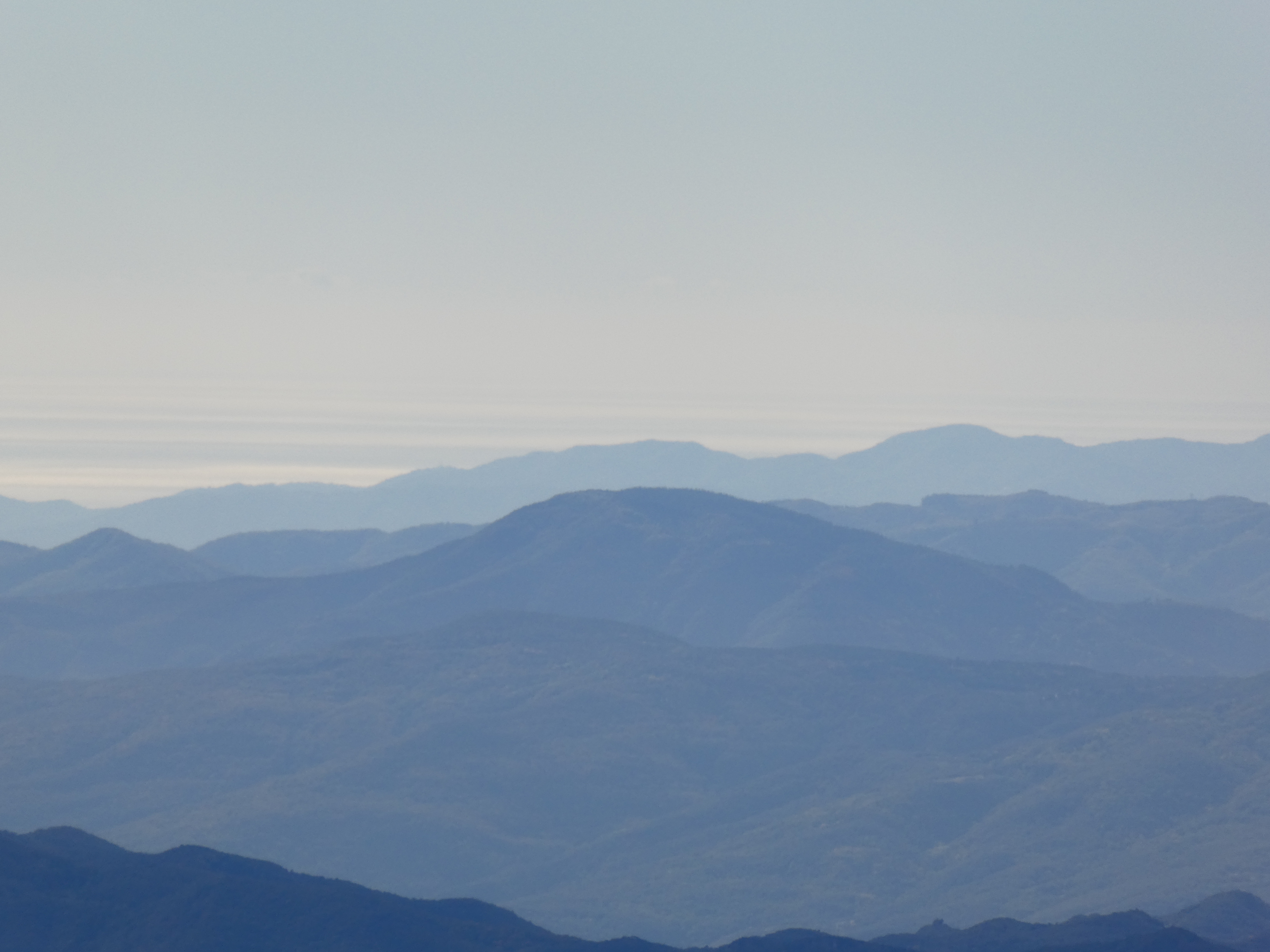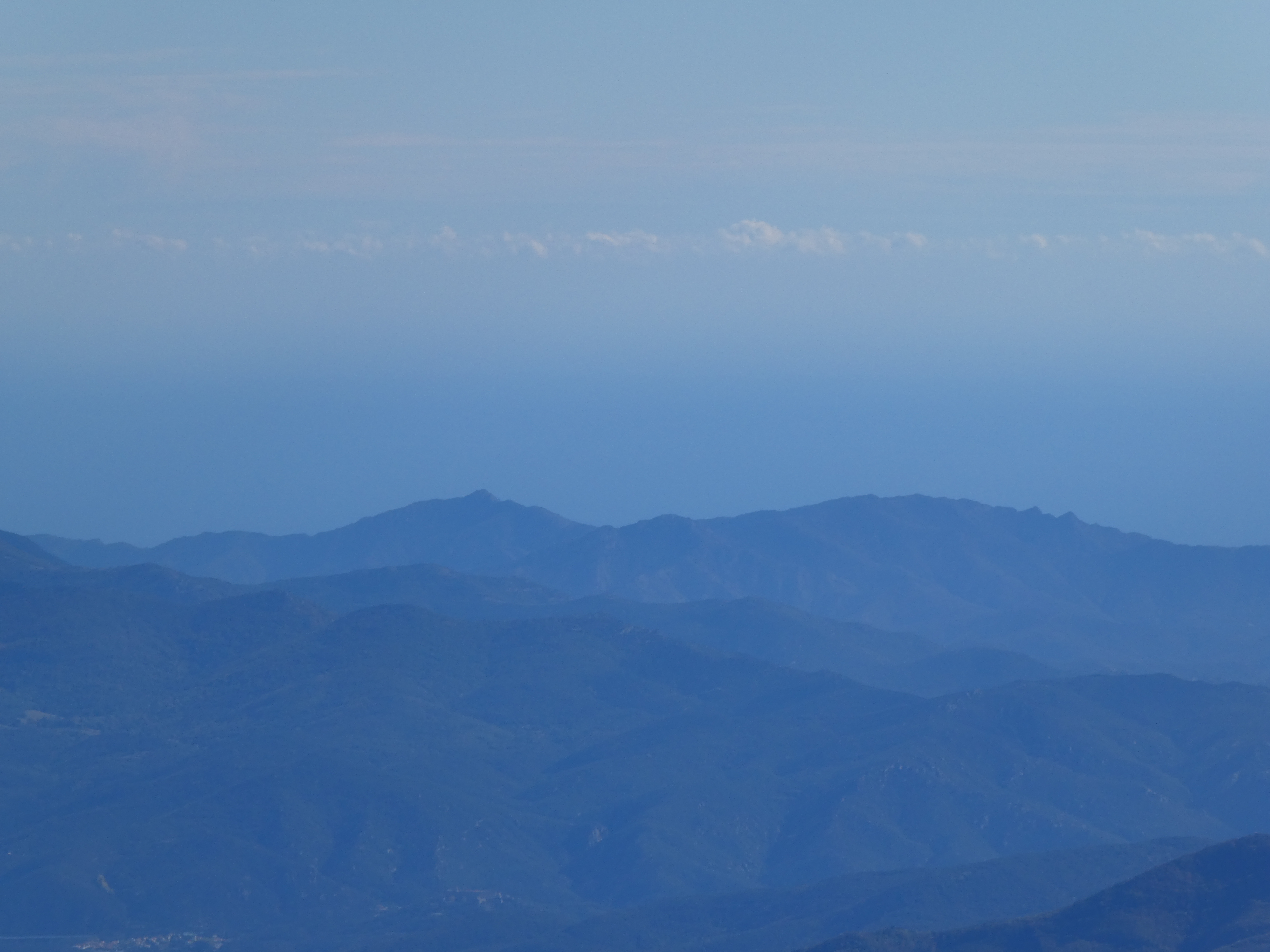 Zoom sur le Puig de Cortils (1196 m) à gauche, Aiats (1311 m) et le Puig Flabiol (1281 m) au centre, et Cabrera (1307 m) à droite ... en arrière-plan, on aperçoit le massif du Montseny avec le Turó de l'Home (1706 m) à gauche et Matagalls (1697 m) à droite