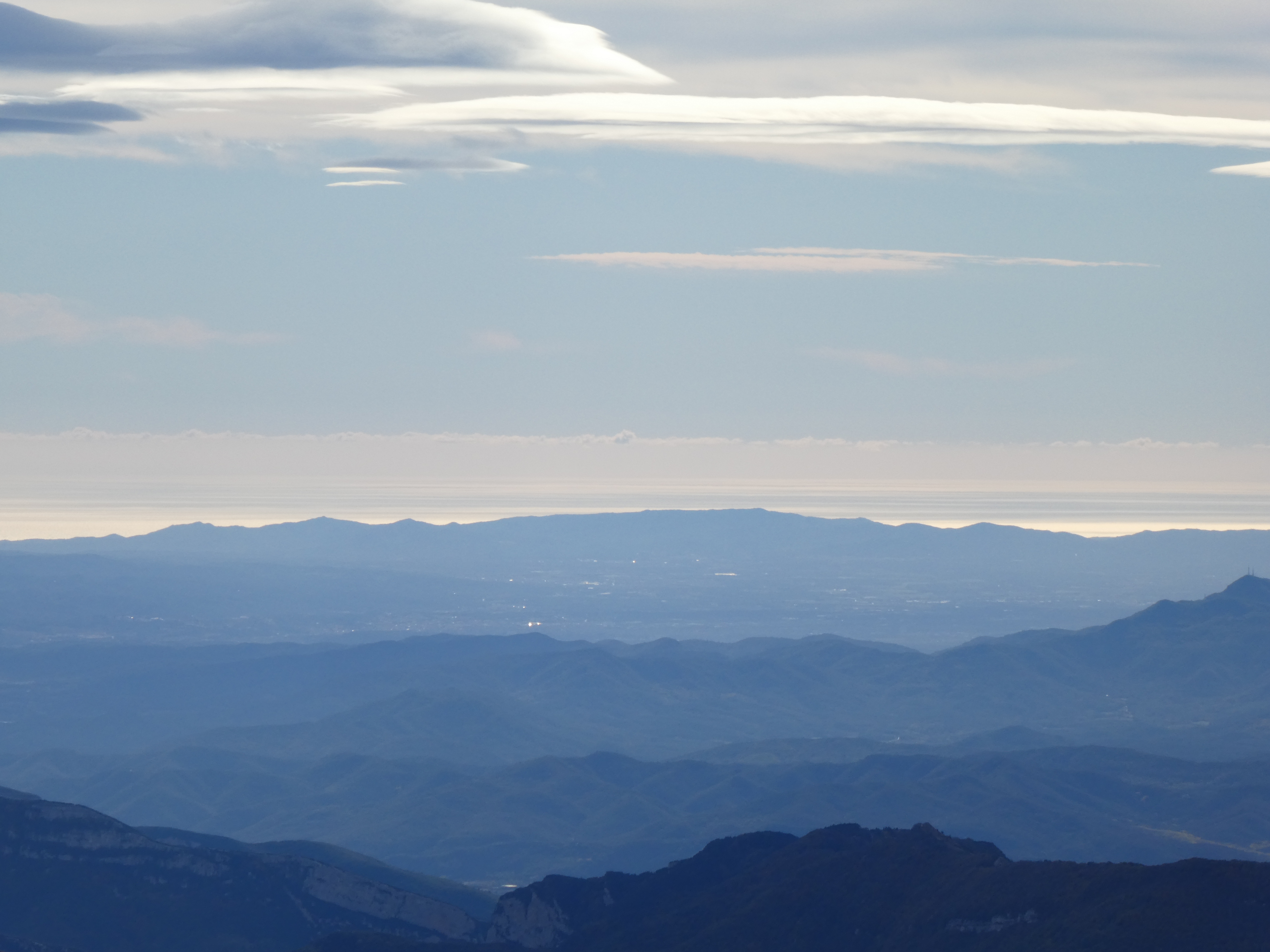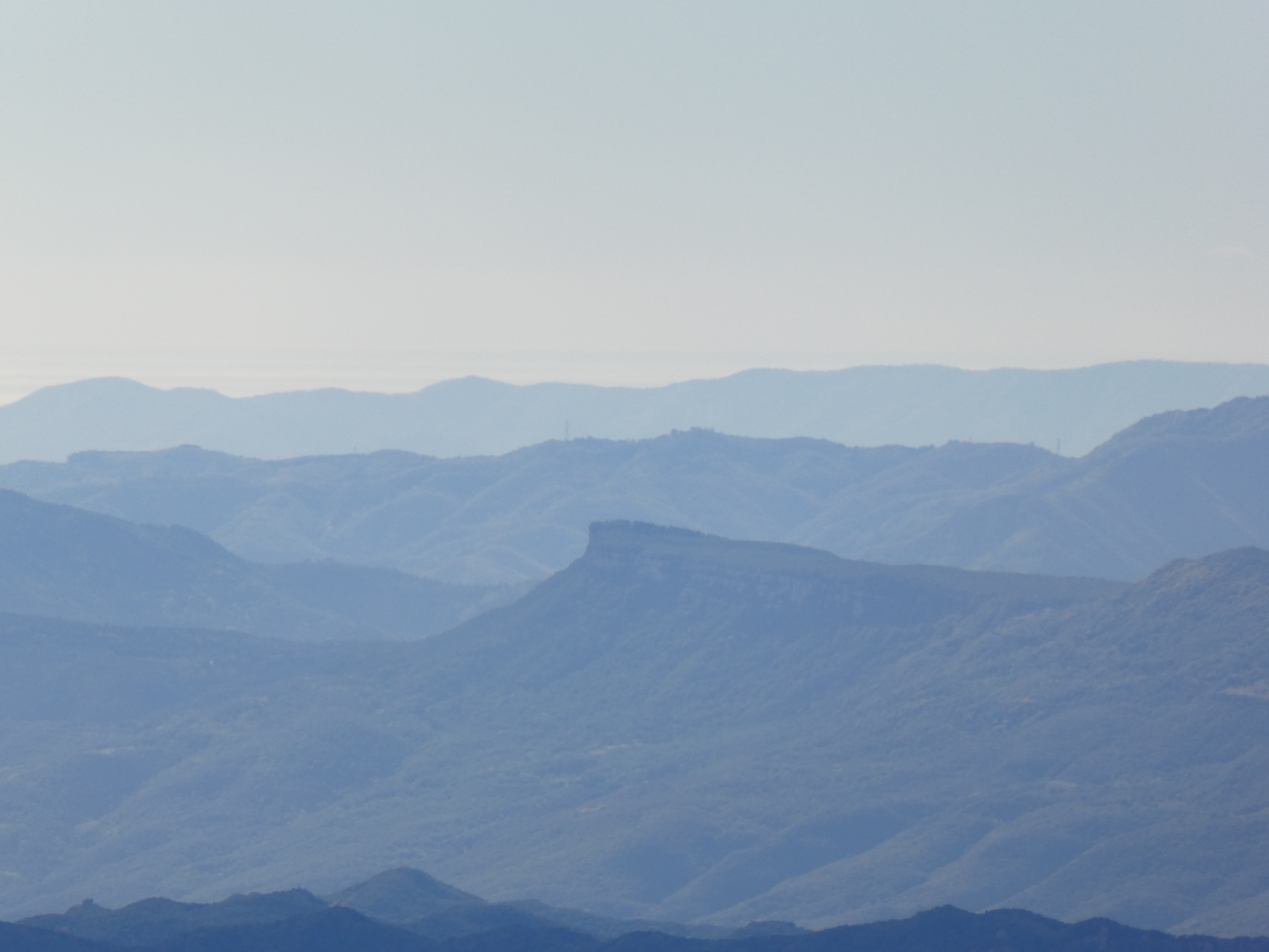 Zoom sur les sommets du Parc Natural de Sant Llorenç del Munt i l'Obac avec la Mola (1103 m) à gauche, le Montcau (1056 m) au centre et le Castellspaera (939 m) au centre-droit situés à environ 100 kilomètres