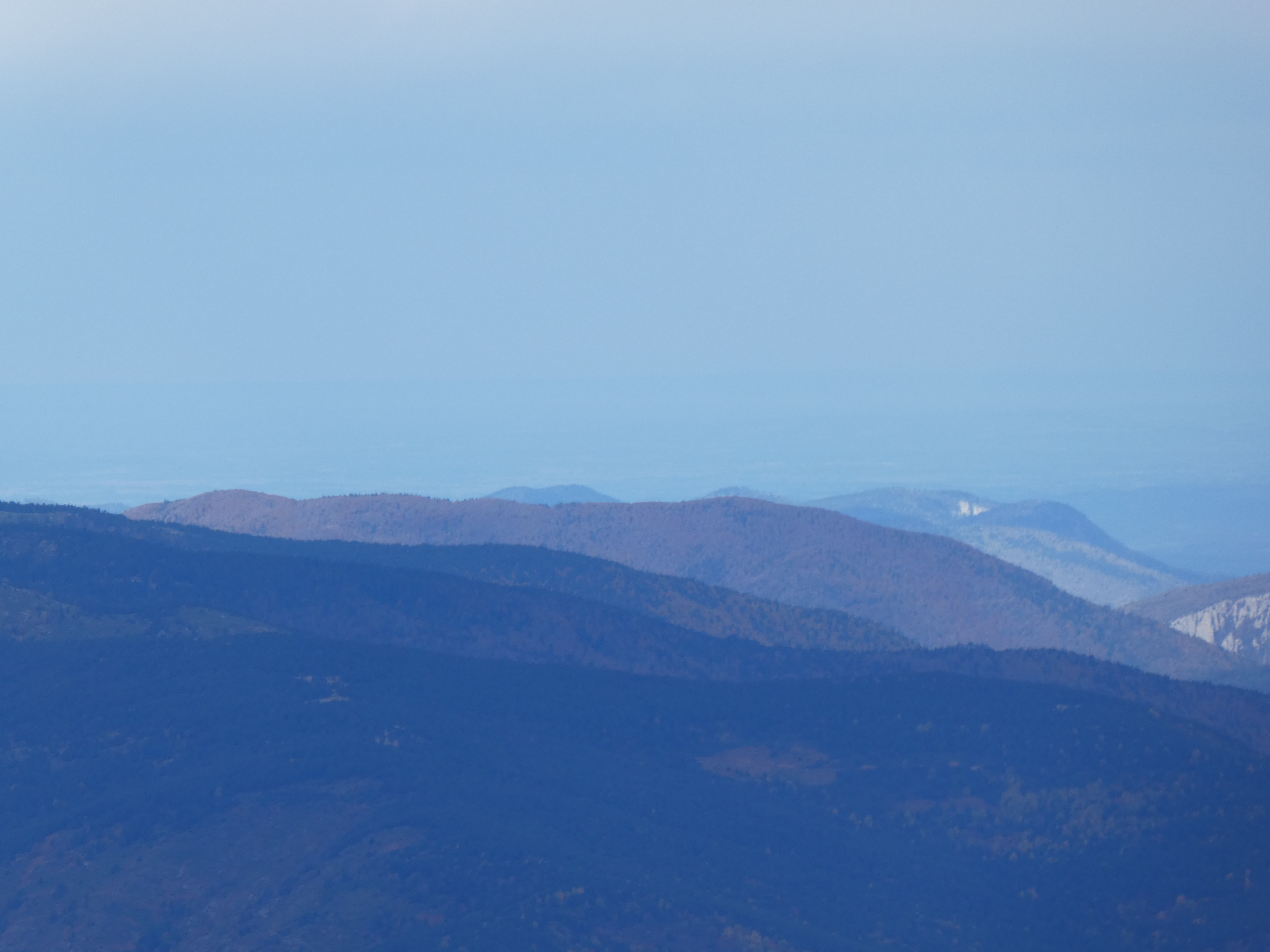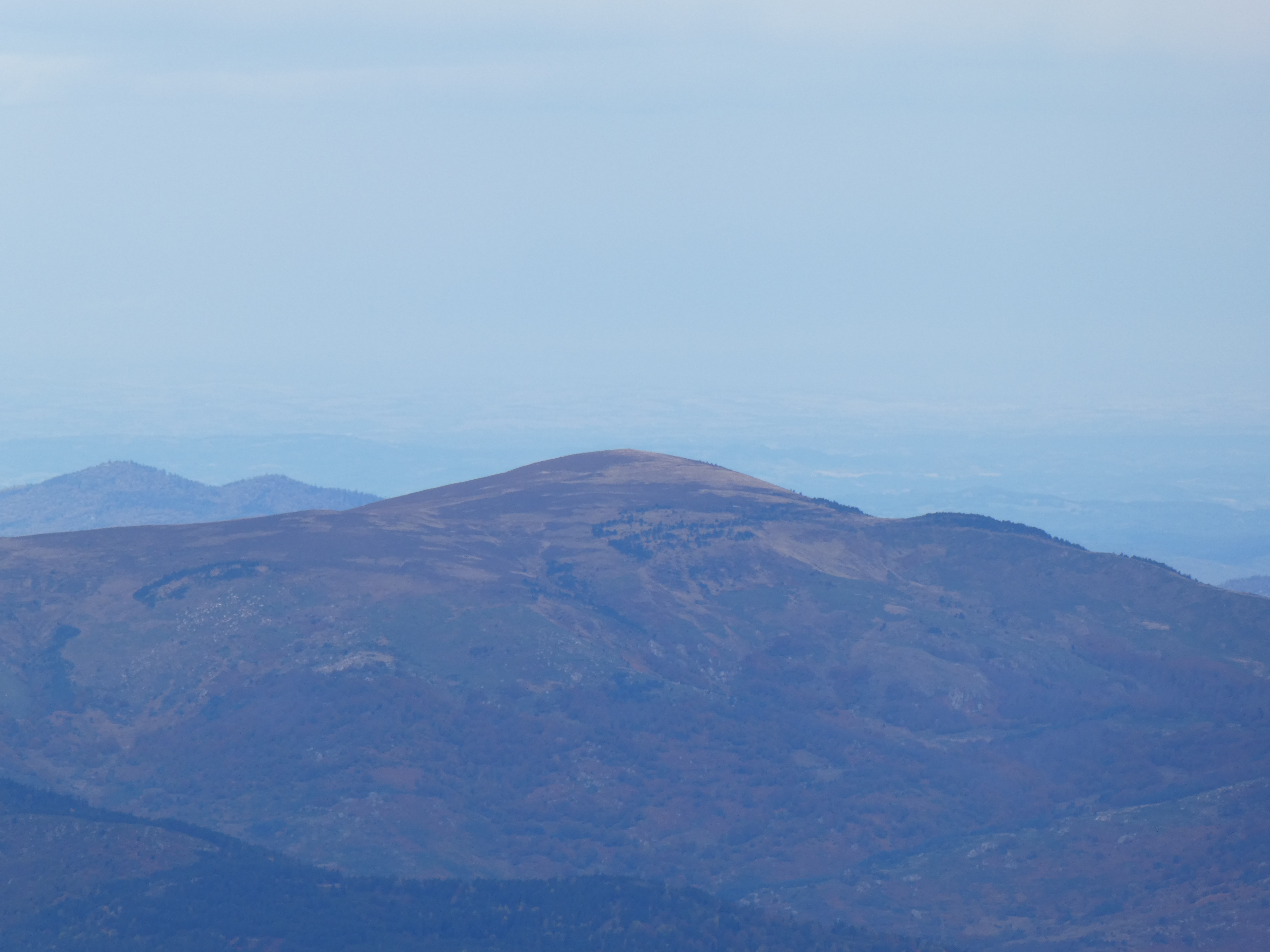 Zoom sur le Puigsacalm (1513 m) à gauche, et le Puig de les Civaderes (1448 m) et le Puig de Miralles (1434 m) à droite