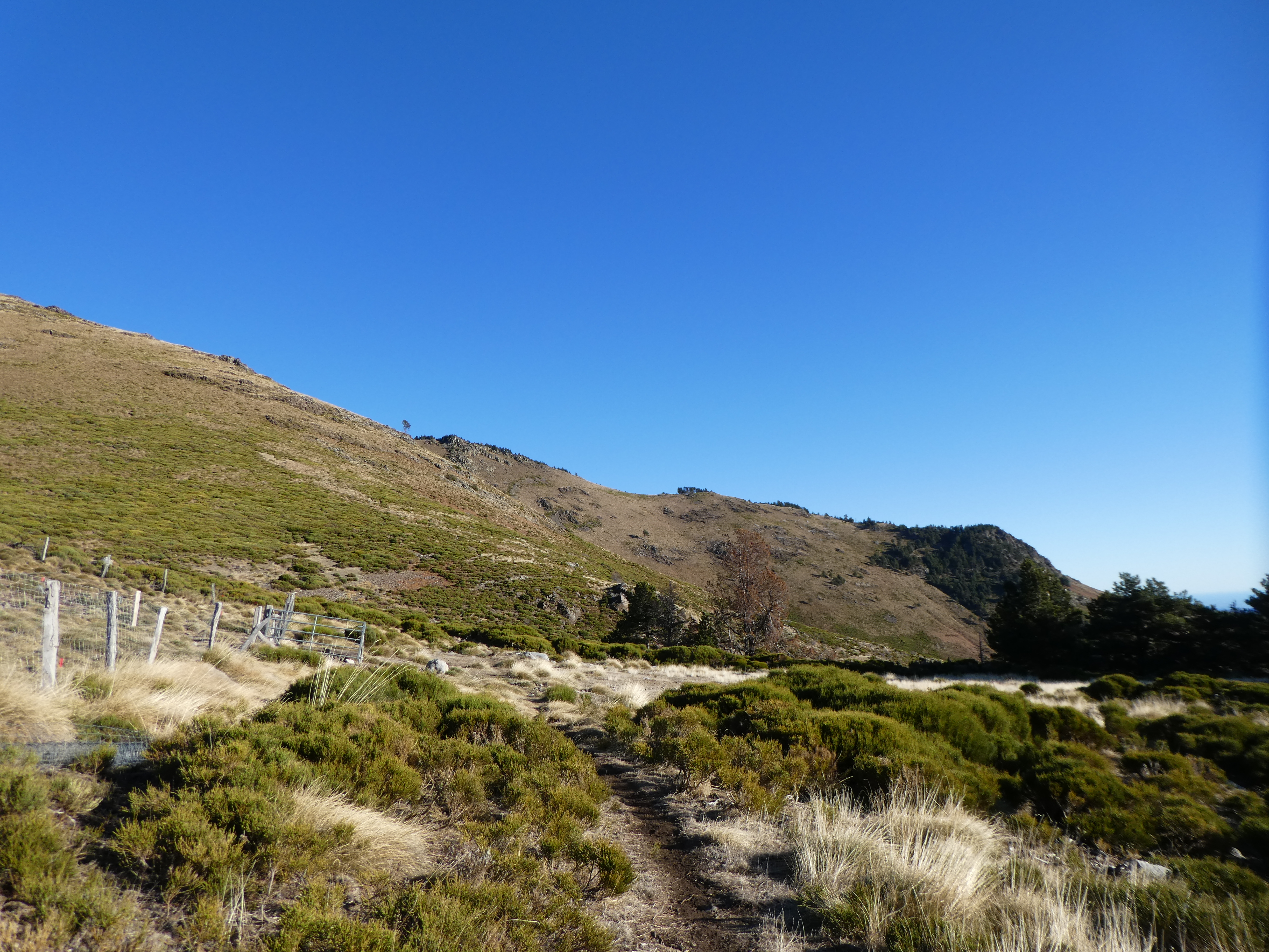 Dès que la pente le permet (50 mètres après le précédent croisement), quitter le chemin partant tout droit pour monter raidement à vue sur la droite vers le Pic de la Moscatosa direction Pic de la Moscatosa, aucun balisage dorénavant (attention, présence d'une clôture juste avant d'arriver au sommet)