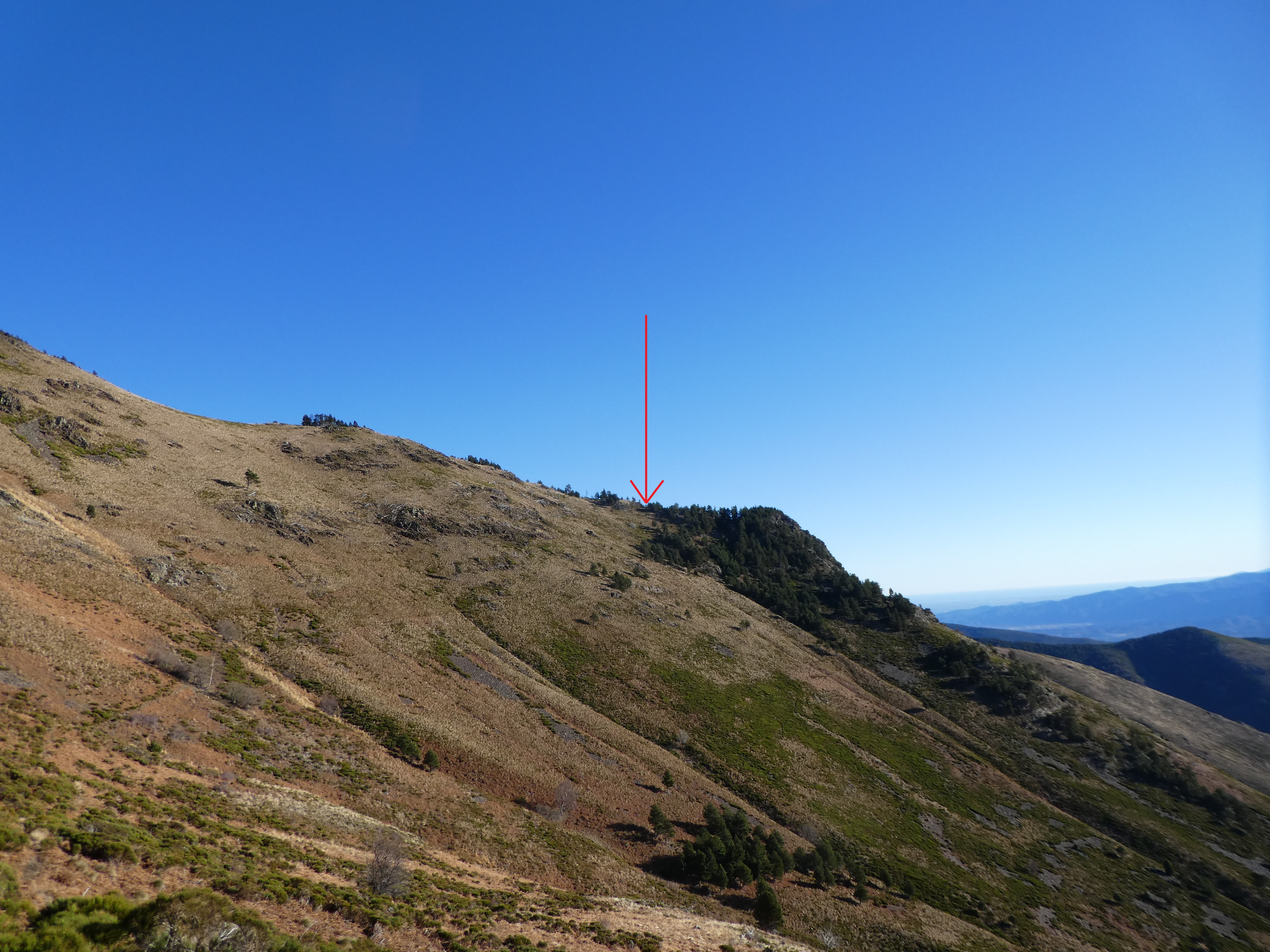 Dès que le point culminant de la montée depuis le Coll de la Serra est atteint (100 mètres après le Coll de la Serra), faire un très court aller-retour sur la droite vers le Pic de la Serra direction Pic de la Serra