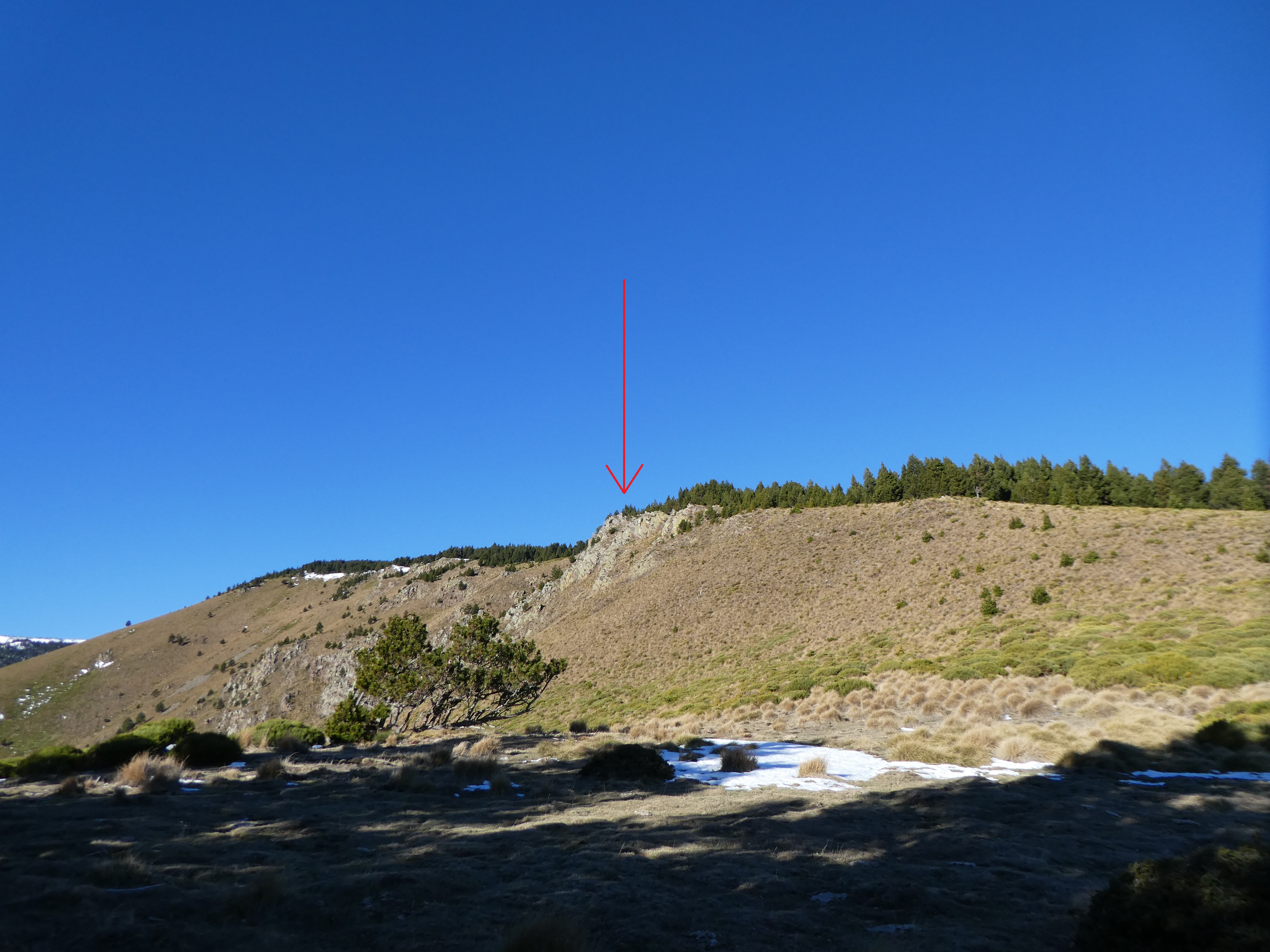 A ce croisement situé au niveau du col du Roc de Torrelles (25 mètres après avoir quitté le Roc de Torrelles), monter hors sentier tout droit vers le point culminant de la crête direction Roc de l'Agla (ceux qui ne voudraient pas monter au Roc de l'Agla, suivre le chemin partant sur la droite et balisé en points rouges vers le Canal d'Urbanya)