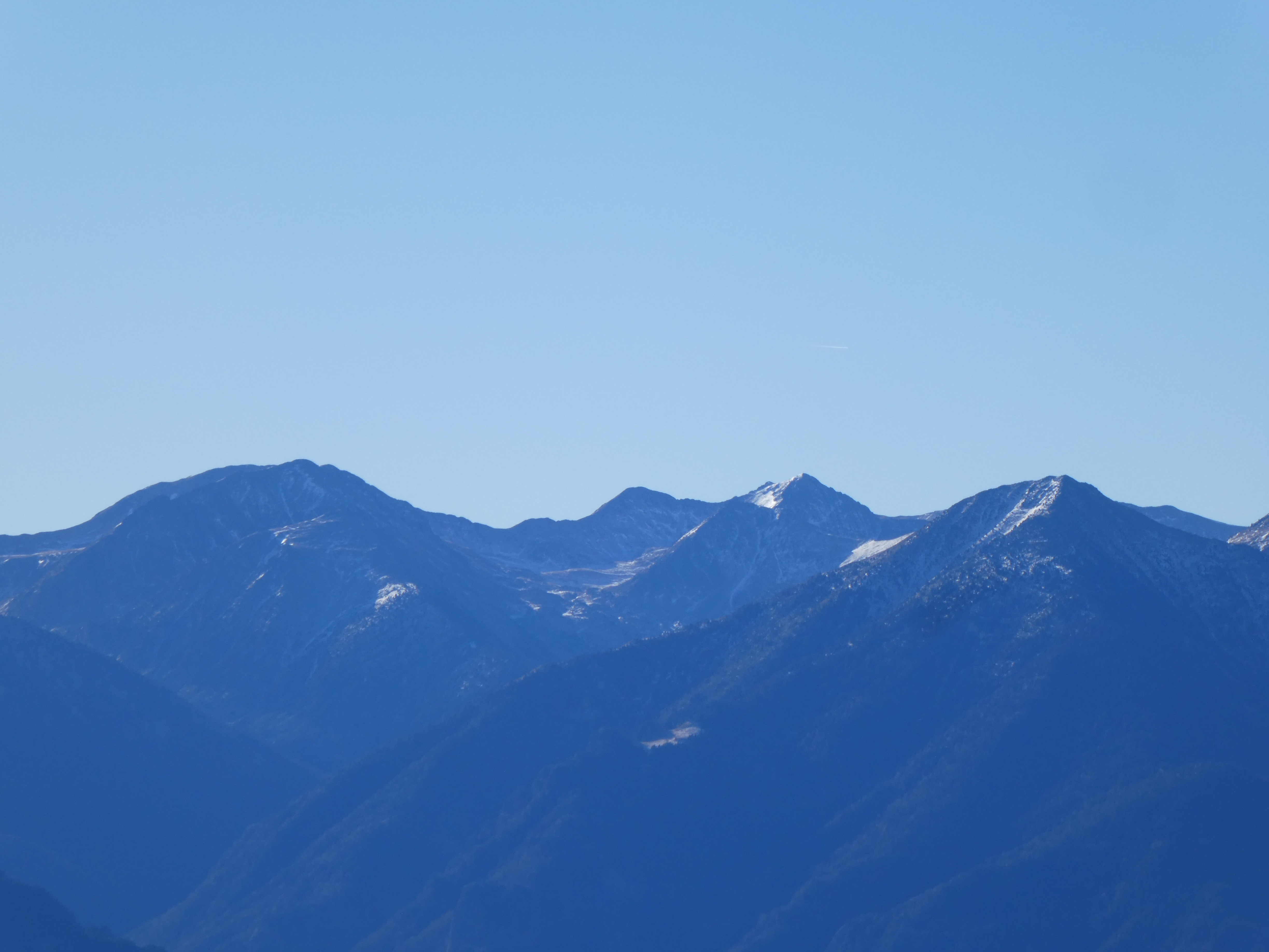 Zoom sur le Pic du Canigou (2784 m) au centre-gauche, le Puig dels Tres Vents (2731 m) au centre, le Puig Rojà (2724 m) au centre-droit et le Pic dels Set Homes (2651 m) à droite