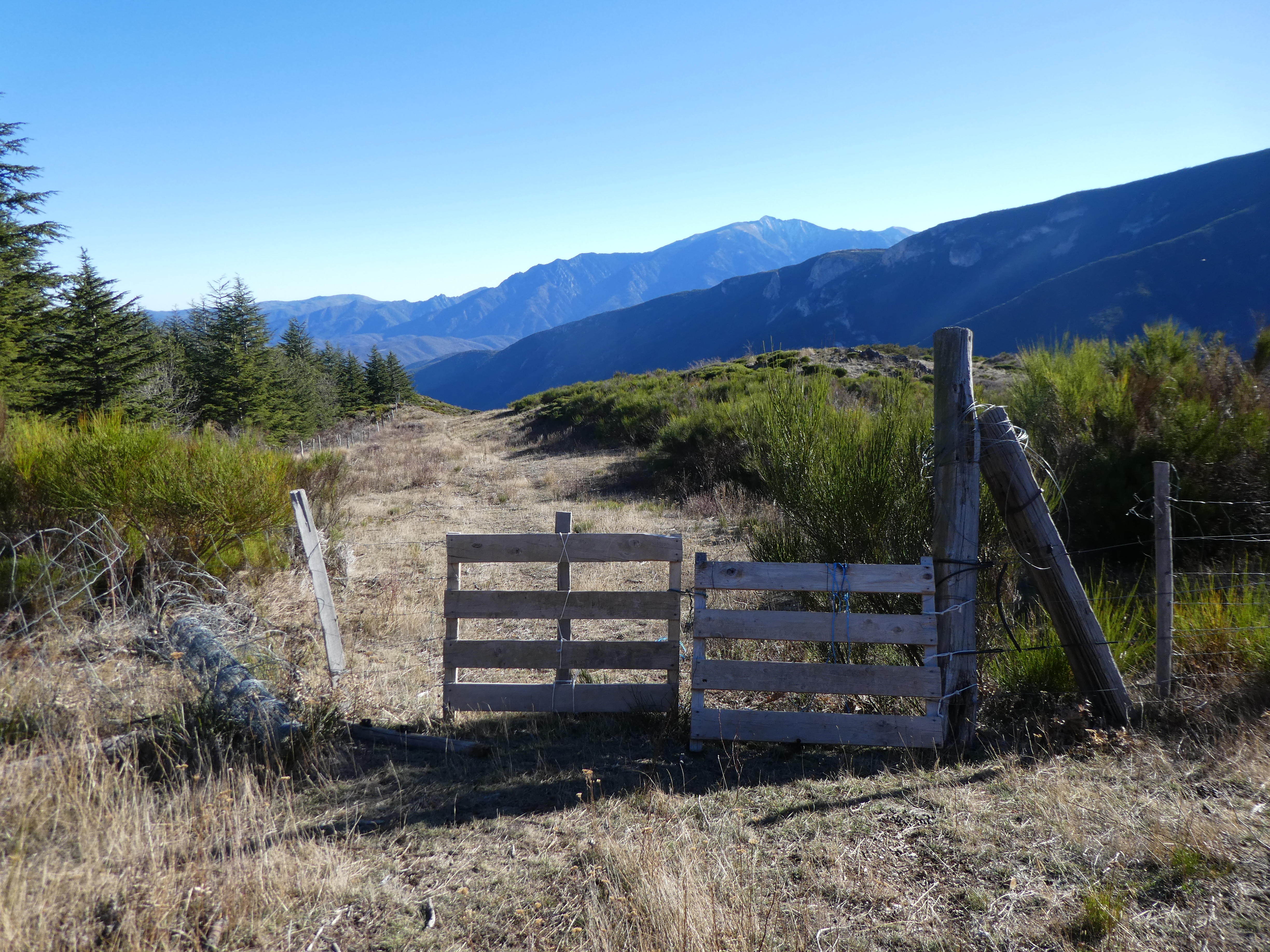 A ce croisement marqué par la présence de ce portail (300 mètres après avoir quitté le Pic Lloset) (1299 m), continuer à suivre le chemin de crête partant tout droit direction Pic de la Serra