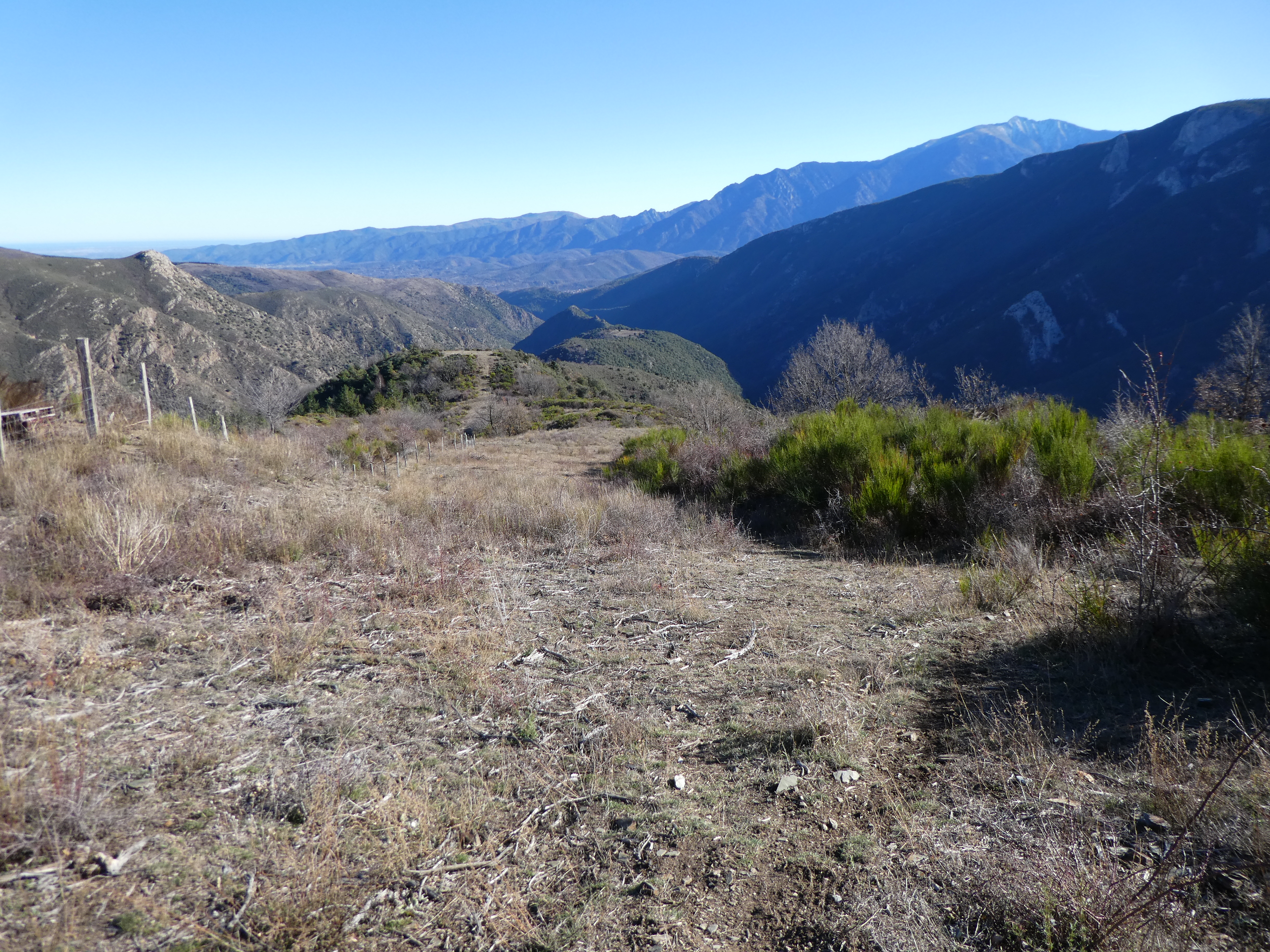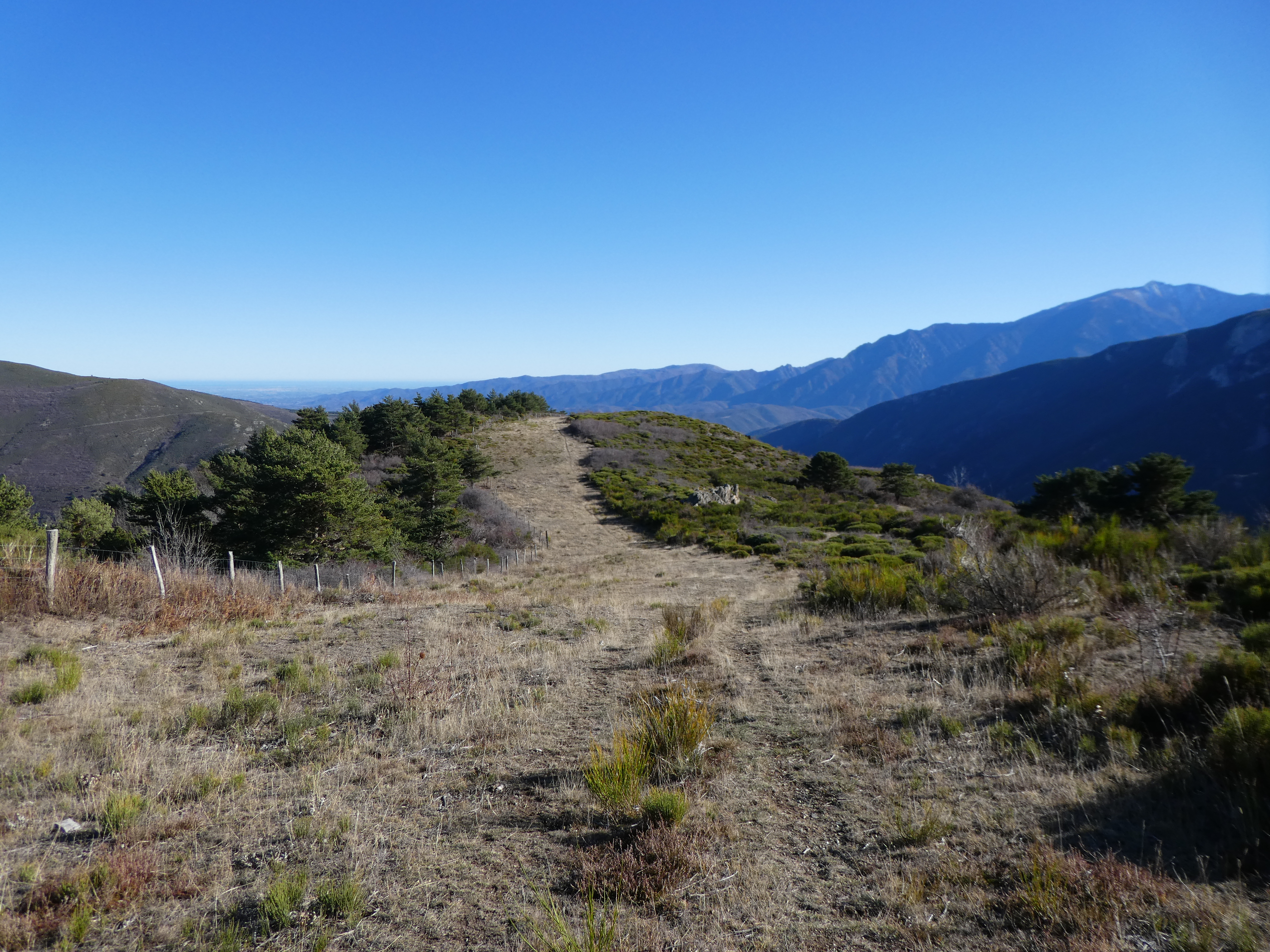 Redescendre du sommet par le même chemin que celui de l'aller puis suivre le chemin de crête sur la droite vers le Coll de Marsac direction Nohèdes