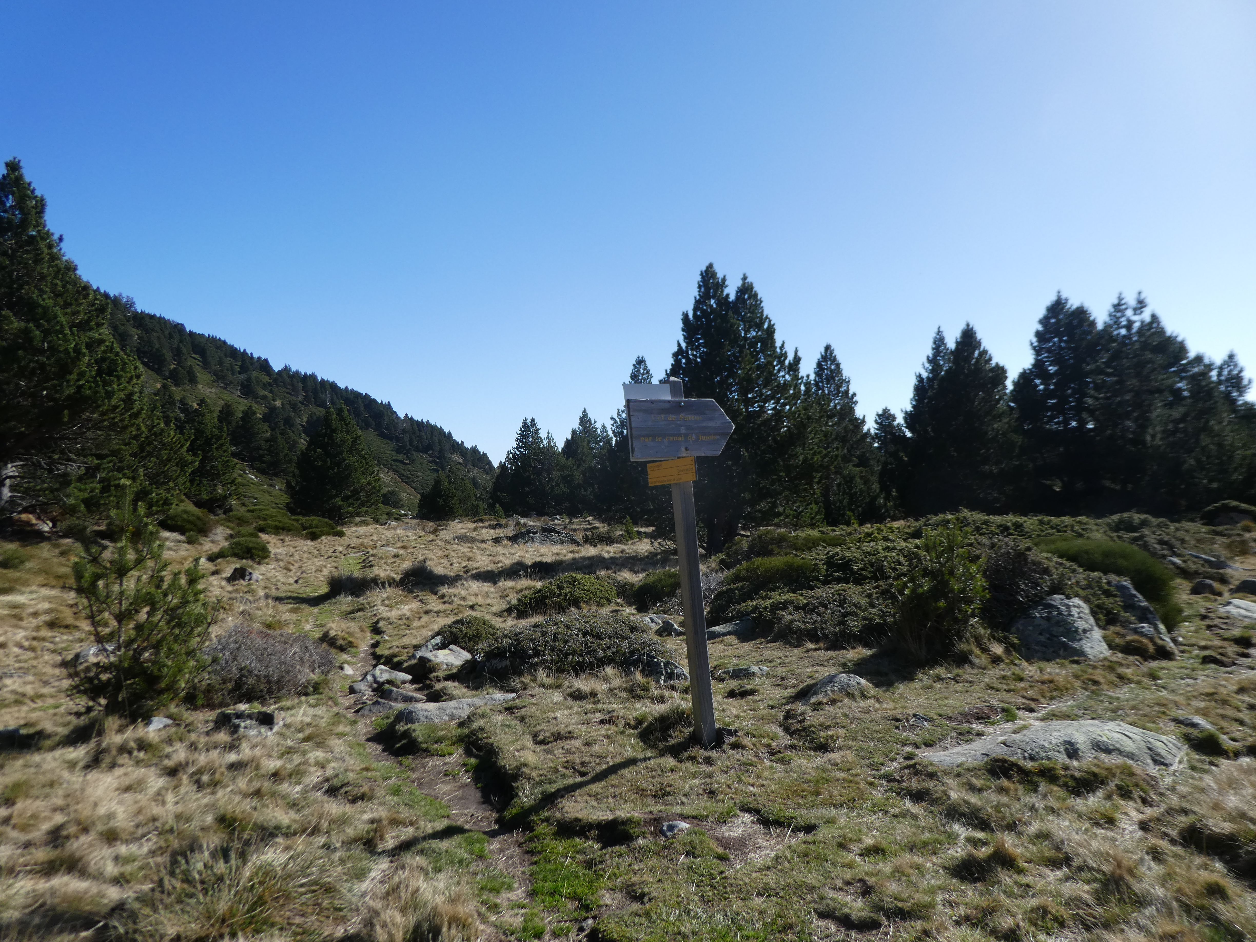 A ce croisement avec le sentier venant du Coll de Portus marqué par la présence d'un panneau directionnel (2500 mètres après le lieu-dit "Estany del Clot") (1986 m), suivre le chemin partant tout droit direction Gorg Estelat, balisé en jaune
