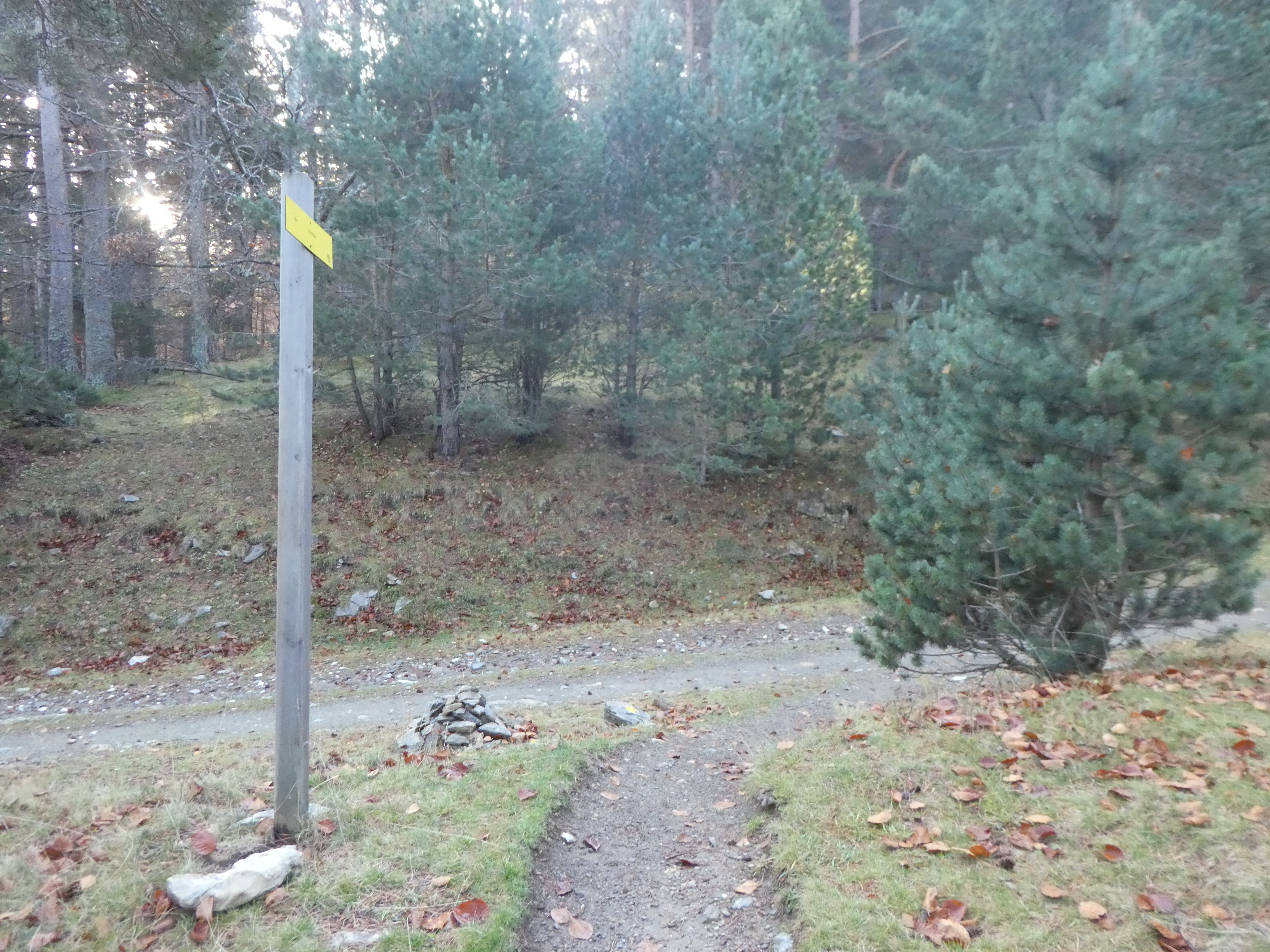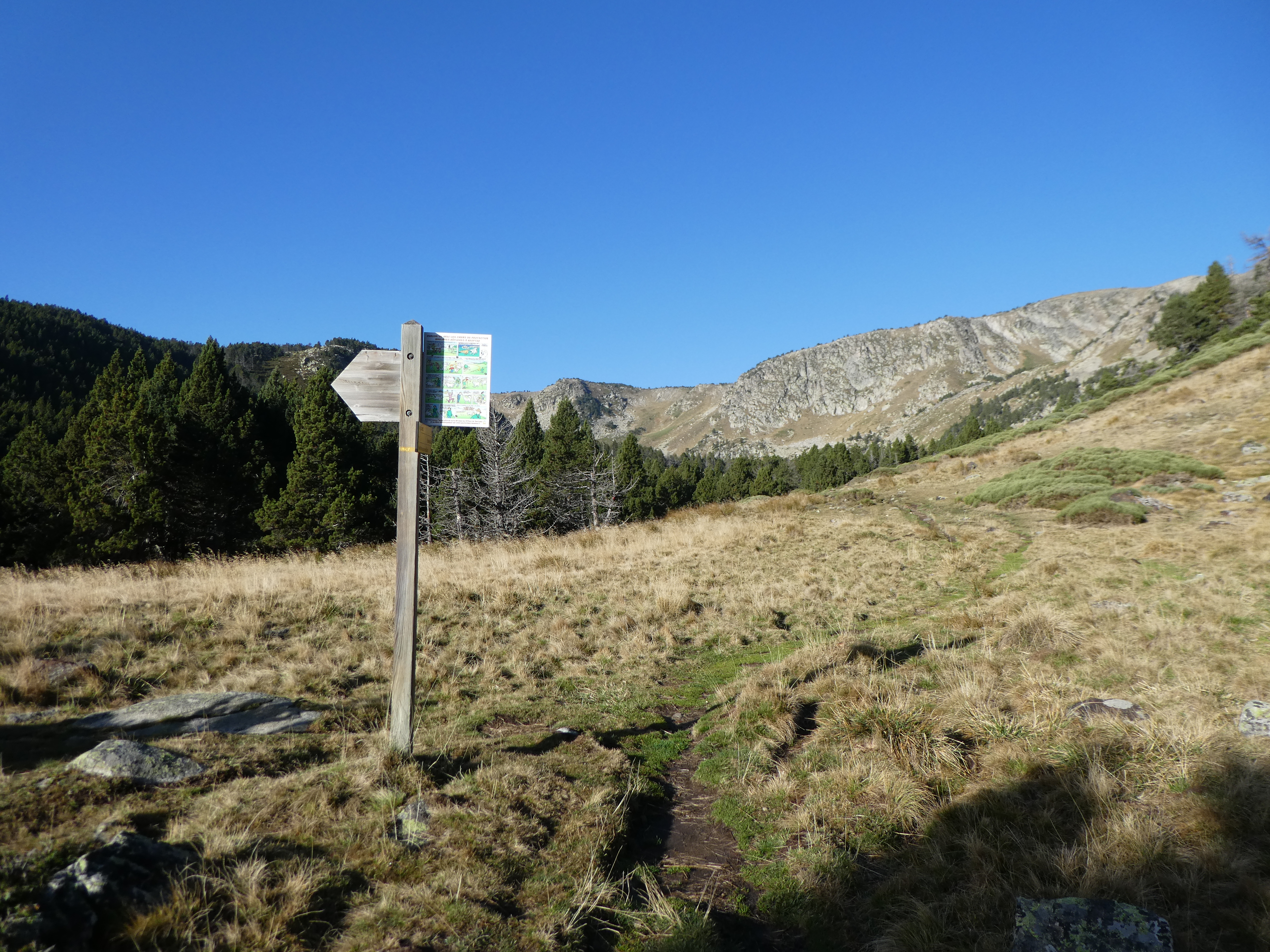 A ce croisement marqué par la présence d'un panneau directionnel (1000 mètres après le précédent) (1042 m), suivre le chemin partant sur la droite direction Estany del Clot, balisé en jaune