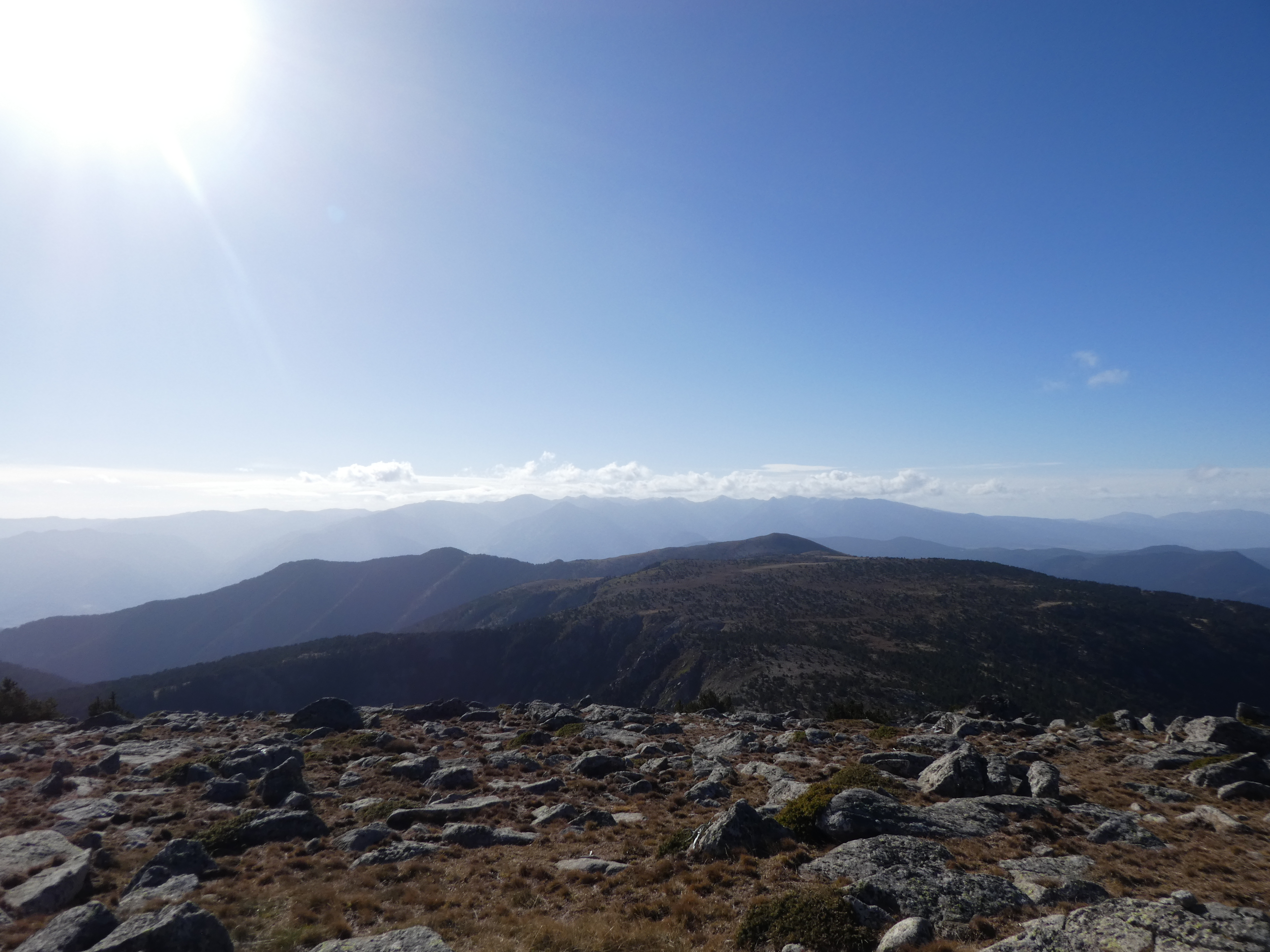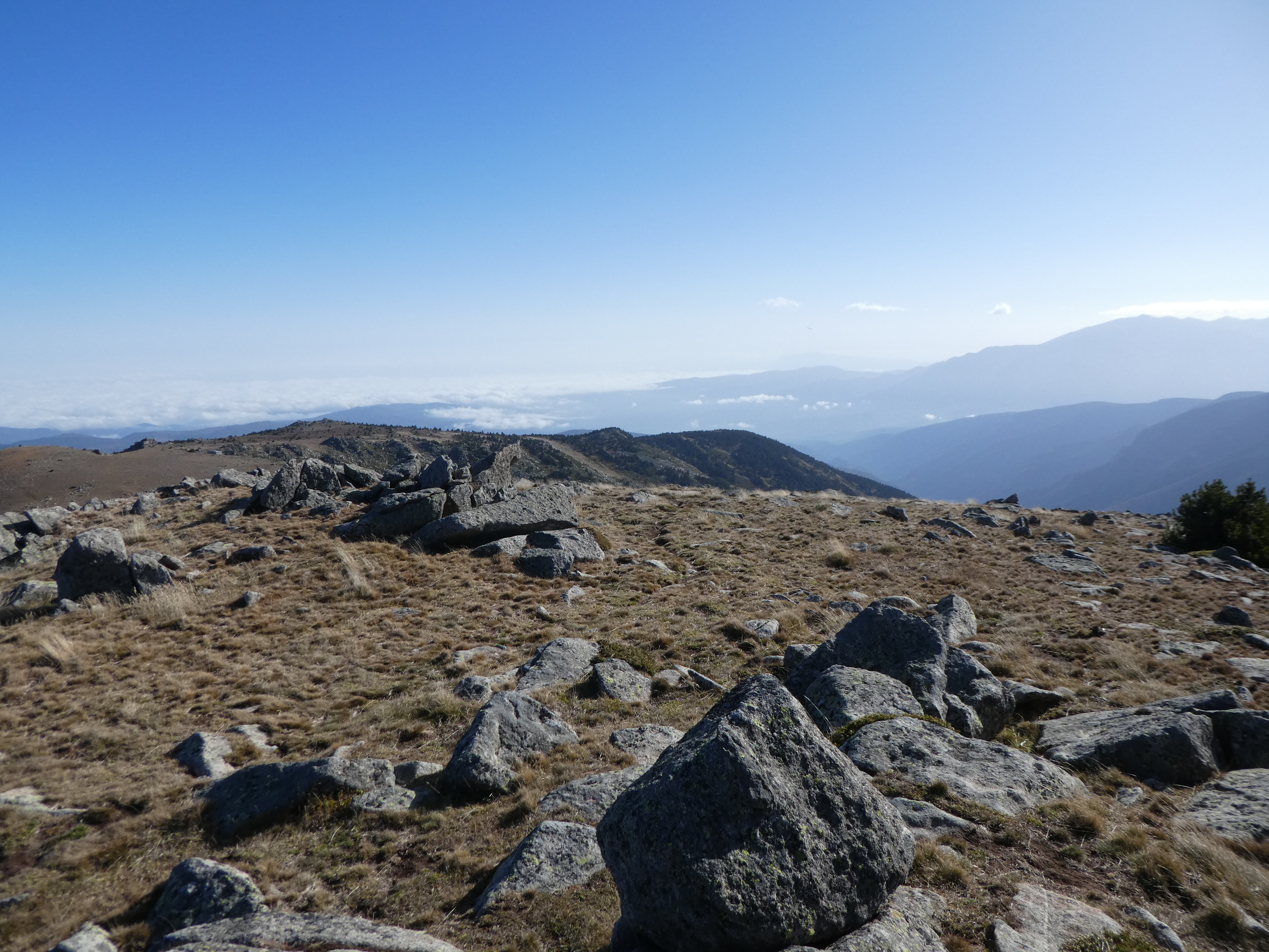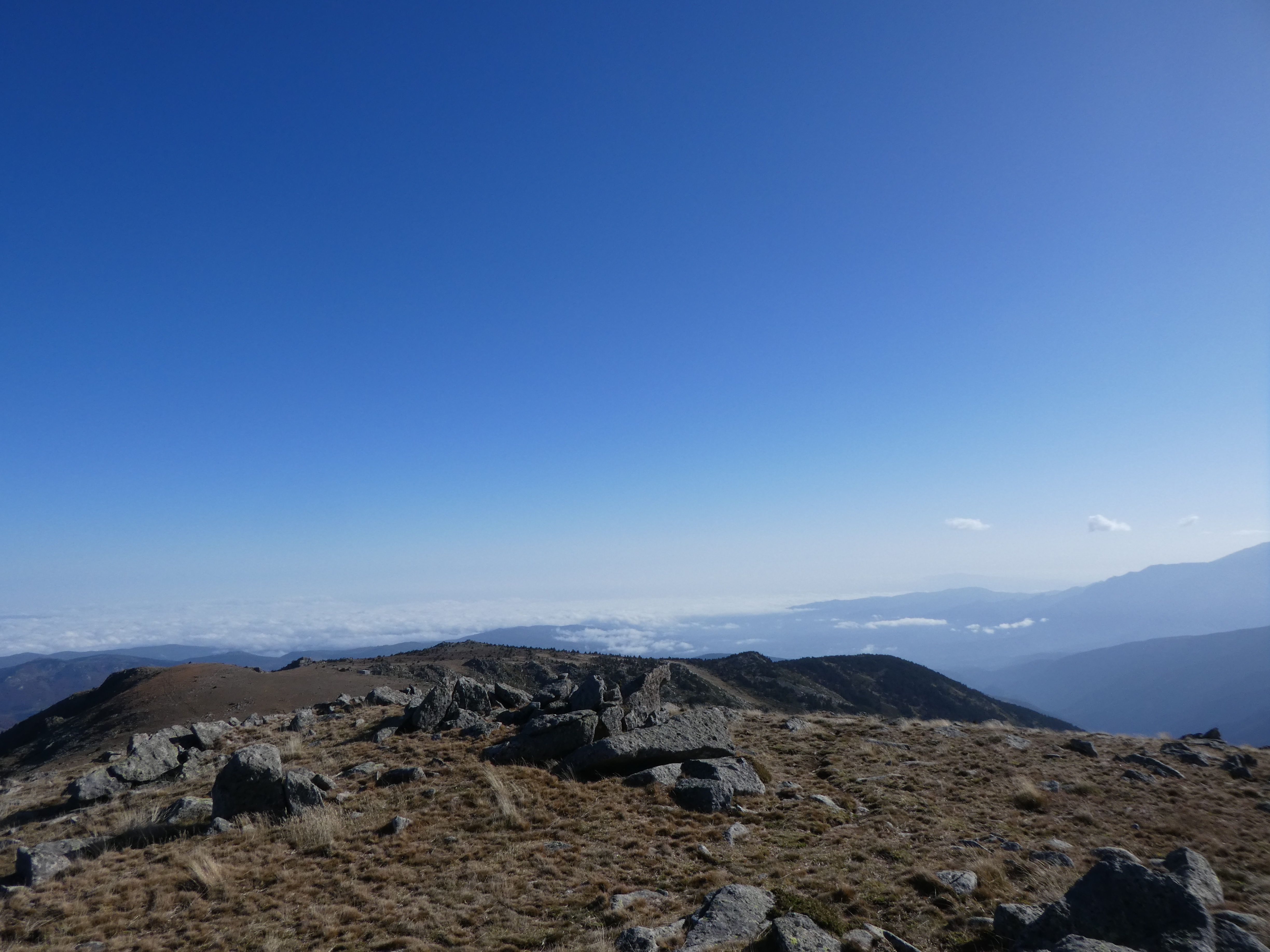 Arrivée au sommet du Roc Negre (2459 m) : beau panorama sur les sommets du Conflent, du Capcir, de la Haute-Cerdagne, de la Cerdanya, de la Haute-Ariège, des Monts d'Olmes, des Pyrénées Audoises et des Corbières ... la Montagne Noire ainsi que le littoral audois ne sont pas visibles à cause de la brume et des nuages bas !